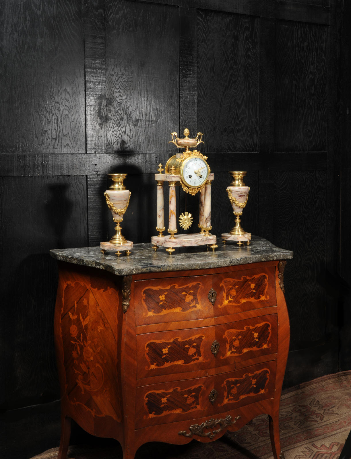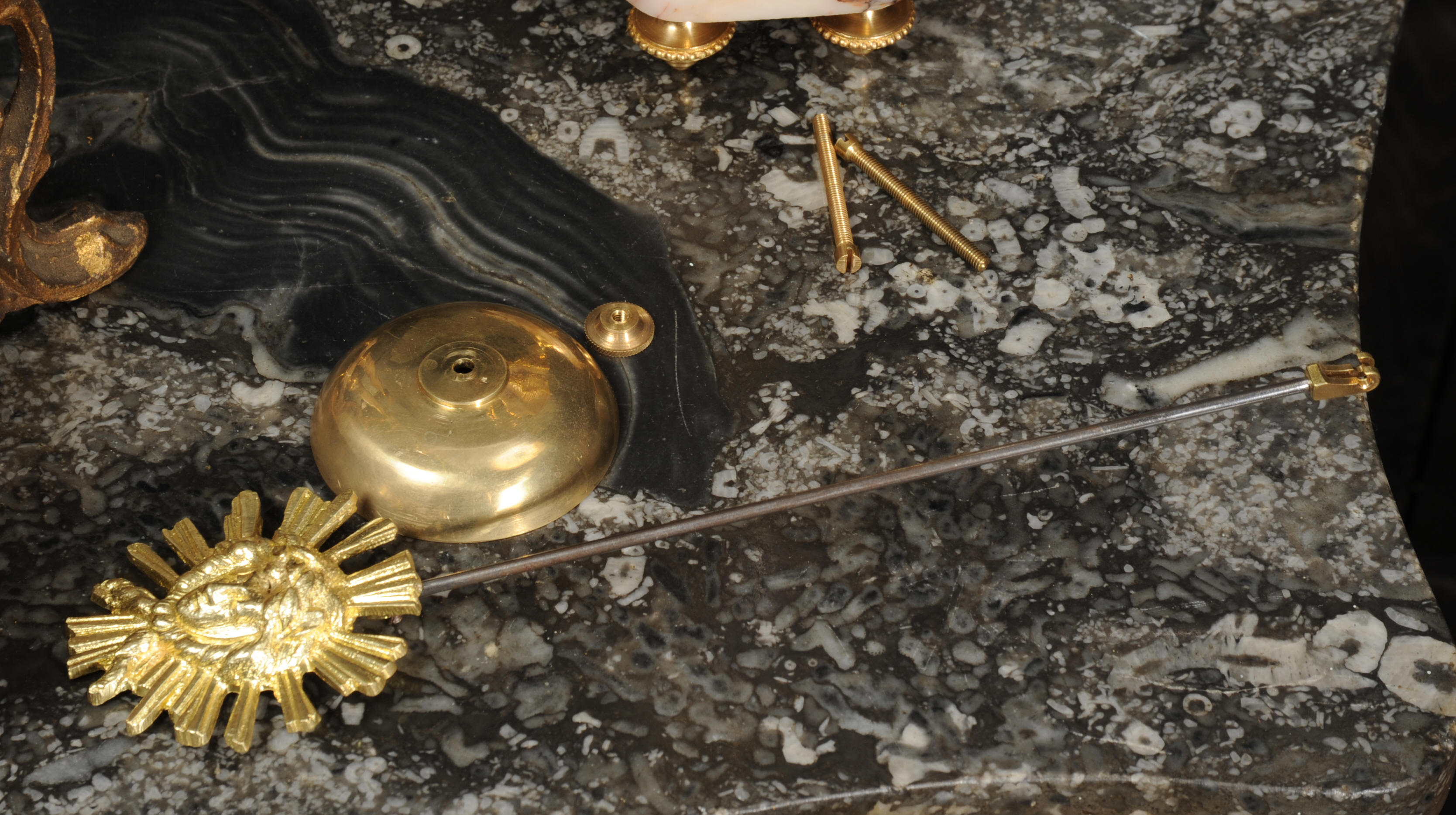 The movement backplate is marked for the maker Ferdinand Verger (1851-1928) was the founder of the firm and a master watchmaker and jeweller. He apprenticed at the age of 11, worked in London for a time, and then moved to Paris where he became the French agent for Vacheron and Constantin in 1879. In 1911 Ferdinand moved the firm to 51 rue Sainte Anne under the name of Verger Frères, as he trained his sons, Henri and Georges, to join the firm. In 1920 Ferdinand left the company to his sons. It was during the time that Henri and Georges ran Verger Freres that it reached its peak. The firm became one of the most famous clock designers of the 1920s. They were particularly known for their innovative use of precious materials in clocks, stands, frames and watches, employing only in-house lapidaries and stone-setters. The business between Verger Freres and Vacheron and Constantin developed into a partnership, while they also produced for all of the great jewellers of the day: Boucheron, Cartier, Chaumet, Janesich, Lacloche, Tiffany, Van Cleef & Arpels, and many more. Complete with pendulum, bell and a suitable key. Full setting up instructions supplied if required.