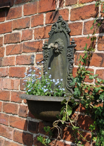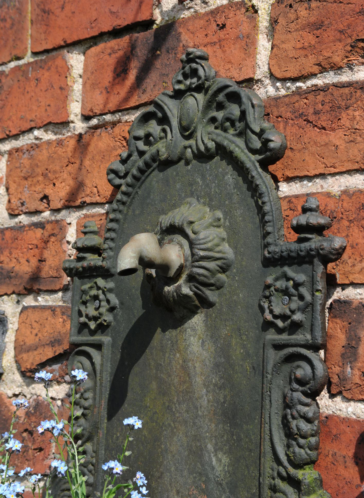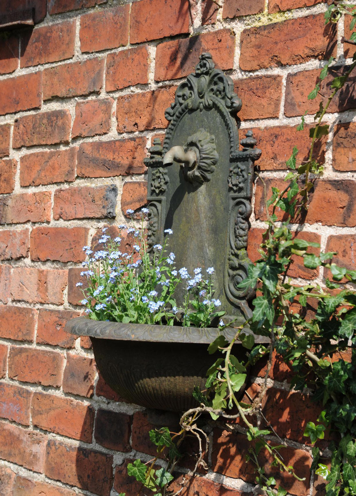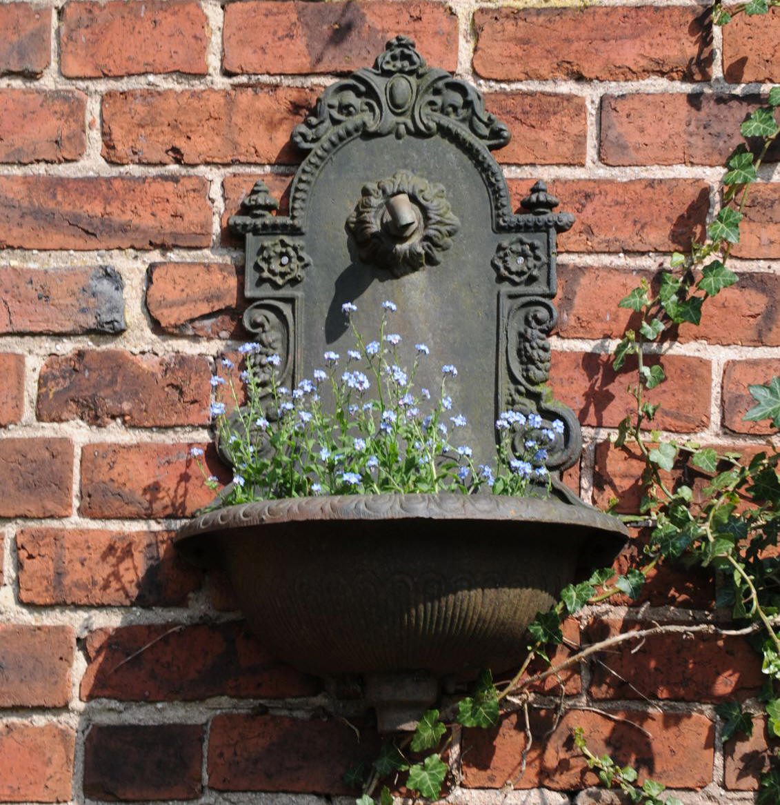 A lovely antique/vintage cast iron wall fountain, old paint with rust and remains of a brass tap. 67cm H, 43 W, 22 D.