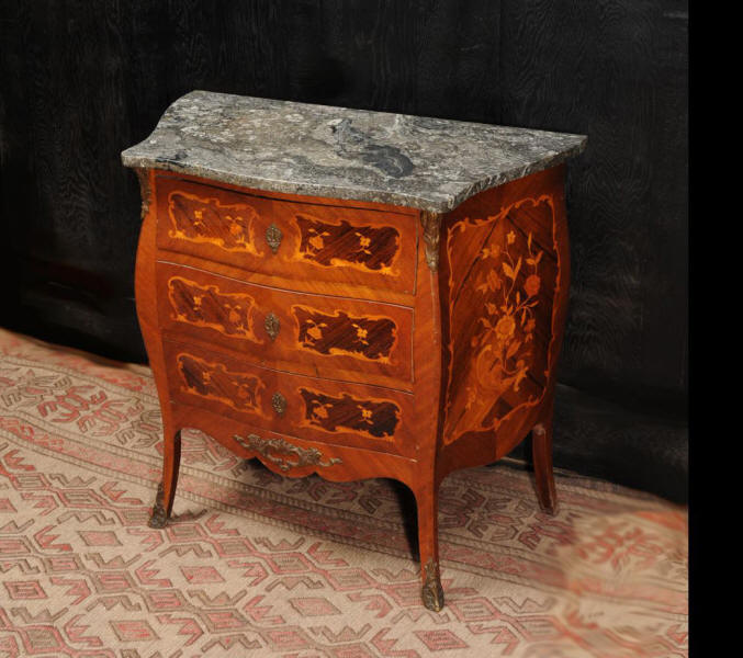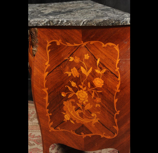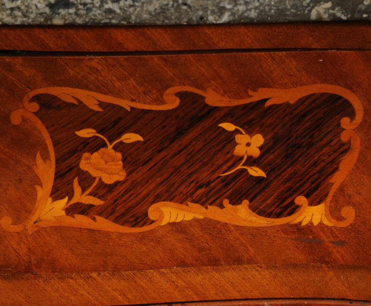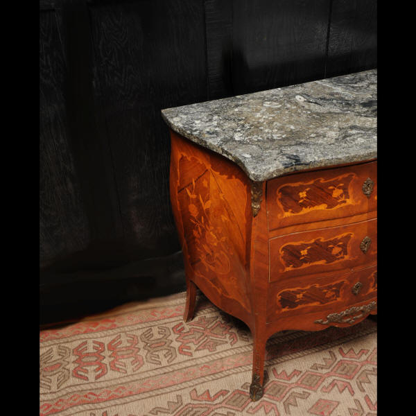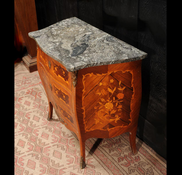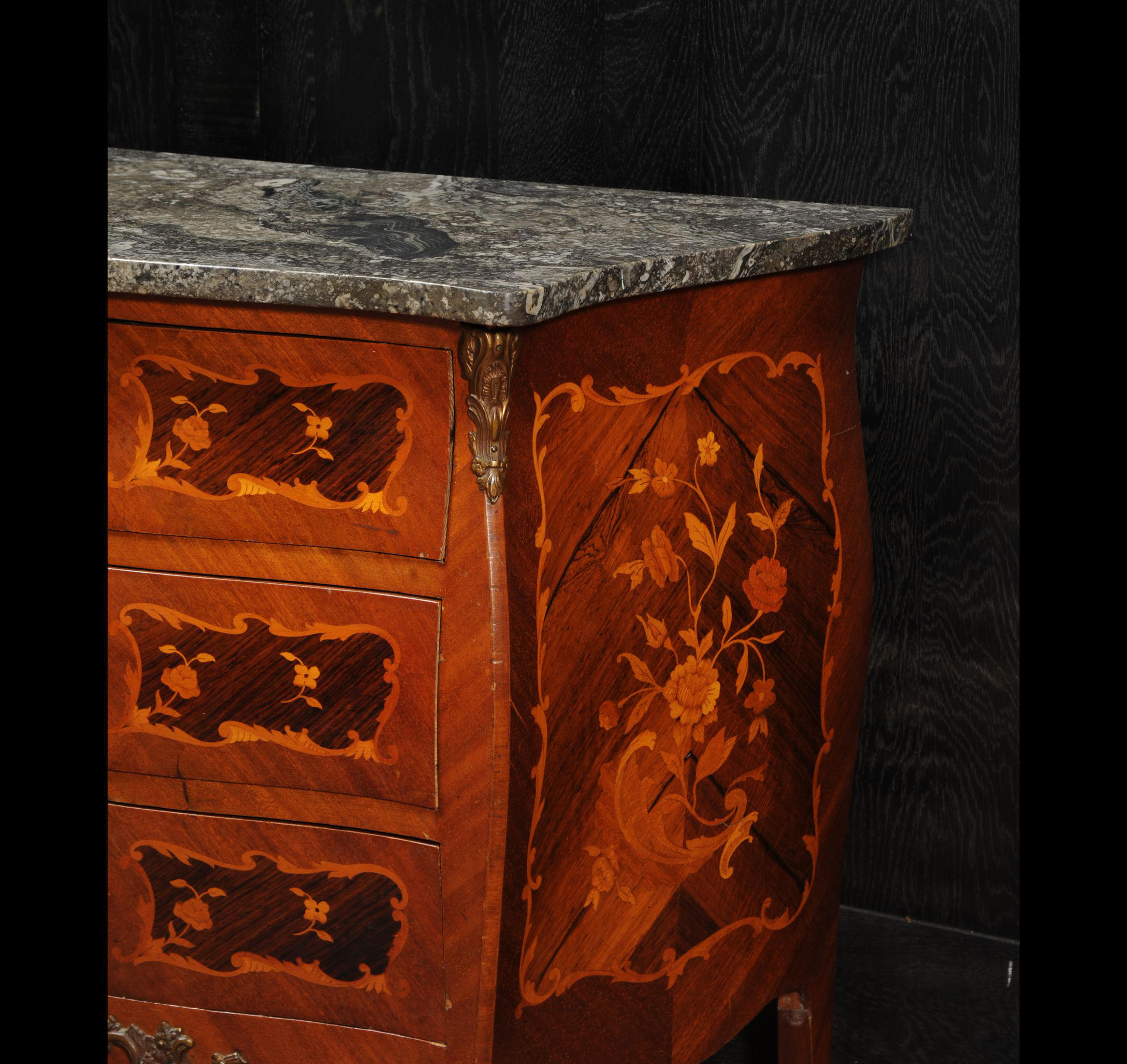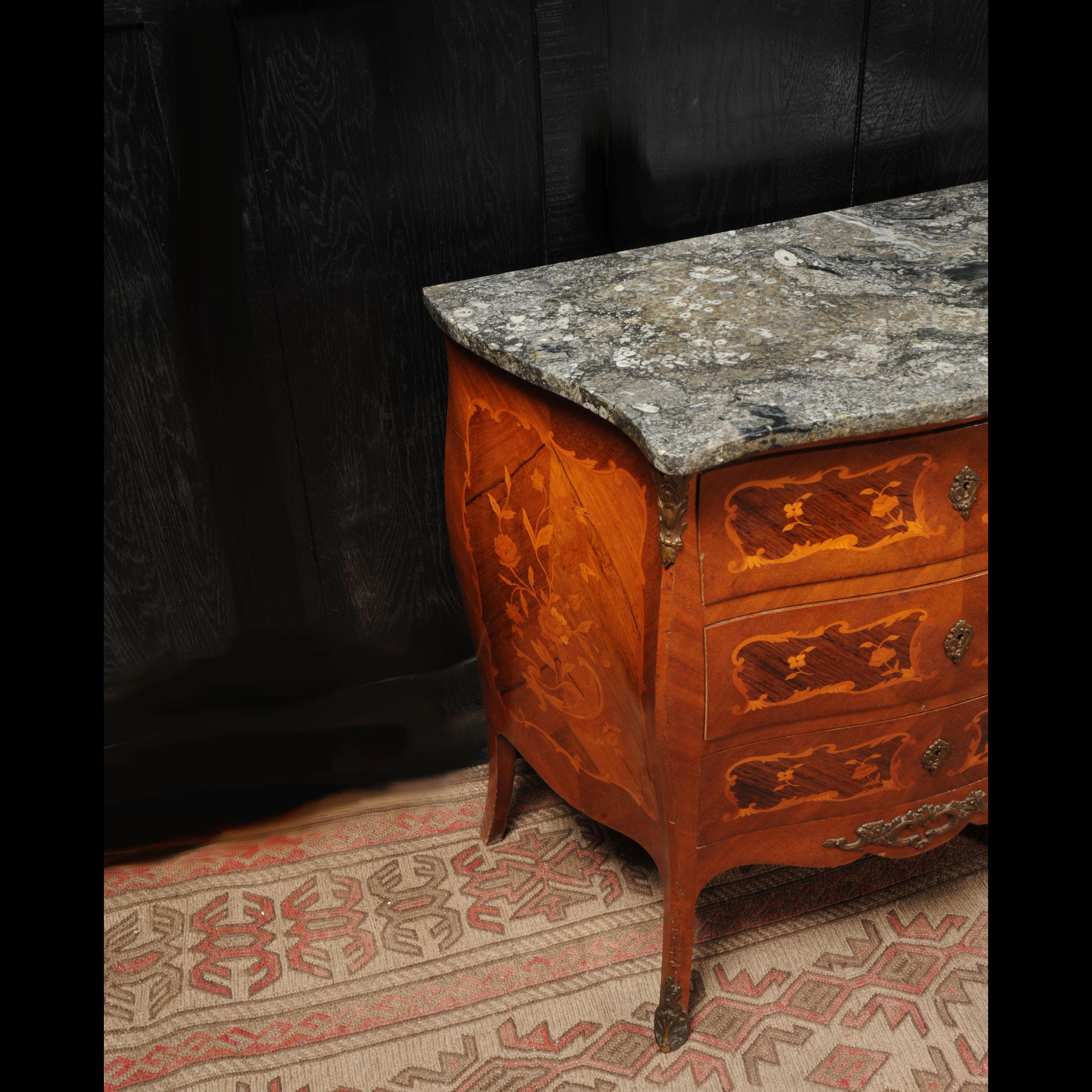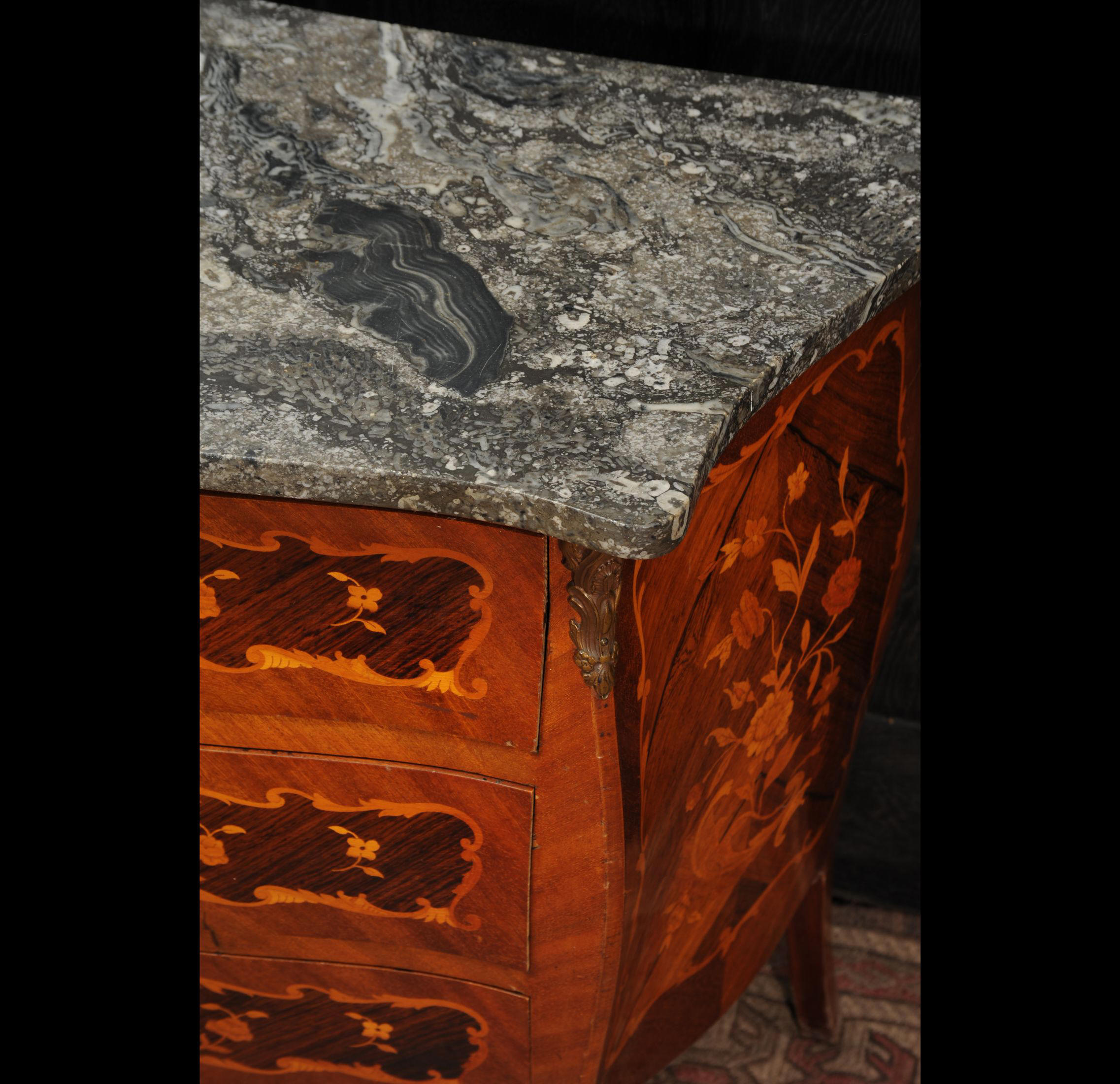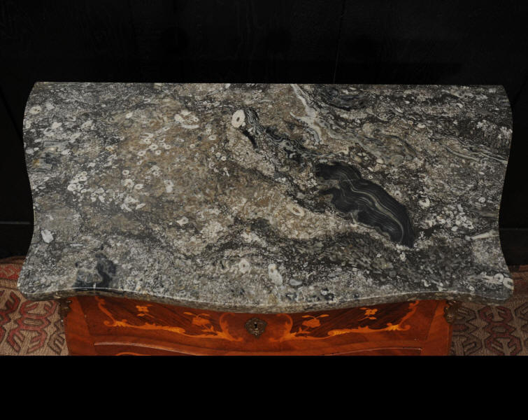 French Inlaid Marquetry Bombe Chest with Fossil Limestone Top