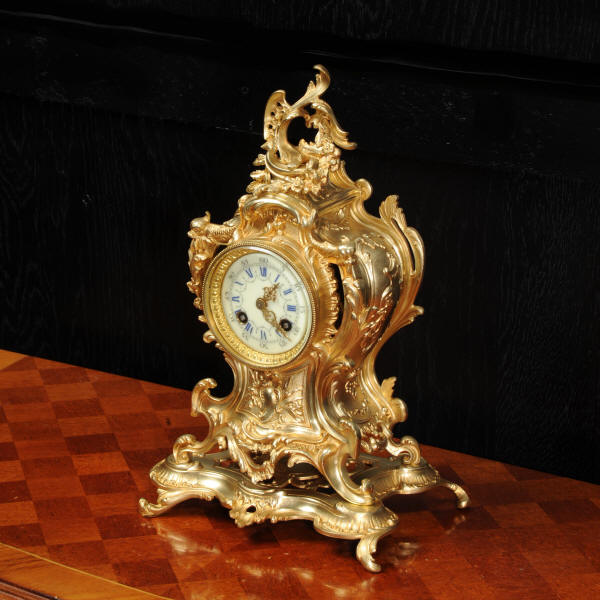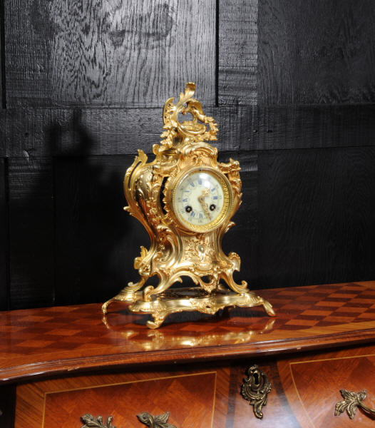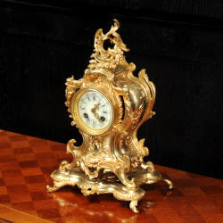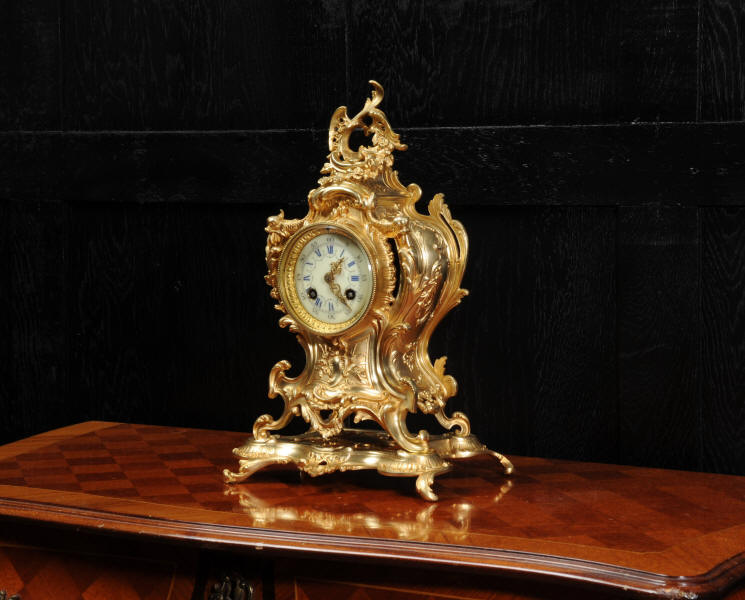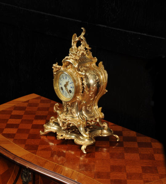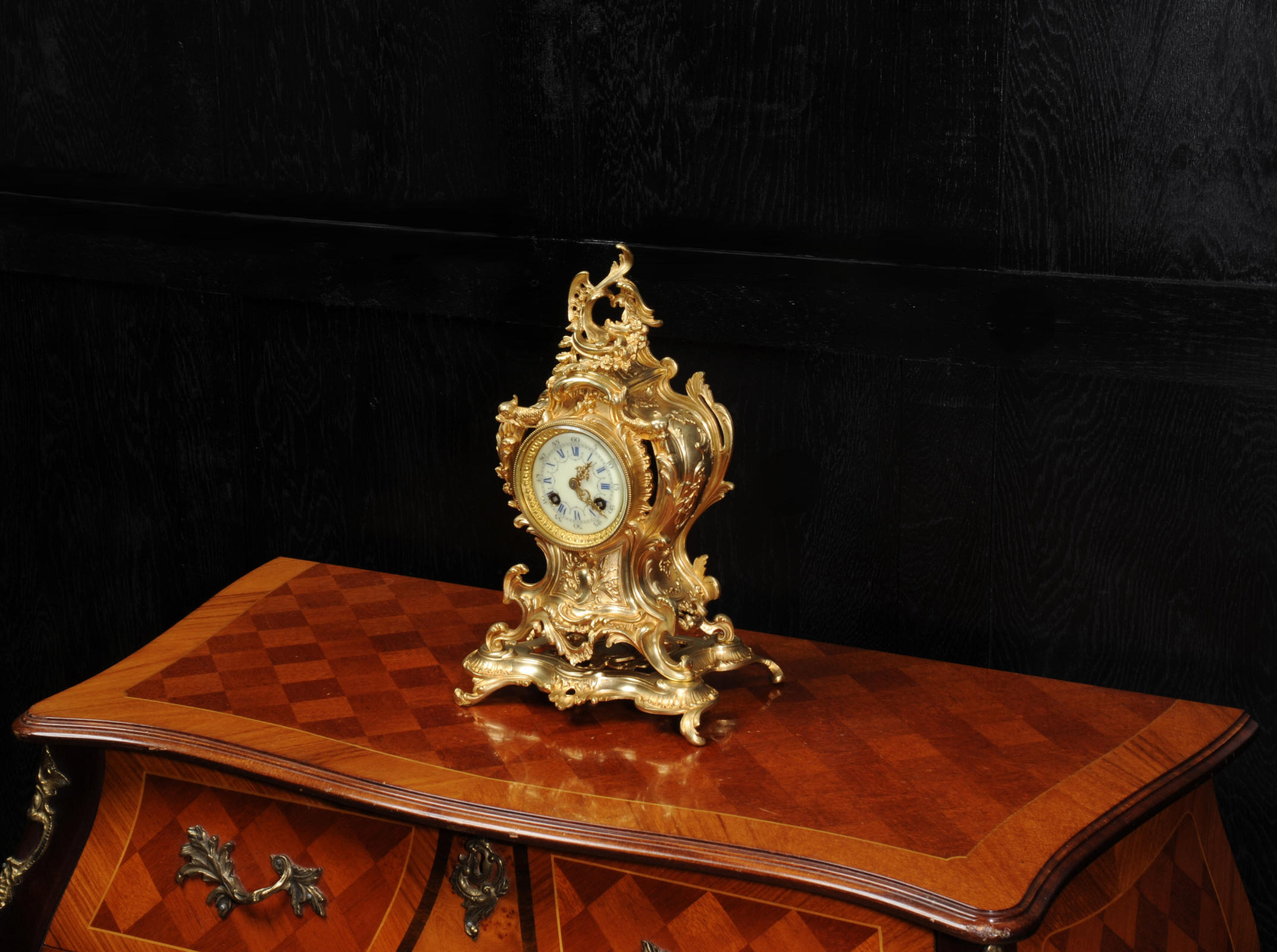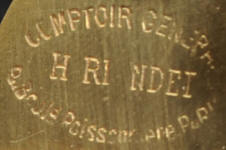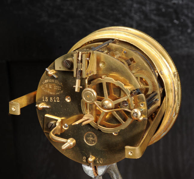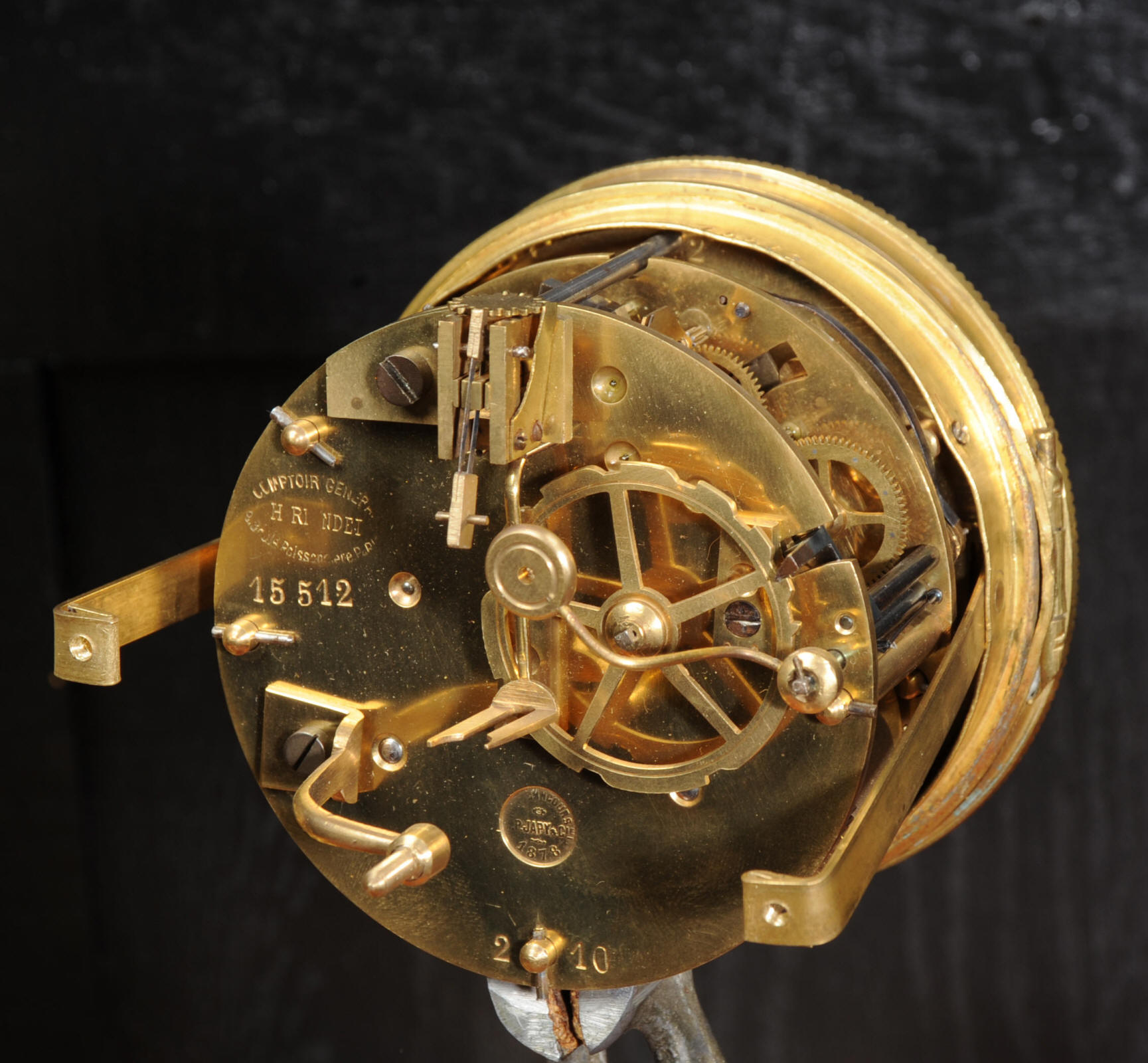 The dial is cream porcelain enamel, lettered in blue. It is complete with it's original finely fretted gilt hands and convex glazed bezel. The French movement is by Louis Japy and is in excellent clean and running condition having been fully overhauled by our clockmaker. Pendulum is a replacement. It runs for 8 days and strikes the hours and halves on a bell. Click the video clip below to hear the bell and watch the clock running. According to an advertisement in the 1896 issue of Didot-Bottin (directory and almanac for commerce, industry, judicial and civil services) the Maison H. Riondet, Comptoir General, a retailer, was one of ‘the most well-stocked shops for everything from: jewellery, bronze art objects, timepieces & furniture, precious stones, marble sculptures, silverware, ceiling lights & white metal, chandeliers, cutlery, lamps & diamond-facetted fireplaces, travel clocks, “fine-stone” pearls.’ It boasted ‘factory prices’ and ‘retail stores in Paris with no other branches, representatives, or offices in any other city, French or foreign.’ Maison H. Riondet was located at 9, boulevard Poissonnière and 45, rue du Sentier in Paris. The 1911 Annuaire de la Curiosité et des Beaux-Arts, a directory of curiosities and fine art, shows that the retailer was a member of the bronze manufacturing trade union. Intersecting the grand Parisian boulevards, the Comptoir Général was located on the royal route, which under the Second Empire already connected the Madeleine to the Gymnase Theatre. The retailer figured among the great Parisian stores of the late nineteenth-century, providing “free entry” to customers. Strolling from the Place de la Madeleine to the Café des Variétés on Boulevard Montmartre, elegant crowds stopped to admire the store’s display windows, stocked in an abundant and spectacular manner. The Comptoir Général was contemporary with other great department stores of the period, like the Grands Magasins du Louvre, Bon Marché, and La Samaritaine, and attested to the new forms of commerce developing during the second half of the nineteenth century. These stores became showcases; advertising in newspapers, they offered the consumer a diverse and varied product, displayed in a way that was elaborate and luxurious.