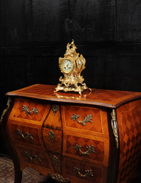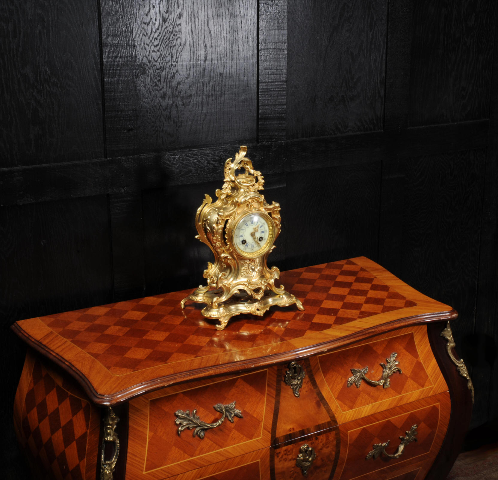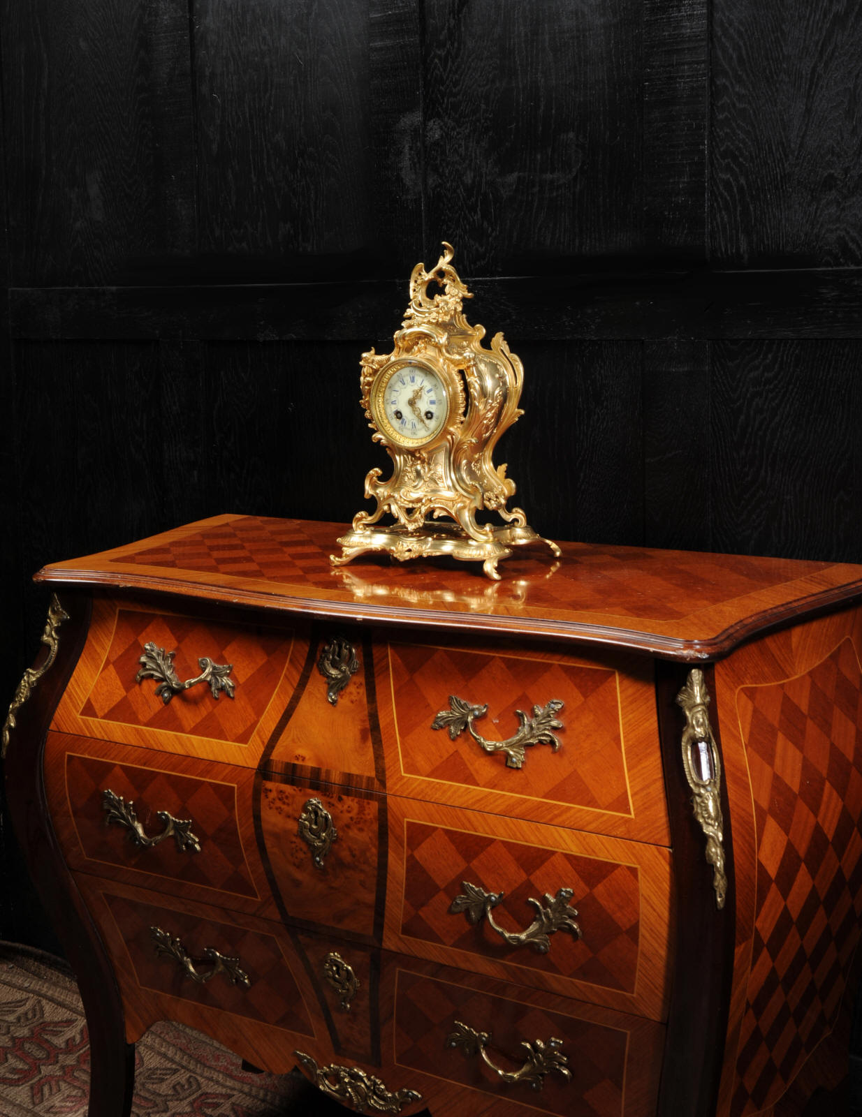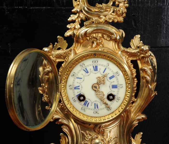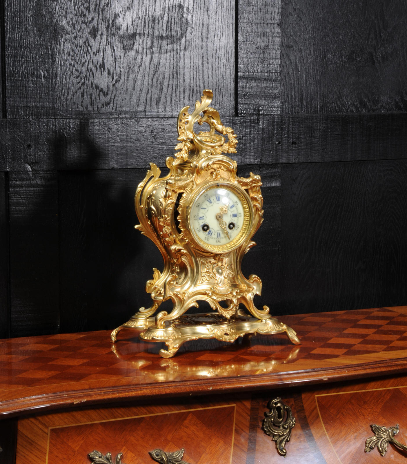 The dial is cream porcelain enamel, lettered in blue. It is complete with it's original finely fretted gilt hands and convex glazed bezel. The French movement is by Louis Japy and is in excellent clean and running condition having been fully overhauled by our clockmaker. Pendulum is a replacement. It runs for 8 days and strikes the hours and halves on a bell. Click the video clip below to hear the bell and watch the clock running. According to an advertisement in the 1896 issue of Didot-Bottin (directory and almanac for commerce, industry, judicial and civil services) the Maison H. Riondet, Comptoir General, a retailer, was one of ‘the most well-stocked shops for everything from: jewellery, bronze art objects, timepieces & furniture, precious stones, marble sculptures, silverware, ceiling lights & white metal, chandeliers, cutlery, lamps & diamond-facetted fireplaces, travel clocks, “fine-stone” pearls.’ It boasted ‘factory prices’ and ‘retail stores in Paris with no other branches, representatives, or offices in any other city, French or foreign.’ Maison H. Riondet was located at 9, boulevard Poissonnière and 45, rue du Sentier in Paris. The 1911 Annuaire de la Curiosité et des Beaux-Arts, a directory of curiosities and fine art, shows that the retailer was a member of the bronze manufacturing trade union. Intersecting the grand Parisian boulevards, the Comptoir Général was located on the royal route, which under the Second Empire already connected the Madeleine to the Gymnase Theatre. The retailer figured among the great Parisian stores of the late nineteenth-century, providing “free entry” to customers. Strolling from the Place de la Madeleine to the Café des Variétés on Boulevard Montmartre, elegant crowds stopped to admire the store’s display windows, stocked in an abundant and spectacular manner. The Comptoir Général was contemporary with other great department stores of the period, like the Grands Magasins du Louvre, Bon Marché, and La Samaritaine, and attested to the new forms of commerce developing during the second half of the nineteenth century. These stores became showcases; advertising in newspapers, they offered the consumer a diverse and varied product, displayed in a way that was elaborate and luxurious.