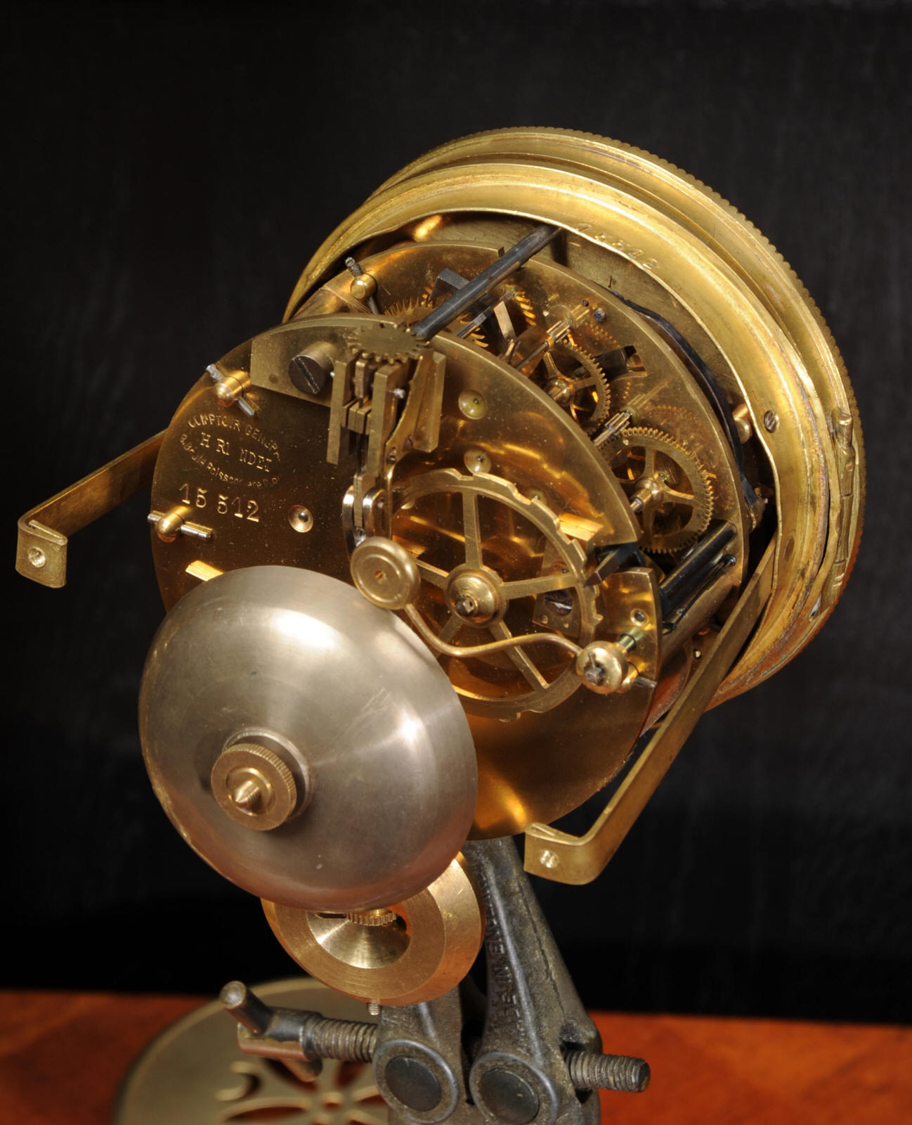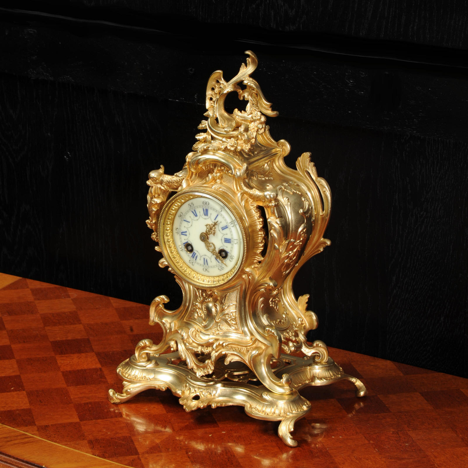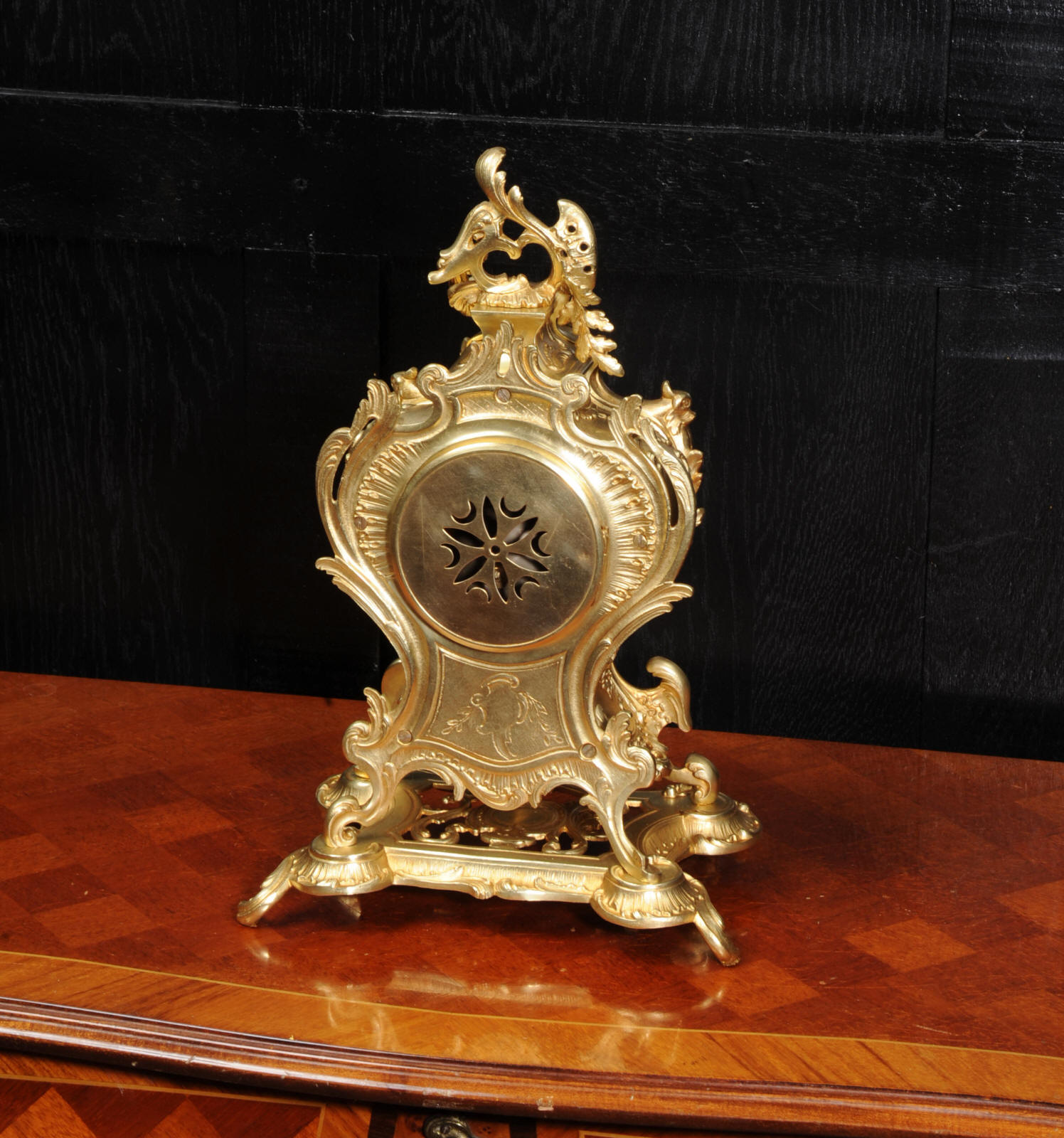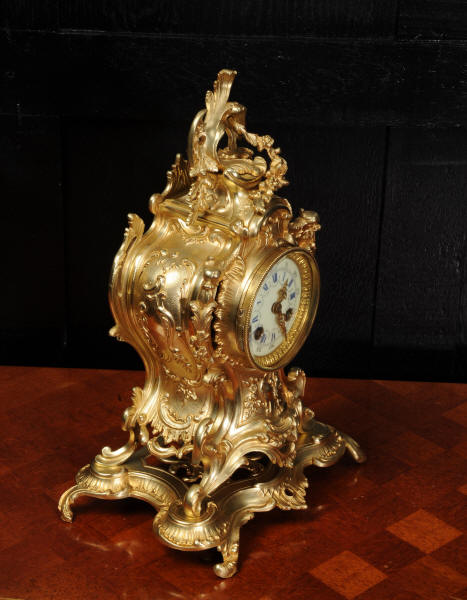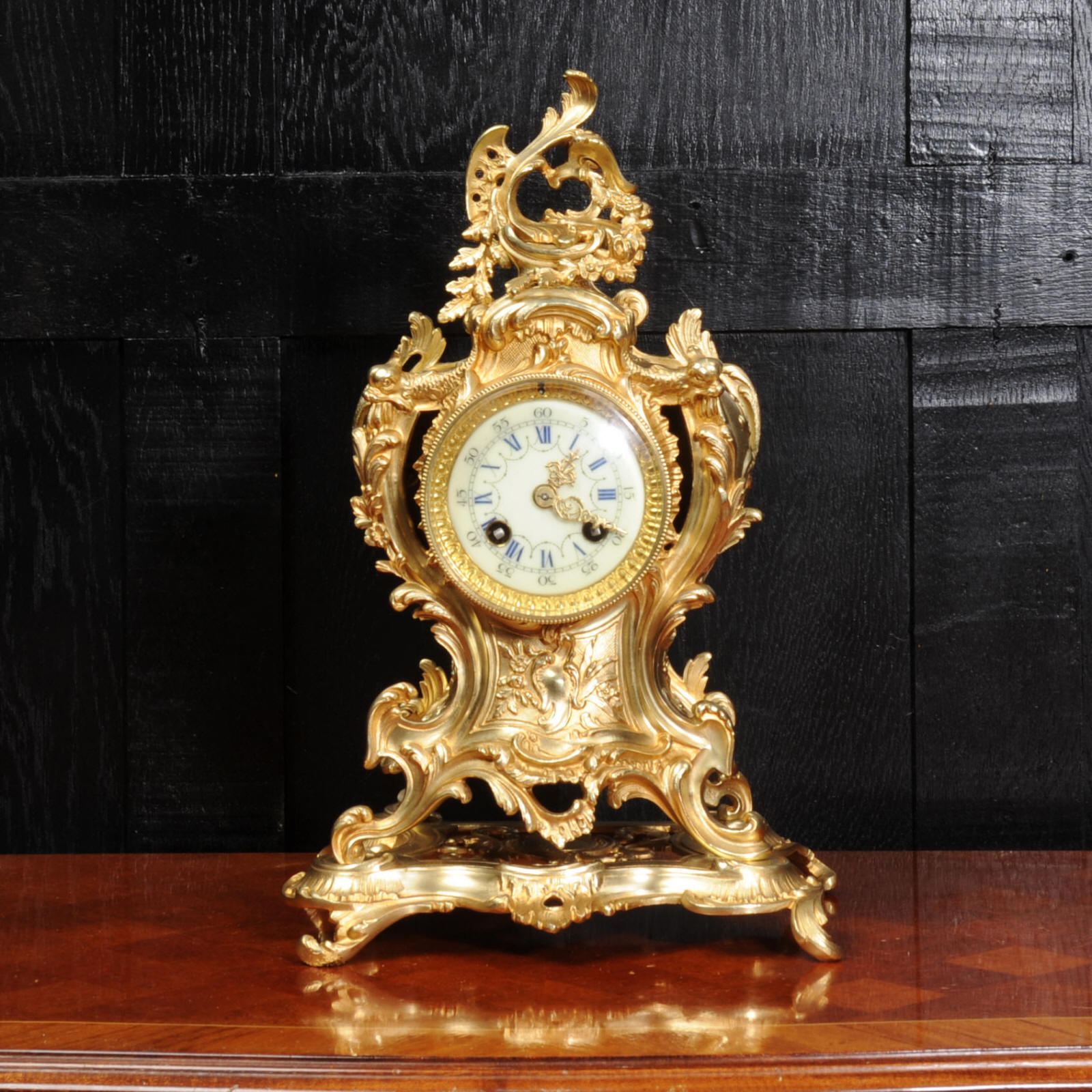 The dial is cream porcelain enamel, lettered in blue. It is complete with it's original finely fretted gilt hands and convex glazed bezel. The French movement is by Louis Japy and is in excellent clean and running condition having been fully overhauled by our clockmaker. Pendulum is a replacement. It runs for 8 days and strikes the hours and halves on a bell. Click the video clip below to hear the bell and watch the clock running. According to an advertisement in the 1896 issue of Didot-Bottin (directory and almanac for commerce, industry, judicial and civil services) the Maison H. Riondet, Comptoir General, a retailer, was one of ‘the most well-stocked shops for everything from: jewellery, bronze art objects, timepieces & furniture, precious stones, marble sculptures, silverware, ceiling lights & white metal, chandeliers, cutlery, lamps & diamond-facetted fireplaces, travel clocks, “fine-stone” pearls.’ It boasted ‘factory prices’ and ‘retail stores in Paris with no other branches, representatives, or offices in any other city, French or foreign.’ Maison H. Riondet was located at 9, boulevard Poissonnière and 45, rue du Sentier in Paris. The 1911 Annuaire de la Curiosité et des Beaux-Arts, a directory of curiosities and fine art, shows that the retailer was a member of the bronze manufacturing trade union. Intersecting the grand Parisian boulevards, the Comptoir Général was located on the royal route, which under the Second Empire already connected the Madeleine to the Gymnase Theatre. The retailer figured among the great Parisian stores of the late nineteenth-century, providing “free entry” to customers. Strolling from the Place de la Madeleine to the Café des Variétés on Boulevard Montmartre, elegant crowds stopped to admire the store’s display windows, stocked in an abundant and spectacular manner. The Comptoir Général was contemporary with other great department stores of the period, like the Grands Magasins du Louvre, Bon Marché, and La Samaritaine, and attested to the new forms of commerce developing during the second half of the nineteenth century. These stores became showcases; advertising in newspapers, they offered the consumer a diverse and varied product, displayed in a way that was elaborate and luxurious.