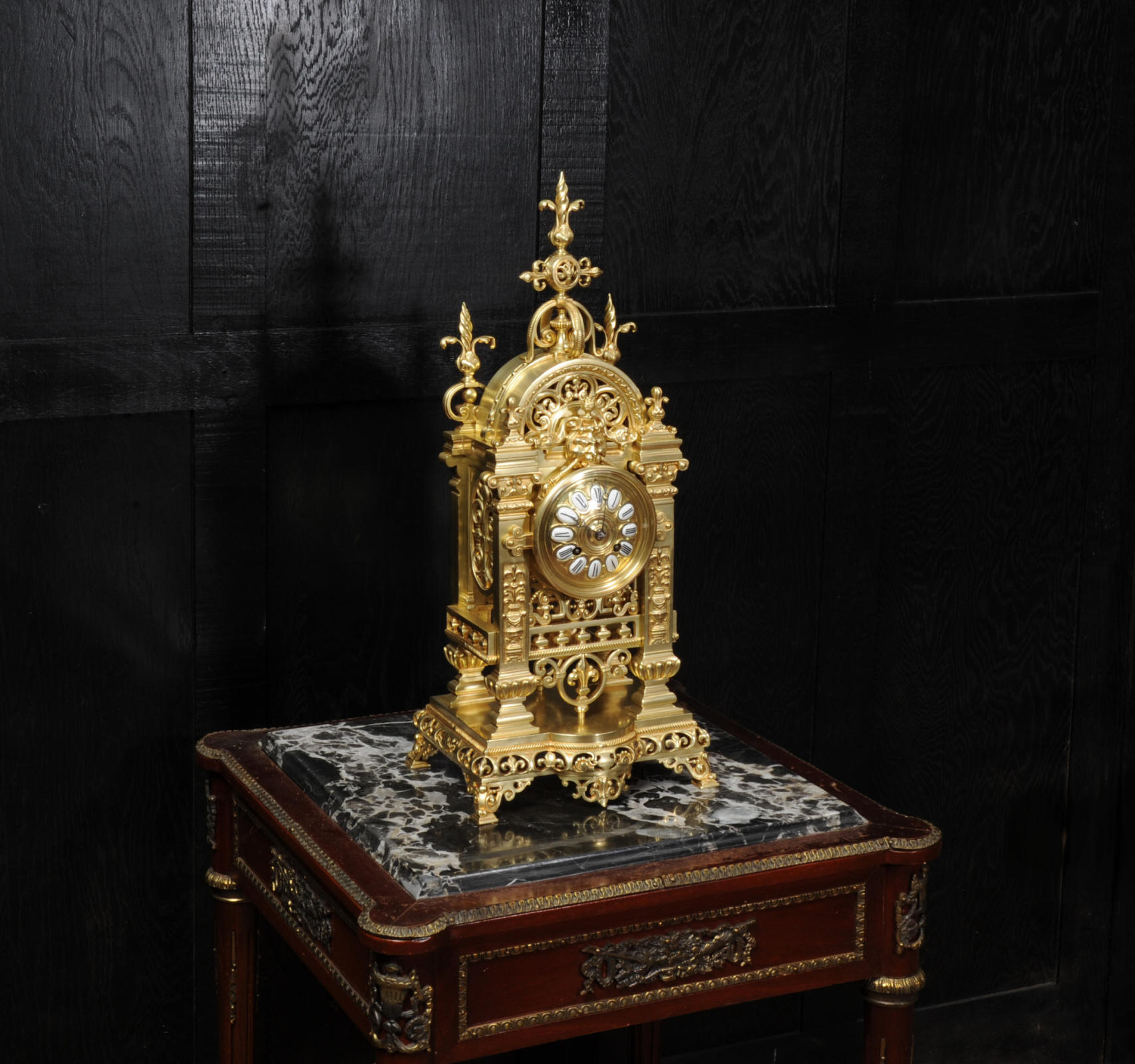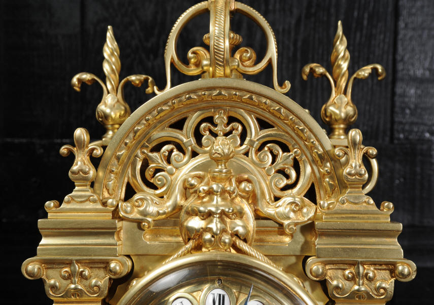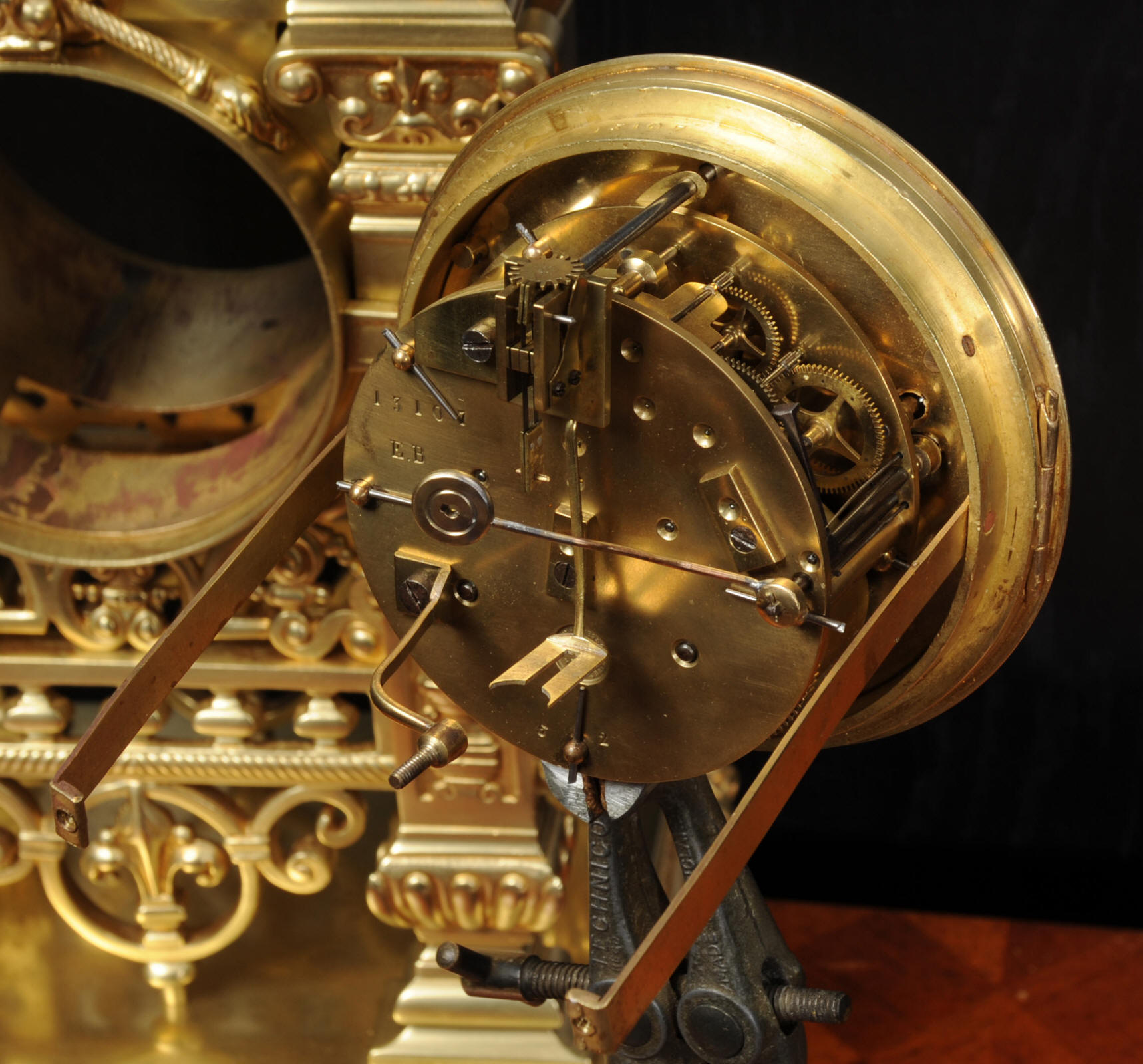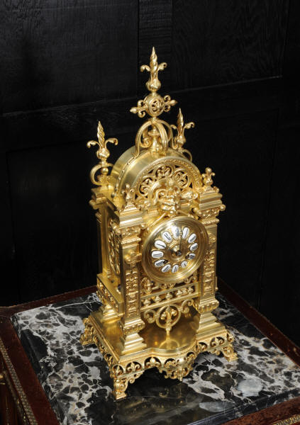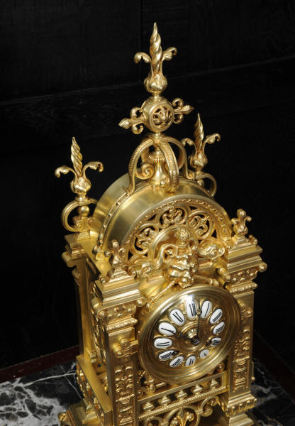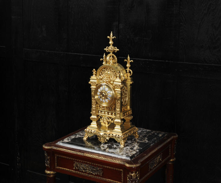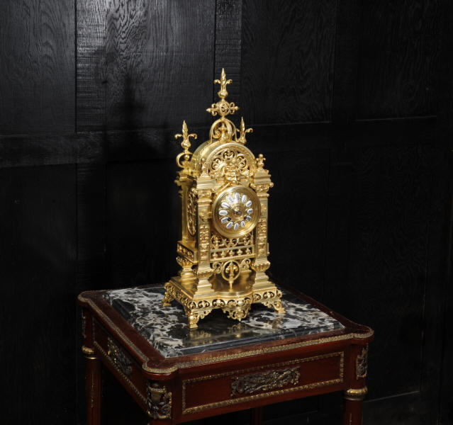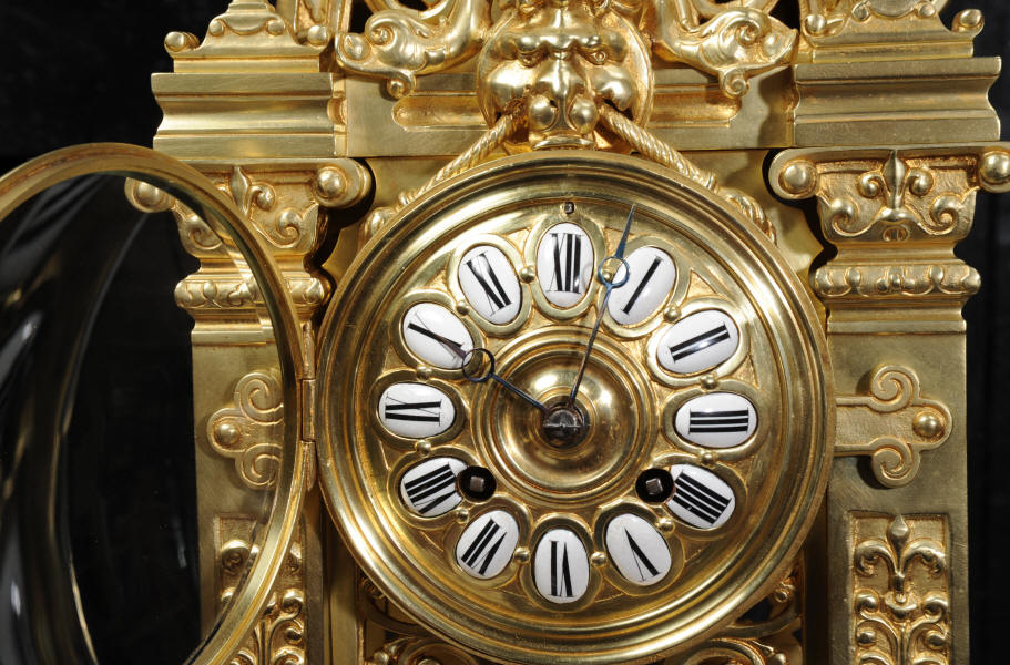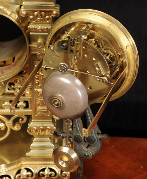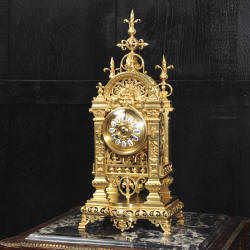 The dial is also gilt bronze with 12 individual enamel cartouches and blued steel hands. The French movement is by Japy Frères and is of high quality with rack striking and pin-pallet escapement. It is in excellent clean and running condition having been fully overhauled by our clockmaker. Pendulum is a replacement. It runs for 8 days and strikes the hours and halves on a bell. Click the video clip below to hear the bell and watch the clock running. Condition of the case is excellent, beautifully clean and bright just some minor marks and wear. The dial is also in excellent condition just some tiny nibbles next to the winding holes.