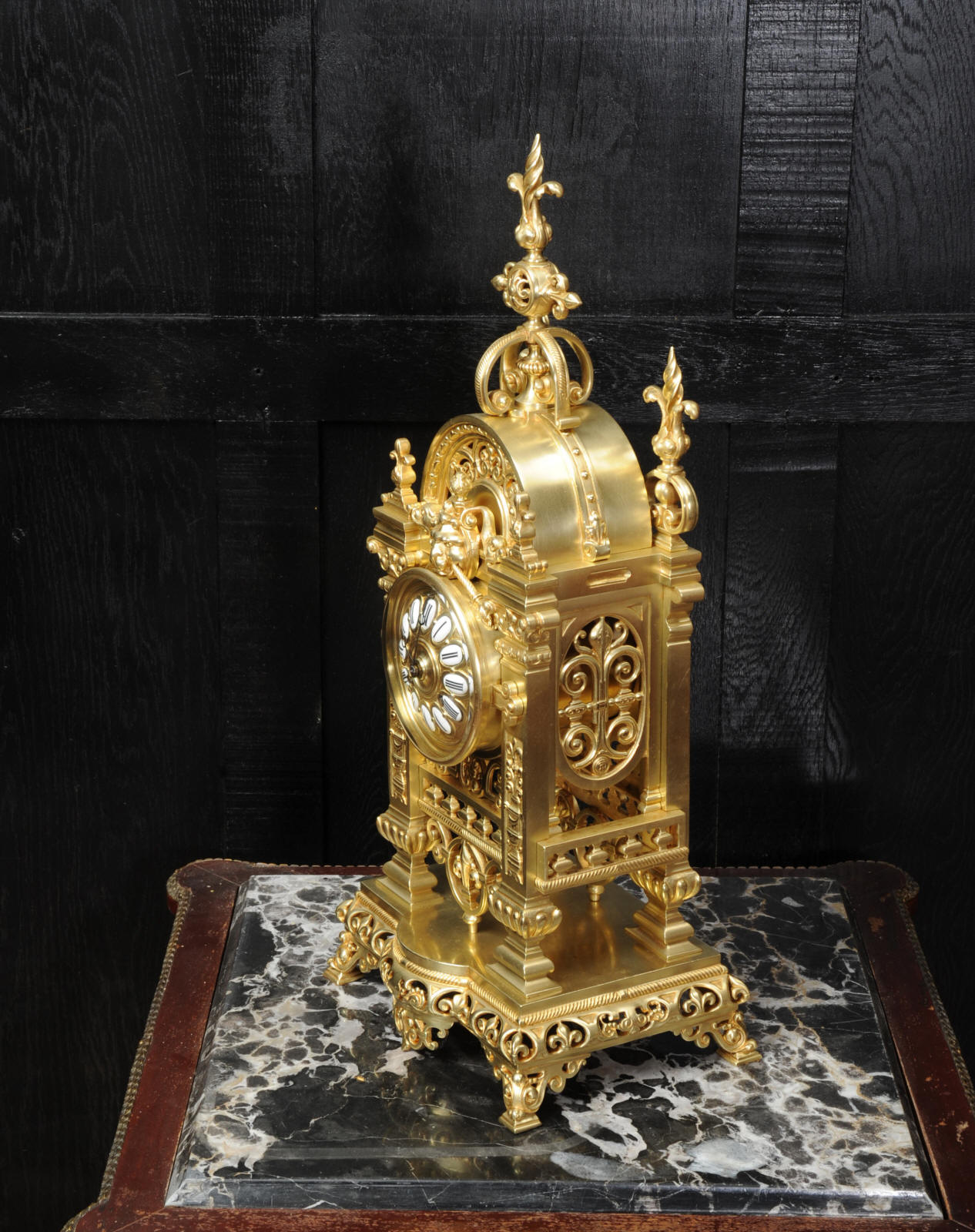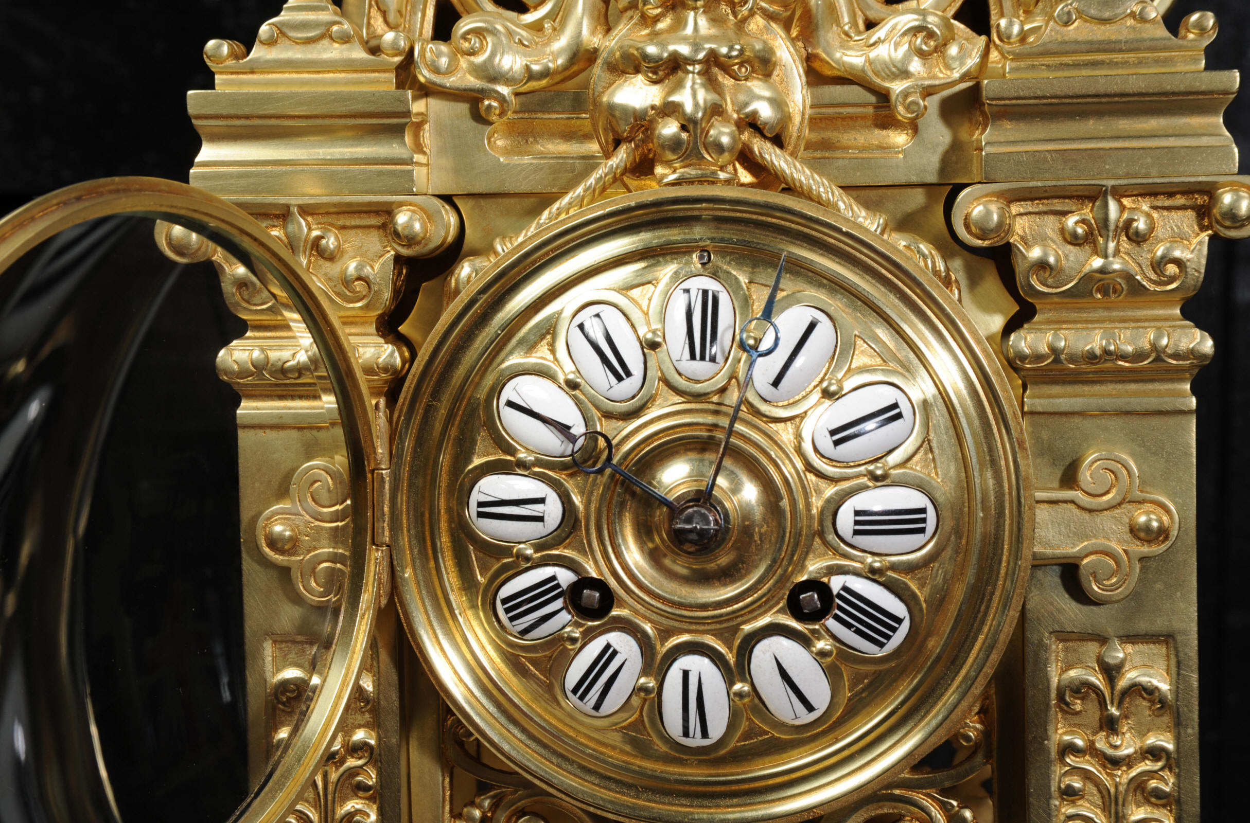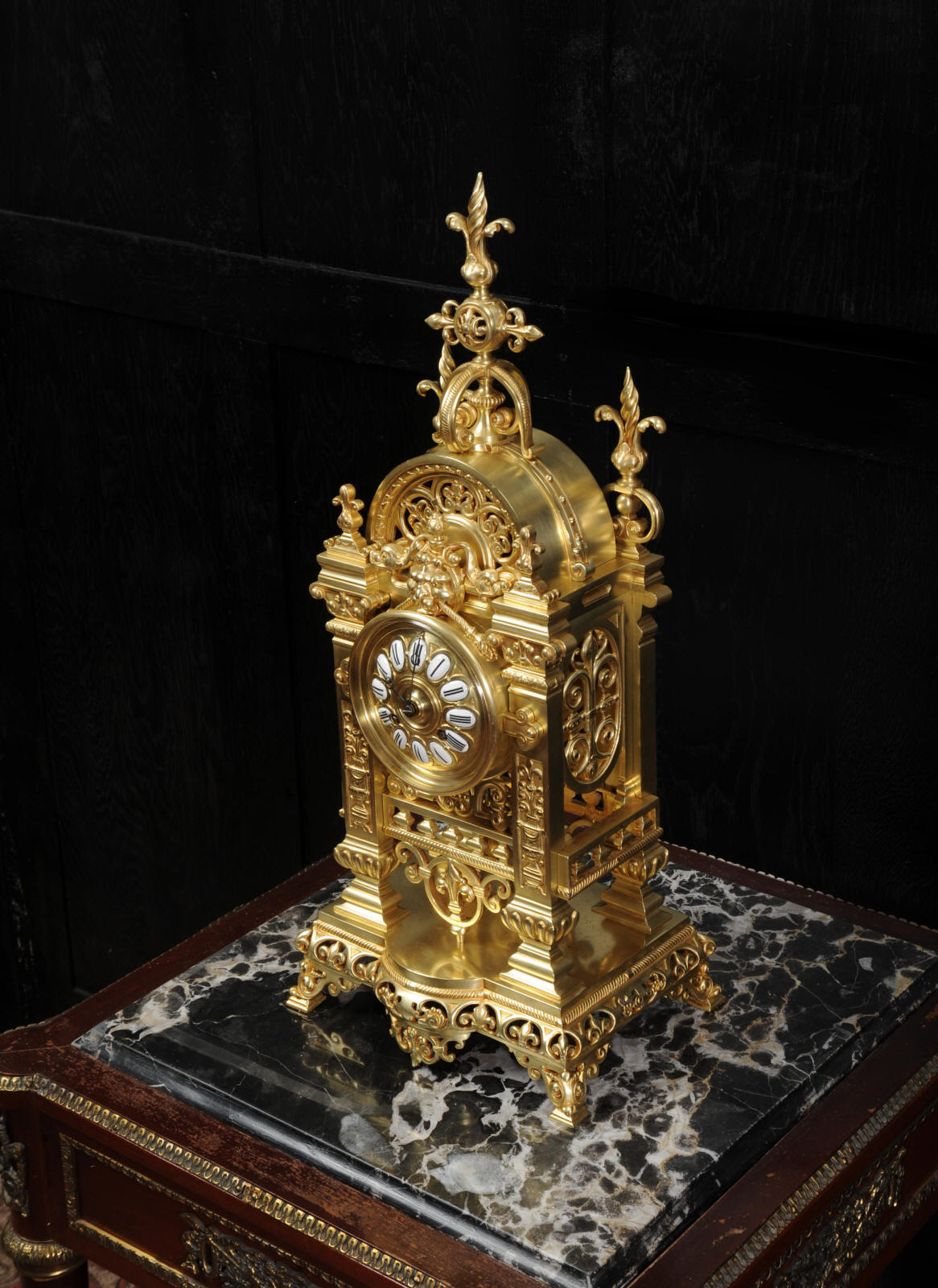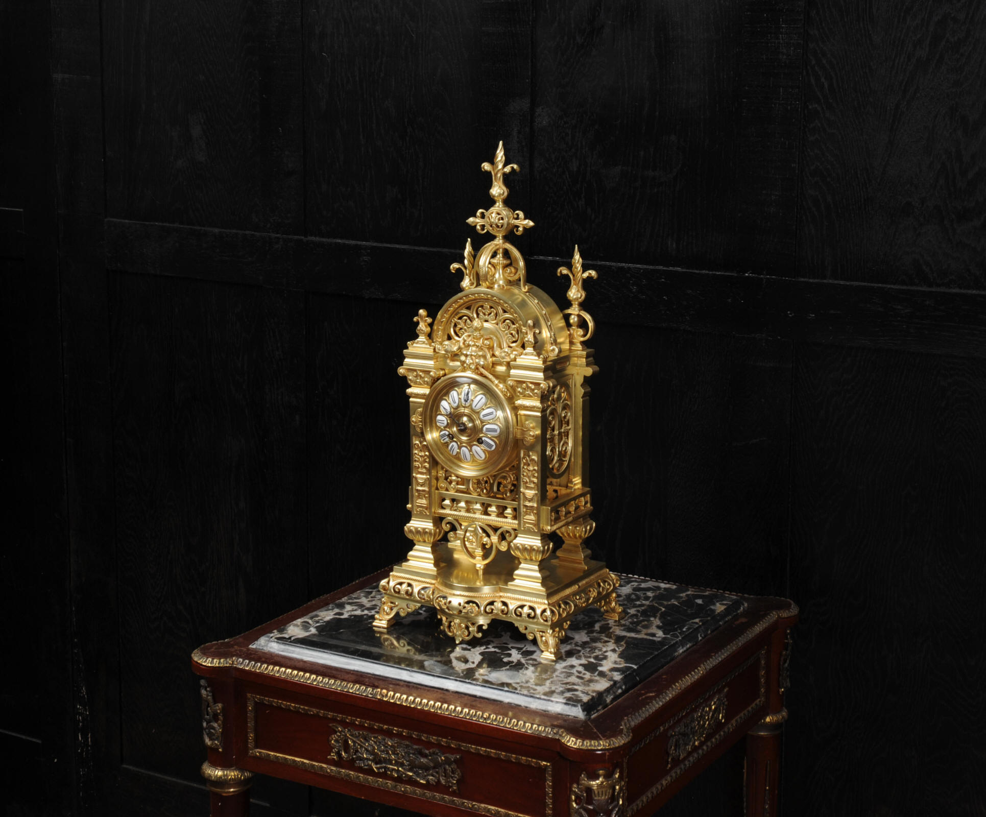 The dial is also gilt bronze with 12 individual enamel cartouches and blued steel hands. The French movement is by Japy Frères and is of high quality with rack striking and pin-pallet escapement. It is in excellent clean and running condition having been fully overhauled by our clockmaker. Pendulum is a replacement. It runs for 8 days and strikes the hours and halves on a bell. Click the video clip below to hear the bell and watch the clock running. Condition of the case is excellent, beautifully clean and bright just some minor marks and wear. The dial is also in excellent condition just some tiny nibbles next to the winding holes.