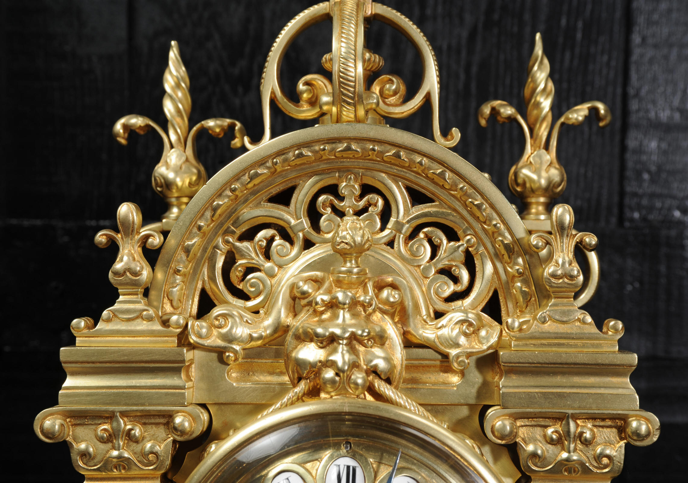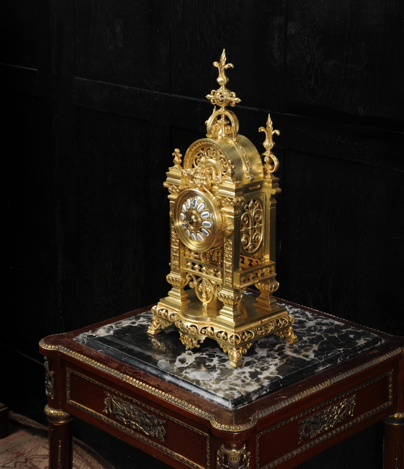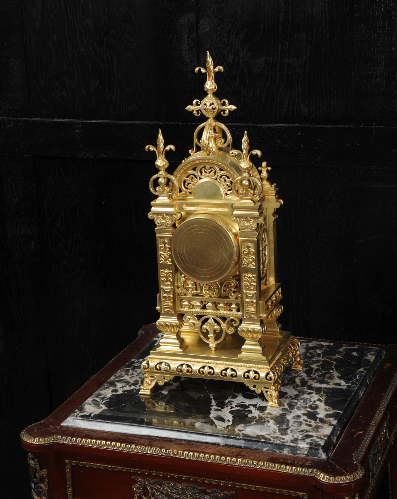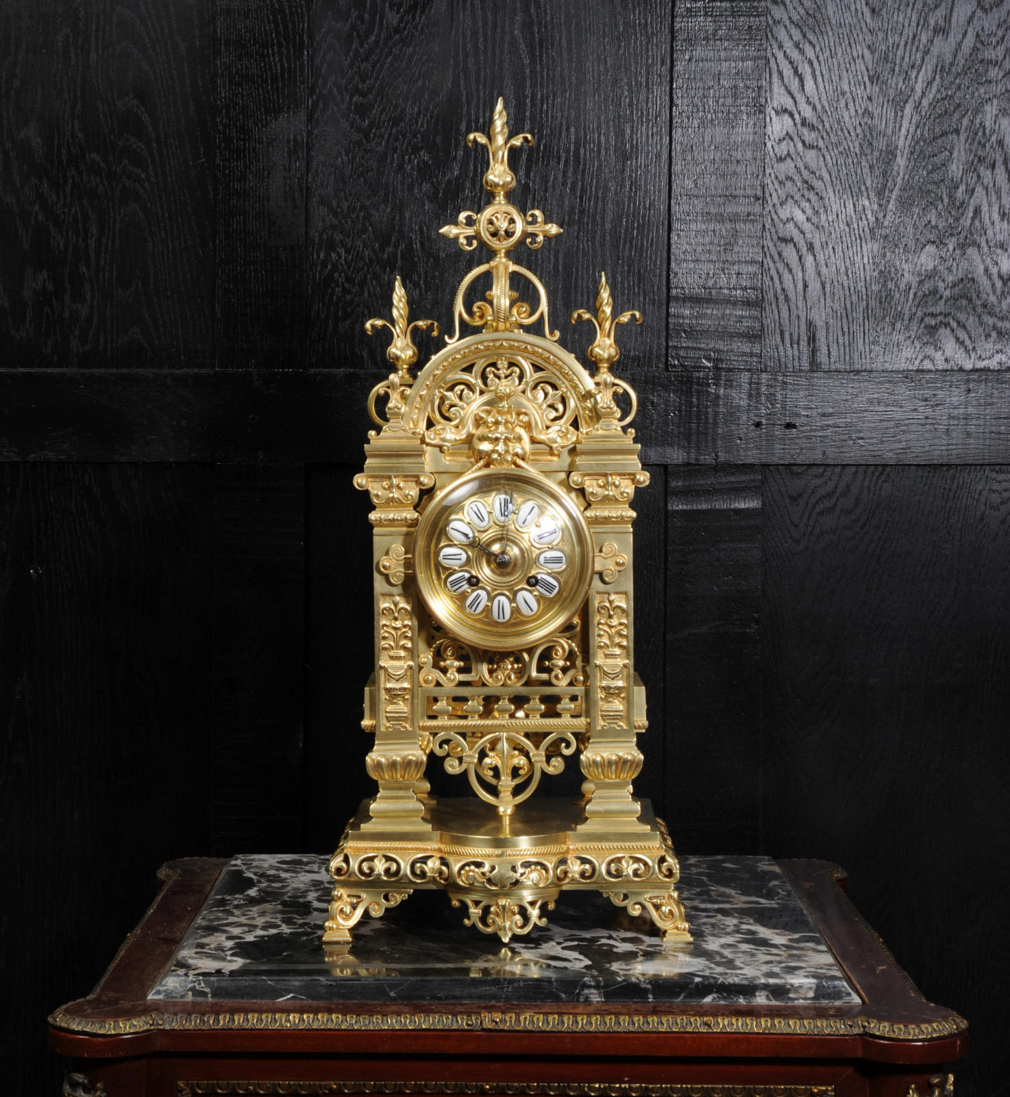 The dial is also gilt bronze with 12 individual enamel cartouches and blued steel hands. The French movement is by Japy Frères and is of high quality with rack striking and pin-pallet escapement. It is in excellent clean and running condition having been fully overhauled by our clockmaker. Pendulum is a replacement. It runs for 8 days and strikes the hours and halves on a bell. Click the video clip below to hear the bell and watch the clock running. Condition of the case is excellent, beautifully clean and bright just some minor marks and wear. The dial is also in excellent condition just some tiny nibbles next to the winding holes.