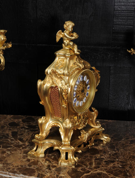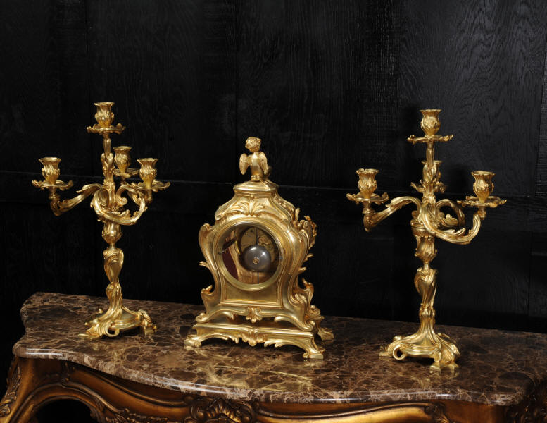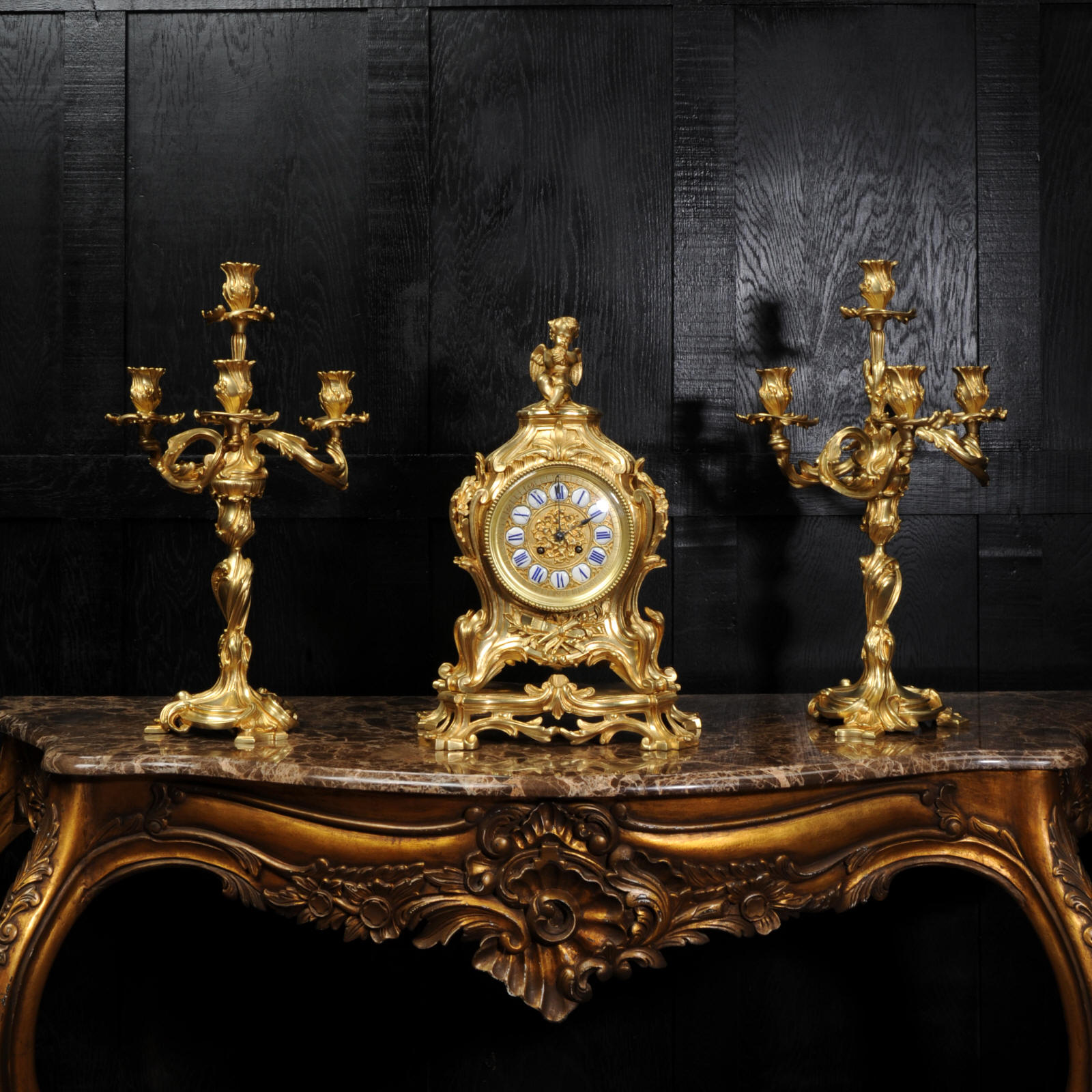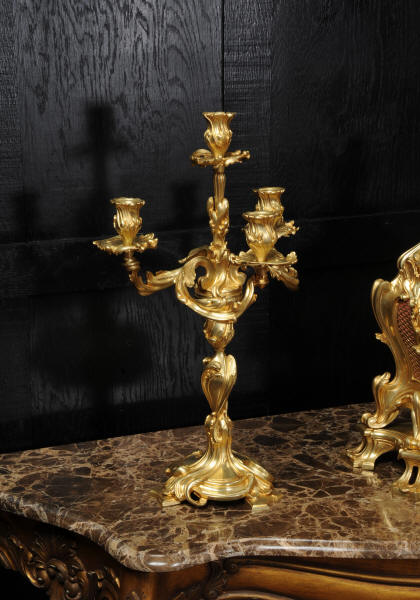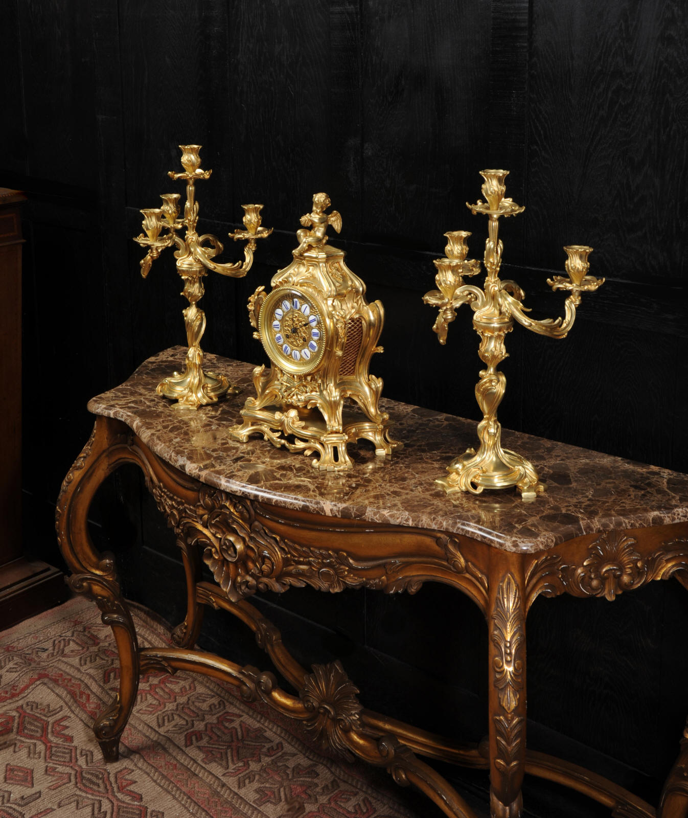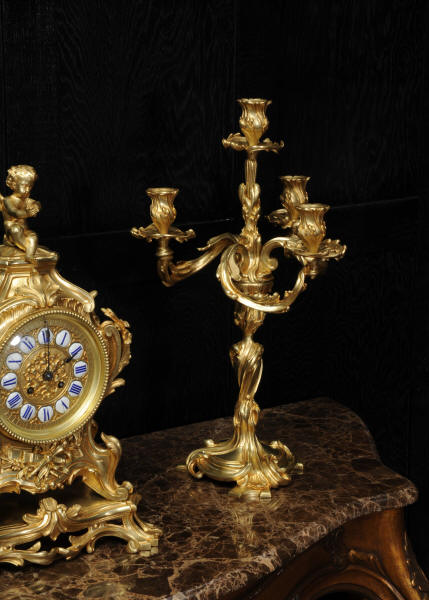 The large dial is also gilt bronze with 12 individual enamel cartouches and original finely fretted blued steel hands. The Rococo bezel is fitted with convex glass. A reflection of the pendulum swinging can be seen in the polished base. Juste-Aurèle Meissonnier The form of these candelabra is based on designs by the highly inventive and influential rococo goldsmith and architect Juste-Aurèle Meissonnier (1695-1750). Born in Turin, Meissonnier emigrated to France to work in the royal Gobelins factory in 1724 and in 1726 succeeded Jean II Bérain as architect and draughtsman to the Chambre et Cabinet du Roi. His designs for candelabra and other objects appear in the Dousieme livre des Oeuvres de J. A. Messonnier, Livre de Chandeliers de Sculpture en Argent published by Gabriel Huquier in the 1740s. A similar candelabrum in the Munich Residenz is illustrated in Ottomeyer and Pröschel, Vergoldete Bronzen (Munich 1986), Vol. I, p.105 fig.2.I.9. The French movement is of high quality and is by Samuel Marti. It is in excellent clean and running condition having been fully overhauled by our clockmaker. Pendulum is a replacement. It runs for 8 days and strikes the hours and halves on a bell. Click the video clip below to hear the bell and watch the clock running! Condition of the case is excellent, beautifully clean and bright with hardly any wear or discolouration and there are no losses. The dial is also in excellent condition; just some cracking to the number eleven cartouche. We have refreshed the red cloth of the sound frets.