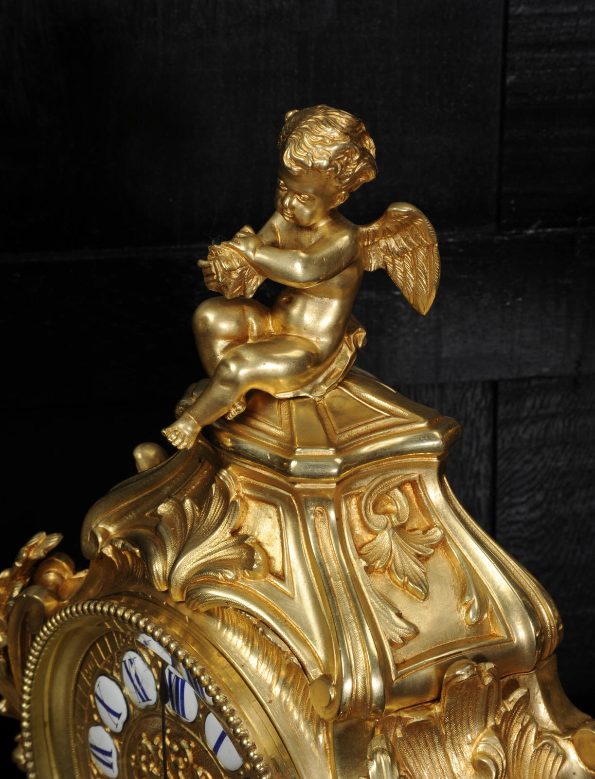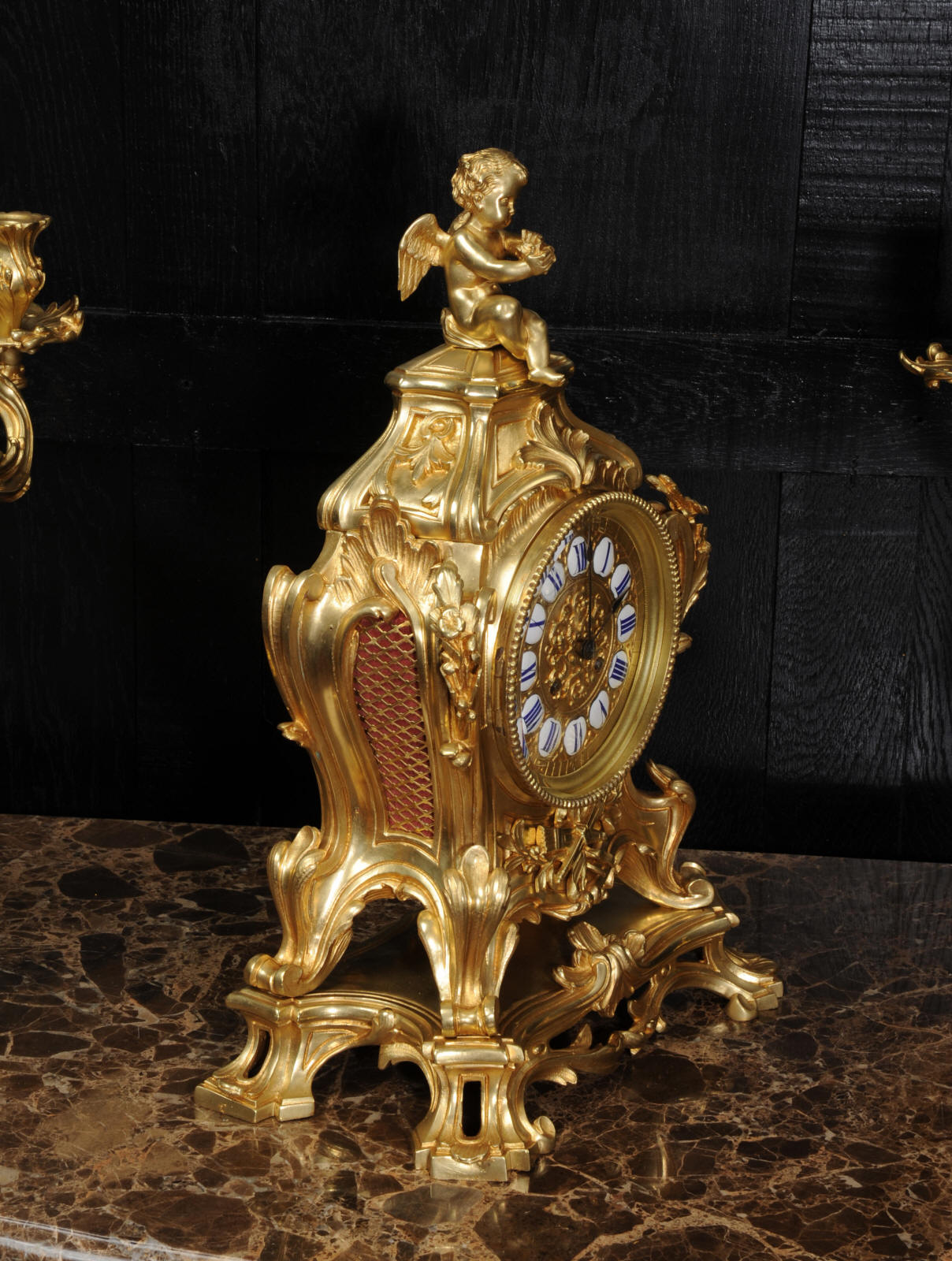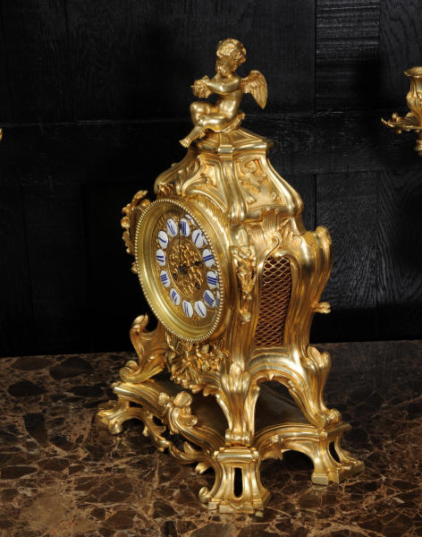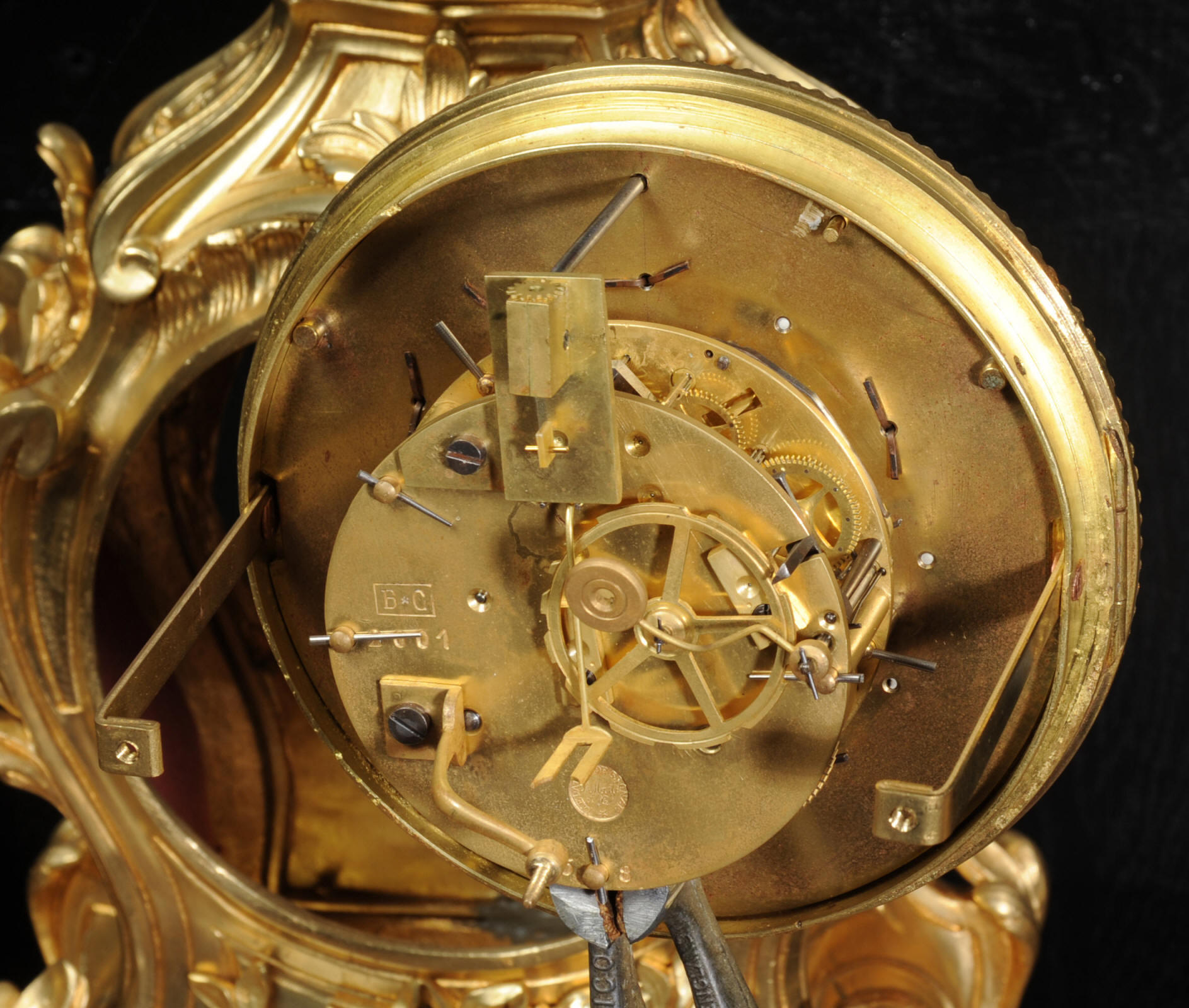 The large dial is also gilt bronze with 12 individual enamel cartouches and original finely fretted blued steel hands. The Rococo bezel is fitted with convex glass. A reflection of the pendulum swinging can be seen in the polished base. Juste-Aurèle Meissonnier The form of these candelabra is based on designs by the highly inventive and influential rococo goldsmith and architect Juste-Aurèle Meissonnier (1695-1750). Born in Turin, Meissonnier emigrated to France to work in the royal Gobelins factory in 1724 and in 1726 succeeded Jean II Bérain as architect and draughtsman to the Chambre et Cabinet du Roi. His designs for candelabra and other objects appear in the Dousieme livre des Oeuvres de J. A. Messonnier, Livre de Chandeliers de Sculpture en Argent published by Gabriel Huquier in the 1740s. A similar candelabrum in the Munich Residenz is illustrated in Ottomeyer and Pröschel, Vergoldete Bronzen (Munich 1986), Vol. I, p.105 fig.2.I.9. The French movement is of high quality and is by Samuel Marti. It is in excellent clean and running condition having been fully overhauled by our clockmaker. Pendulum is a replacement. It runs for 8 days and strikes the hours and halves on a bell. Click the video clip below to hear the bell and watch the clock running! Condition of the case is excellent, beautifully clean and bright with hardly any wear or discolouration and there are no losses. The dial is also in excellent condition; just some cracking to the number eleven cartouche. We have refreshed the red cloth of the sound frets.