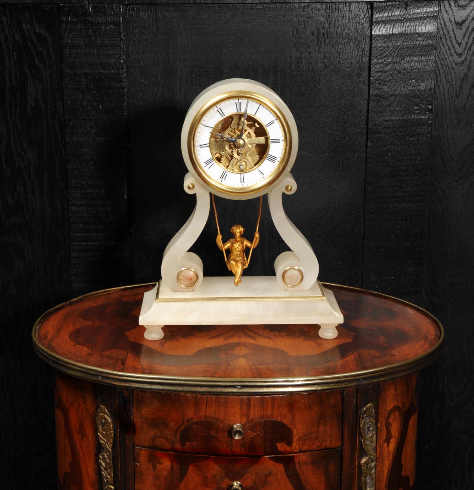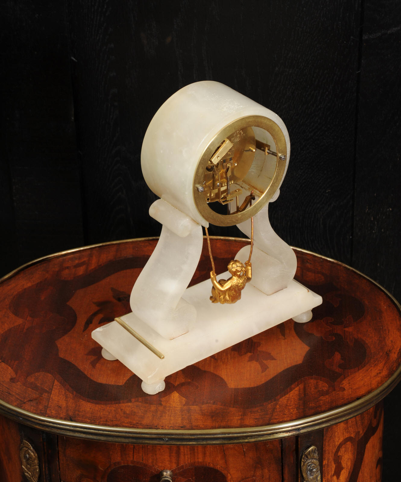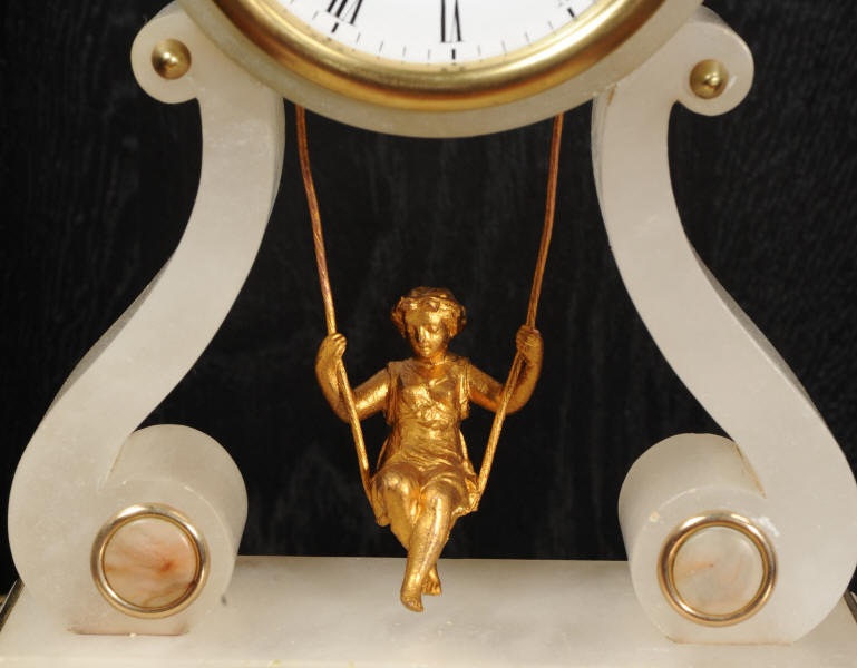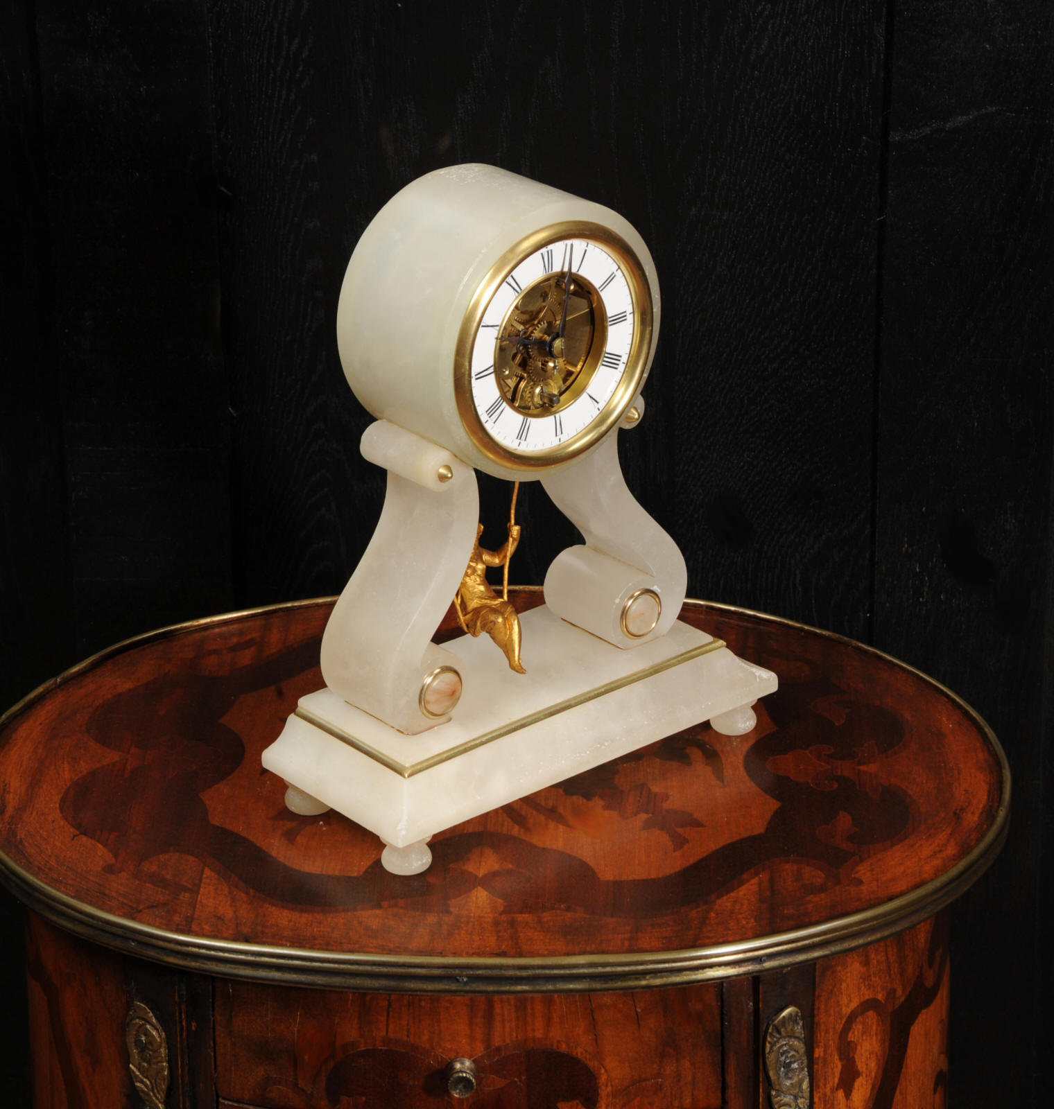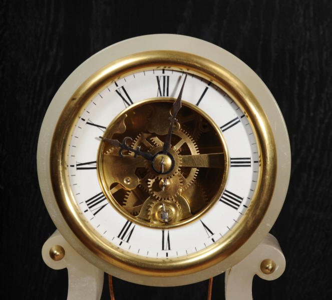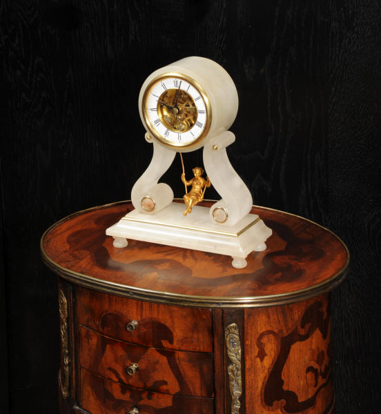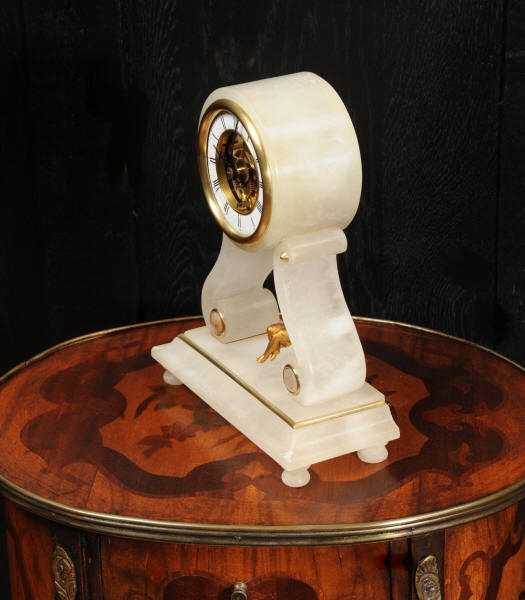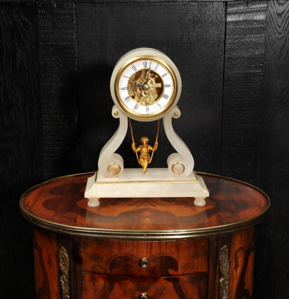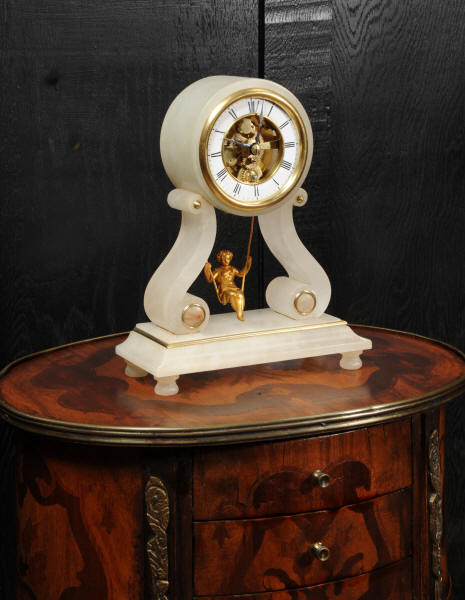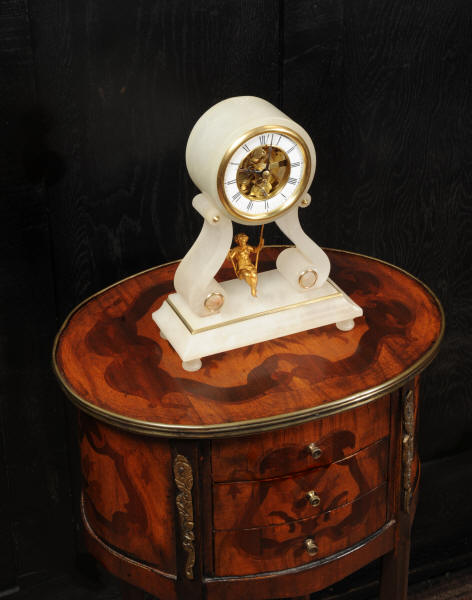The case is beautifully simple and chic, made of the semi-translucent rock alabaster. The original maiden pendulum is gilt metal. This is a delightful clock to watch, please see the video below. The dial is enamel on copper in the form of a ring around the centre which is open to allow the skeletonised movement to be seen. Please note, this type of clock does not have a glazed bezel or a rear door. The French movement is by Farcot and is of lovely quality. We have fully overhauled it and tested it to ensure proper running. It runs for 7 days on one wind. Please note that these are novelty clocks and therefore don't keep exceptionally good time. Click the video clip below to watch the clock running! Condition of the case is very good, alabaster is a delicate material and there are one or two marks, discolouration and nibbles to the edges, particularly to the top, and a chip to one back foot. The dial is also in excellent condition, just some faint marks. The metal work including the cherub is in good clean and bright condition, with some minor wear to the cherub. This is a rare and delightful clock to add to your collection.