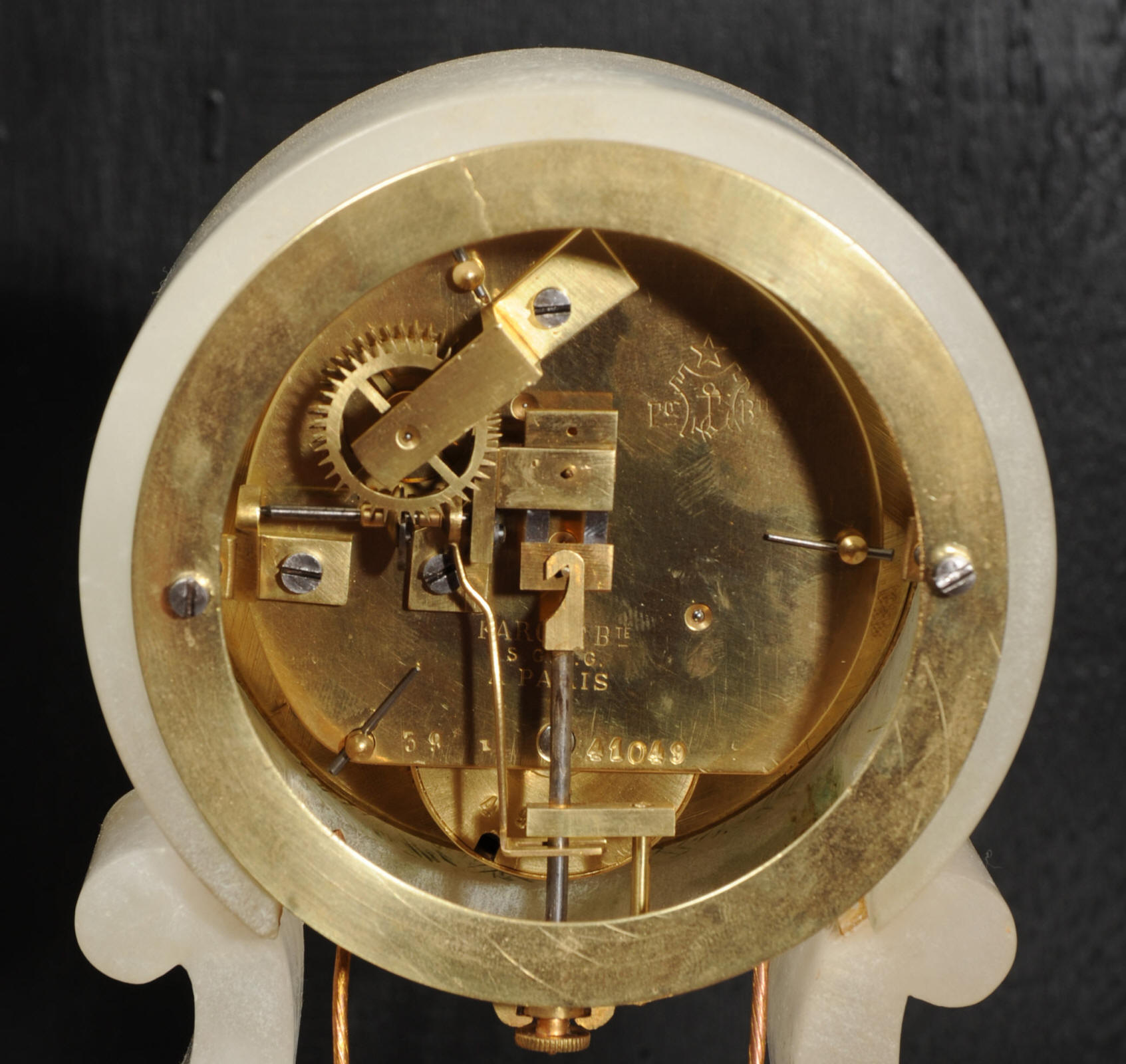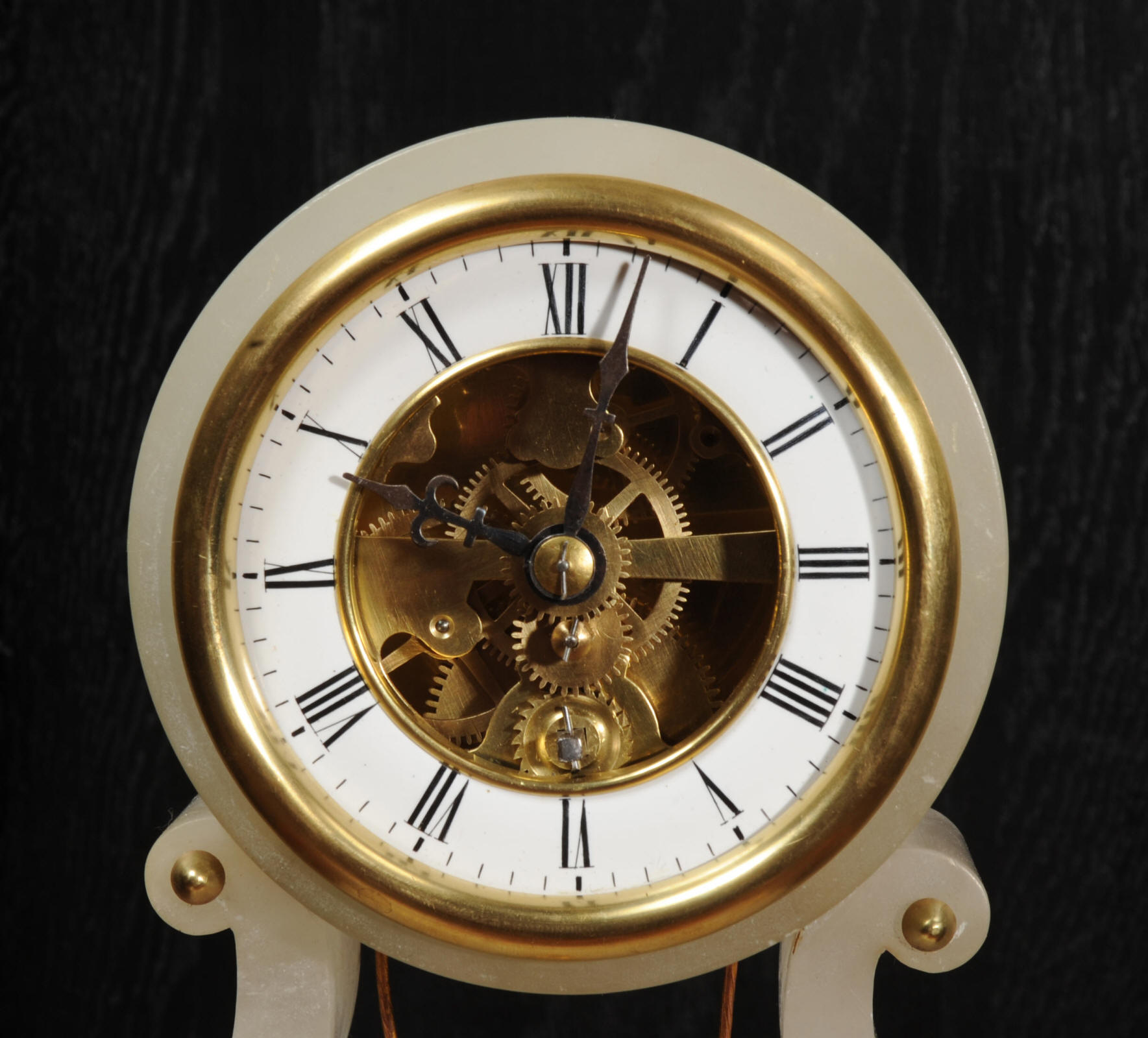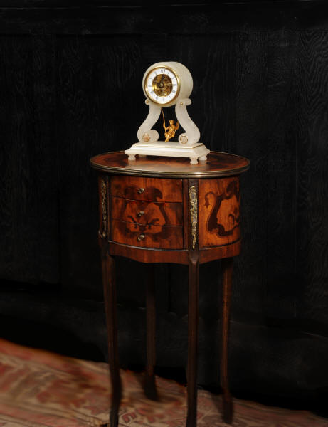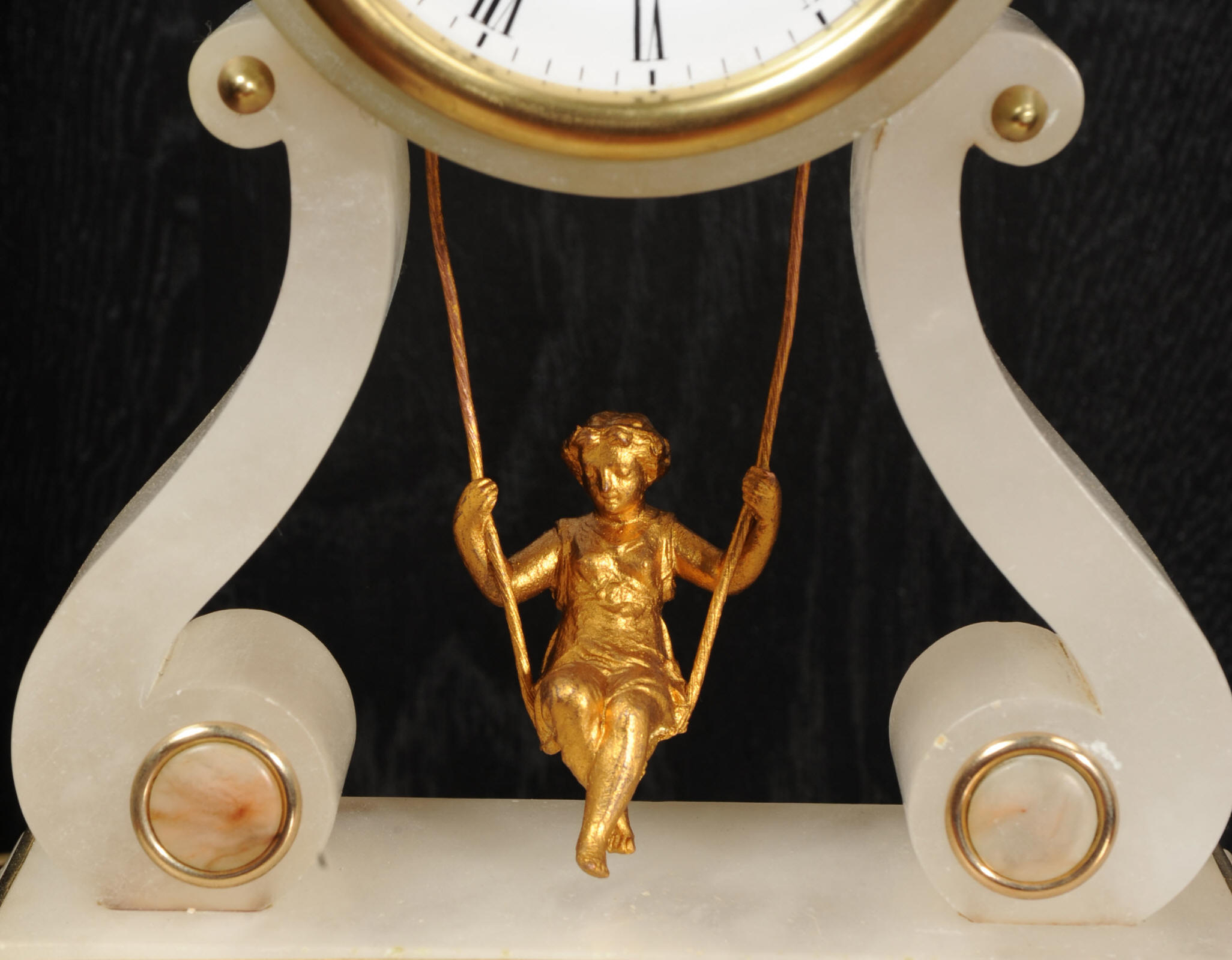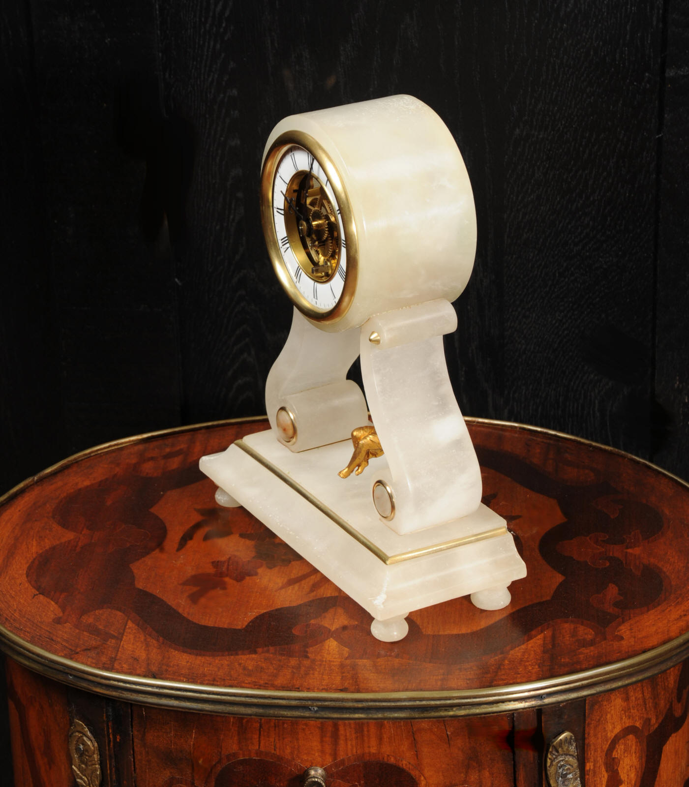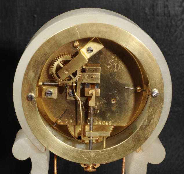 The case is beautifully simple and chic, made of the semi-translucent rock alabaster. The original maiden pendulum is gilt metal. This is a delightful clock to watch, please see the video below. The dial is enamel on copper in the form of a ring around the centre which is open to allow the skeletonised movement to be seen. Please note, this type of clock does not have a glazed bezel or a rear door. The French movement is by Farcot and is of lovely quality. We have fully overhauled it and tested it to ensure proper running. It runs for 7 days on one wind. Please note that these are novelty clocks and therefore don't keep exceptionally good time. Click the video clip below to watch the clock running! Condition of the case is very good, alabaster is a delicate material and there are one or two marks, discolouration and nibbles to the edges, particularly to the top, and a chip to one back foot. The dial is also in excellent condition, just some faint marks. The metal work including the cherub is in good clean and bright condition, with some minor wear to the cherub. This is a rare and delightful clock to add to your collection.
