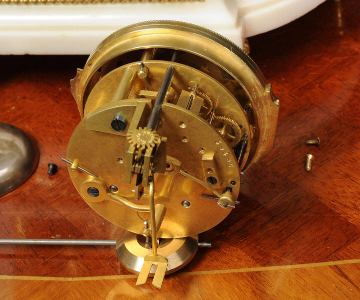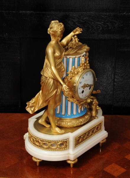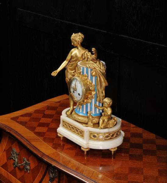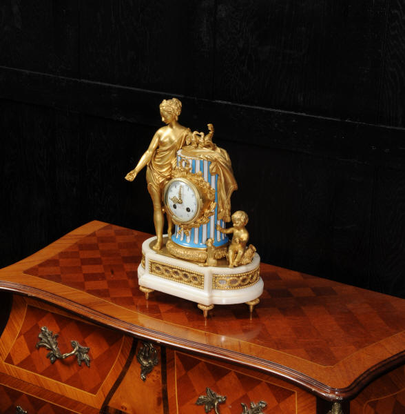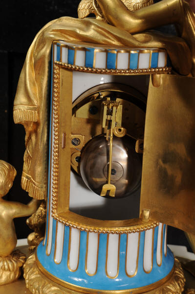 Marie-Antoinette's Bathroom The original 18th Century clock is still in position on the marble mantle in the Queen's small apartments, in her bathroom. Marie-Antoinette had them created in 1782 and the new rooms consisted of: a bedroom, a library and the bathroom. 6 years later the Queen had the rooms refurbished and the wood-paneling decorated by the Rousseau brothers. The original clock was designed by Charles-Nicolas Dutertre with bronze work by master founder Francois Vion and porcelain by Sèvres. The French movement is a miniature version of the Pendule de Paris movement by Vincenti and is of high quality with pin-pallet escapement and rack striking. It is in excellent clean and running condition having been fully overhauled by our clockmaker. Pendulum is a replacement. It runs for 8 days and strikes the hours and halves on a bell. Click the video clip below to hear the bell and watch the clock running! Condition of the case is excellent, the original gilding is beautifully clean and bright with some wear and discolouration. The dial is also in excellent condition just some wear around the Brocot shaft above the 12 o'clock. Marble base has some cracks / old repairs at the rear. Silver plated copper has some slight tarnish. Porcelain is excellent with no damaged.