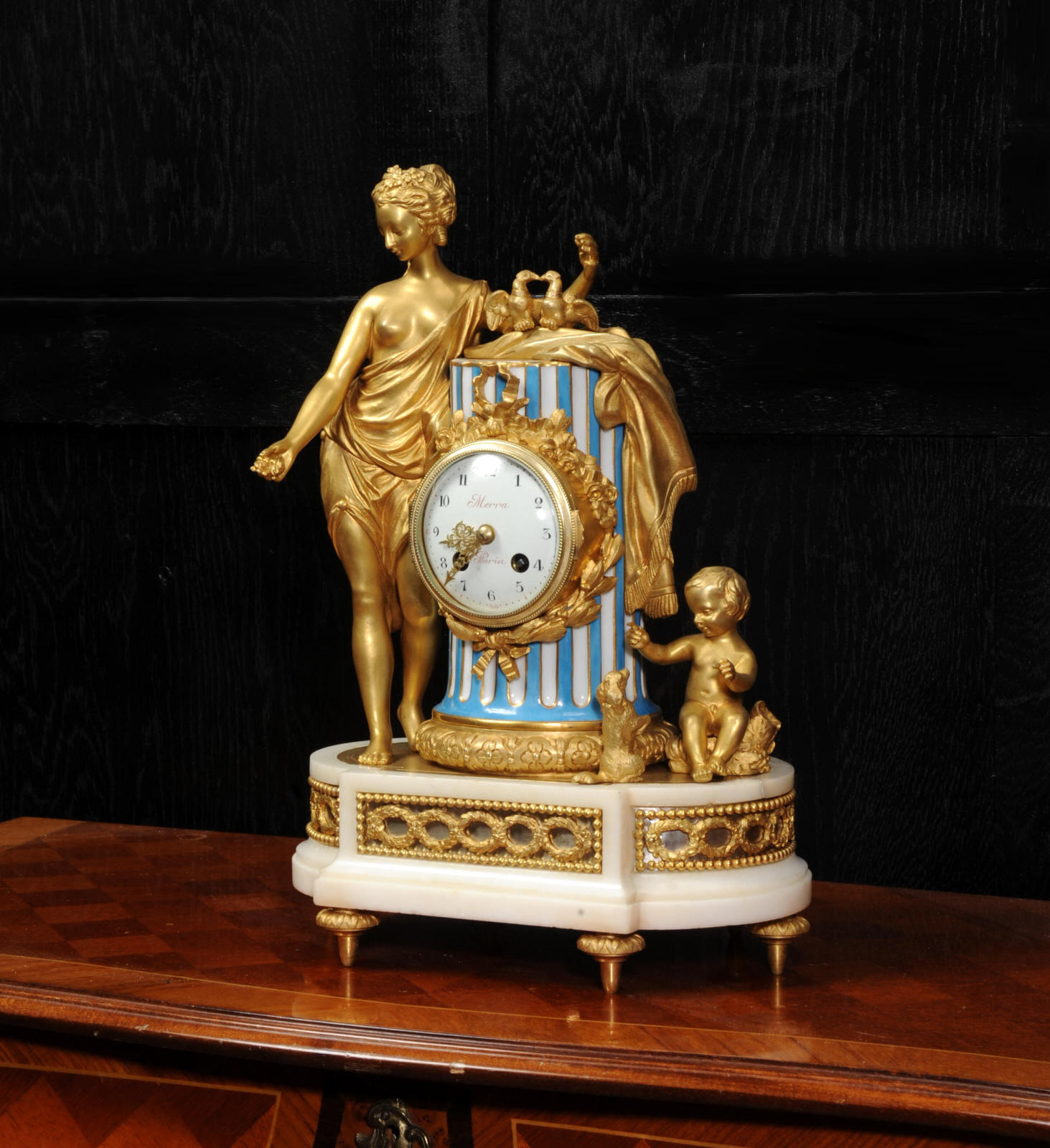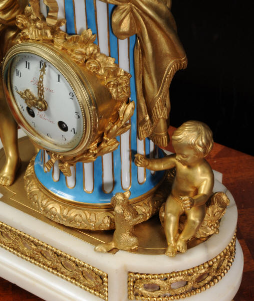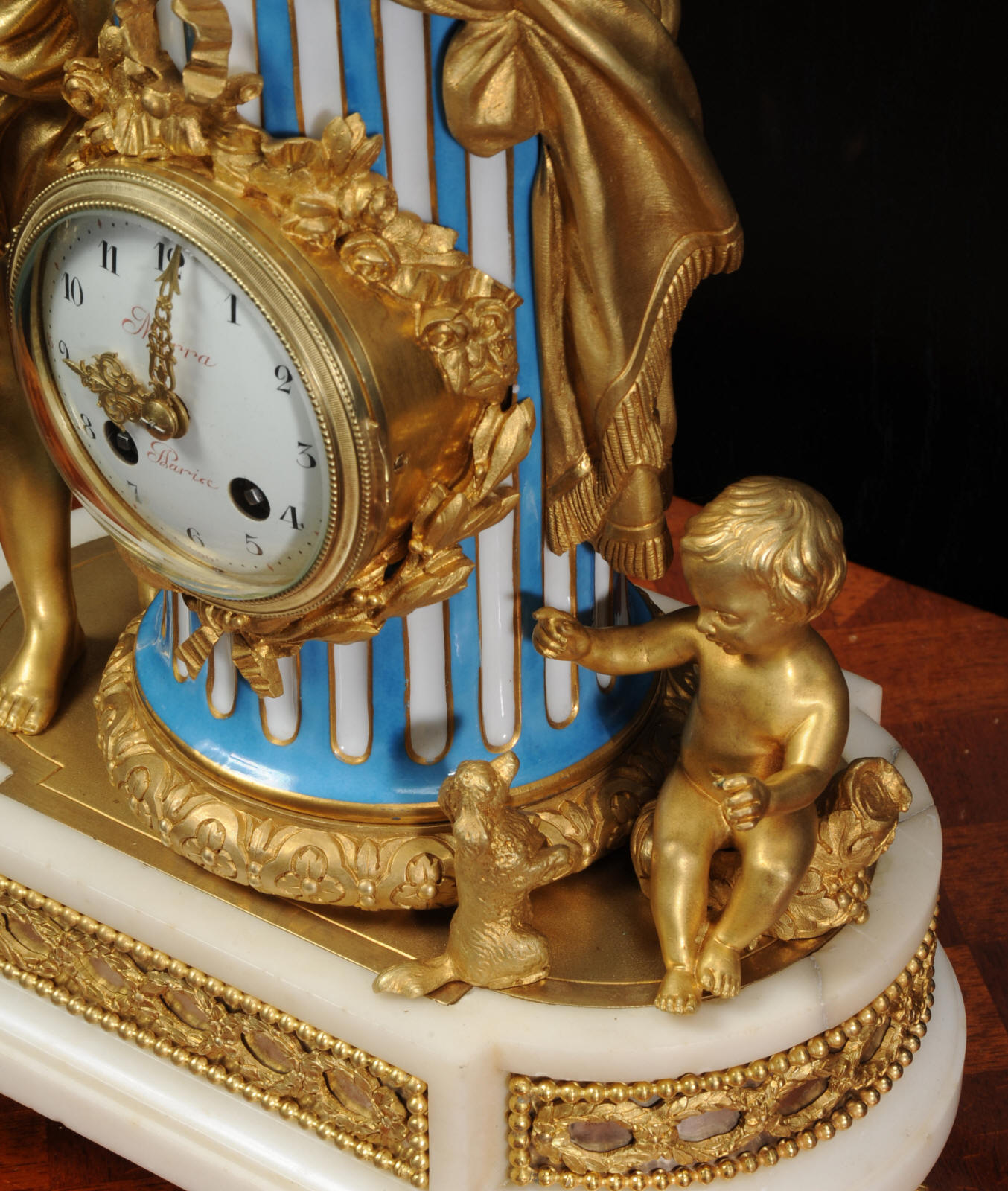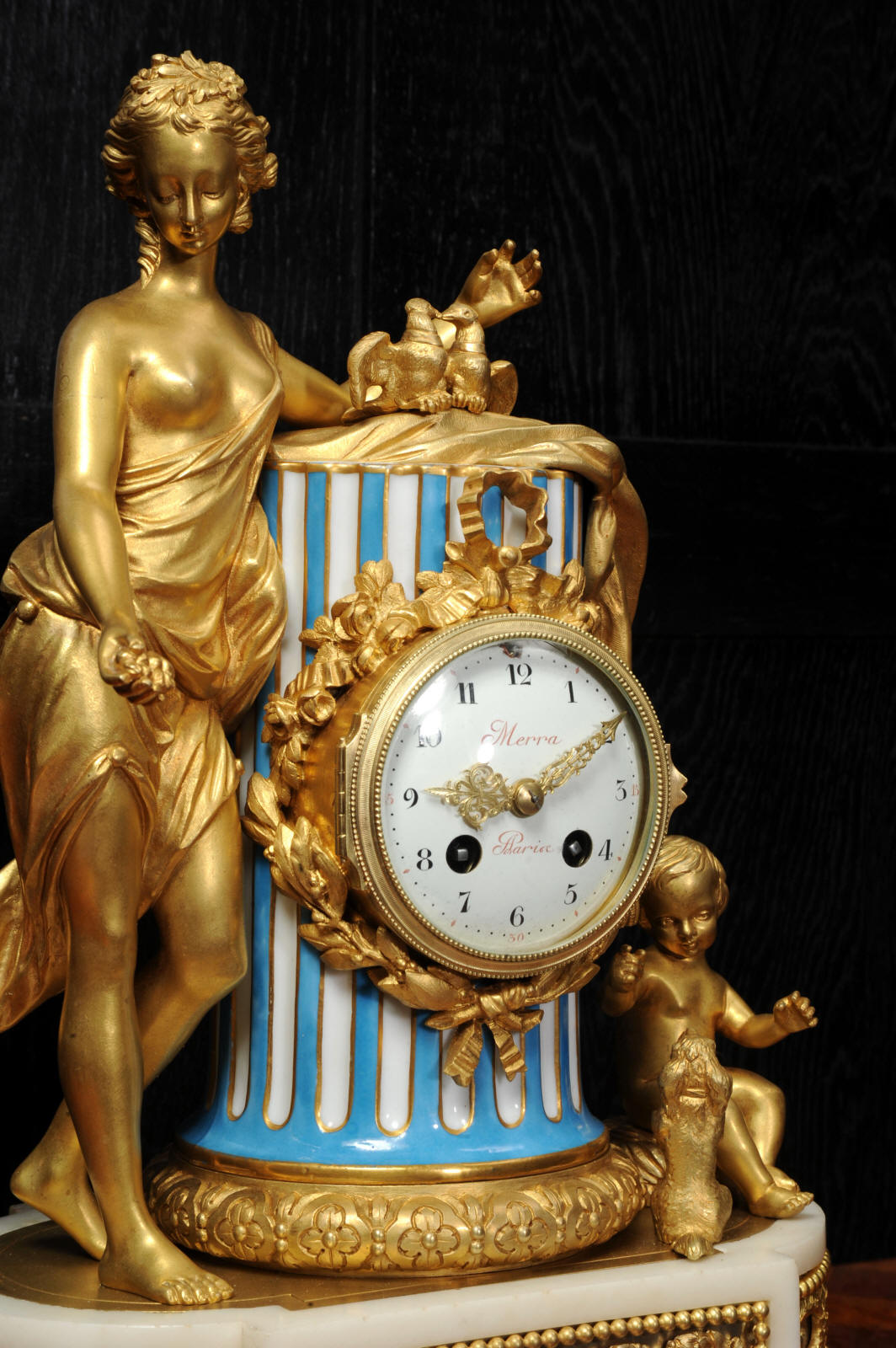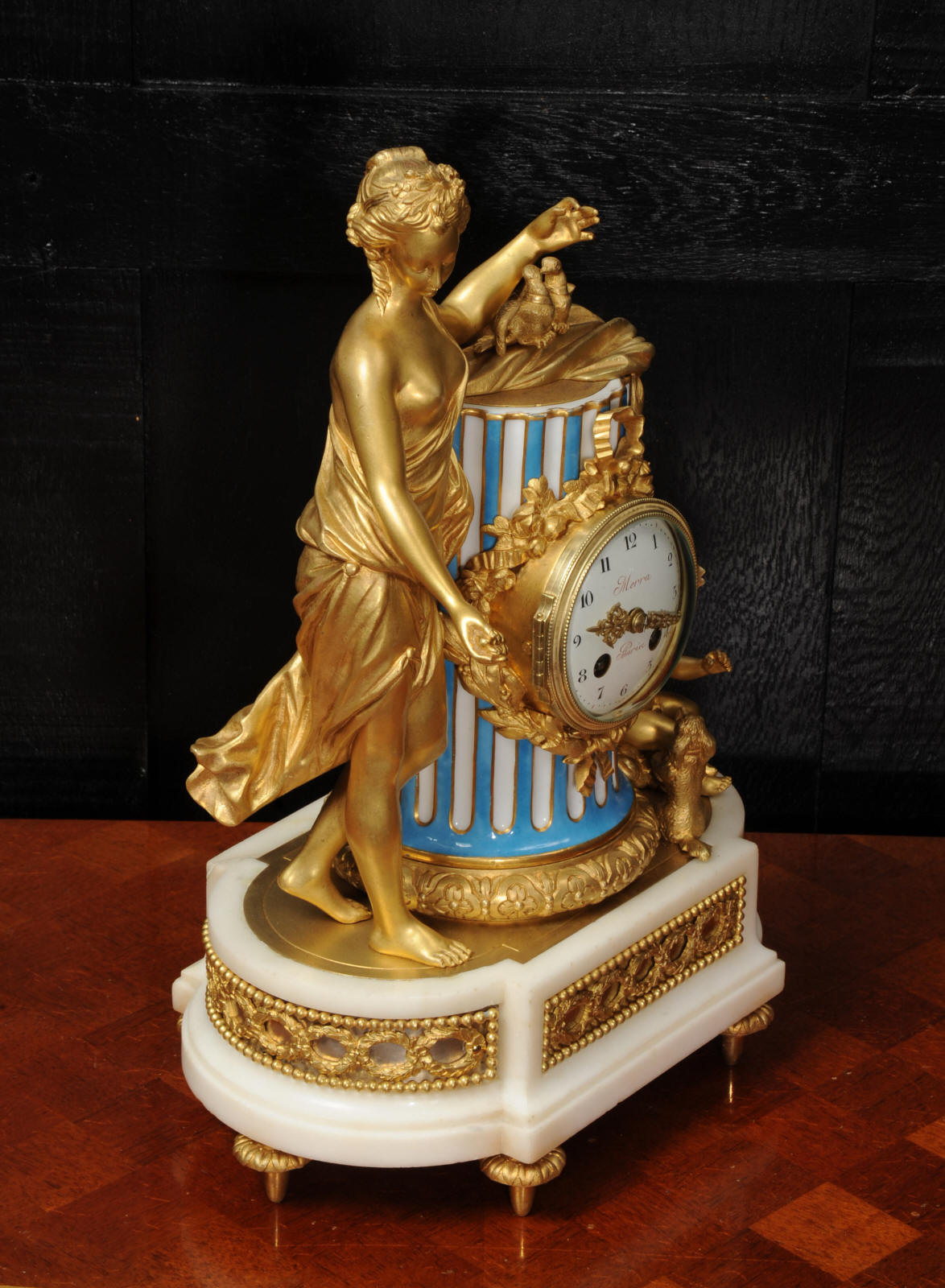The whole rests on an oval base with projections adorned with a frieze of laurels backed with silver plated copper standing on 6 feet with leafy tops. The dial is porcelain on copper with the original beautifully cut gilt hands. The dial is signed in Homage to the 18th century clockmaker Pierre Merra