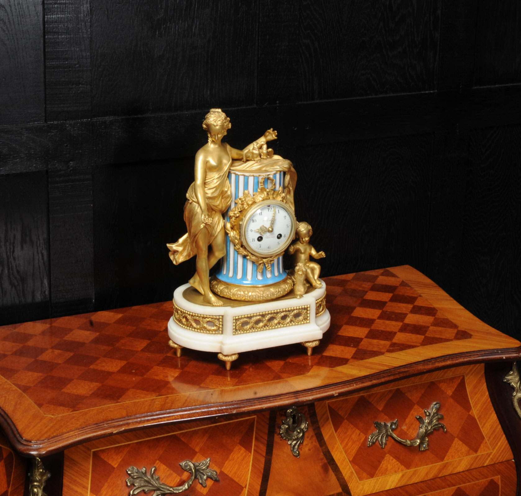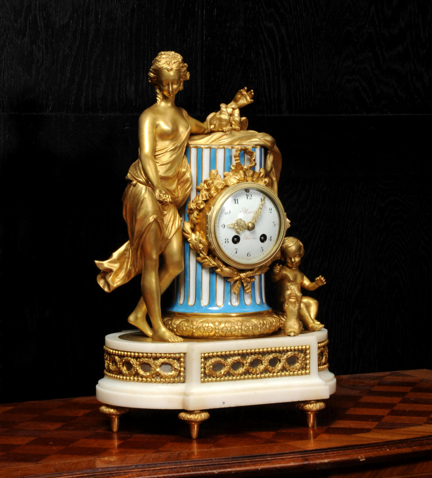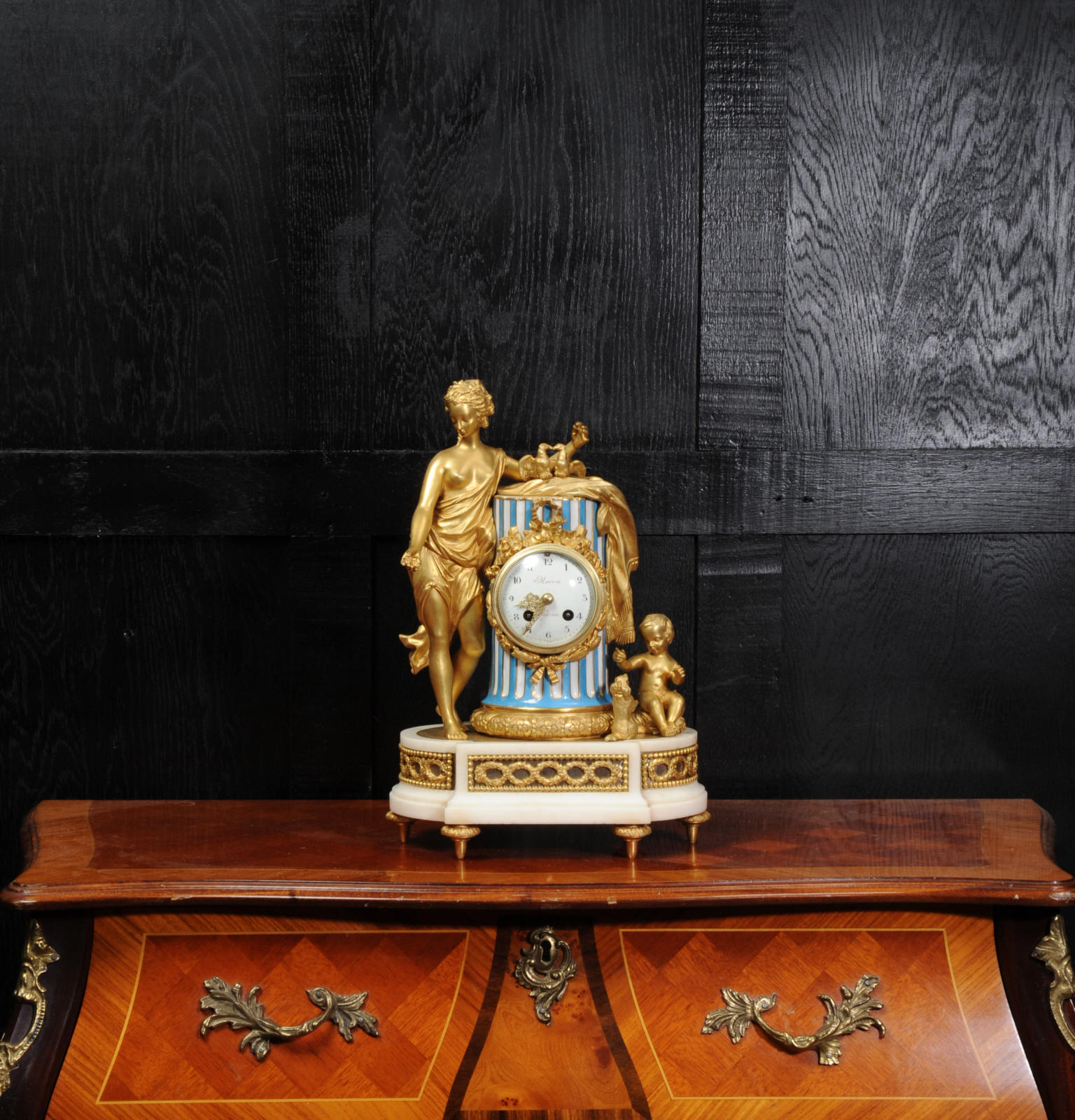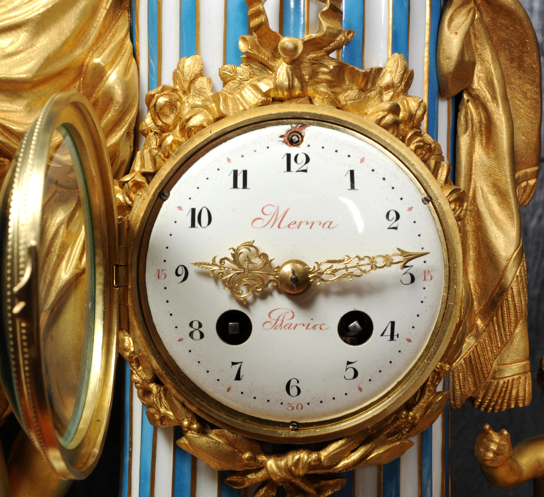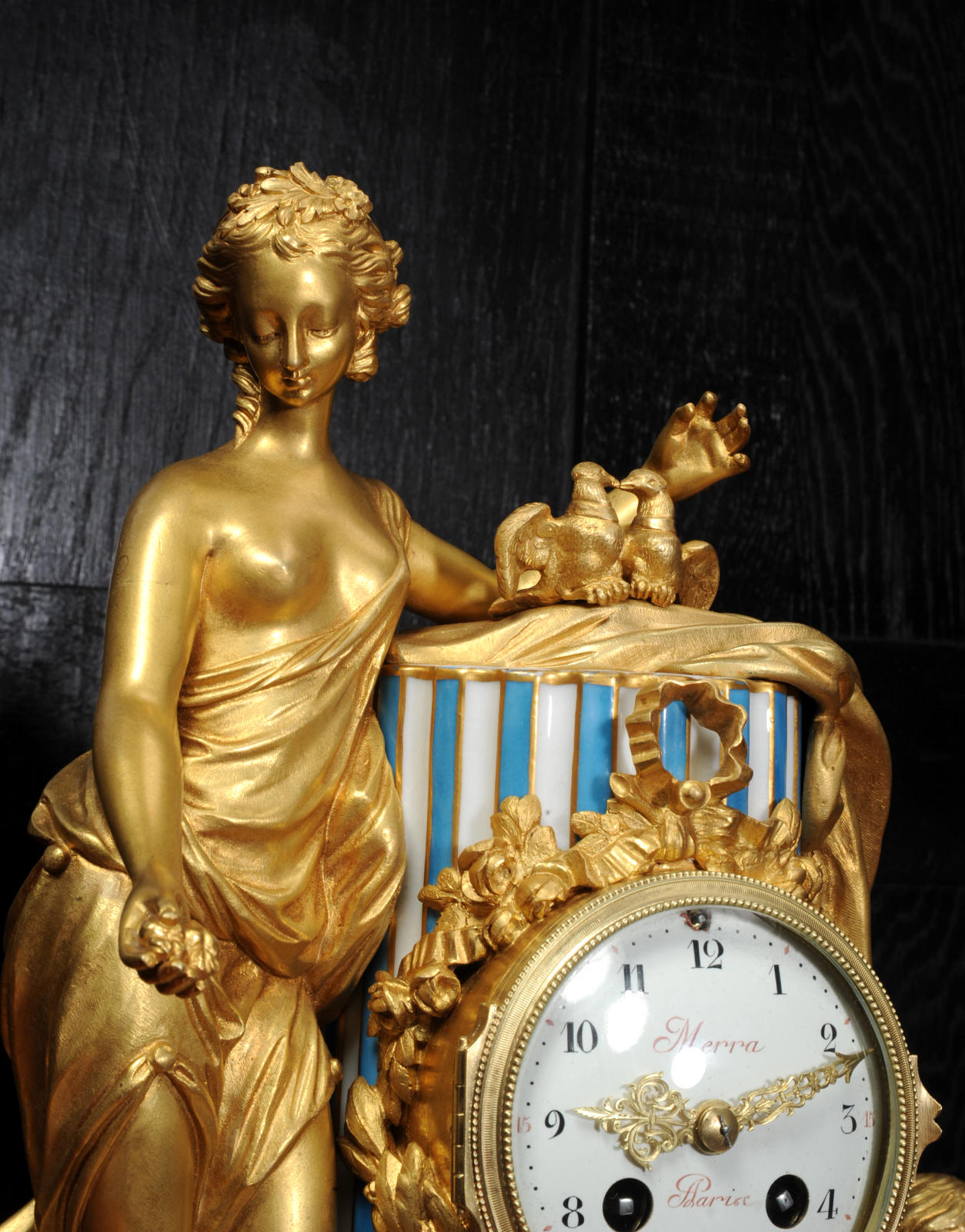 The whole rests on an oval base with projections adorned with a frieze of laurels backed with silver plated copper standing on 6 feet with leafy tops. The dial is porcelain on copper with the original beautifully cut gilt hands. The dial is signed in Homage to the 18th century clockmaker Pierre Merra