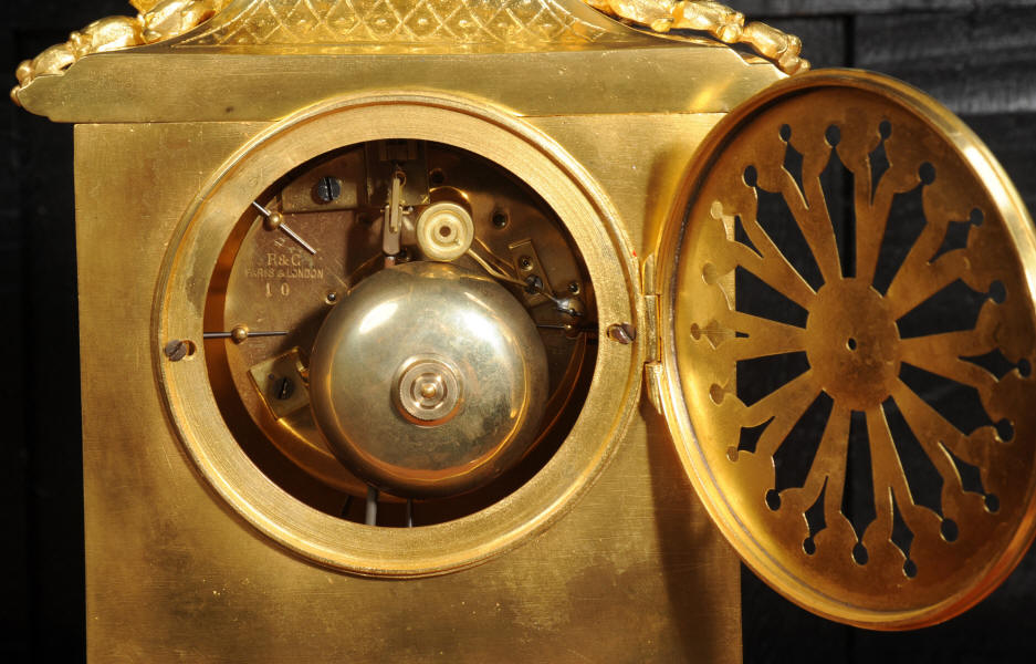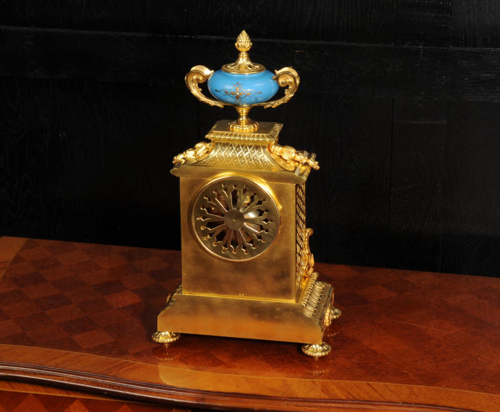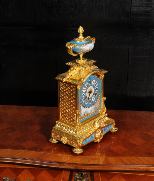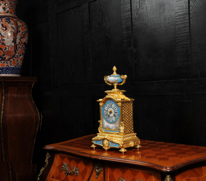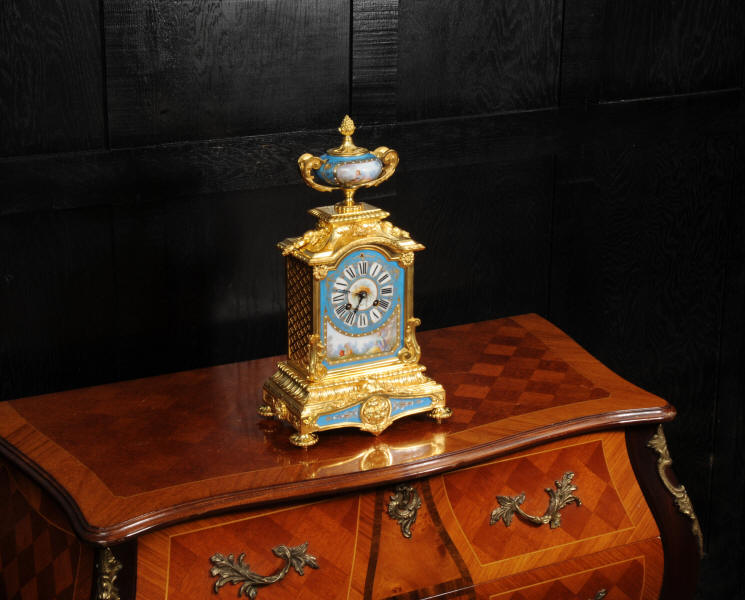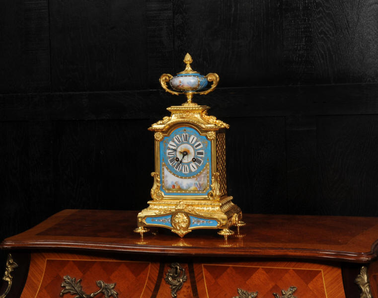 To the top is a large urn, painted with a scene of the young woman in a romantic country setting. The dial is beautifully decorated with delicate overglaze gilt decoration. The porcelain is signed to the rear. Please note that this type of clock does not have a glazed front door. The French movement is of very high quality and has the clockmaker's mark on the movement backplate. Pendulum is a replacement. It is in excellent clean and running condition having been fully overhauled by our clockmaker. It runs for 8 days on one wind and strikes the hours and halves on a bell. Click the video to hear the bell and watch the clock running. Condition of the case is superb, gilding is in original condition with a clean and bright finish. The porcelain is in good condition, some wear to the overglaze decoration and also some wear to the blue ground. There are some chips around the winding holes. Some of the red and white applied jewels are missing. This is a fine and very decorative clock to add to your collection. The firm of Richard and Co was founded in Paris in 1848 and added a branch in London in 1857. (Carriage Clocks, Charles Allix). The company continued until 1881.