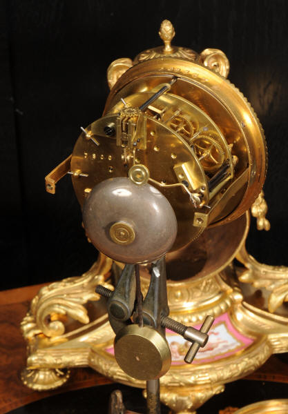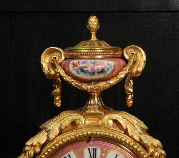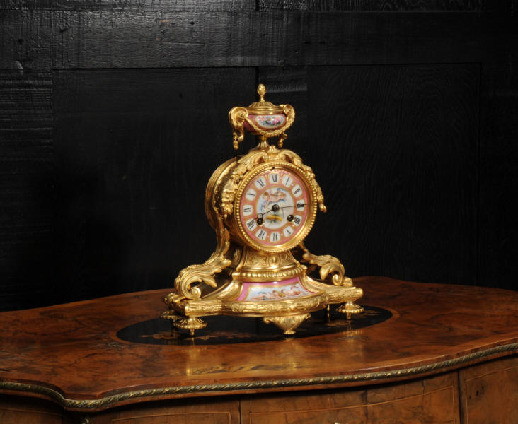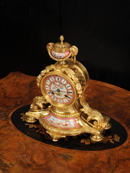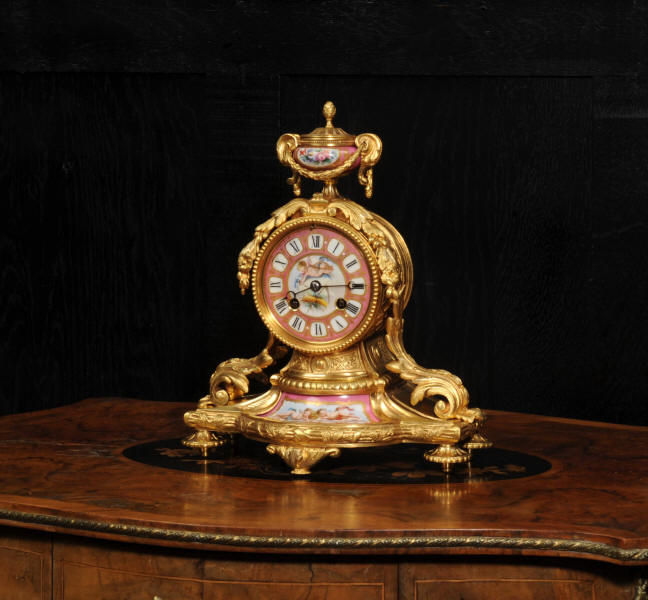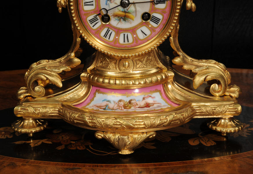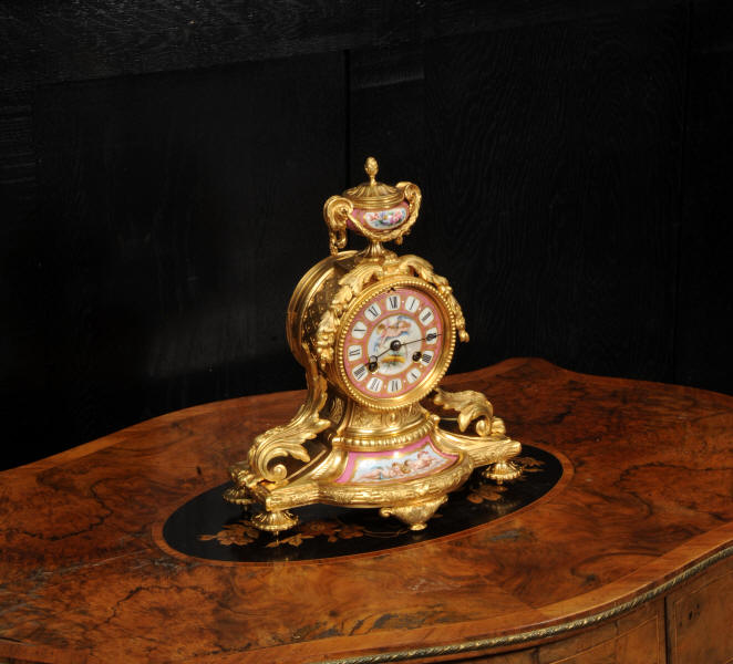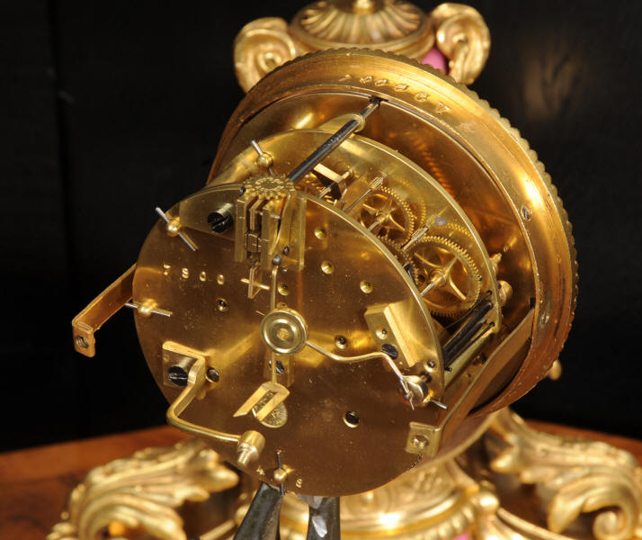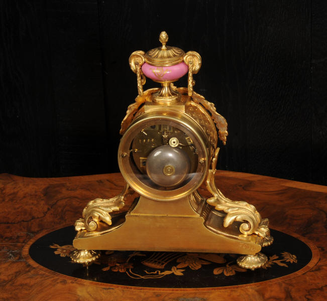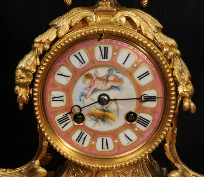 The porcelain dial shows a lovely depiction of cupid as a cherub with his arrow. Above the dial is a porcelain urn, delicately painted with a floral swag and mounted with ormolu handles and a pineapple finial. The rear door is glazed with convex glass to allow the movement to be seen. Please note that this style of clock does not have a glazed bezel over the dial. The French movement is of high quality and is by Japy Frères. It is in excellent clean and running condition having been fully overhauled by our clockmaker. Pendulum is original. It runs for 8 days and strikes the hours and halves on a bell. Click the video below to hear the bell and watch the clock running. Condition of the case is excellent, the original gilding is beautifully clean and bright with some slight wear, discolouration and tarnish. Porcelain is also in excellent condition with some very occasional and slight wear to the over-glaze gilt decoration. Some of the half hour jewel marks on the dial missing.