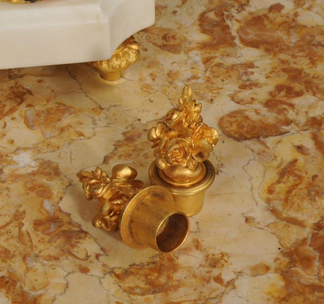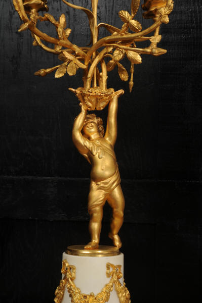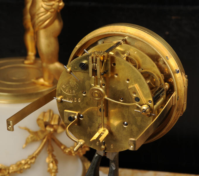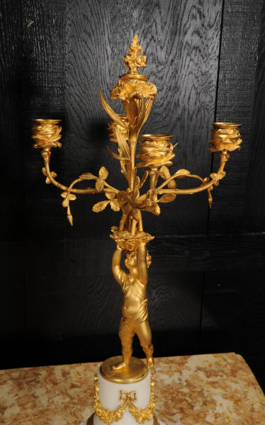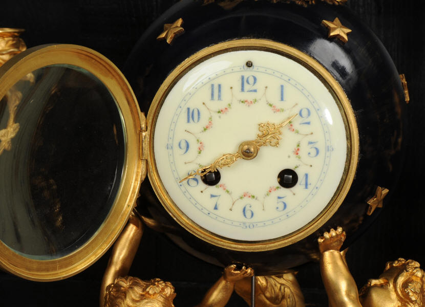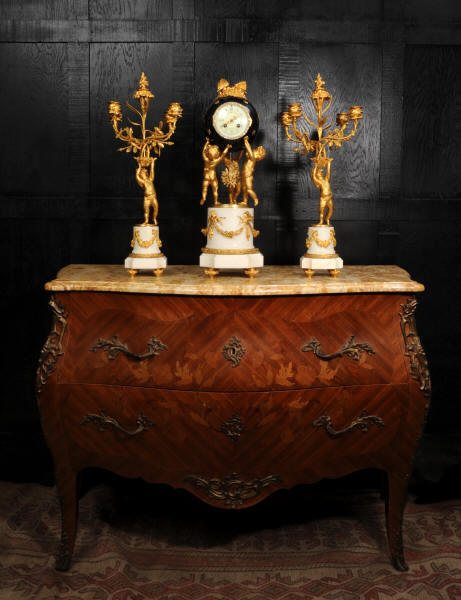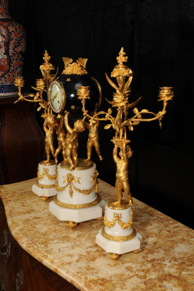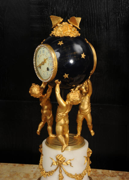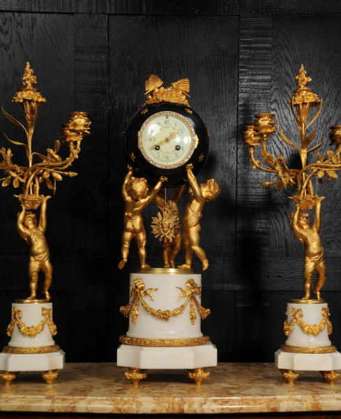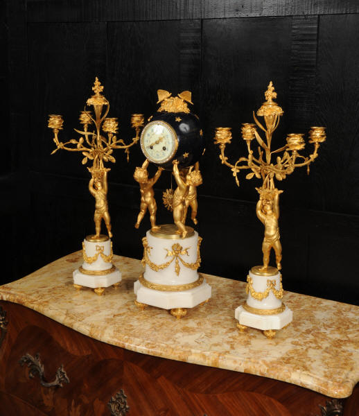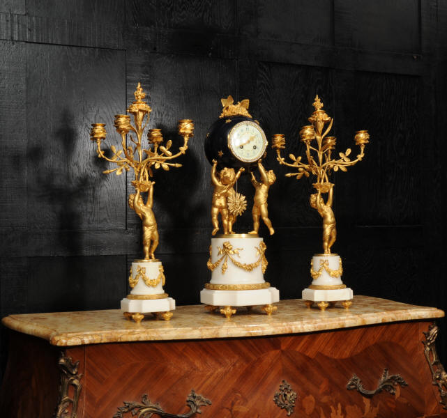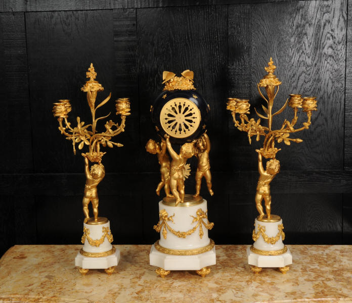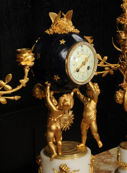 The orb is studded with ormolu stars and above butterflies delicate land upon a floral arrangement. The candelabra are modelled en suite with cherubs carrying the weight of five lights modelled as scrolling foliage, snuffers sit in the central sconce as finials when not in use. The three elements are mounted on white Carrera marble bases swagged with flowers tied with bows. The dial is porcelain enamel on copper, cream with delicate swags painted between the numerals. It is complete with it's original finely cut gilt hands. The bezel is set with paste jewels and convex glass. The set is beautifully made and finished in finely gilded bronze ormolu. The French movement is of superb quality and is by Samuel Marti. It is in excellent clean and running condition having been fully overhauled by our clockmaker. Pendulum is an old replacement. It runs for 8 days and strikes the hours and halves on a bell. Click the video to hear the bell and watch the clock running. Condition of the case is excellent, the original gilding is beautifully clean and bright, some slight wear and tarnish in places, particularly the ormolu tops to the marble bases. Marble is also excellent with a good polish, some slight staining and nibbles to the edges. Blue orb has some light scratches and wear to the original lacquer. Dial is excellent with no damage, some slight fading. H. Luppens & Cie were a famous foundry from Brussels, Belguim operating in the 19th century. The H. Luppens & Cie Foundry had its workshops in Saint-Gilles, 15 rue de Danemark. There were known for their Foundry and specialised in Lustres, Bronzes, Pendules and Meubles. furniture, clocks, ceiling lights and bronze. They had premises in Rue Neuve 144 to 148 and Boulevard du Nord 151 to 155 Brussels. They have made many extremely high quality objects which can be found across the globe from large clock sets to chandeliers, often retailed from their Paris premises as in the case of this clock set.