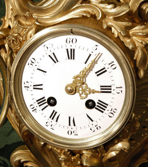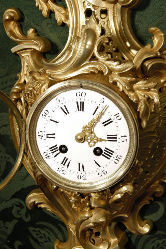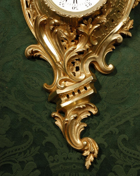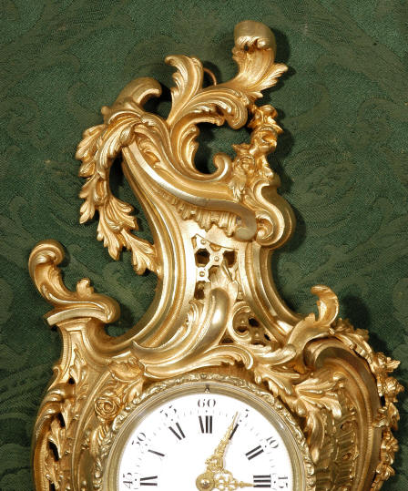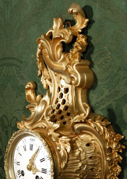 ~ French - Circa 1870 ~ ~~ Excellent Condition ~~ A stunning Rococo Cartel clock, elegant asymmetric case crested with sprays of swirling foliage and draped in pendant garlands. The movement is of excellent quality, runs for 8-days and strikes on a bell every half hour. The dial is enamel on copper and has the original delicate gilt hands. Click here to hear the clock strike! The condition of the case is very good with a good bright, fresh colour and no losses or damage to the metal. The dial is also in very good condition - just some minor chips around the winding holes. Condition of the movement is excellent - our clockmaker has cleaned and serviced the movement. It keeps good time and runs very well. Includes pendulum, key and bell. Dimensions: Height