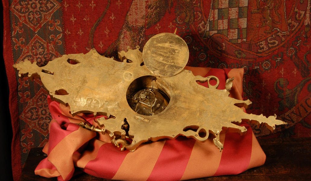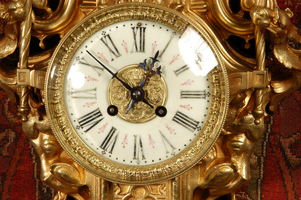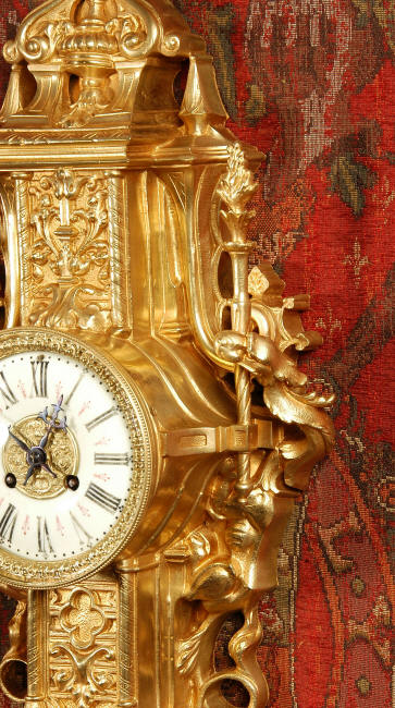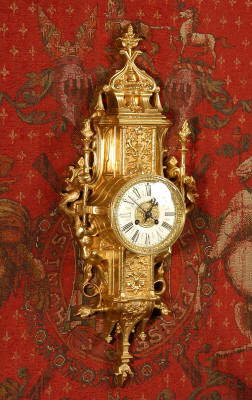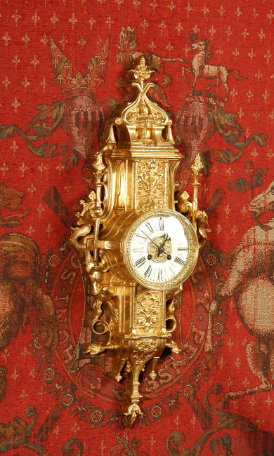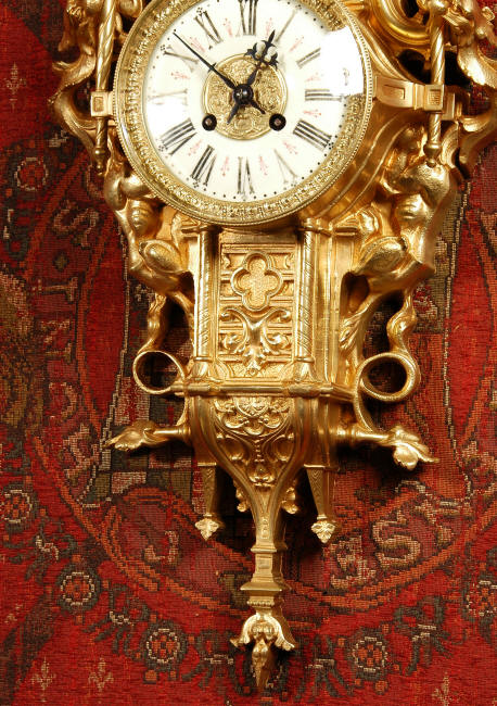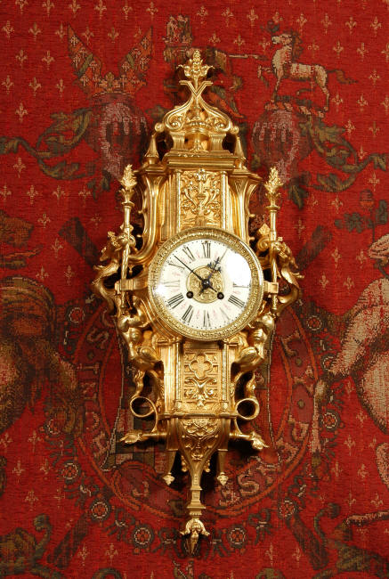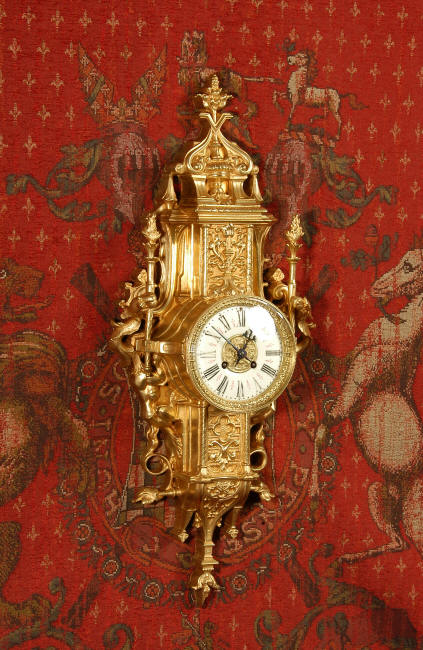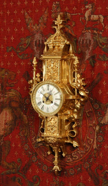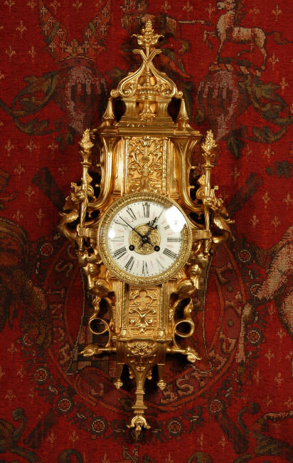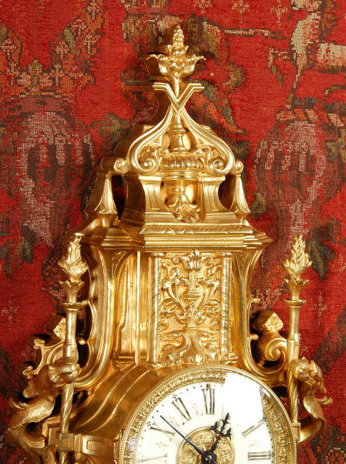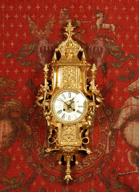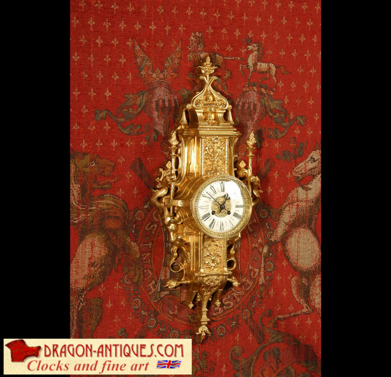 ~ French - Circa 1870 ~ ~~ Excellent condition, fully overhauled and working ~~ A beautifully made gothic brass cartel wall by the famous maker Samuel Marti. It features a pair of panthers climbing up each side of the clock, holding a flaming torché in their mouths. This is an earlier clock, heavily modelled and well finished. The movement has the earlier 'Medaille de Bronze' mark awarded in 1860. The dial is enamel on copper with a cast brass centre and is complete with original blued steel hands. The bezel has an egg and dart border and is fitted with convex bevelled glass. The French movement is of the highest quality as you would expect from this maker. It is in excellent clean and running condition having been comprehensively overhauled, including two new springs, by our clockmaker. Pendulum is an old replacement. It runs for 8 days and strikes the hours and halves on a bell. Click the video below to hear the bell and watch the clock running! Condition of the case is