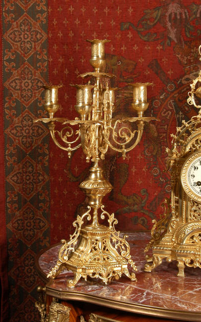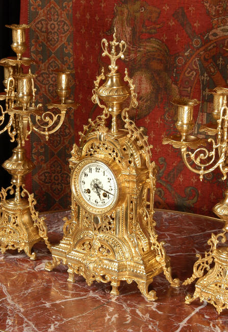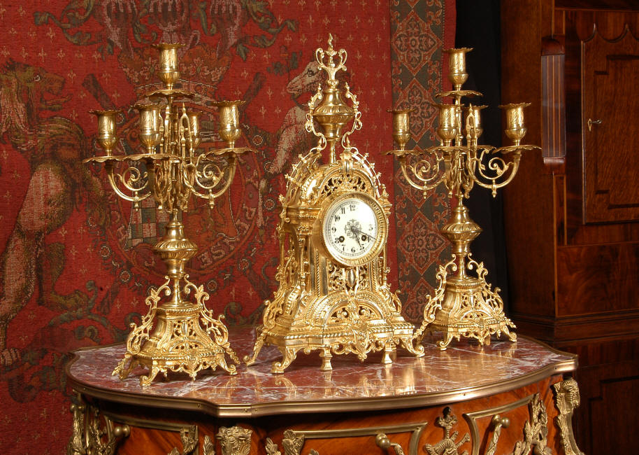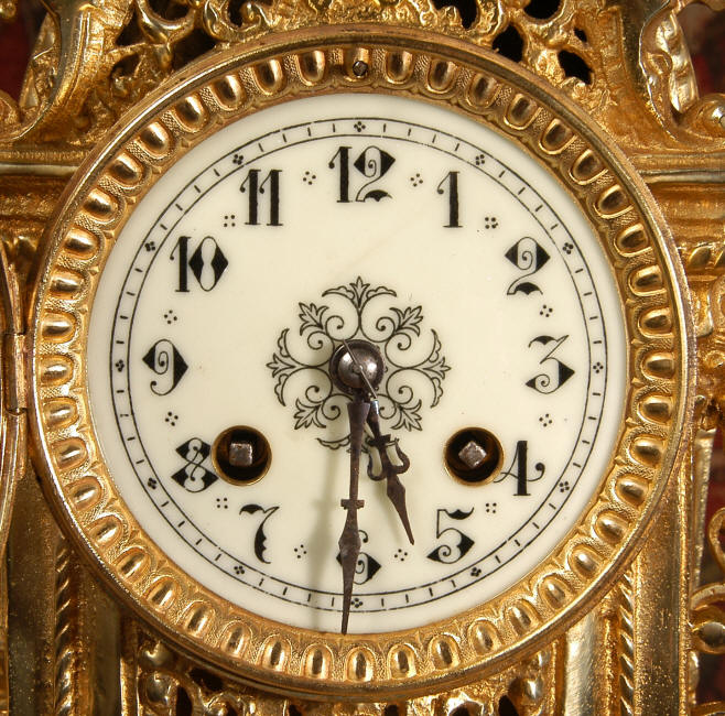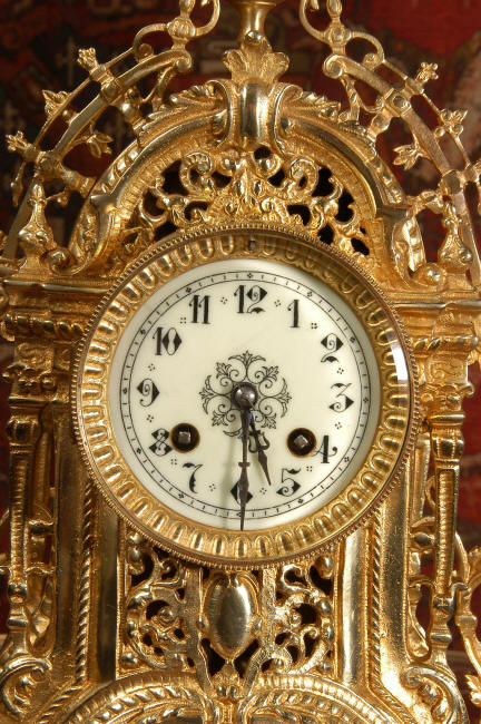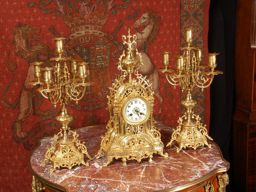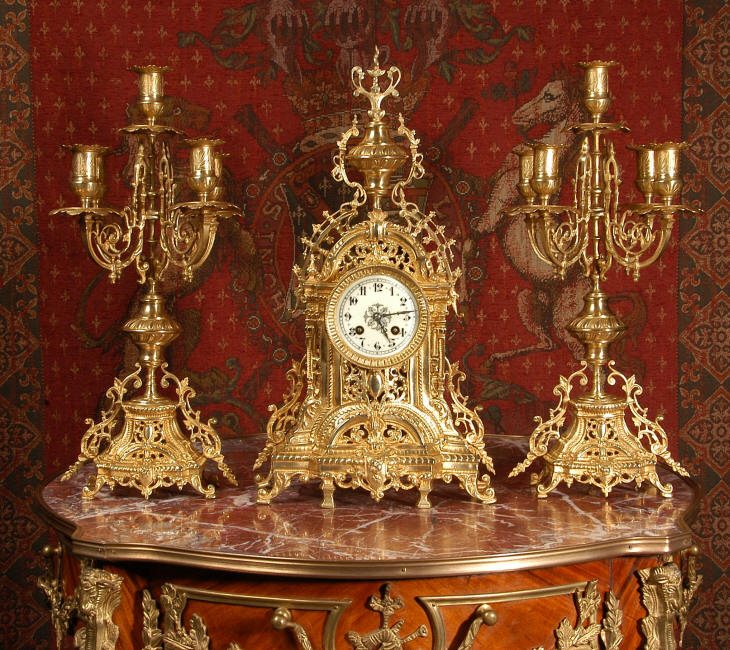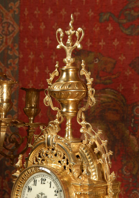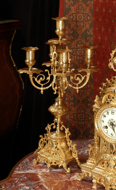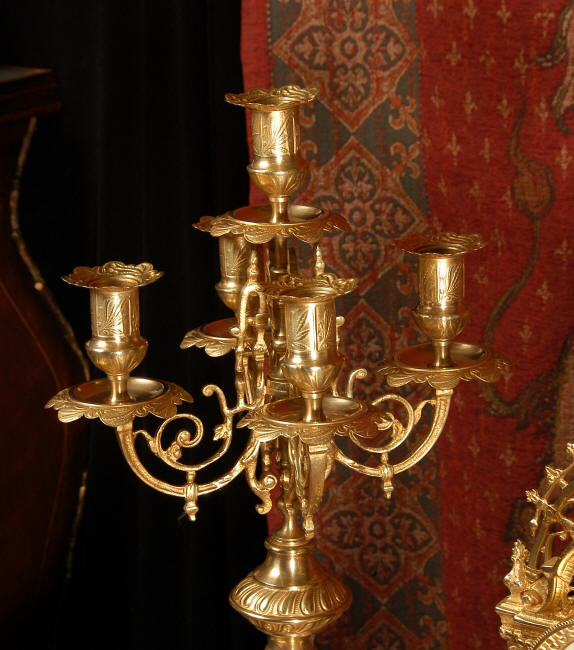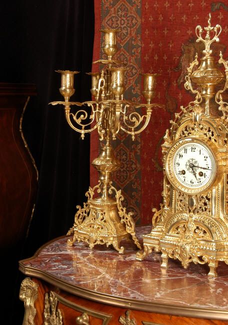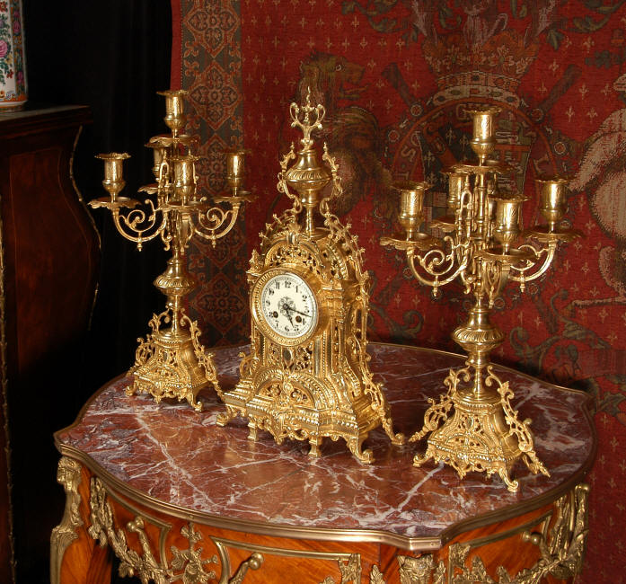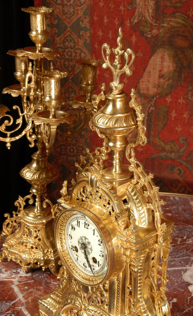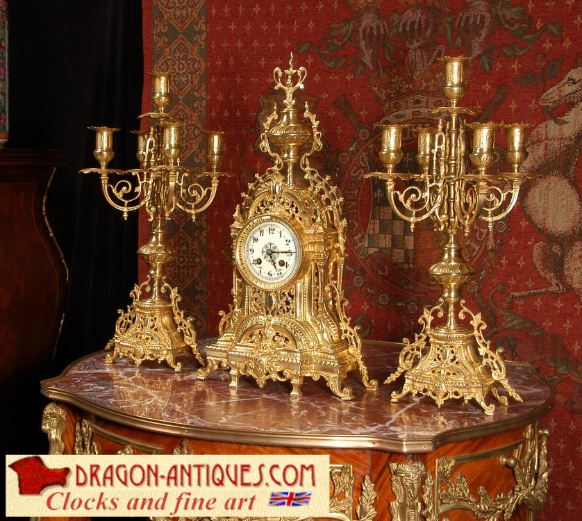 ~ French - Circa 1890 ~ ~~ Excellent condition, fully working condition ~~ A very decorative and nicely sized antique French clock set. It is very well modelled in brass, in the Louis XVI style, classically architectural and decorated with flowing foliage and flowers. The front of the clock is fretted which allows a glimpse of the pendulum swinging inside the case. Candelabra have matching bases and urns and have four branch candelabra modelled as entwined foliage. The dial is enamel on copper with delicate decoration to the centre. It is complete with the original blued steel hands. The A D Mougin French movement is of the highest quality and is in excellent clean and running condition having been fully dismantled, cleaned, inspected and tested by our clockmaker. Pendulum and bell are replacements. It runs for 8 days and strikes the hours and halves on a bell. Click the video clip below to hear the bell and watch the clock running! Condition of the case is