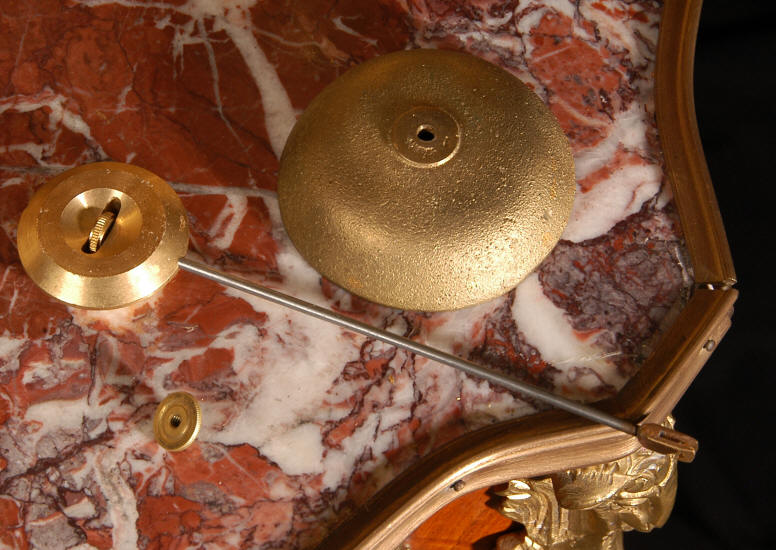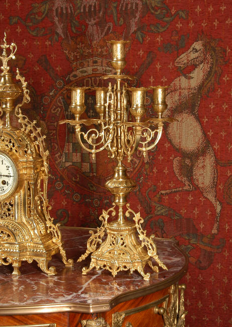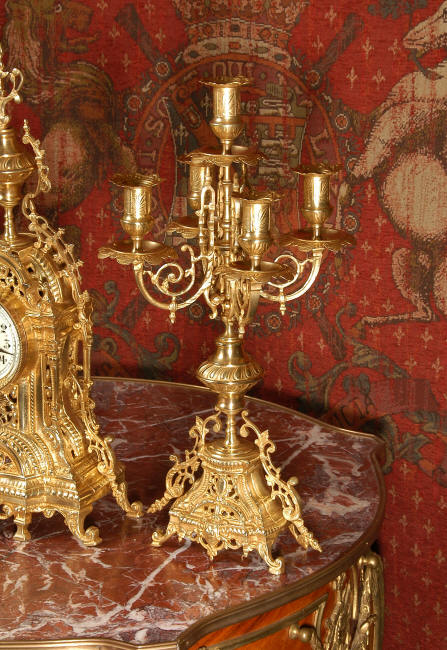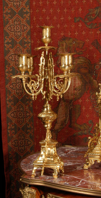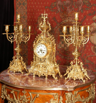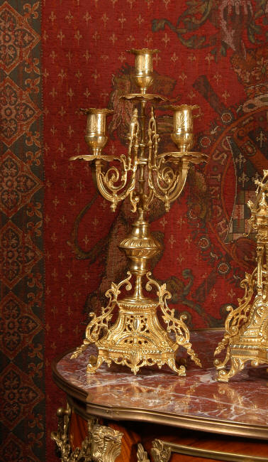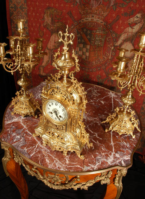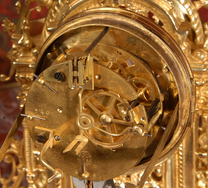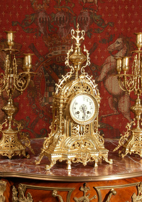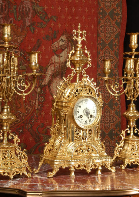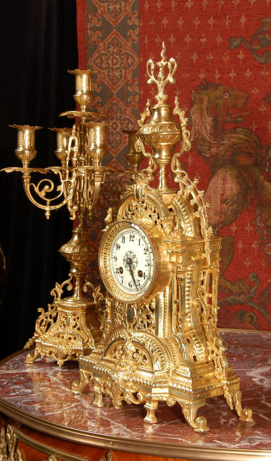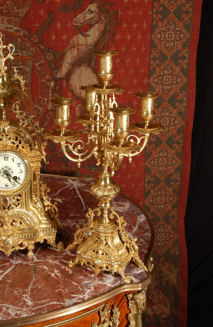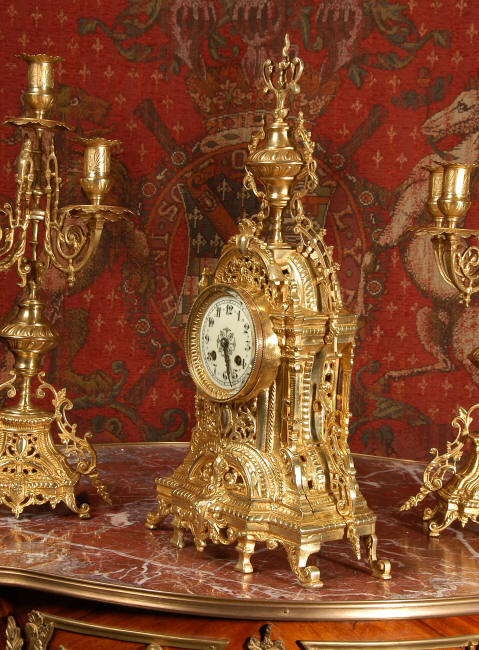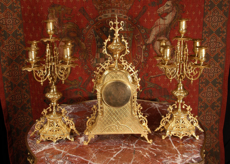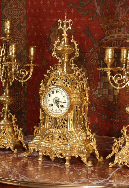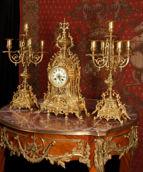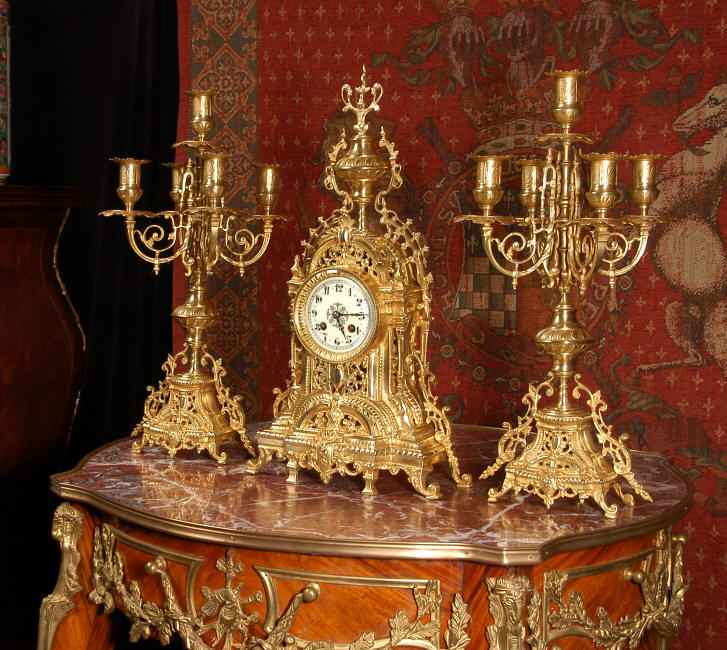 ~ French - Circa 1890 ~ ~~ Excellent condition, fully working condition ~~ A very decorative and nicely sized antique French clock set. It is very well modelled in brass, in the Louis XVI style, classically architectural and decorated with flowing foliage and flowers. The front of the clock is fretted which allows a glimpse of the pendulum swinging inside the case. Candelabra have matching bases and urns and have four branch candelabra modelled as entwined foliage. The dial is enamel on copper with delicate decoration to the centre. It is complete with the original blued steel hands. The A D Mougin French movement is of the highest quality and is in excellent clean and running condition having been fully dismantled, cleaned, inspected and tested by our clockmaker. Pendulum and bell are replacements. It runs for 8 days and strikes the hours and halves on a bell. Click the video clip below to hear the bell and watch the clock running! Condition of the case is