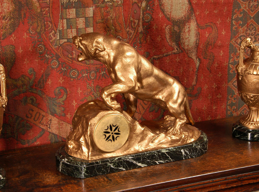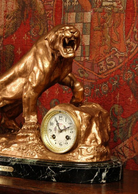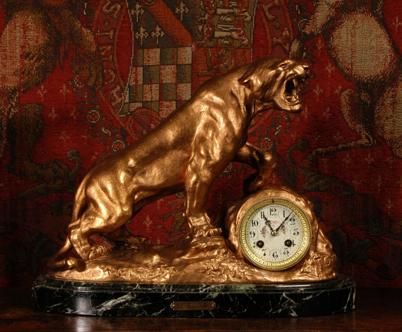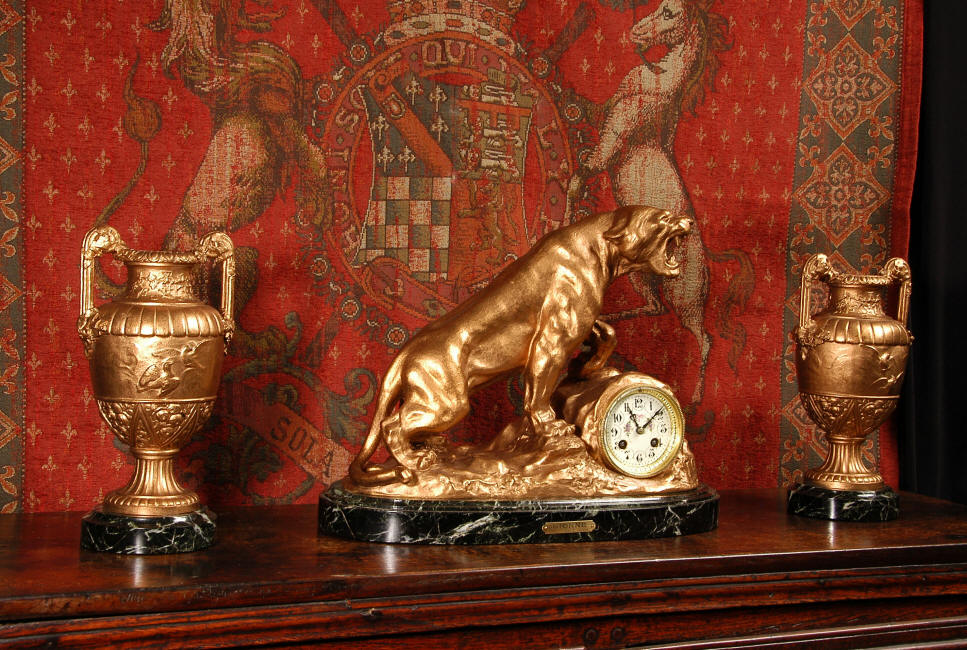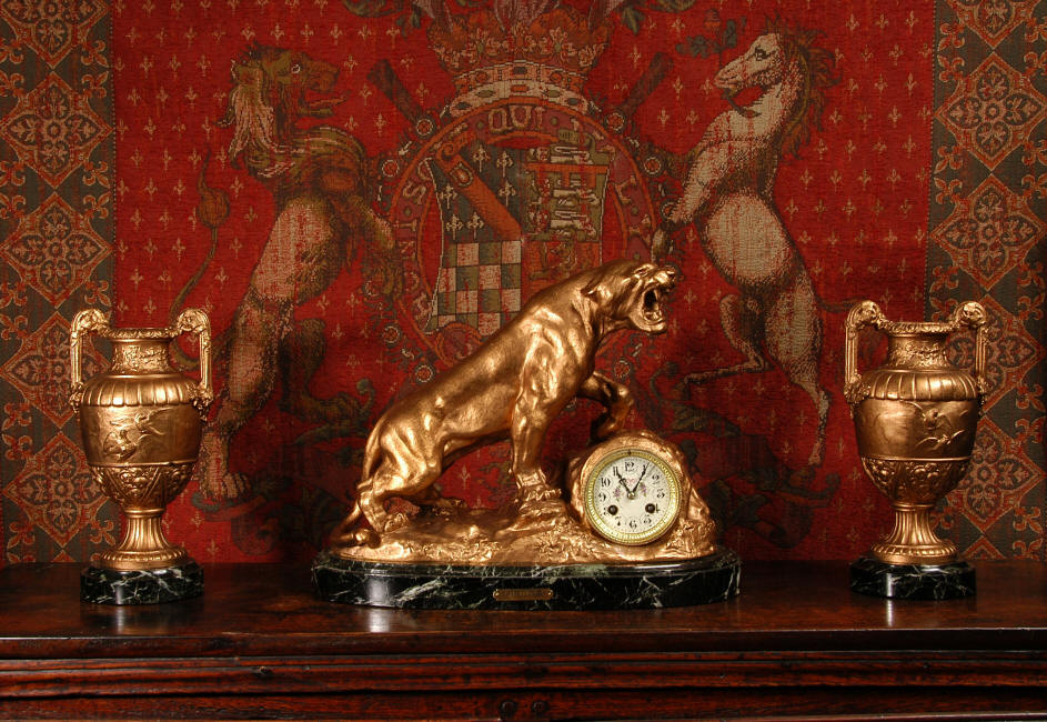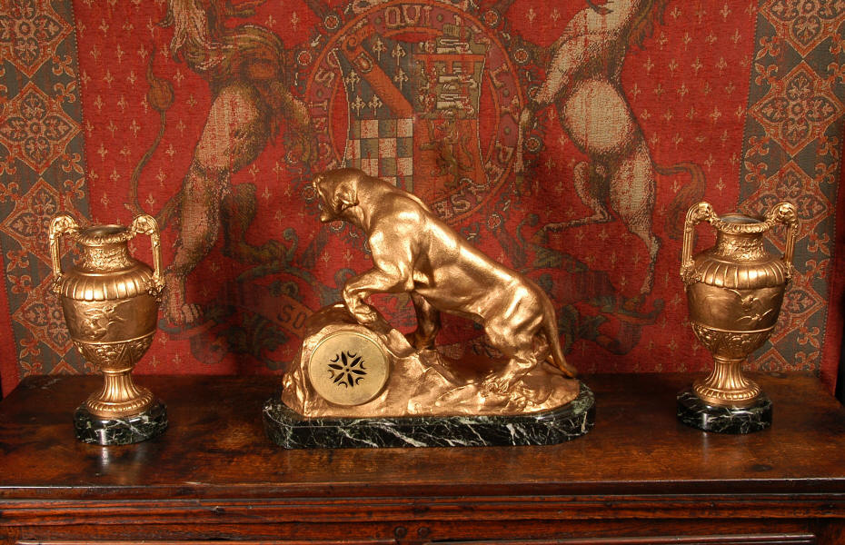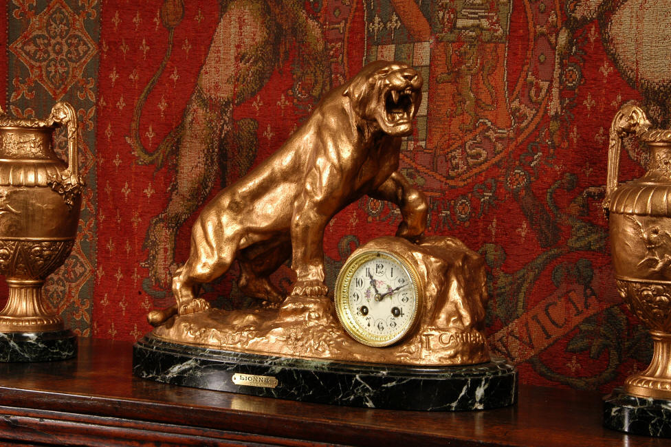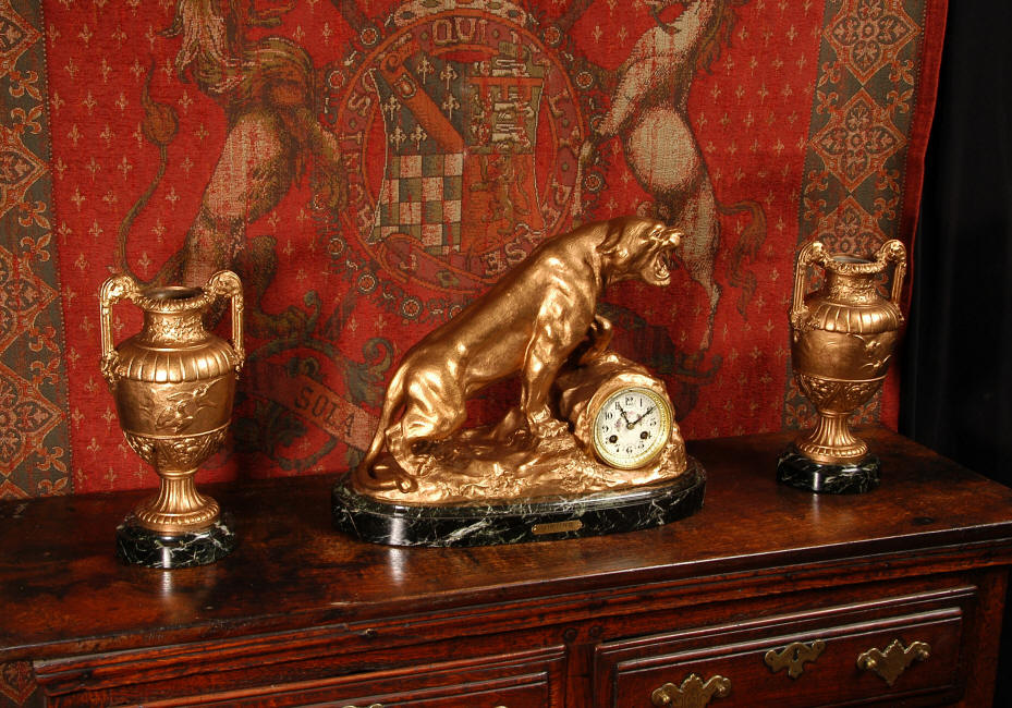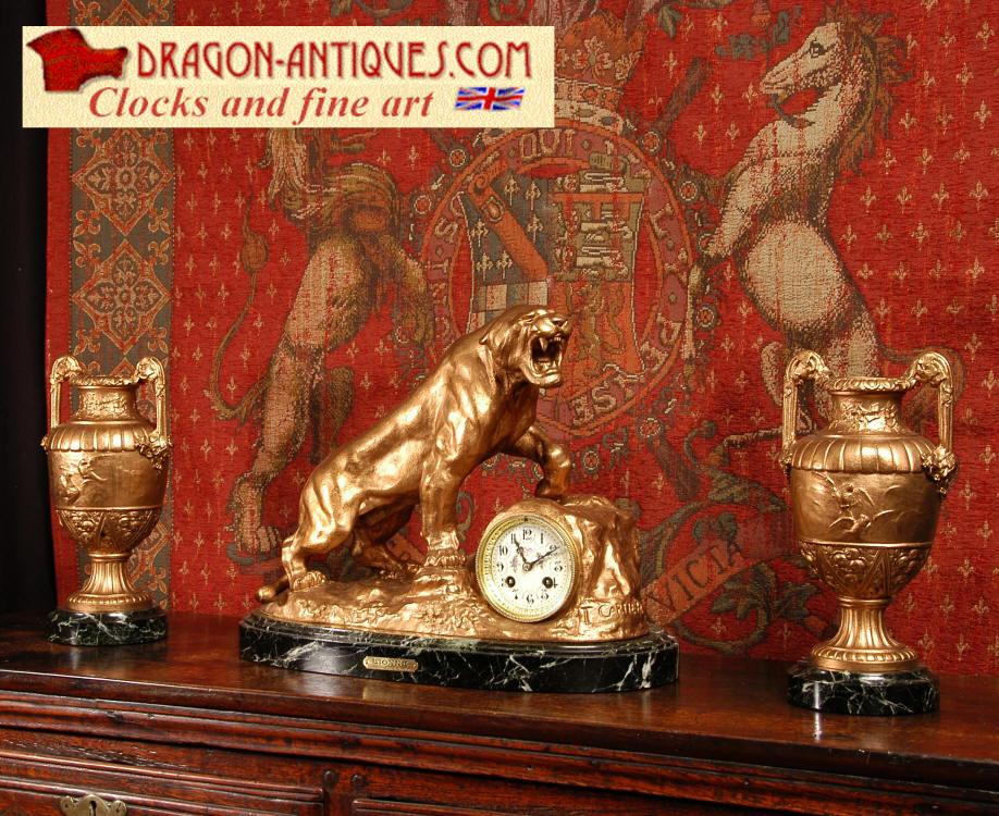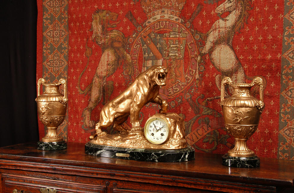 ~ French - Circa 1910 ~ ~~ Excellent condition ~~ A very impressive antique French figural clock set featuring a stunning sculpture of a lioness, by Thomas François Cartier (1879-1943). The sculptors mark is impressed to the rocky base. He is a well listed French sculptor, specialising in animal subjects, see the Artprice database for other works. Beautifully modelled in bronze patinated metal, the Lioness is superb and very well sculpted, muscular and full of sinuous life and aggressive movement. She stands on a rocky outcrop that also contains the clock movement. The base is a beautiful green variegated specimen marble. The urns are classical in style and stand on the same green variegated marble as the clock. The dial is a lovely off-white enamel on copper, decorated with a delicate floral swag. The French movement is of high quality and has the makers mark on the movement backplate. It runs for 8 days and strikes half hourly on a bell and is complete with a new pendulum and bell. It has been fully overhauled by our clock maker and is in excellent working order. Click the video clip below to hear the bell and watch the clock running! Condition is very