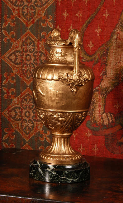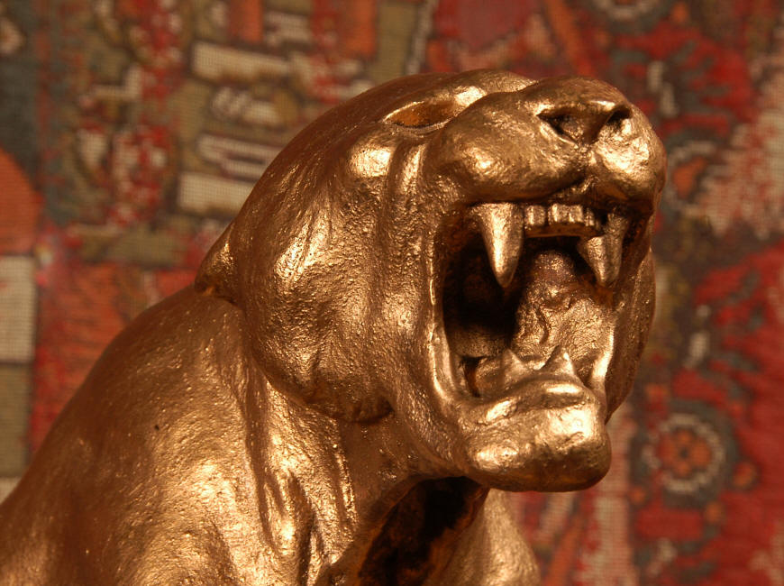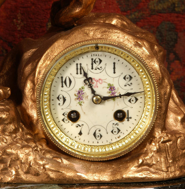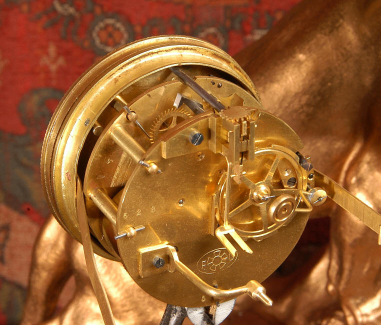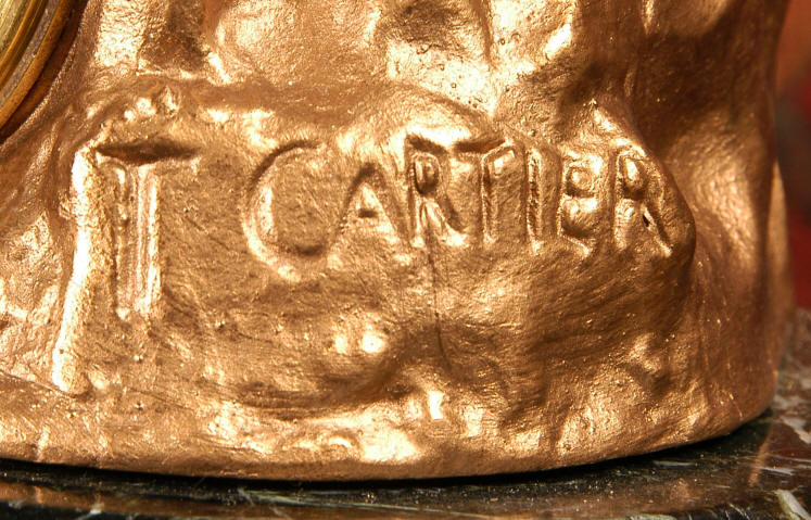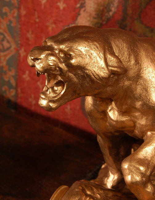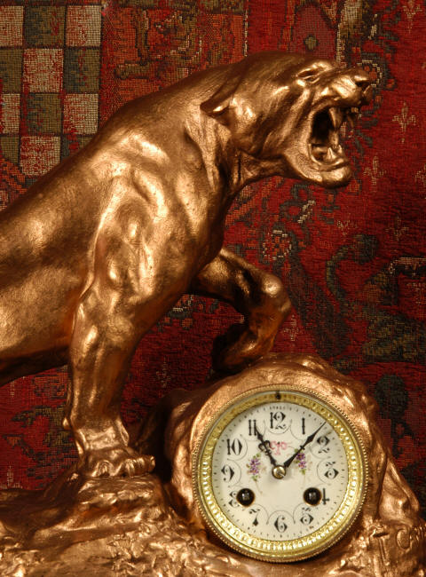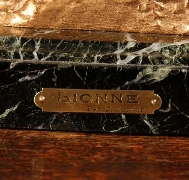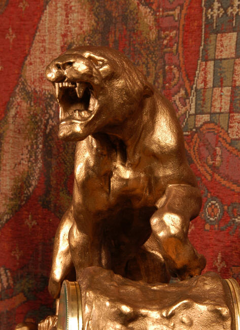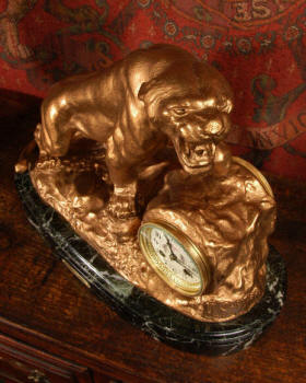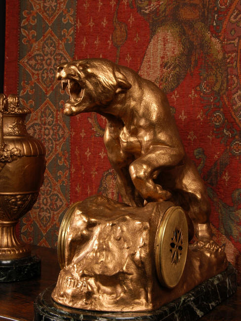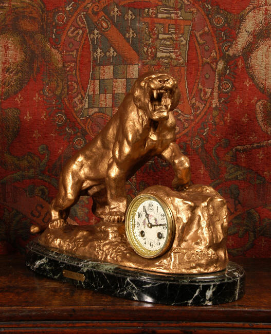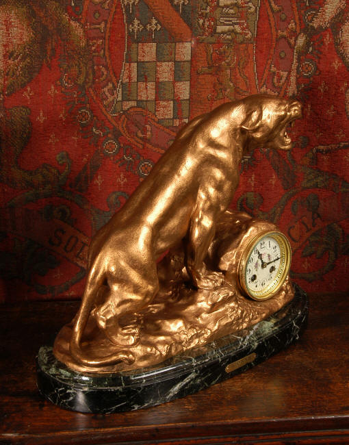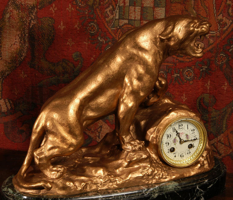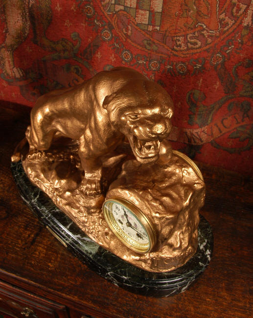~ French - Circa 1910 ~ ~~ Excellent condition ~~ A very impressive antique French figural clock set featuring a stunning sculpture of a lioness, by Thomas François Cartier (1879-1943). The sculptors mark is impressed to the rocky base. He is a well listed French sculptor, specialising in animal subjects, see the Artprice database for other works. Beautifully modelled in bronze patinated metal, the Lioness is superb and very well sculpted, muscular and full of sinuous life and aggressive movement. She stands on a rocky outcrop that also contains the clock movement. The base is a beautiful green variegated specimen marble. The urns are classical in style and stand on the same green variegated marble as the clock. The dial is a lovely off-white enamel on copper, decorated with a delicate floral swag. The French movement is of high quality and has the makers mark on the movement backplate. It runs for 8 days and strikes half hourly on a bell and is complete with a new pendulum and bell. It has been fully overhauled by our clock maker and is in excellent working order. Click the video clip below to hear the bell and watch the clock running! Condition is very