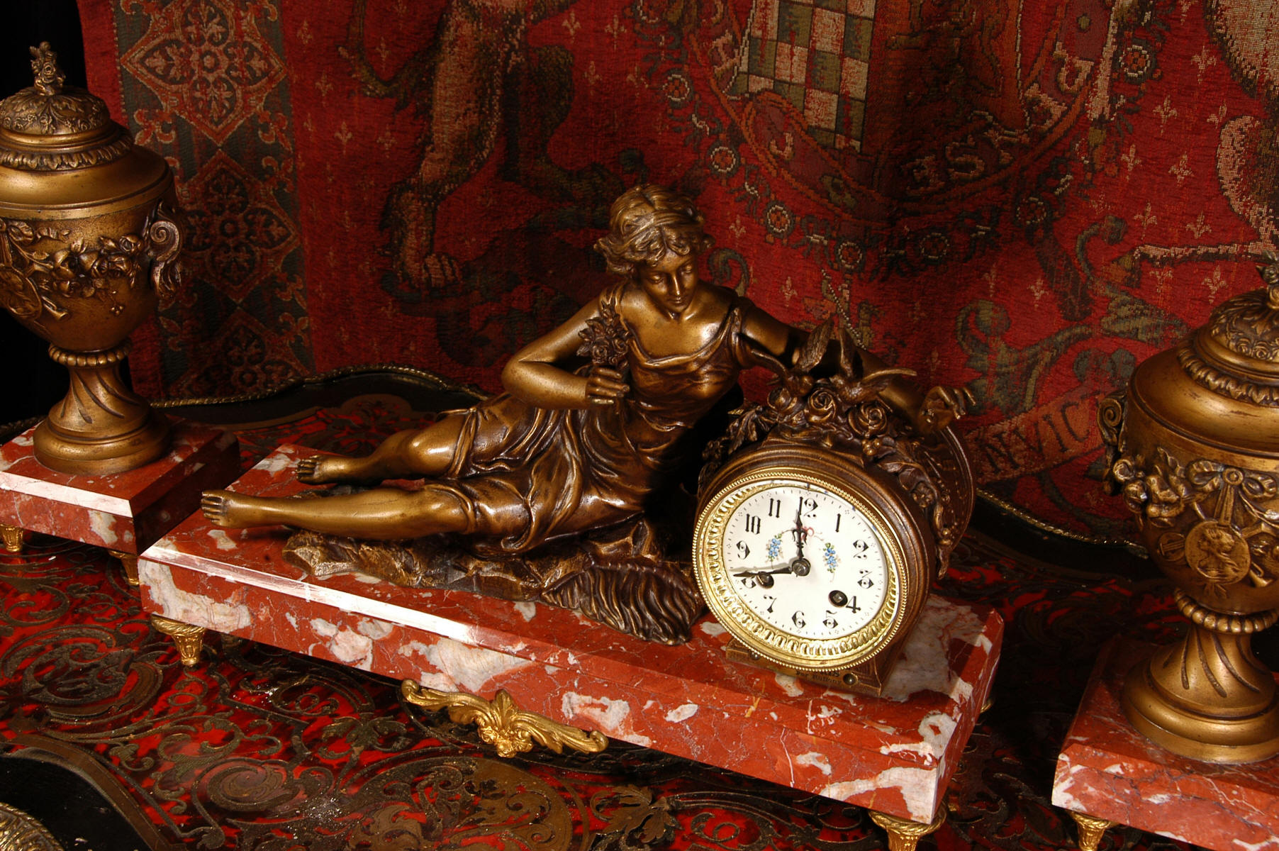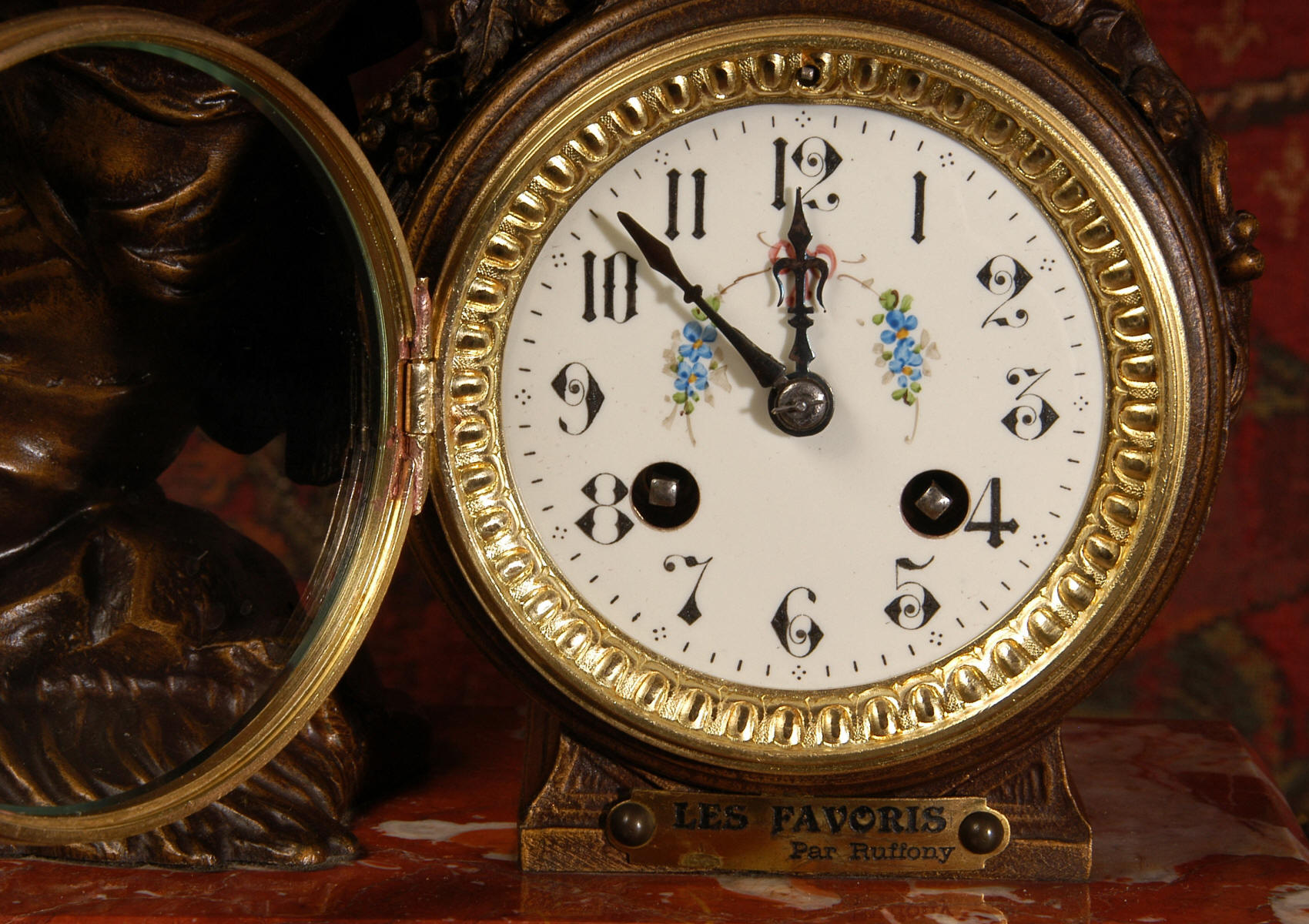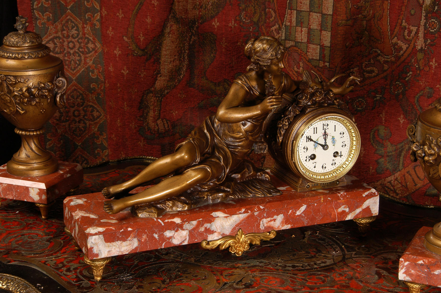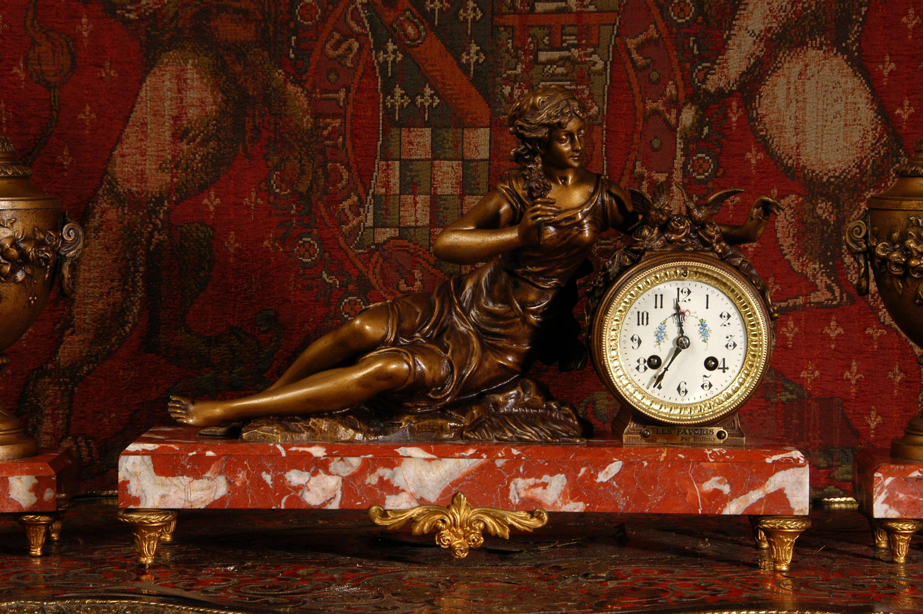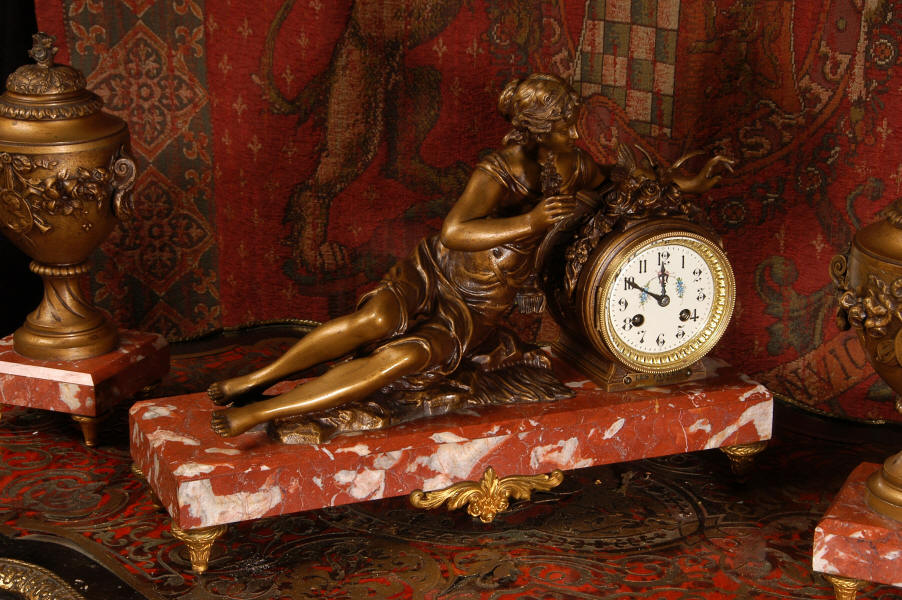 ~ French - Circa 1900 ~ ~~ Excellent condition, fully overhauled ~~ A Stunning Antique French clock set by the Italian sculptor O. Ruffony entitled Les Favoris (The Favourites). It features a beautifully modelled figure of a young woman, reclining with a bouquet of flowers and a pair of birds. The lidded side vases are classical in style with swags of flowers and musical trophies and are mounted on matching marble bases. The set is beautifully made in patinated bronzed metal mounted on variegated specimen marble bases, it is in very good condition.
