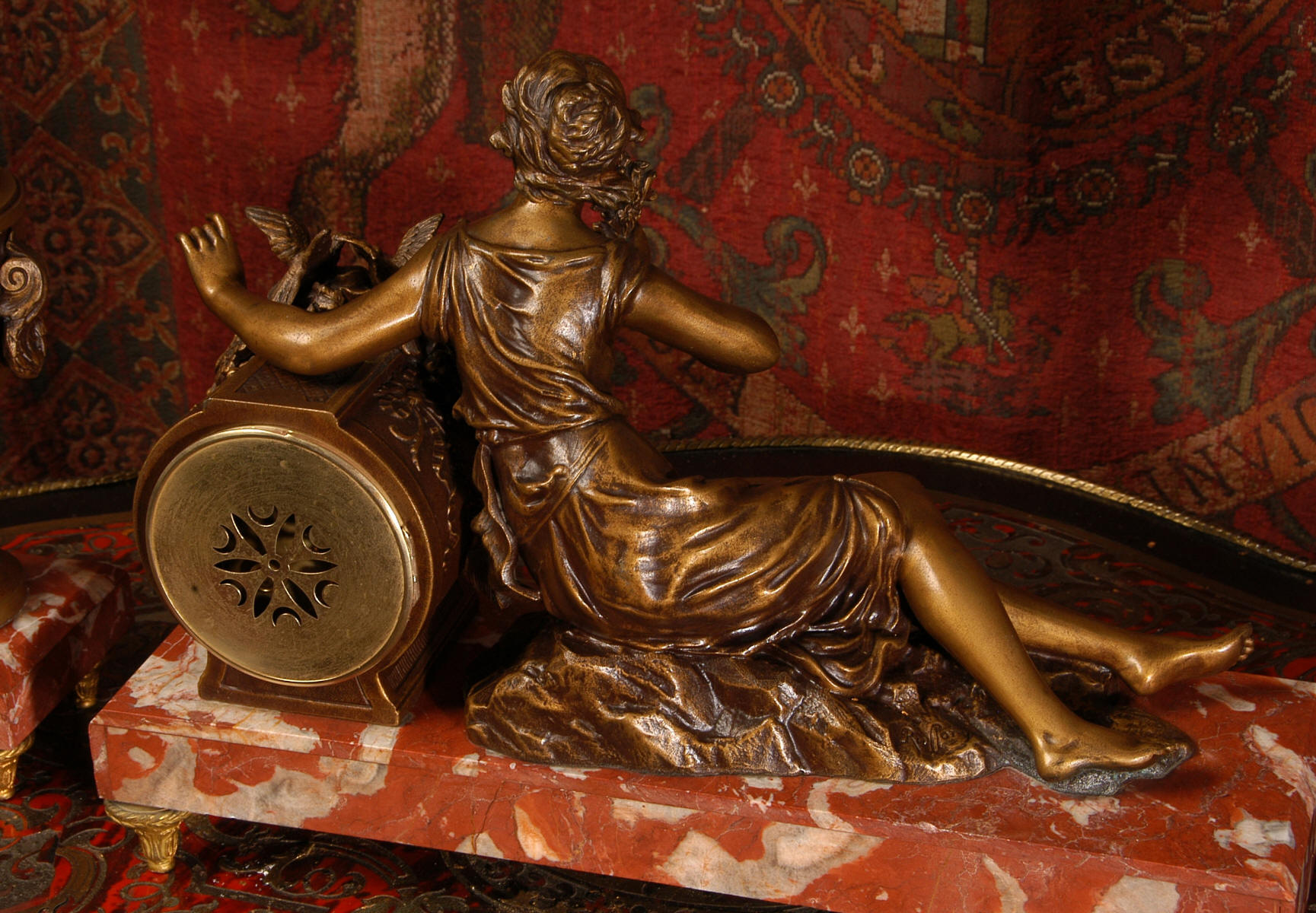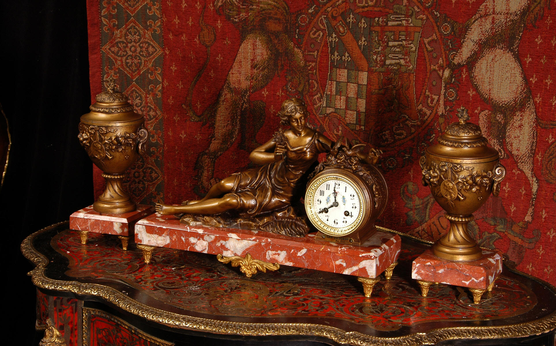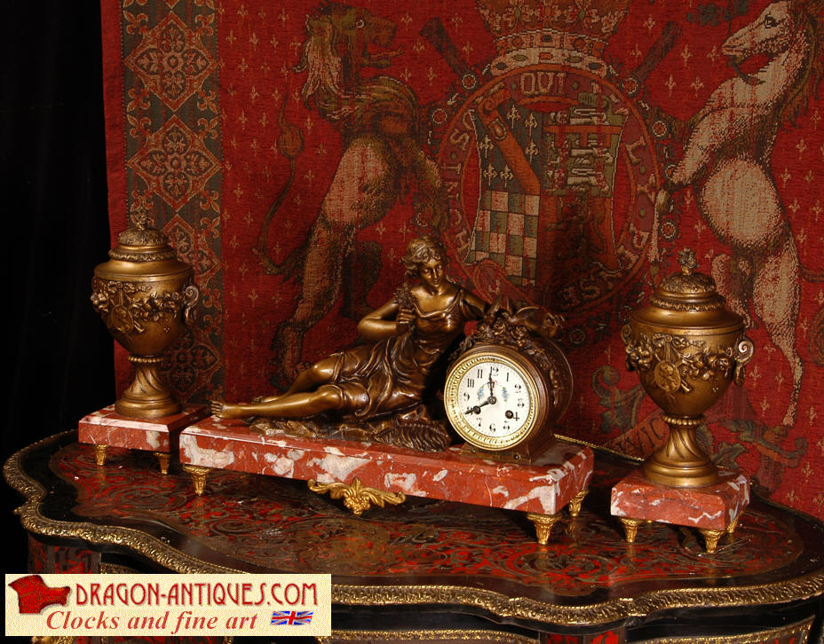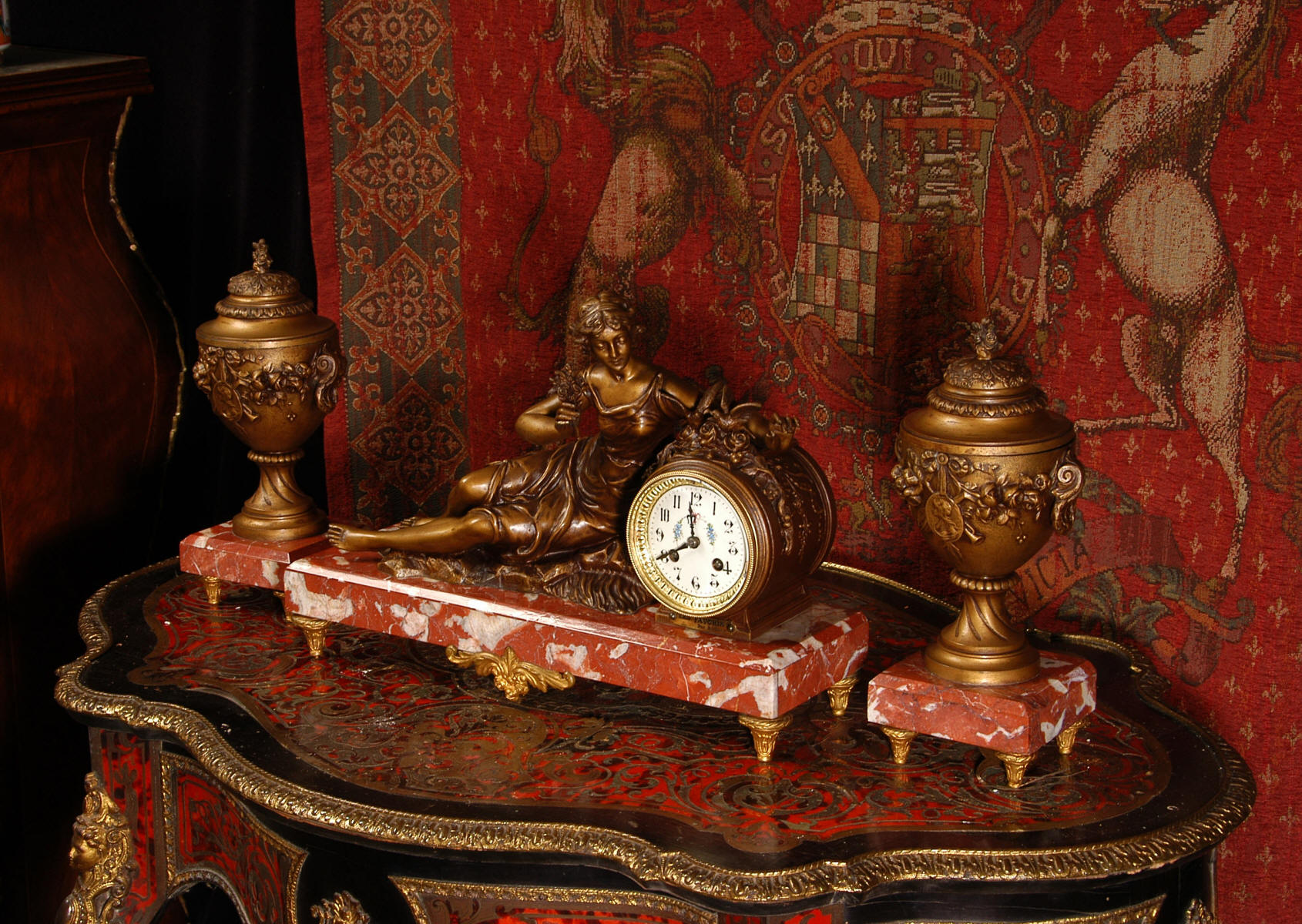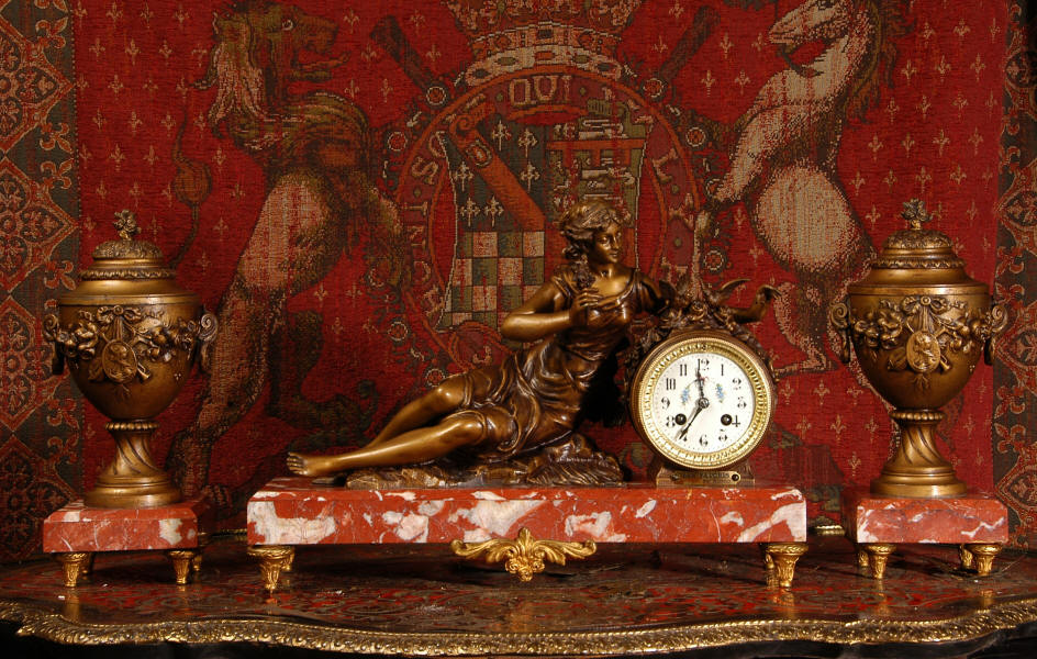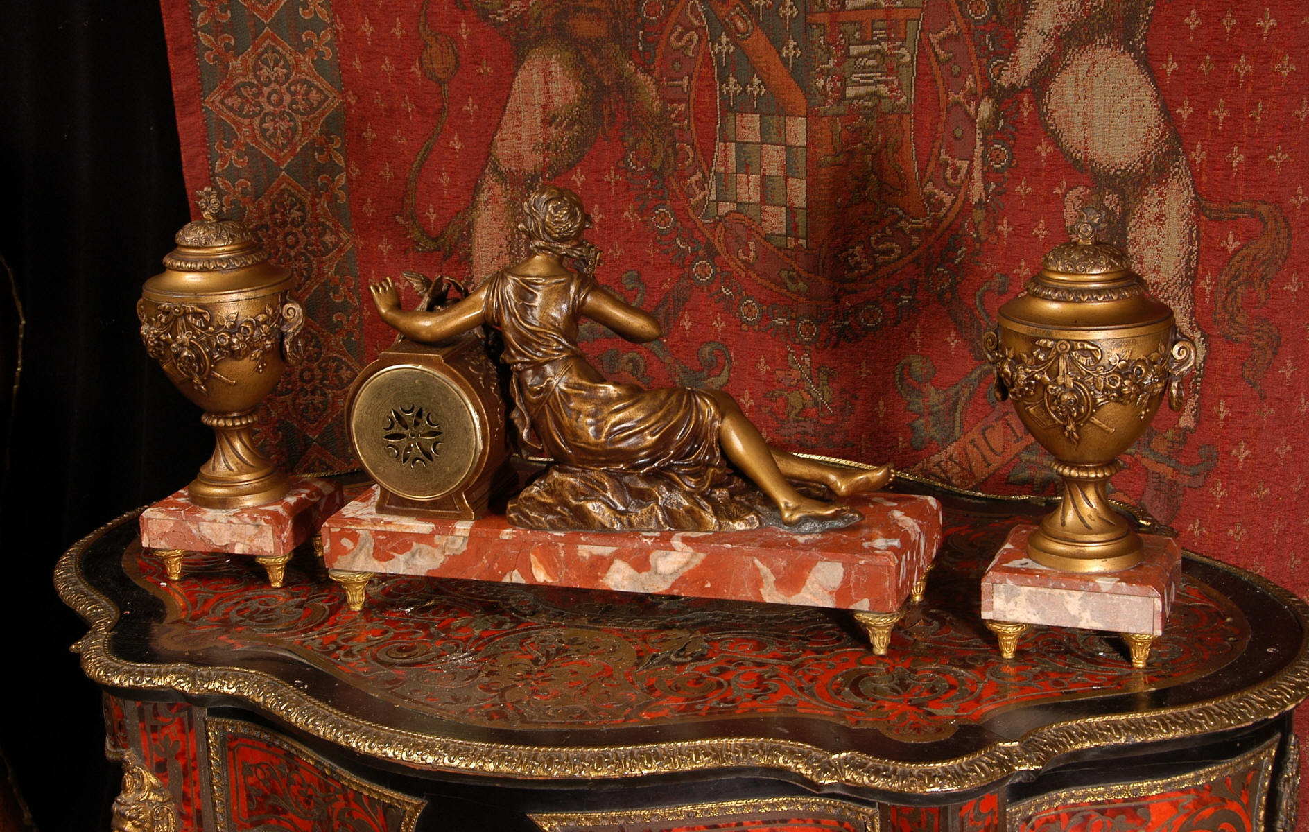 ~ French - Circa 1900 ~ ~~ Excellent condition, fully overhauled ~~ A Stunning Antique French clock set by the Italian sculptor O. Ruffony entitled Les Favoris (The Favourites). It features a beautifully modelled figure of a young woman, reclining with a bouquet of flowers and a pair of birds. The lidded side vases are classical in style with swags of flowers and musical trophies and are mounted on matching marble bases. The set is beautifully made in patinated bronzed metal mounted on variegated specimen marble bases, it is in very good condition.