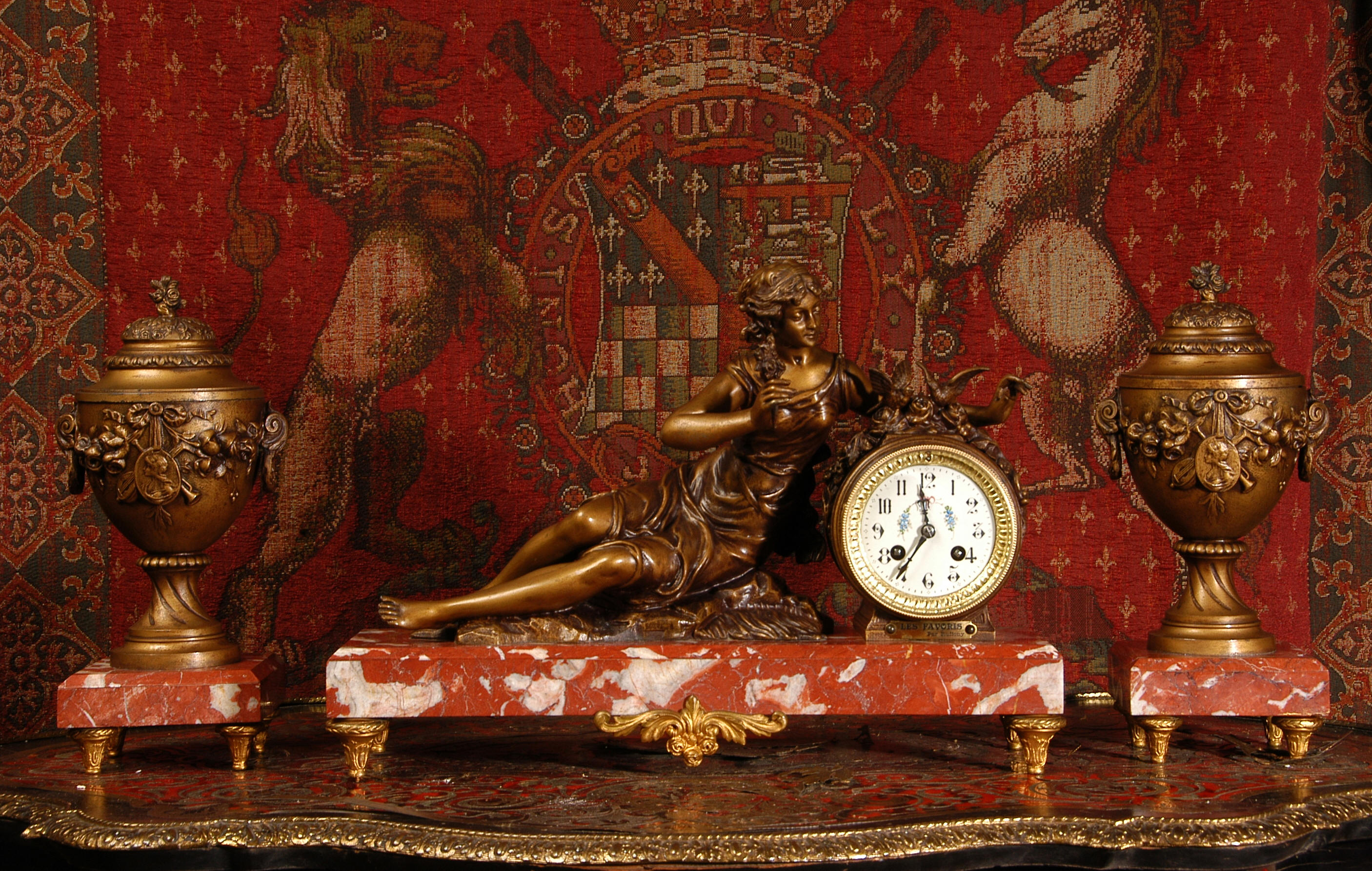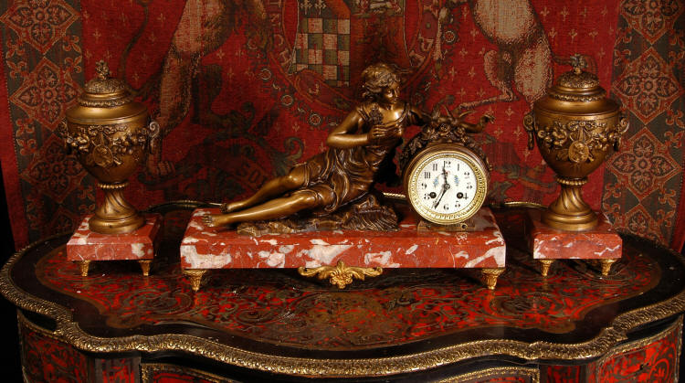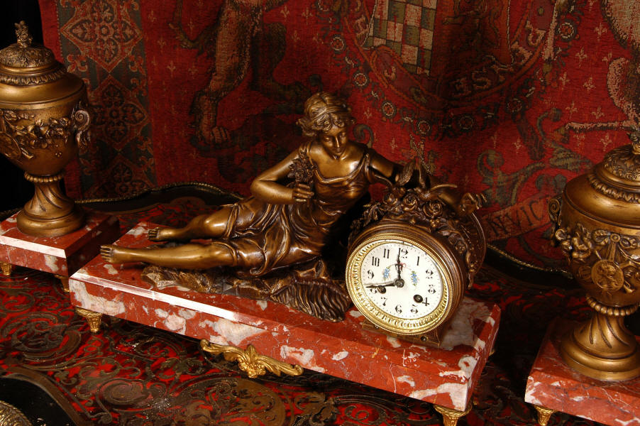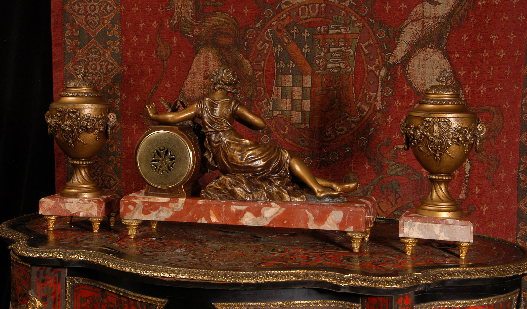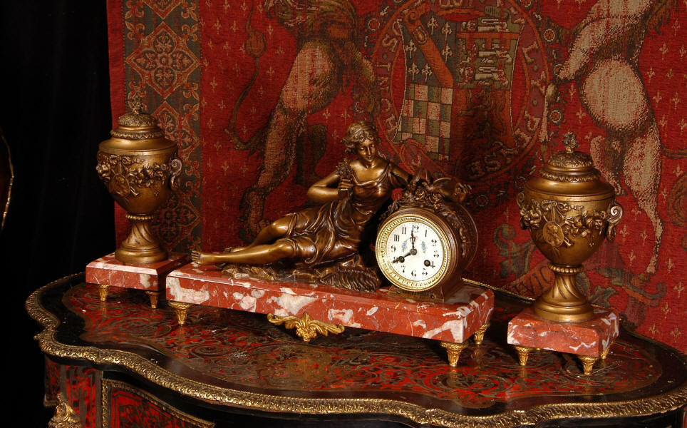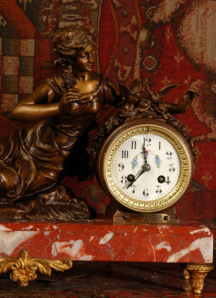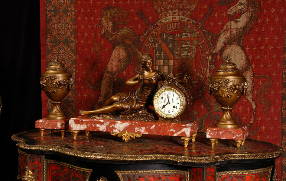 ~ French - Circa 1900 ~ ~~ Excellent condition, fully overhauled ~~ A Stunning Antique French clock set by the Italian sculptor O. Ruffony entitled Les Favoris (The Favourites). It features a beautifully modelled figure of a young woman, reclining with a bouquet of flowers and a pair of birds. The lidded side vases are classical in style with swags of flowers and musical trophies and are mounted on matching marble bases. The set is beautifully made in patinated bronzed metal mounted on variegated specimen marble bases, it is in very good condition.