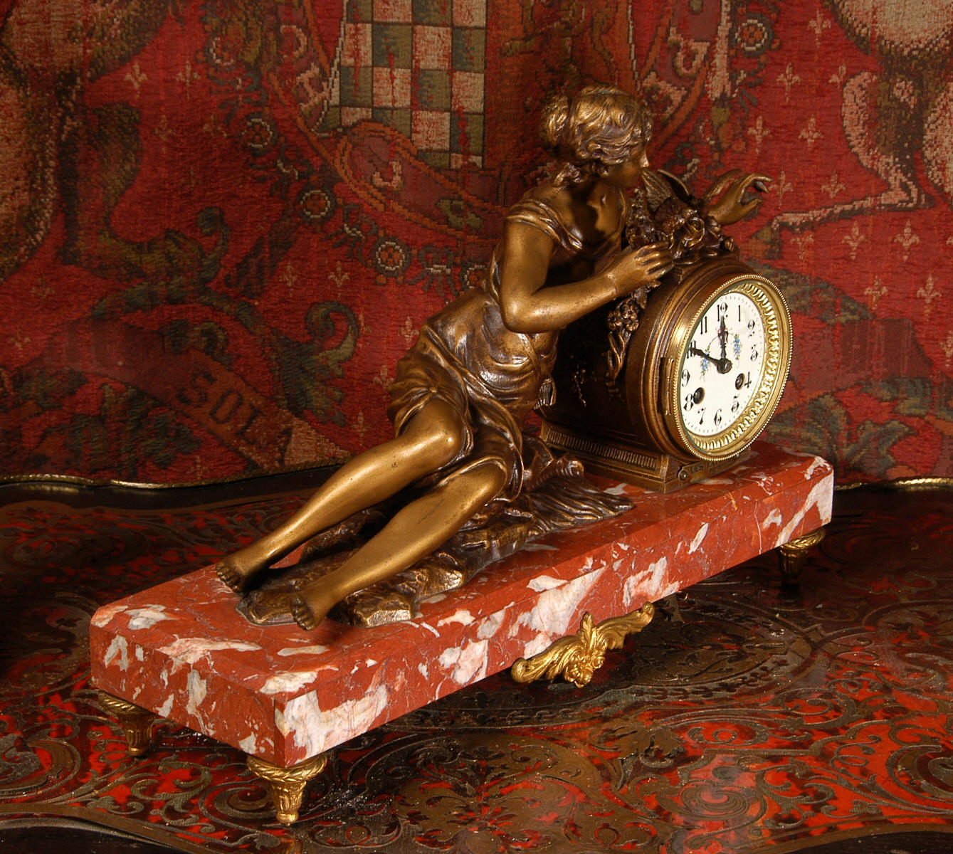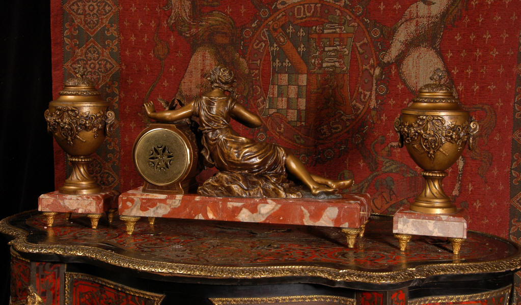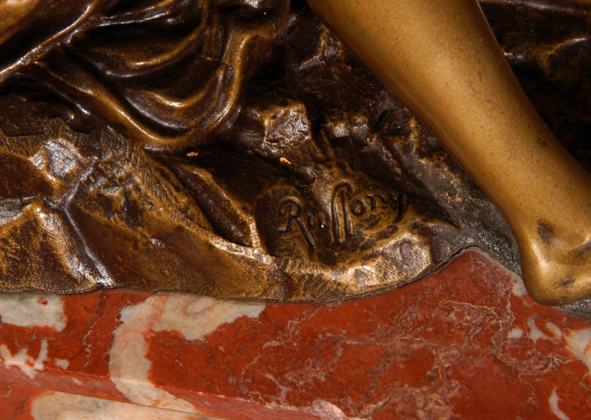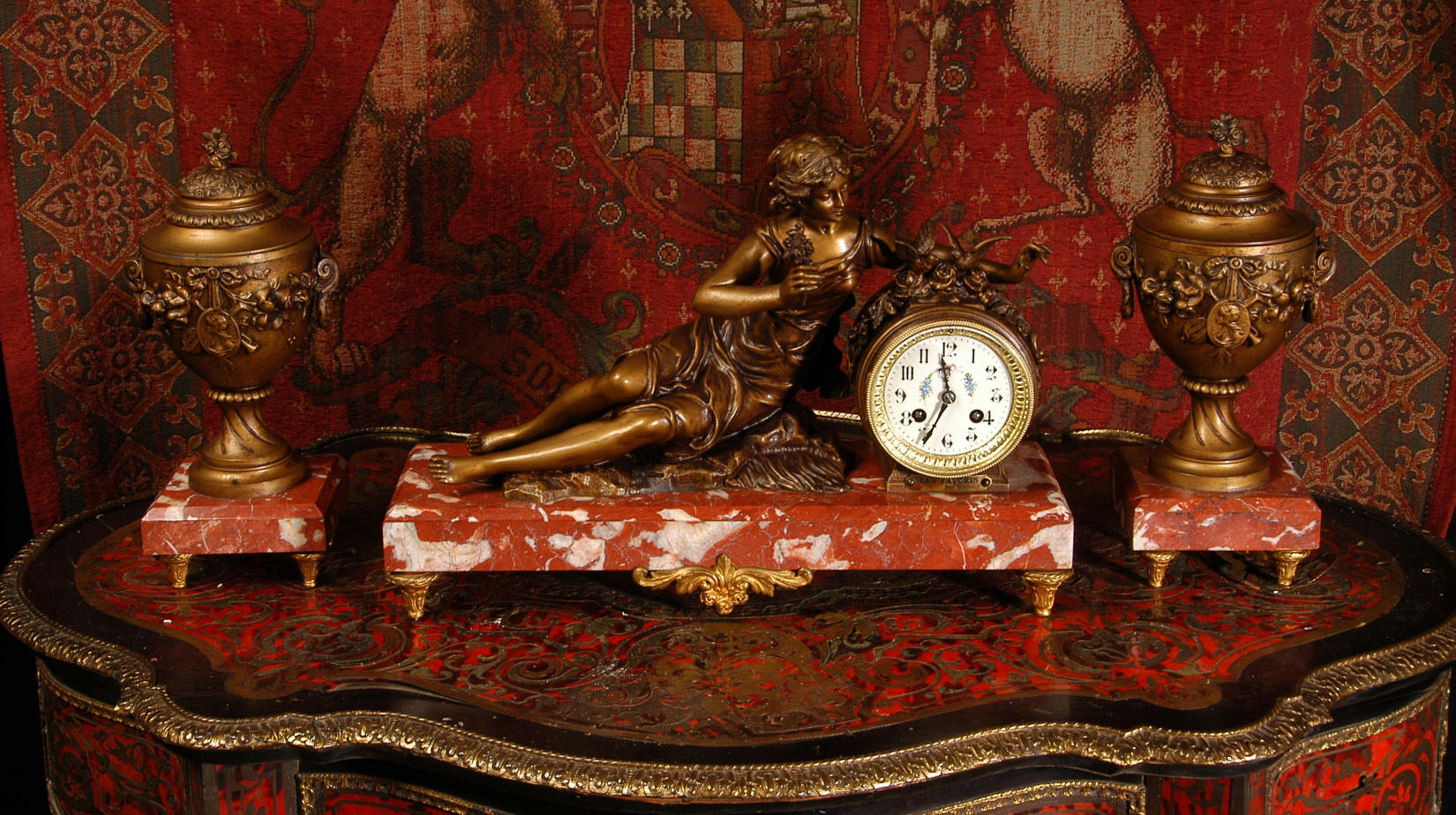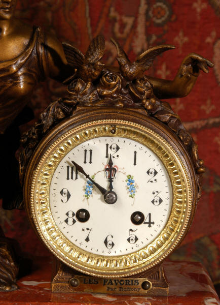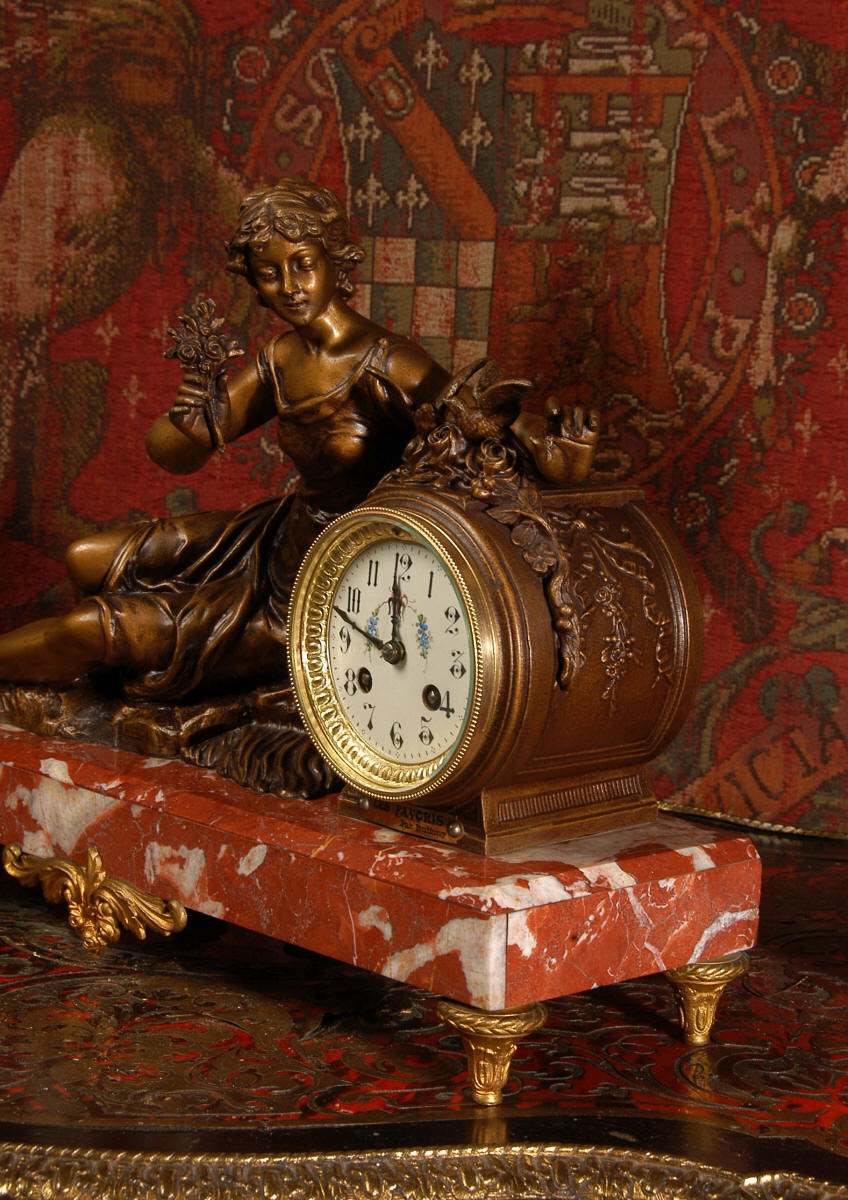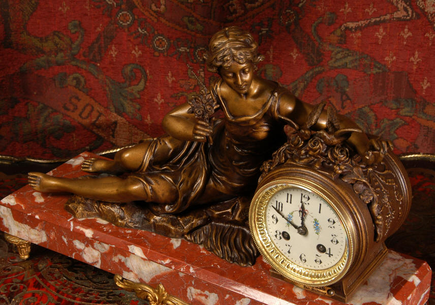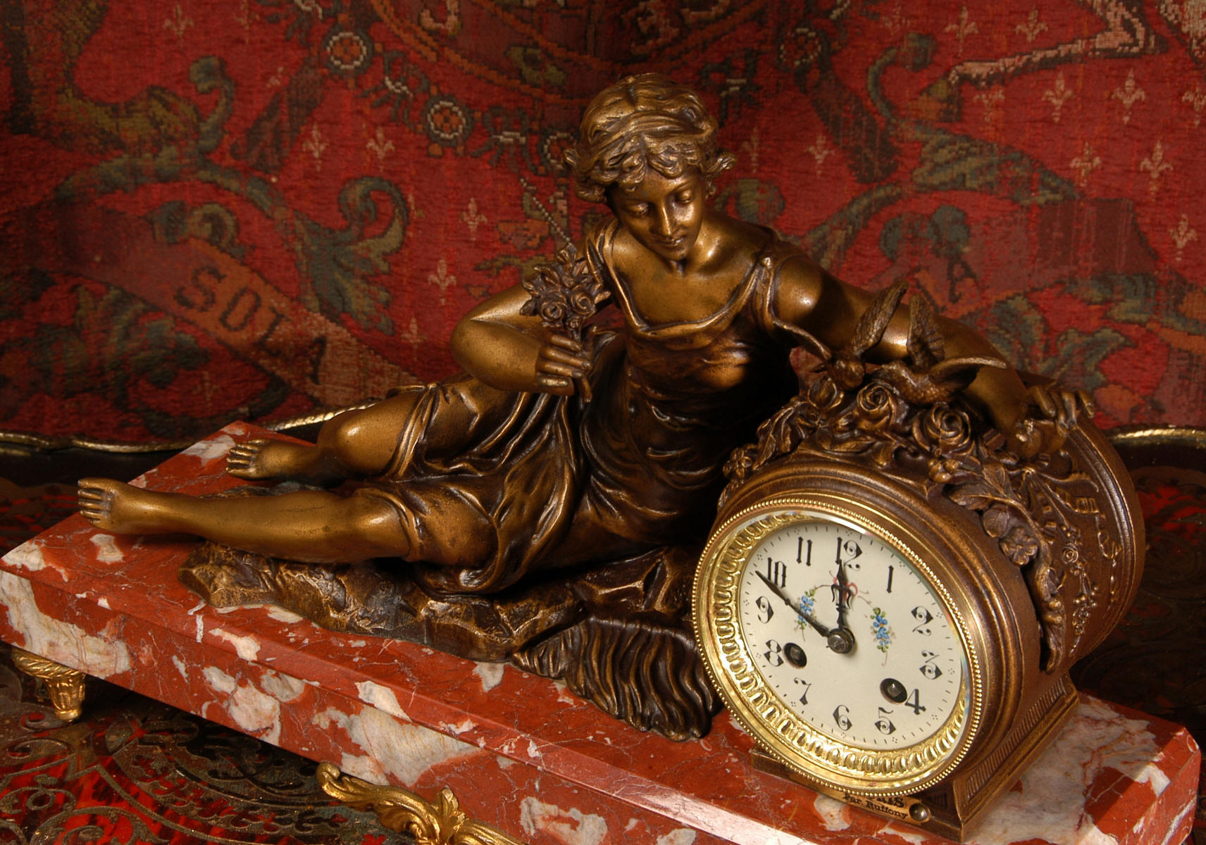 ~ French - Circa 1900 ~ ~~ Excellent condition, fully overhauled ~~ A Stunning Antique French clock set by the Italian sculptor O. Ruffony entitled Les Favoris (The Favourites). It features a beautifully modelled figure of a young woman, reclining with a bouquet of flowers and a pair of birds. The lidded side vases are classical in style with swags of flowers and musical trophies and are mounted on matching marble bases. The set is beautifully made in patinated bronzed metal mounted on variegated specimen marble bases, it is in very good condition.