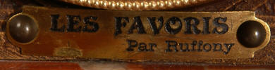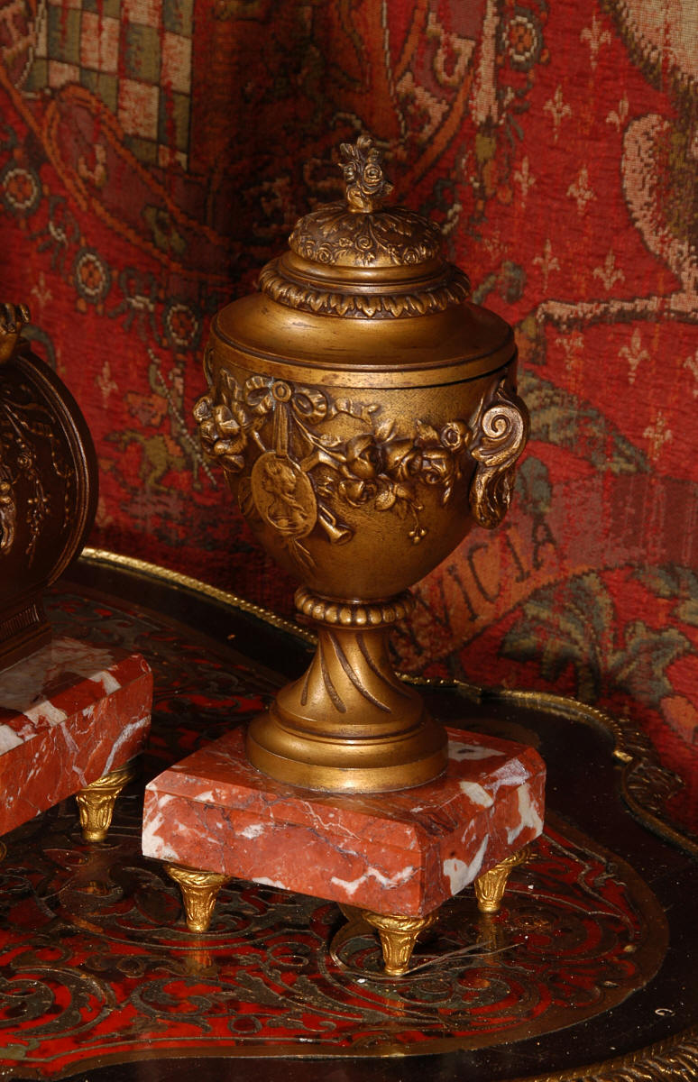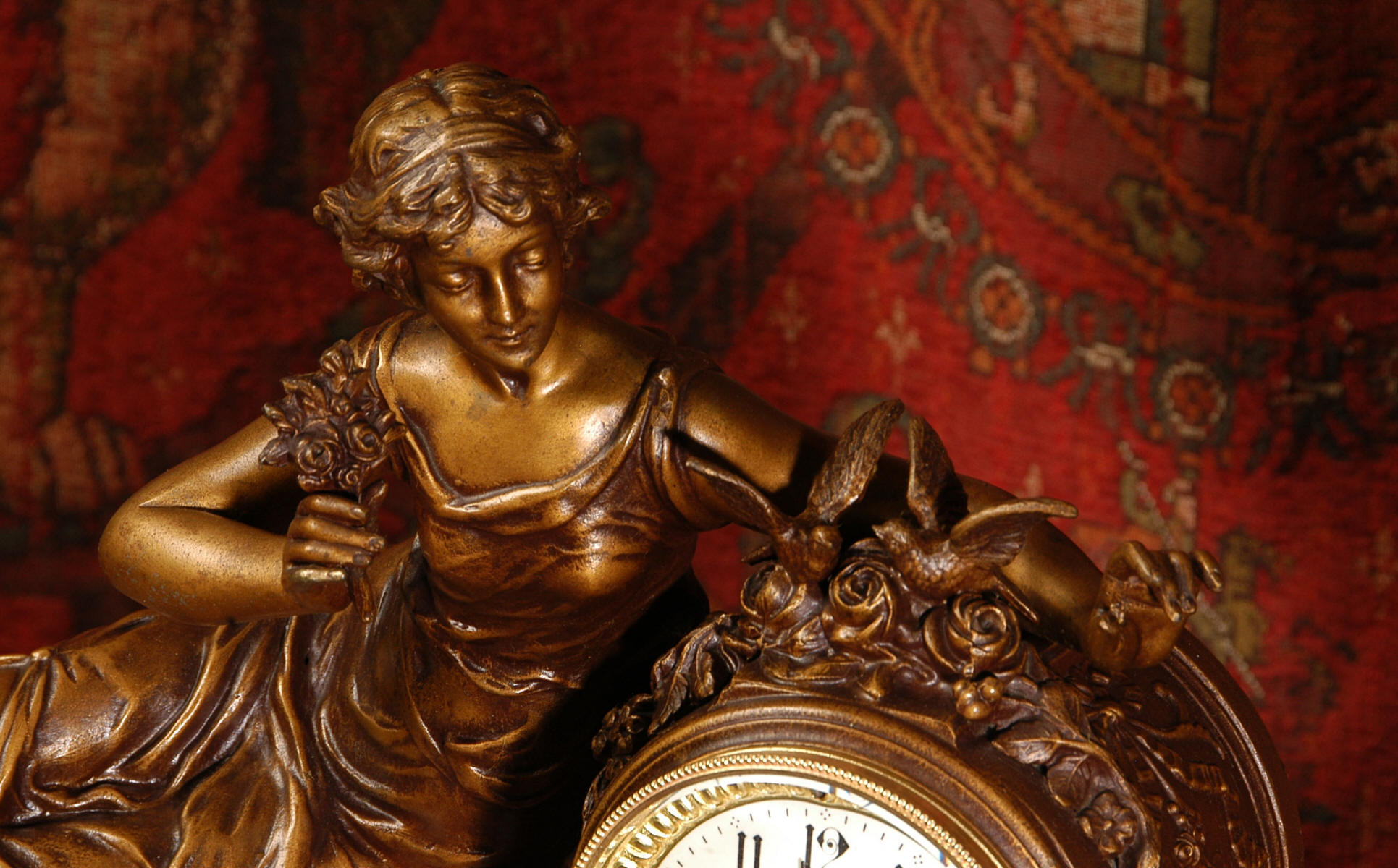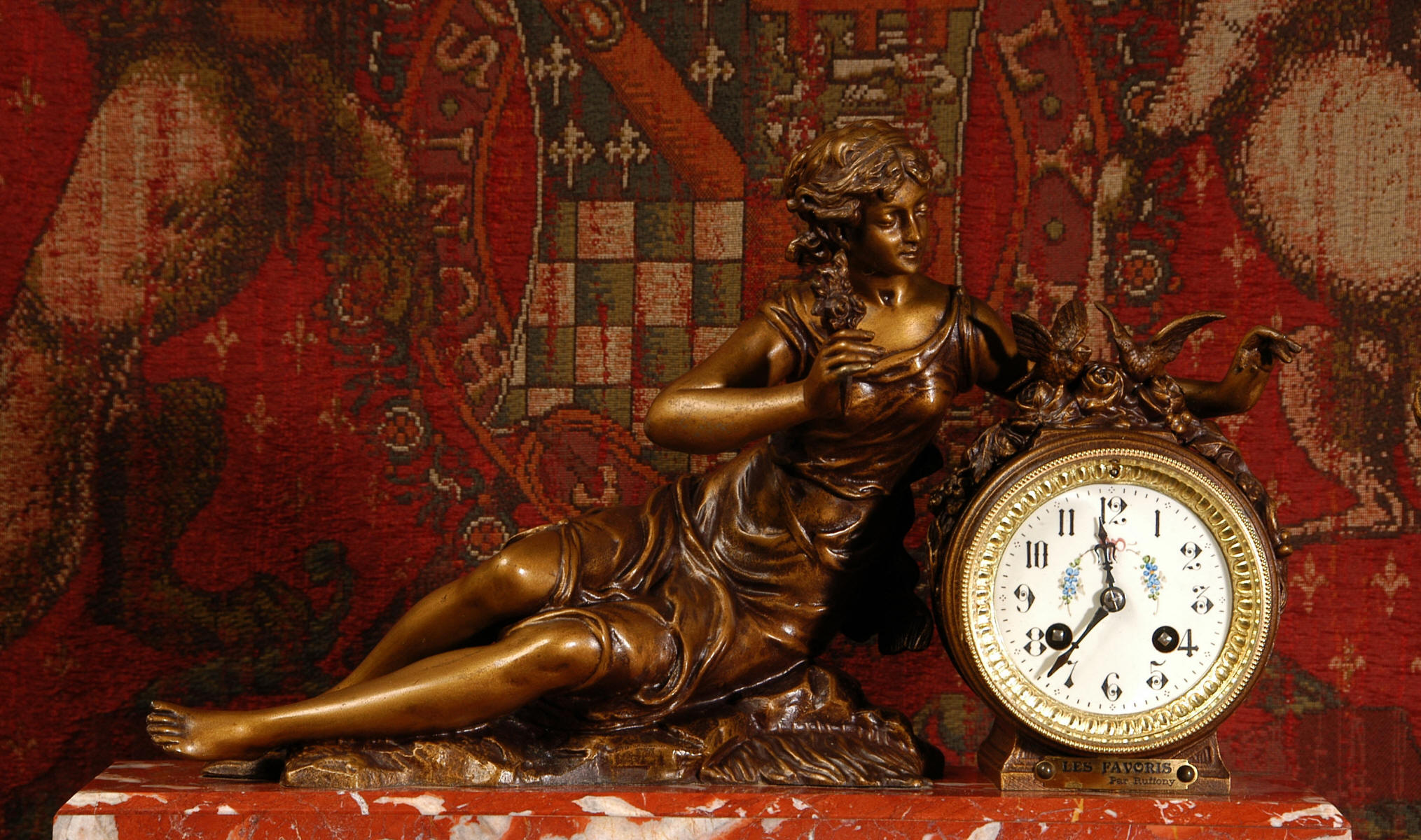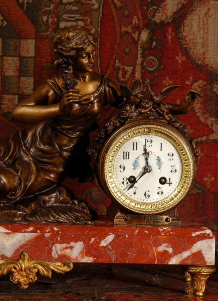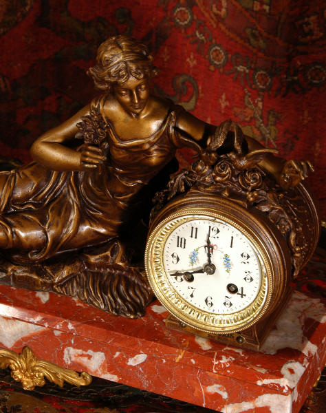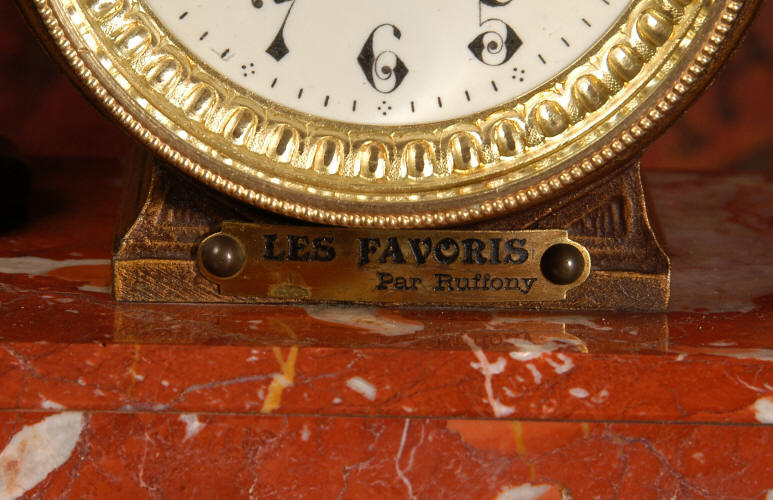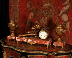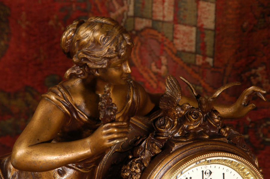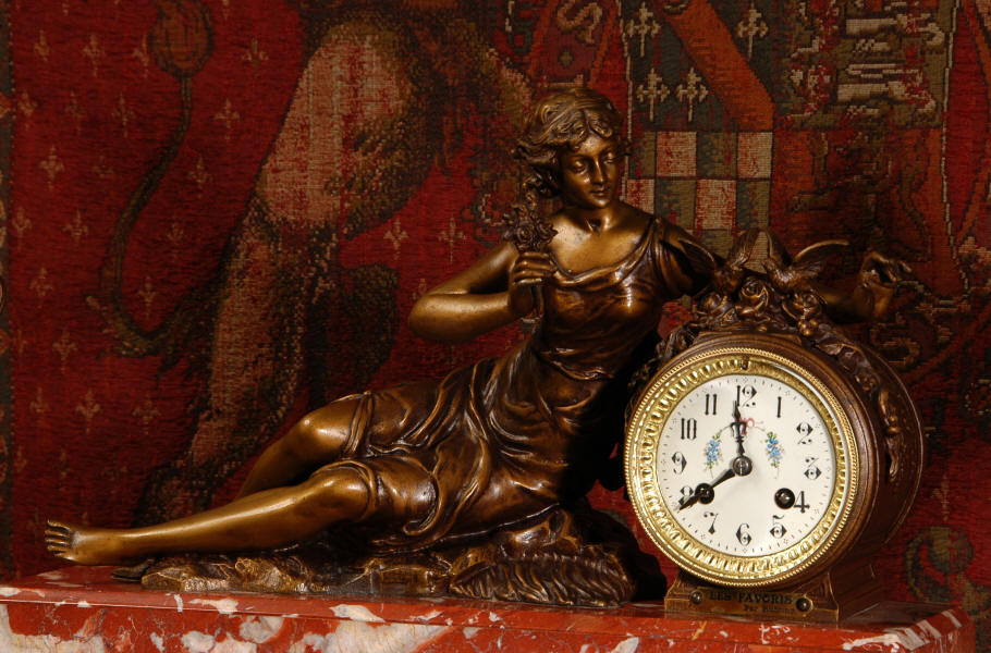 ~ French - Circa 1900 ~ ~~ Excellent condition, fully overhauled ~~ A Stunning Antique French clock set by the Italian sculptor O. Ruffony entitled Les Favoris (The Favourites). It features a beautifully modelled figure of a young woman, reclining with a bouquet of flowers and a pair of birds. The lidded side vases are classical in style with swags of flowers and musical trophies and are mounted on matching marble bases. The set is beautifully made in patinated bronzed metal mounted on variegated specimen marble bases, it is in very good condition.