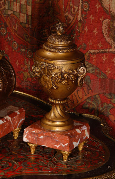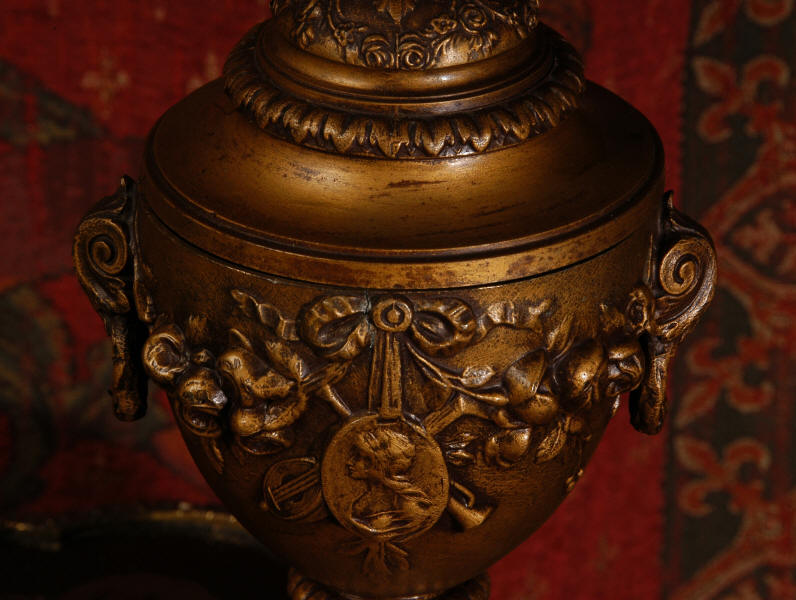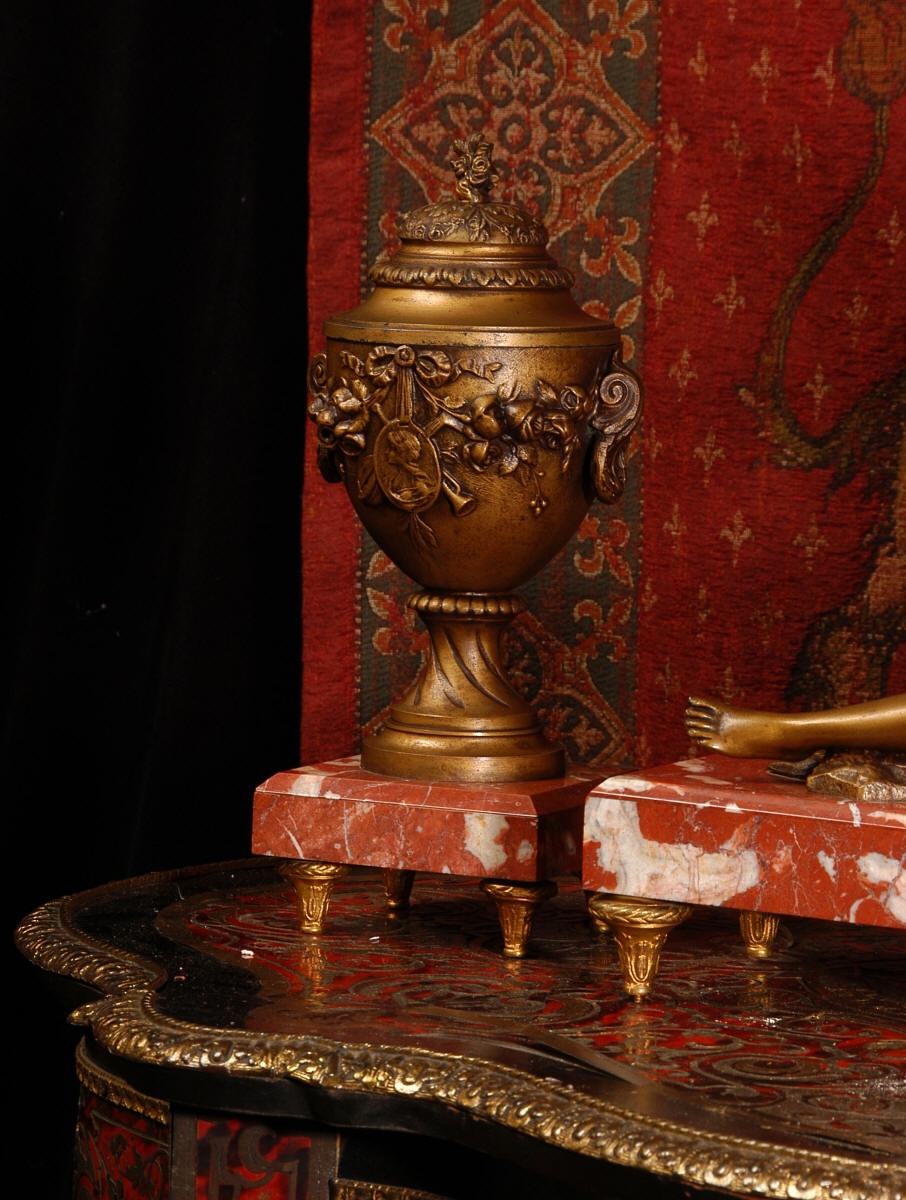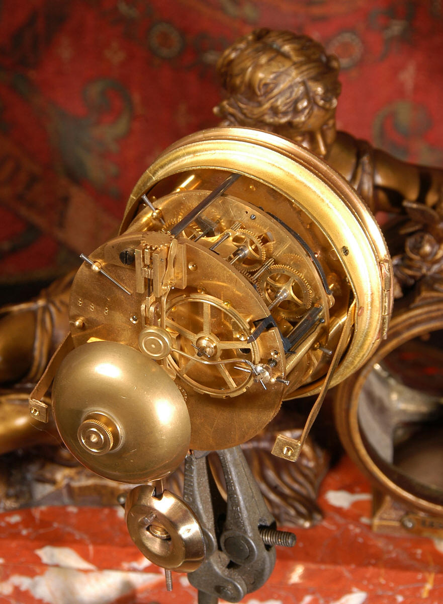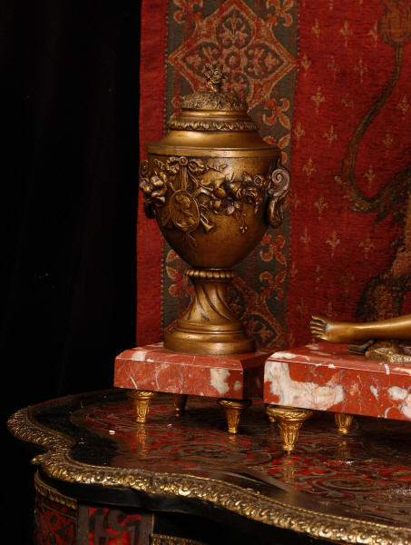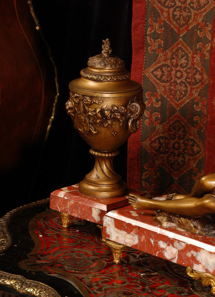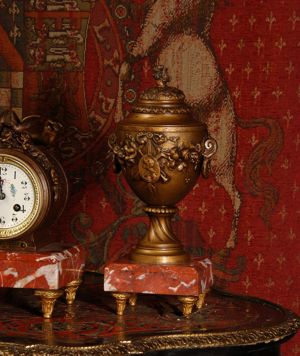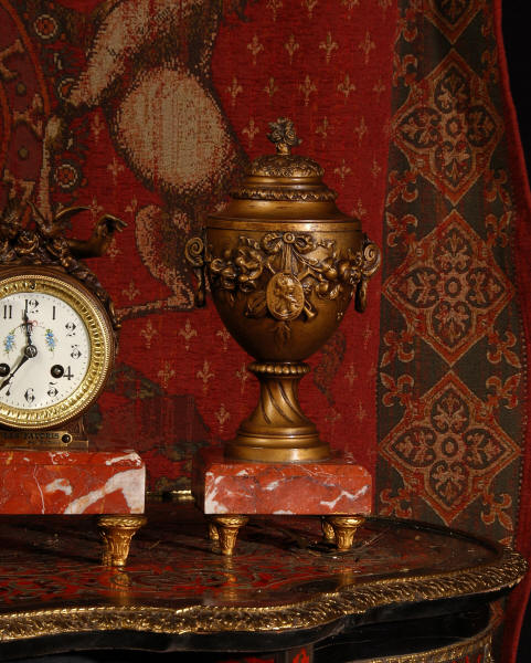 O. Ruffony (d. 1925) was an Italian sculptor working around the end of the 19th and beginning of the 20th centuries. He is listed in the Artprice database. The piece is signed with an impressed mark to the figure and a plaque is mounted on the front of the case with the artist and the title of the piece. The dial is enamel on copper with a delicate floral swag. The piece is modelled in the round and so would display beautifully in the centre of a room. The French movement is by Fritz Marti and has the makers mark on the movement backplate. It is of the makers usual high quality and is in excellent clean and running condition having been fully overhauled by our clockmaker. Pendulum is original. It runs for 8 days and strikes the hours and halves on a bell. Click the video clip below to hear the bell and watch the clock running! Condition of the case is excellent with clean and bright finish and there are no losses. There is some wear on the high spots and a few minor areas of discolouration or marks to the original patination. One vase has a small stress crack near the edge of the top (see close up picture below) and some dents / holes in the liner (can't be seen with the lid on). Marble is in excellent condition with just some minor nibbles on the edges. It has a good polish. Dial is also in excellent condition with no chips or scratches. A stunning clock set, a centrepiece for your room and collection!