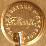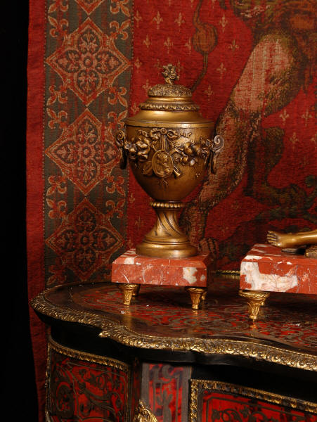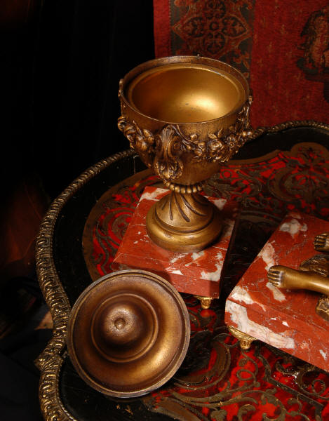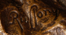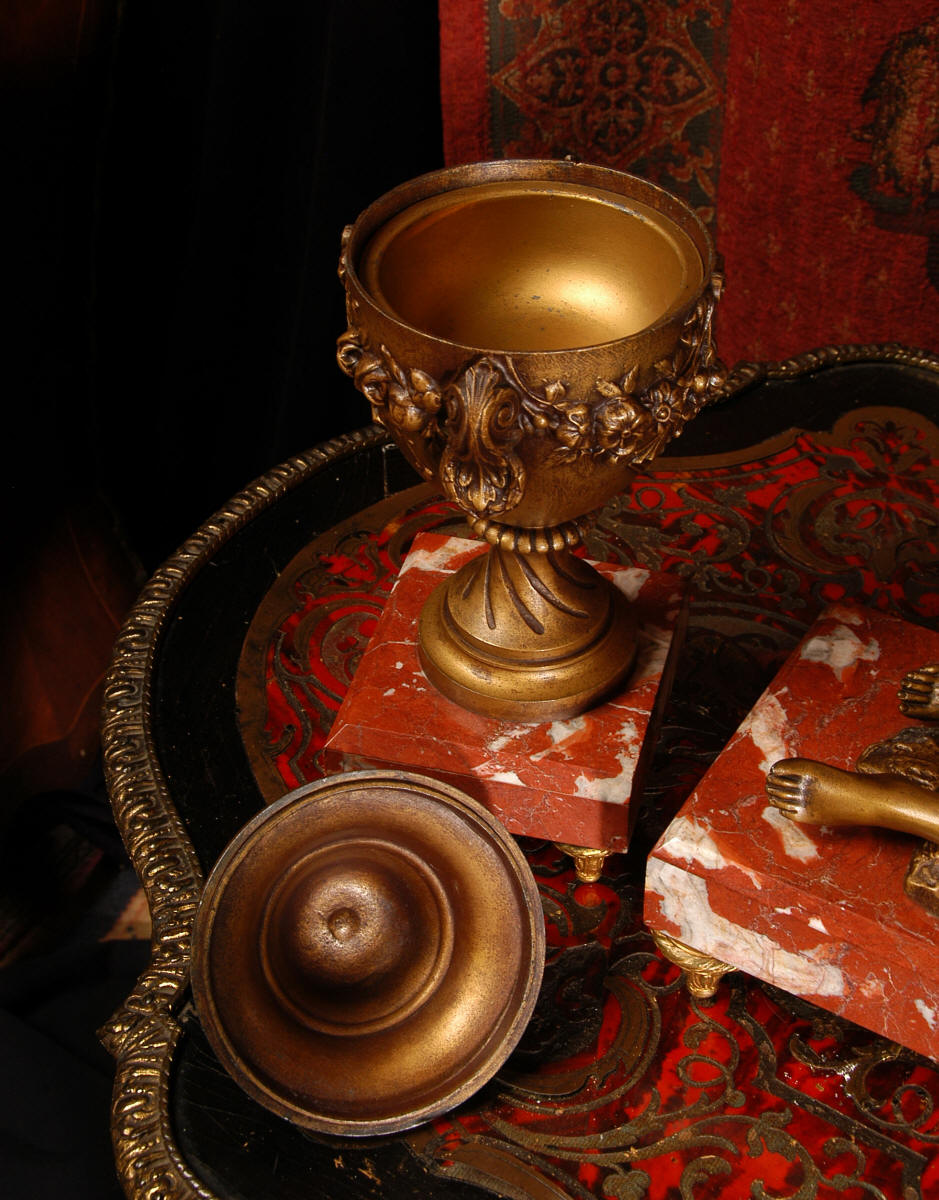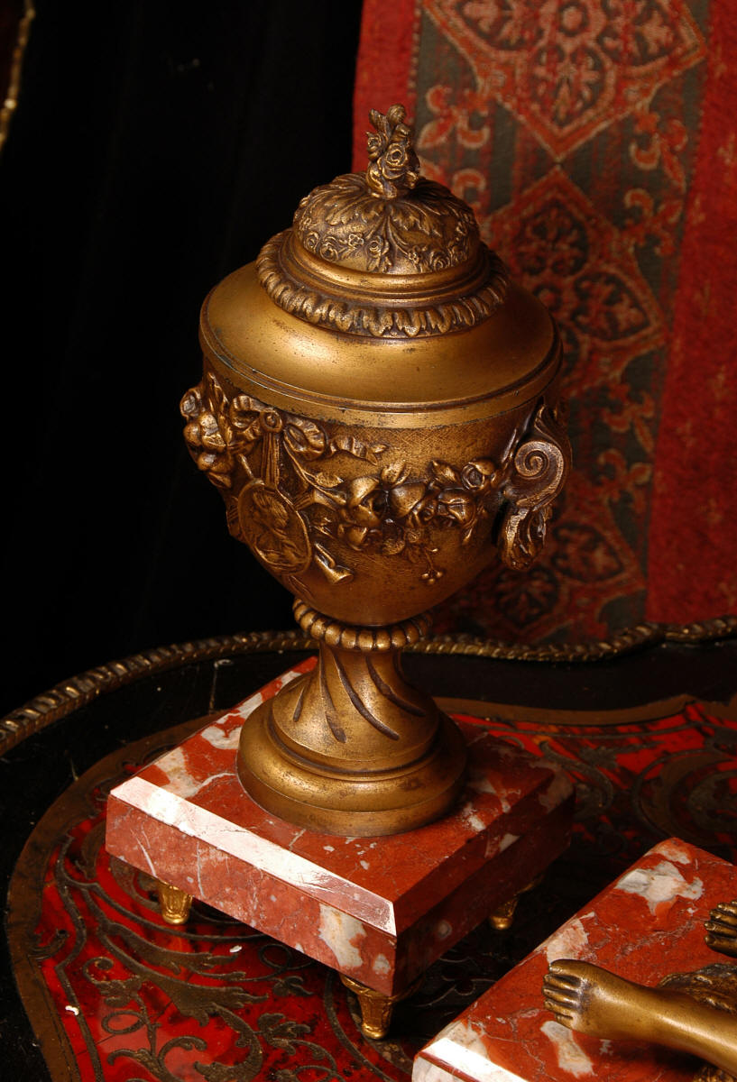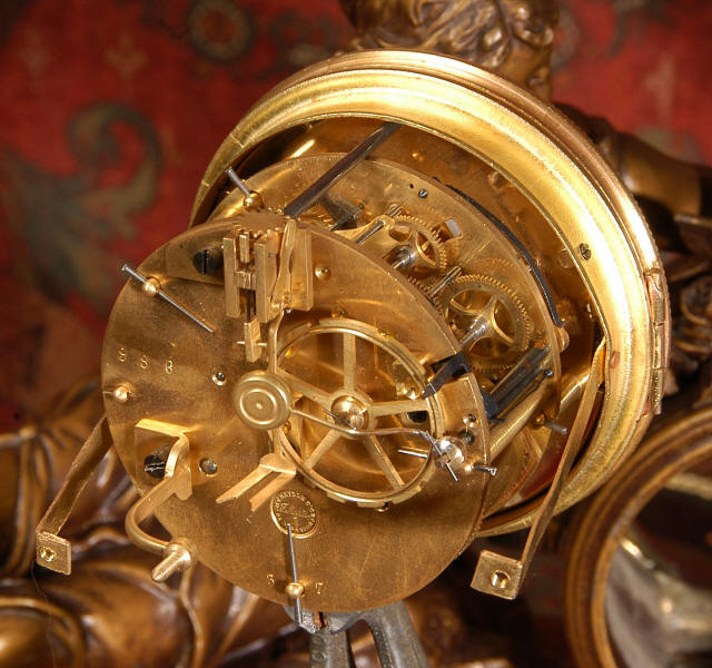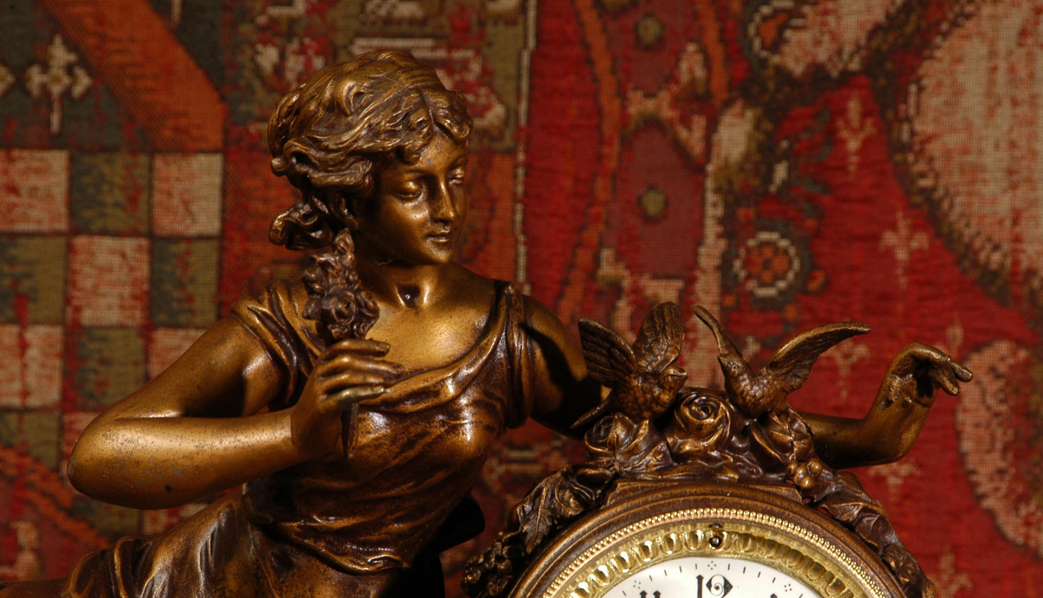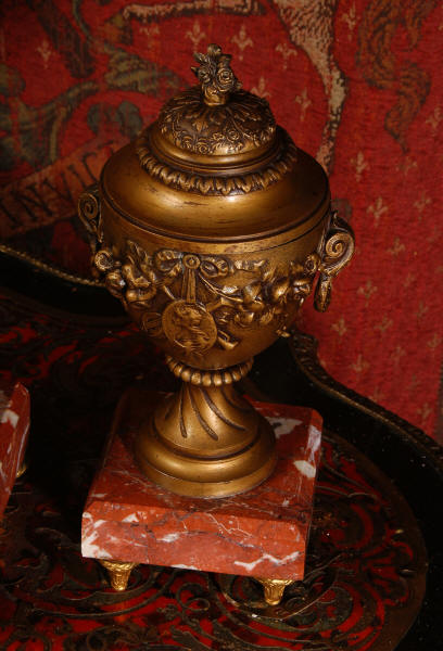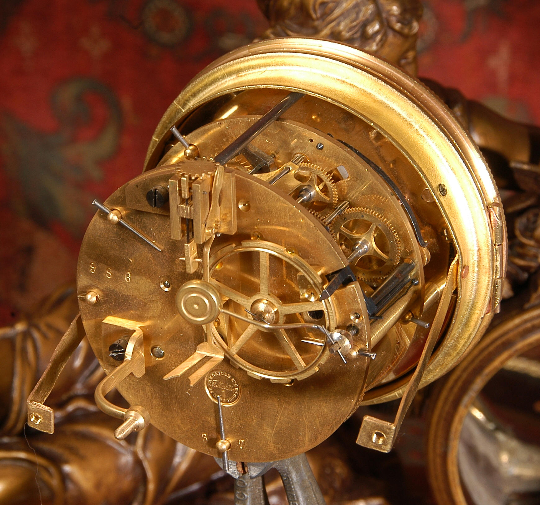 O. Ruffony (d. 1925) was an Italian sculptor working around the end of the 19th and beginning of the 20th centuries. He is listed in the Artprice database. The piece is signed with an impressed mark to the figure and a plaque is mounted on the front of the case with the artist and the title of the piece. The dial is enamel on copper with a delicate floral swag. The piece is modelled in the round and so would display beautifully in the centre of a room. The French movement is by Fritz Marti and has the makers mark on the movement backplate. It is of the makers usual high quality and is in excellent clean and running condition having been fully overhauled by our clockmaker. Pendulum is original. It runs for 8 days and strikes the hours and halves on a bell. Click the video clip below to hear the bell and watch the clock running! Condition of the case is excellent with clean and bright finish and there are no losses. There is some wear on the high spots and a few minor areas of discolouration or marks to the original patination. One vase has a small stress crack near the edge of the top (see close up picture below) and some dents / holes in the liner (can't be seen with the lid on). Marble is in excellent condition with just some minor nibbles on the edges. It has a good polish. Dial is also in excellent condition with no chips or scratches. A stunning clock set, a centrepiece for your room and collection!