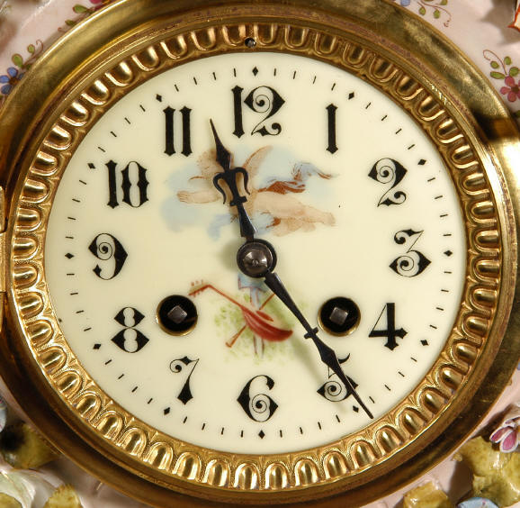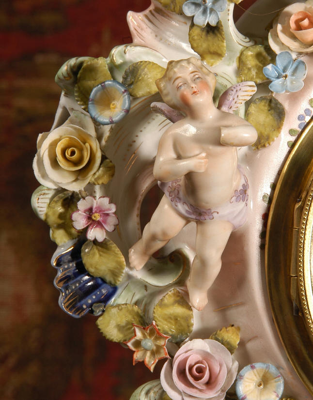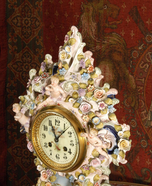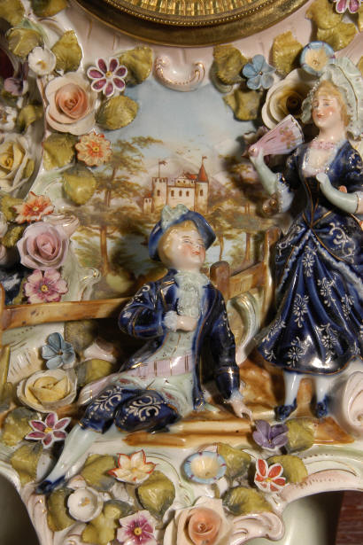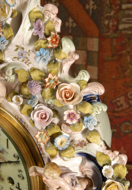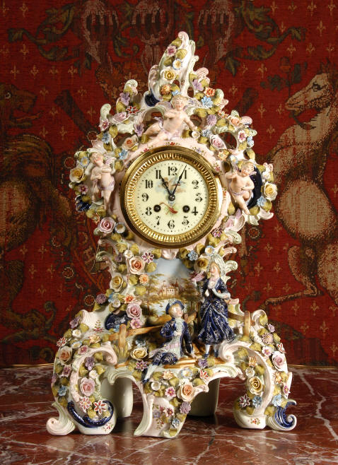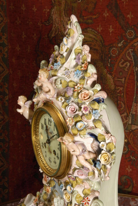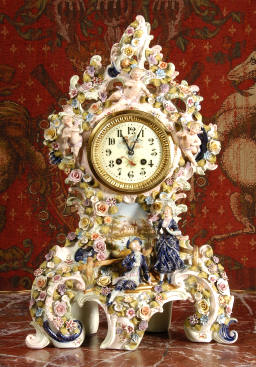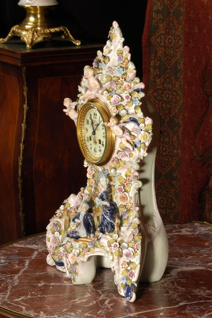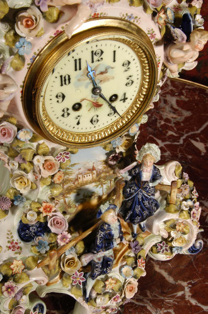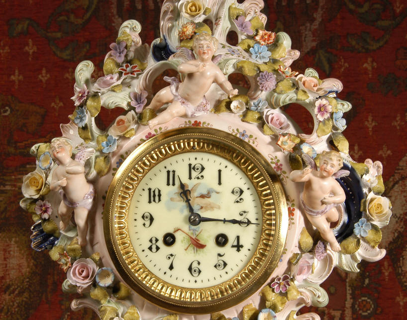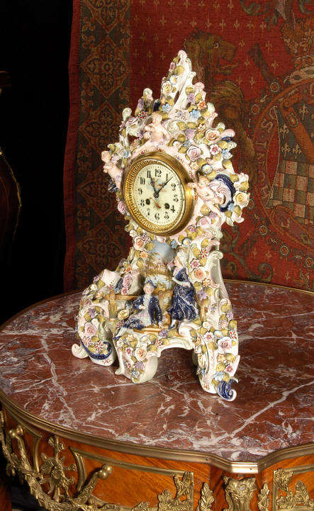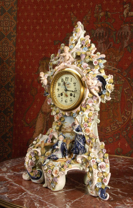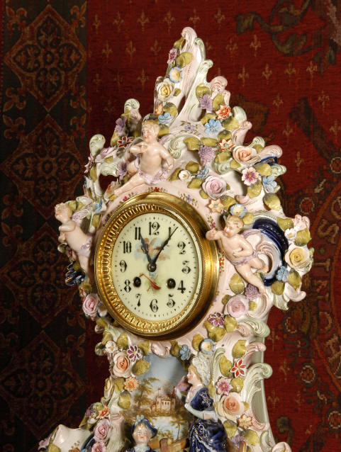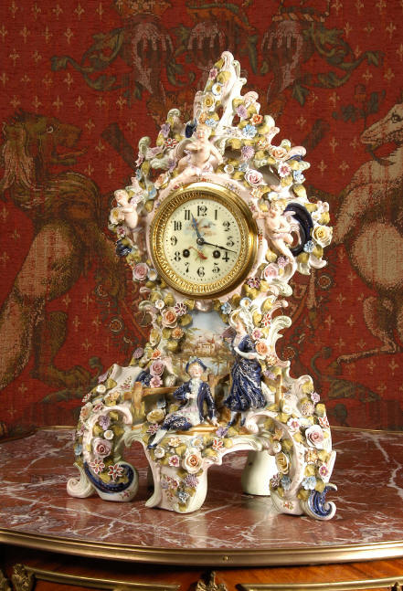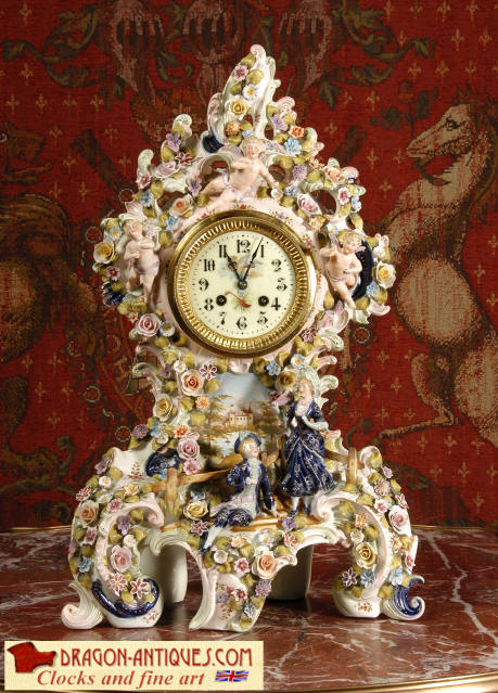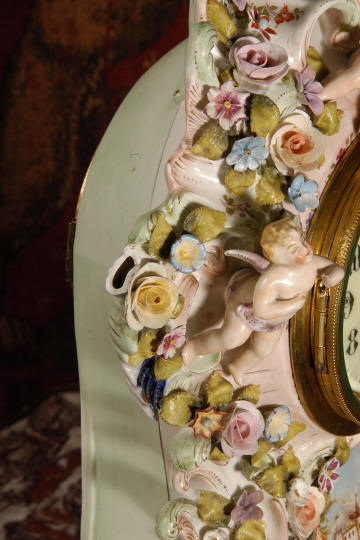 ~ French - Circa 1880 ~ ~~ Excellent condition ~~ A large and stunning porcelain cased boudoir clock by the famous maker Japy Freres. Case is continental porcelain, elaborately and profusely decorated with floral bocage, delicately painted in a variety of colours against the light green ground of the body. It is a classic Rococo asymmetric shape, modelled with 'C' scrolls. Three cherubs are seated around the dial which is also delicately painted with a cherub on a cream background. To the base, lovers meet in a country landscape with a chateau in the distance. Figures are beautifully modelled and decorated. Japy Freres movement is of superb quality, runs for 8 days and strikes half-hourly on a bell. It has been fully restored in our workshop and is in excellent clean and running condition. The pendulum is a new replacement. Click on the video below to watch this actual clock running! Condition of the case is