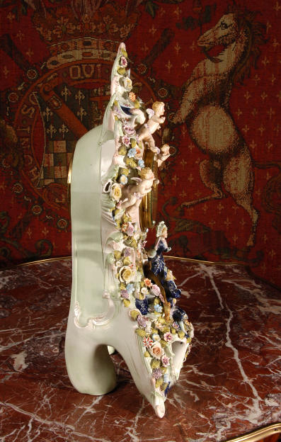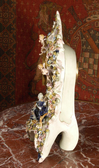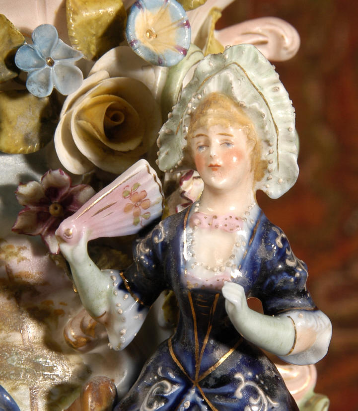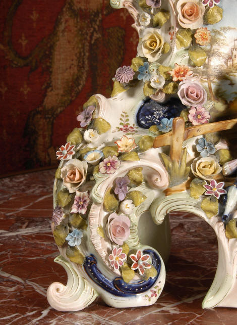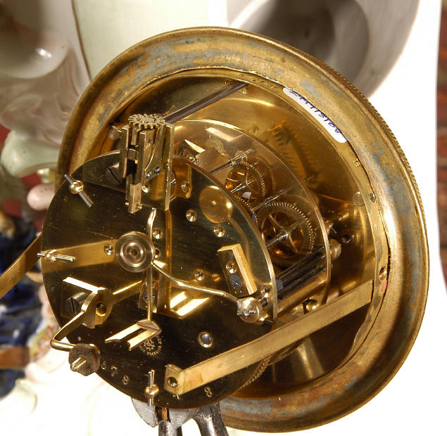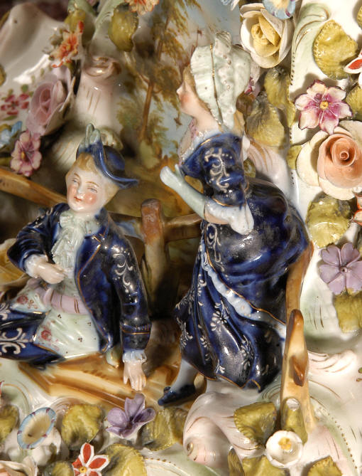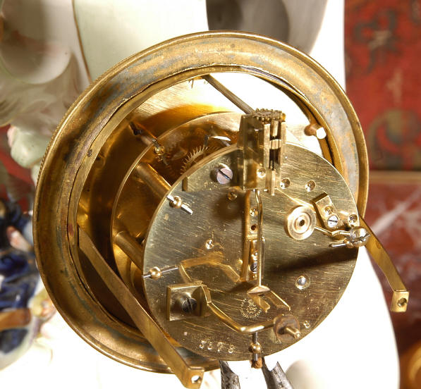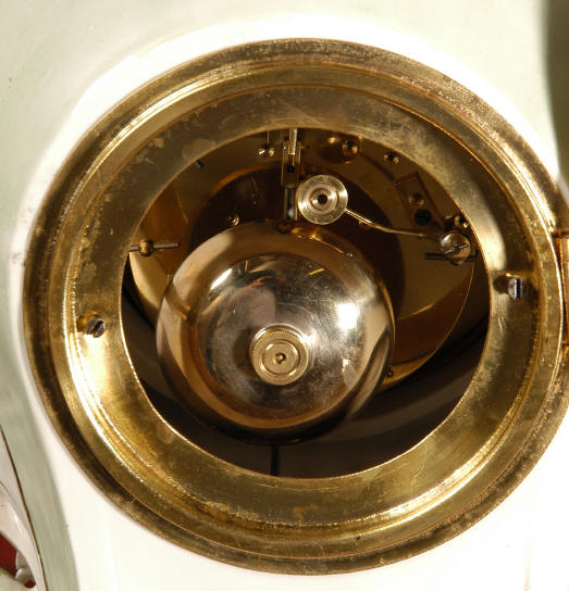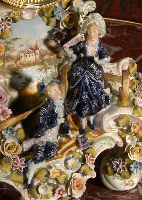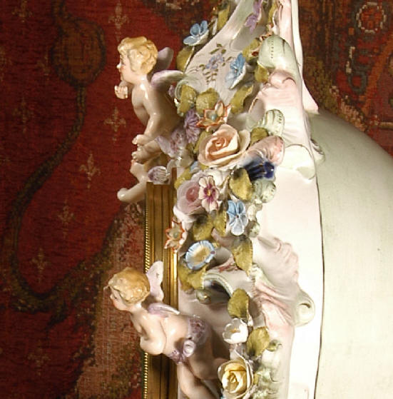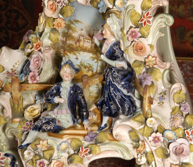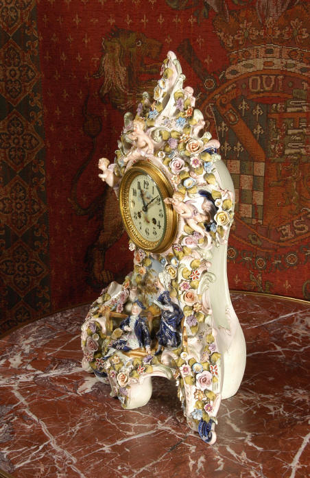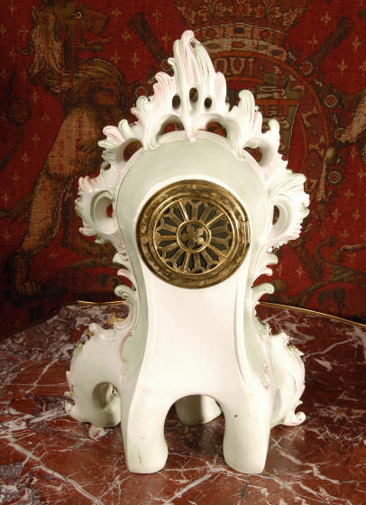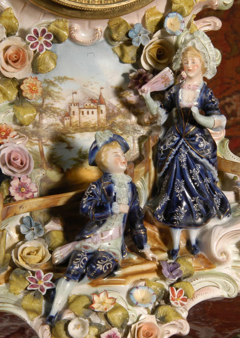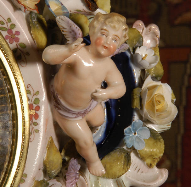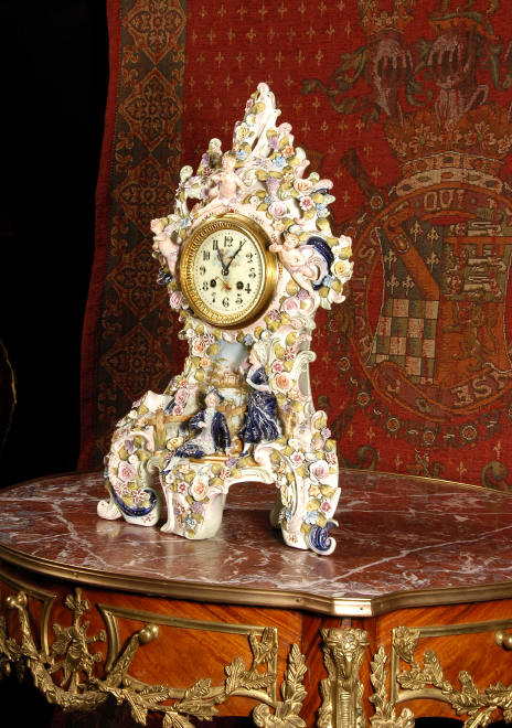 ~ French - Circa 1880 ~ ~~ Excellent condition ~~ A large and stunning porcelain cased boudoir clock by the famous maker Japy Freres. Case is continental porcelain, elaborately and profusely decorated with floral bocage, delicately painted in a variety of colours against the light green ground of the body. It is a classic Rococo asymmetric shape, modelled with 'C' scrolls. Three cherubs are seated around the dial which is also delicately painted with a cherub on a cream background. To the base, lovers meet in a country landscape with a chateau in the distance. Figures are beautifully modelled and decorated. Japy Freres movement is of superb quality, runs for 8 days and strikes half-hourly on a bell. It has been fully restored in our workshop and is in excellent clean and running condition. The pendulum is a new replacement. Click on the video below to watch this actual clock running! Condition of the case is