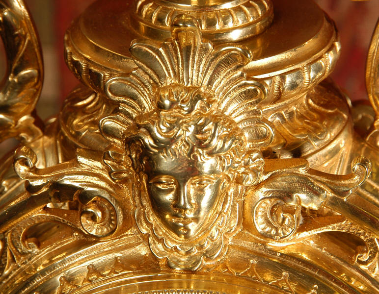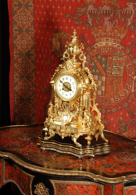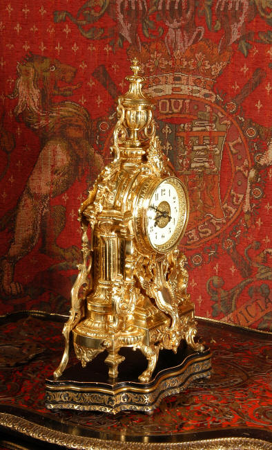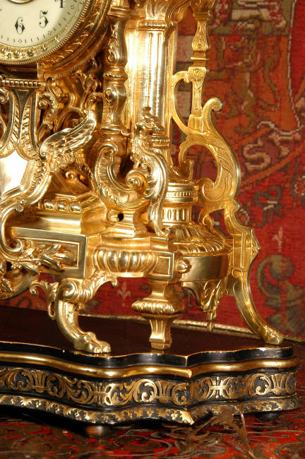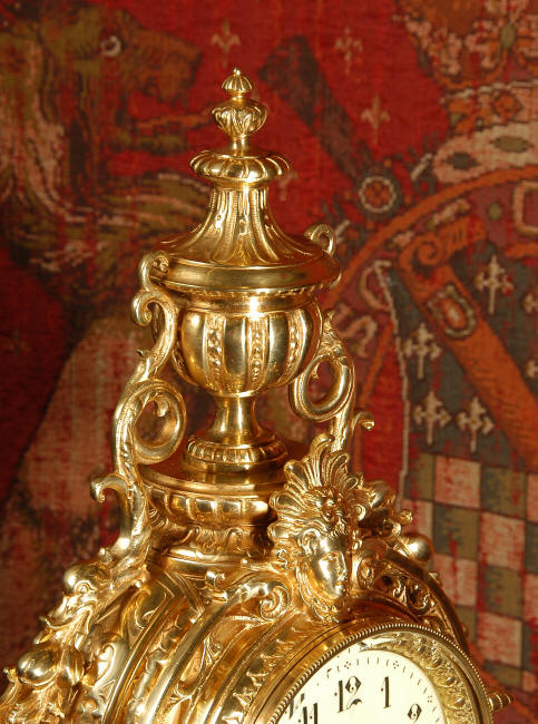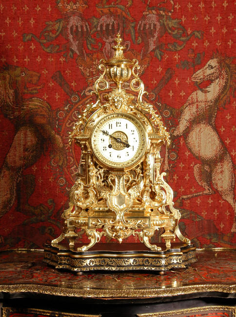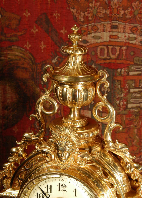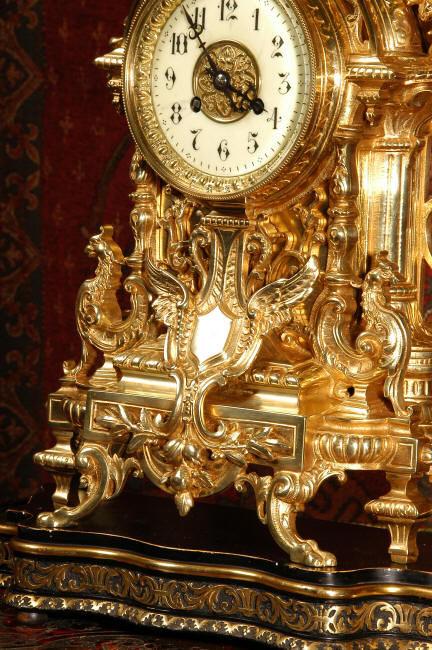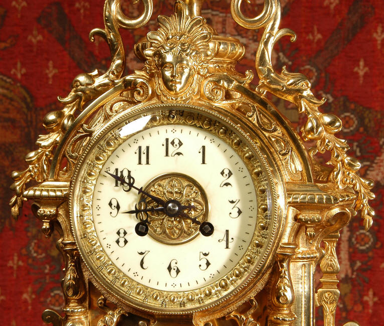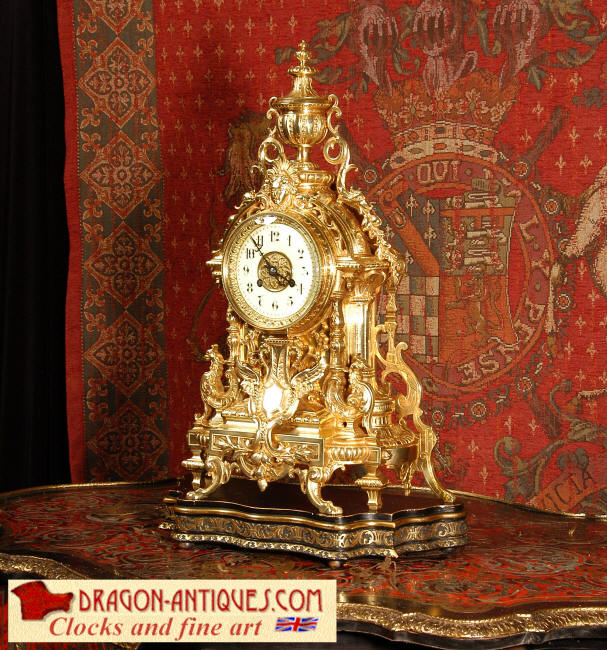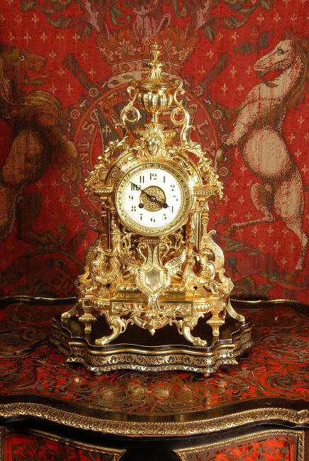 ~ French - Circa 1880 ~ ~~ Excellent condition ~~ A very finely detailed gilt brass clock in excellent condition, much of the original gilding remains which is in lovely bright and clean condition. Particularly unusual is the original gesso base which is ebonised with gilt decoration. It is modelled in the Baroque style with mythical creatures to the sides, a goddess mask above the dial and hairy paw feet. The large dial has and egg and dart bezel and a gilded brass centre. The dial itself is enamel on copper and the glass is convex. Modelling is fine and well finished with a good quality gild. The French movement is of very high quality and has the Vincenti et Cie 'Medaille D'Argent 1855' mark on the movement backplate. It is in excellent clean and running condition having been fully overhauled and tested by our clockmaker. Pendulum is original. It runs for 8 days and strikes the hours and halves on a coiled gong. Click the movie below to hear the gong strike and watch the clock running! Condition of the case is