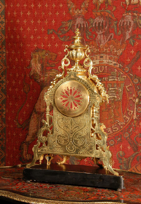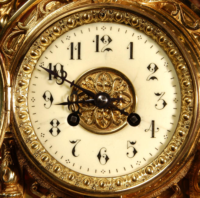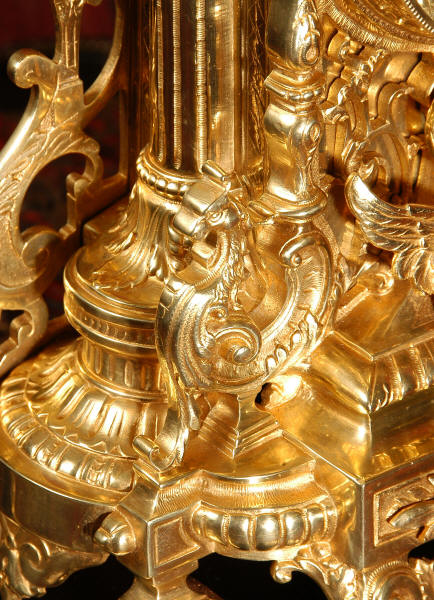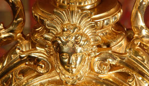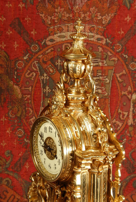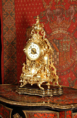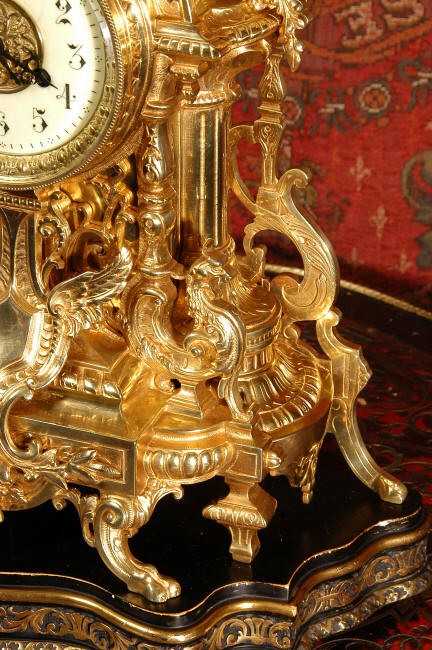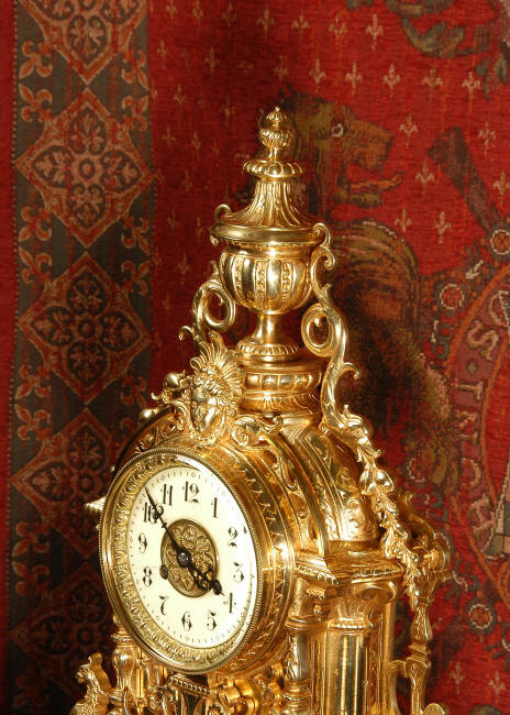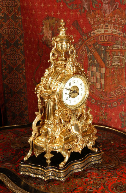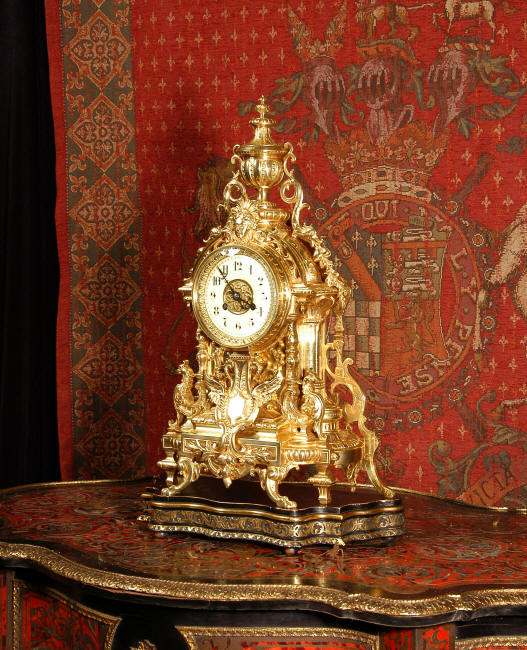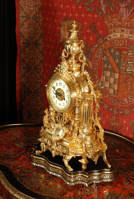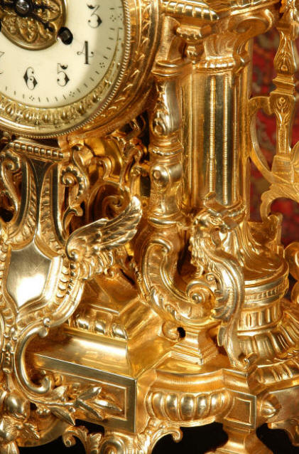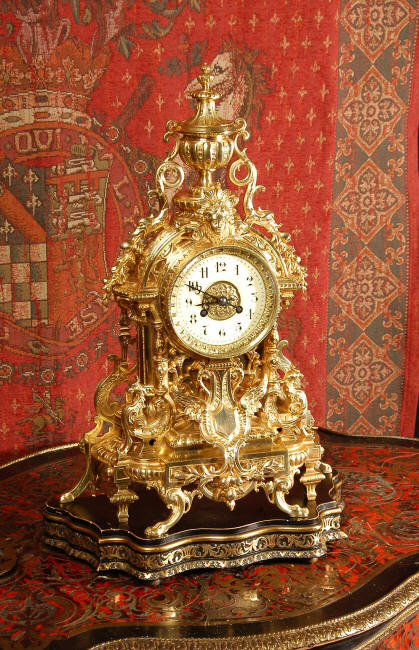 ~ French - Circa 1880 ~ ~~ Excellent condition ~~ A very finely detailed gilt brass clock in excellent condition, much of the original gilding remains which is in lovely bright and clean condition. Particularly unusual is the original gesso base which is ebonised with gilt decoration. It is modelled in the Baroque style with mythical creatures to the sides, a goddess mask above the dial and hairy paw feet. The large dial has and egg and dart bezel and a gilded brass centre. The dial itself is enamel on copper and the glass is convex. Modelling is fine and well finished with a good quality gild. The French movement is of very high quality and has the Vincenti et Cie 'Medaille D'Argent 1855' mark on the movement backplate. It is in excellent clean and running condition having been fully overhauled and tested by our clockmaker. Pendulum is original. It runs for 8 days and strikes the hours and halves on a coiled gong. Click the movie below to hear the gong strike and watch the clock running! Condition of the case is