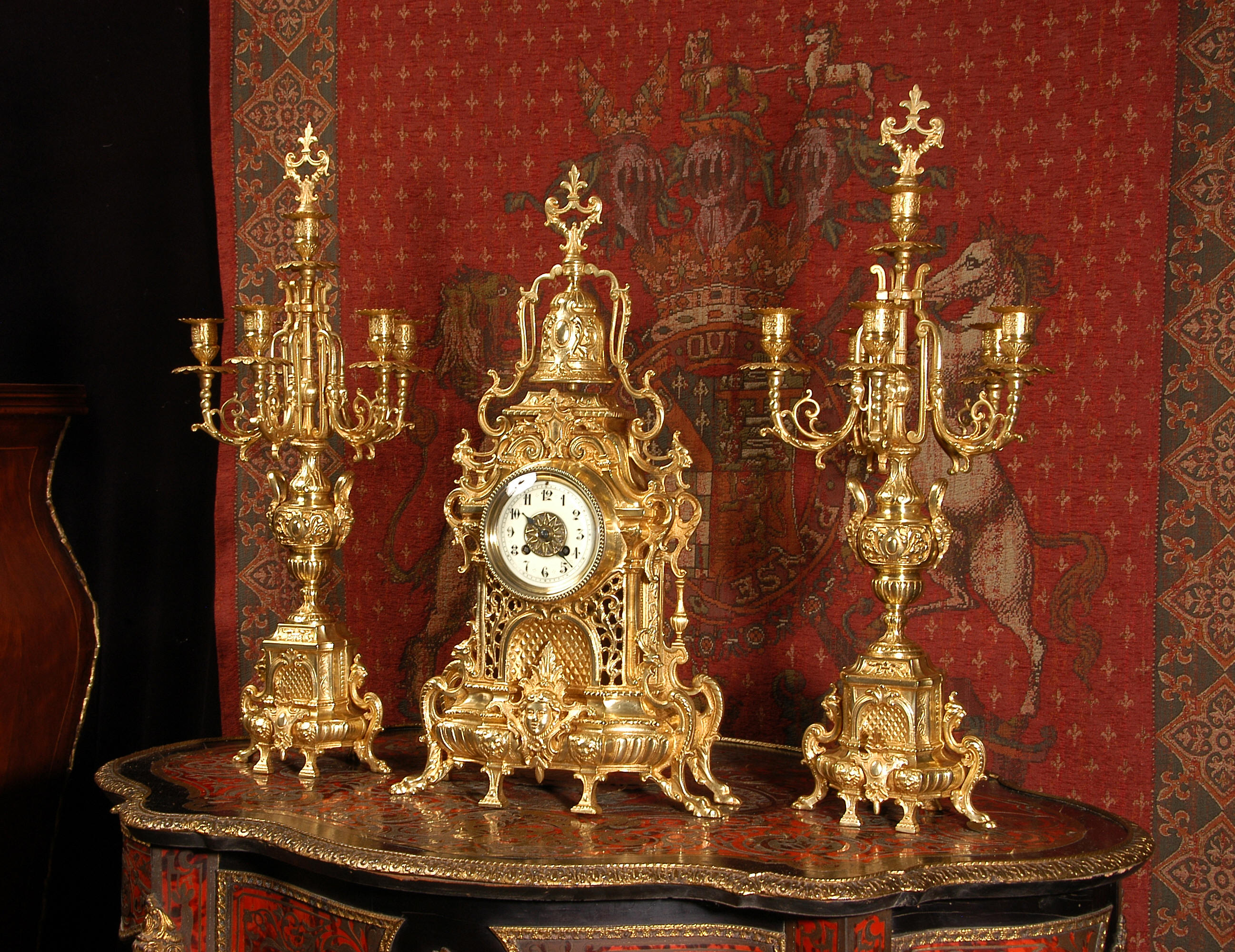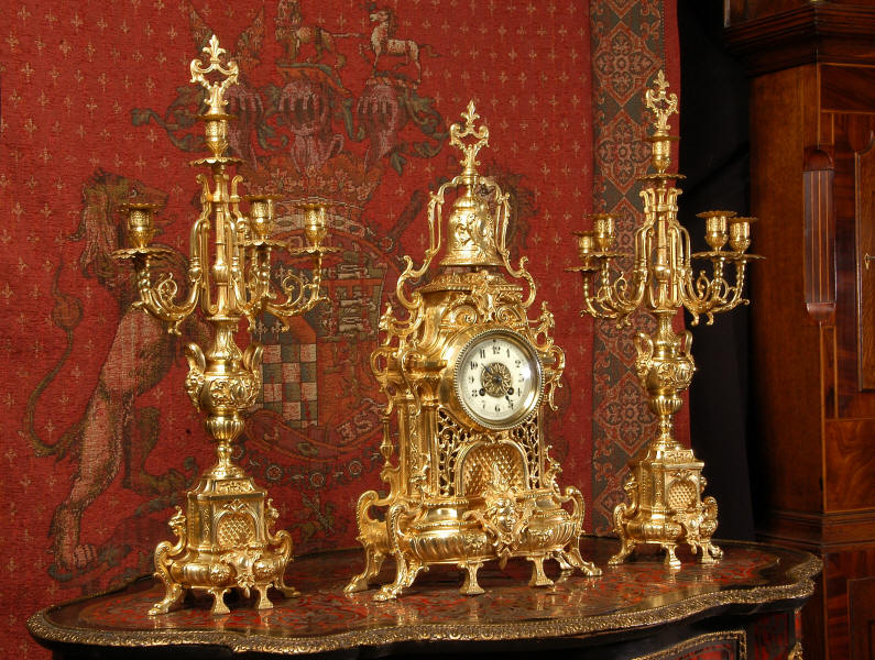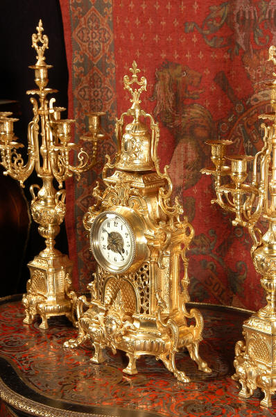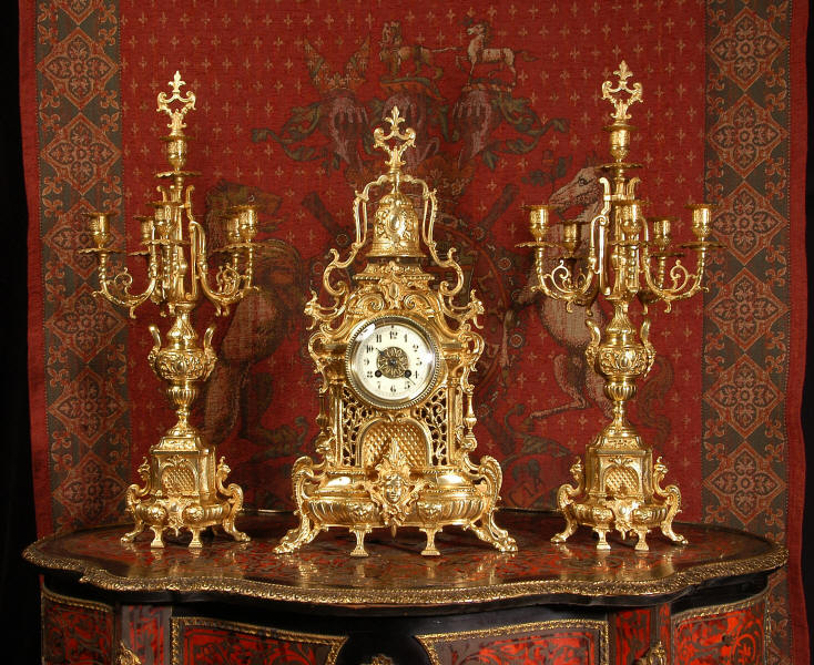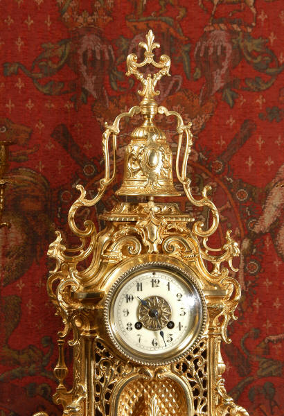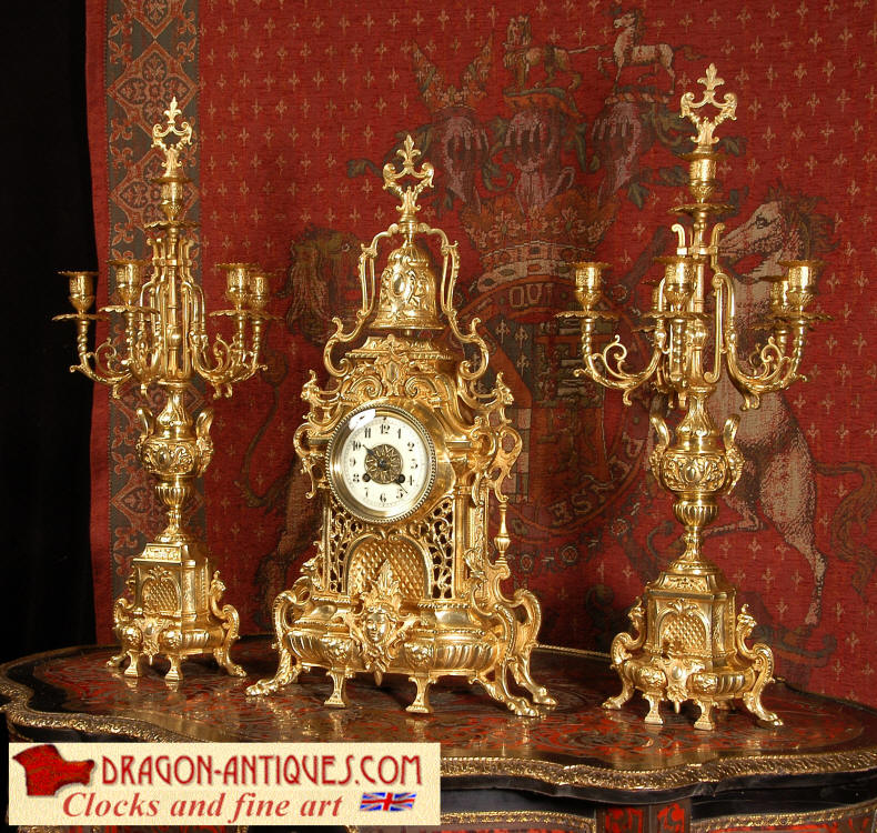 original antique French Gothic clock set, beautifully made in gilt brass, very heavy and
