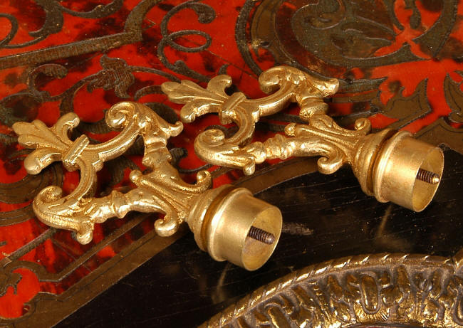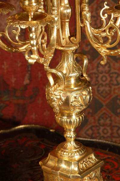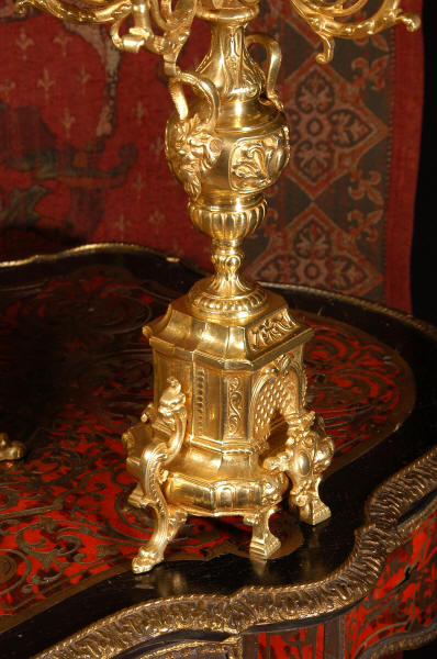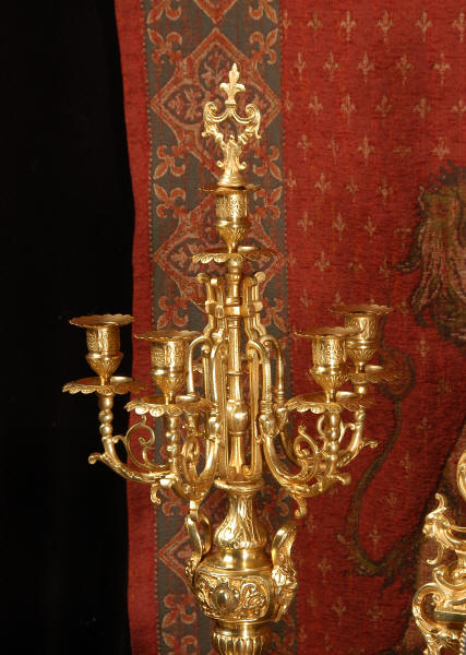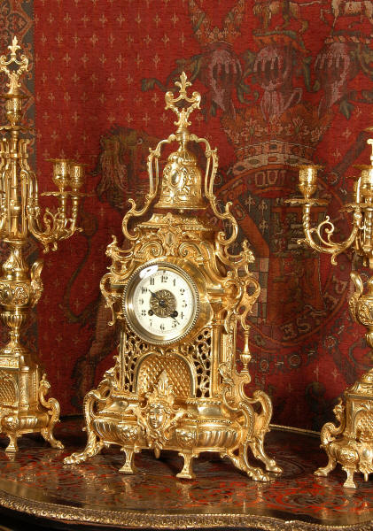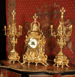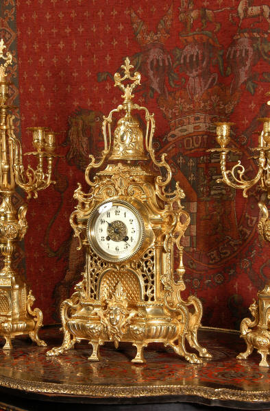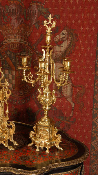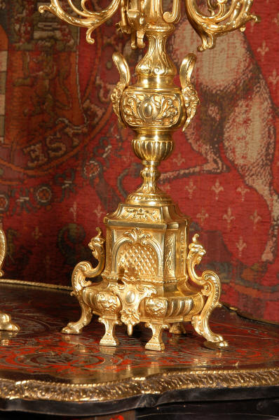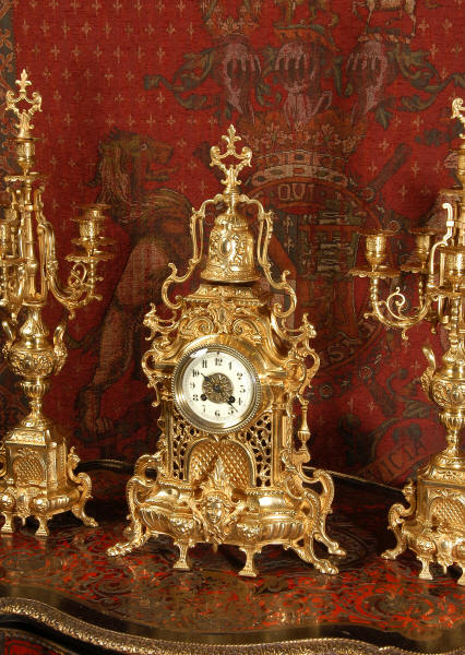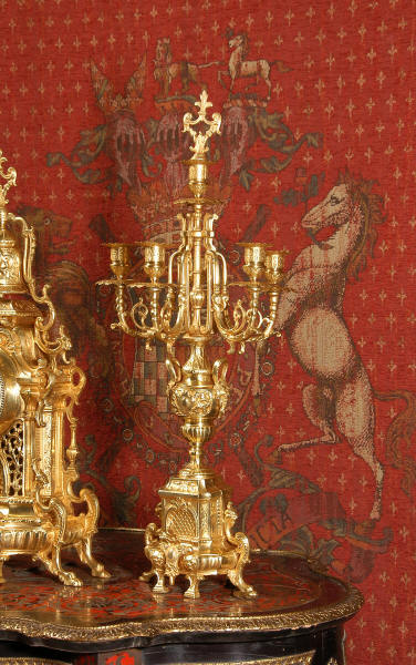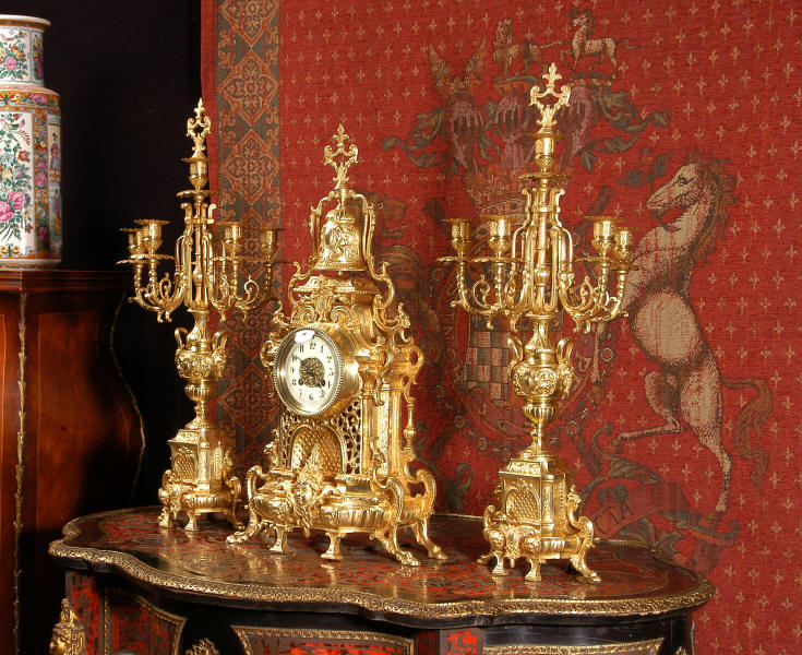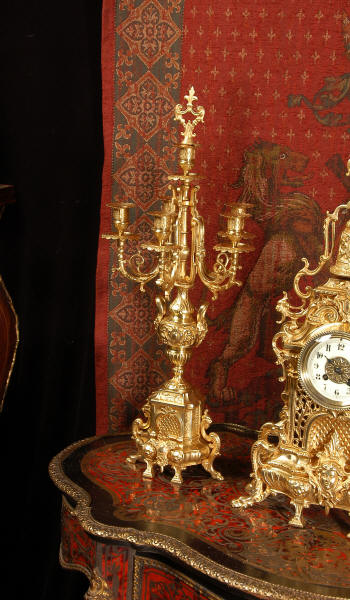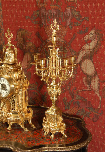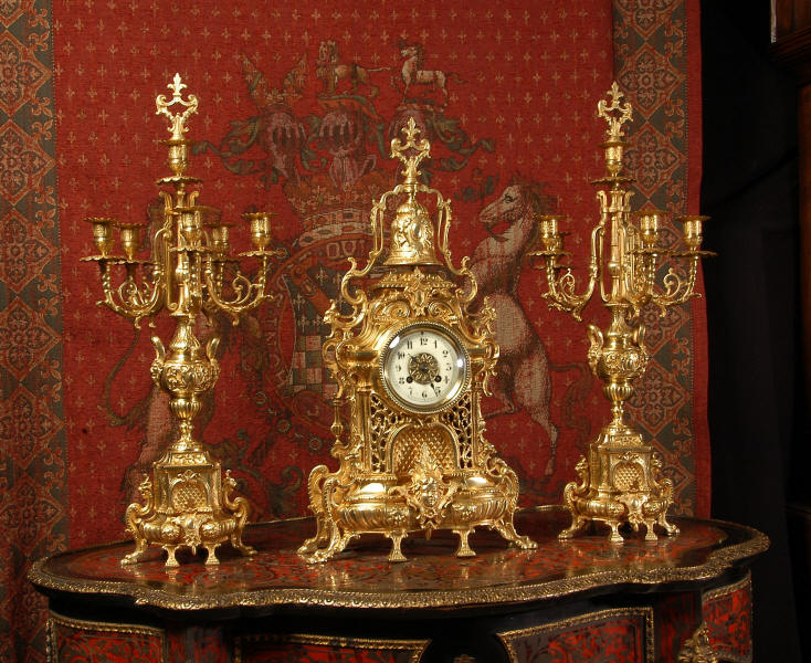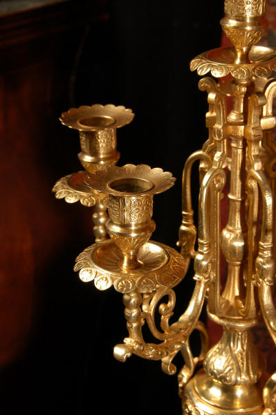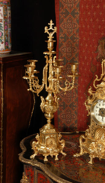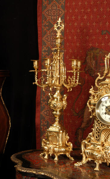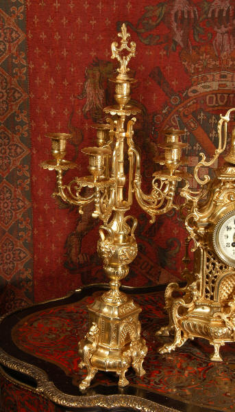 supplied if required. Dimensions of clock: inches Height 23", Width 12 1/2", Depth 5" centimetres Height 58.5 cm, Width 32 cm, Depth 12.5 cm Dimensions of candelabra: inches Height 25 1/2", Width 11 1/4", Depth 11" centimetres Height 65 cm, Width 28.5 cm, Depth 18 cm