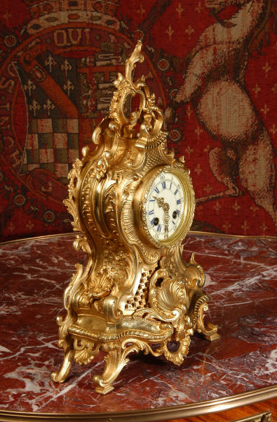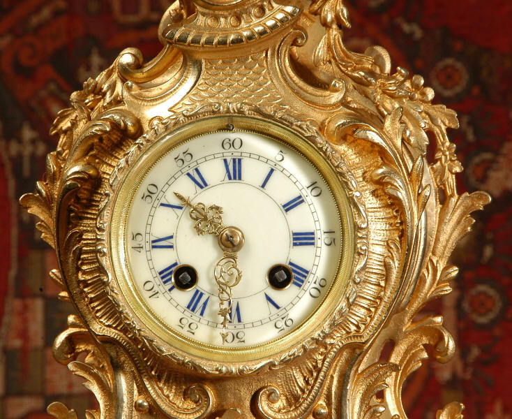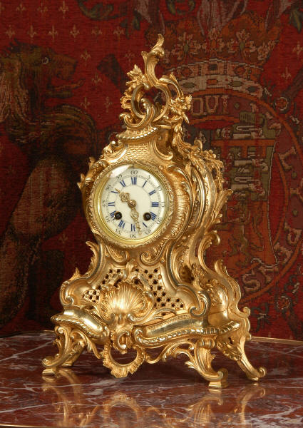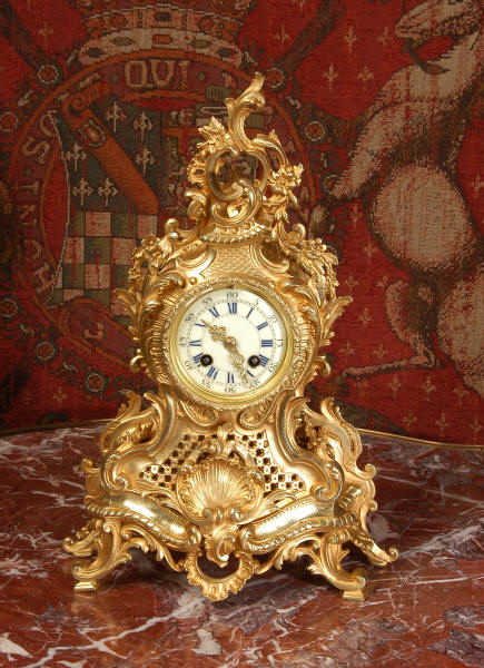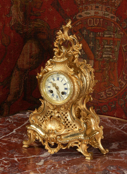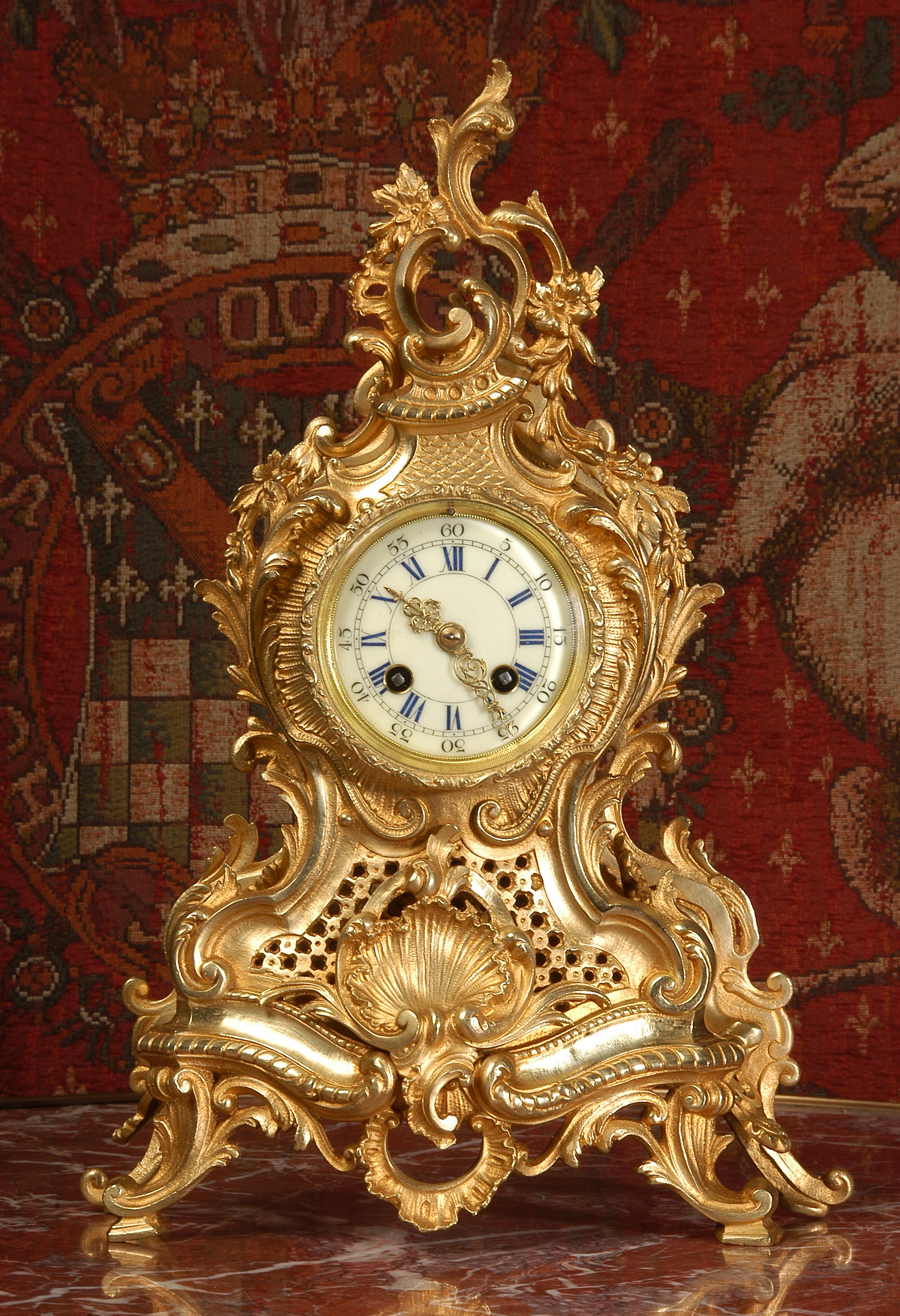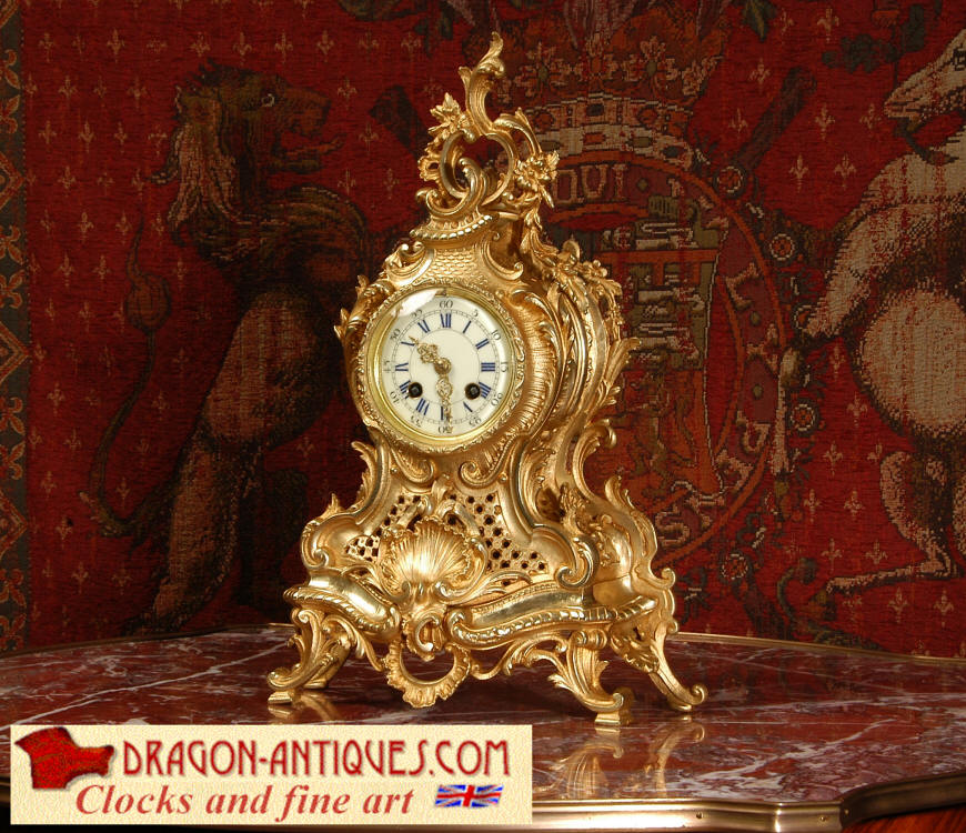 ~ French - Circa 1890 ~ ~~ Excellent condition, fully overhauled & running ~~ A lovely original antique French Rococo boudoir clock. Modelled in gilt brass and typically bold, asymmetric, waisted designed with laurel leaves, 'C' scrolls and floral swags. There is a large and elaborate scrolling finial to the top of the case. The dial is the sought after cream enamel on copper with blue lettering and finely fretted gilt brass hands. It has a separate minute ring and has a Rococo acanthus bezel. The front of the case is fretted to allow a glimpse of the pendulum swinging within the case. Scroll down for many more pictures The French movement is of high quality and is in excellent clean and running condition having been fully overhauled by our clockmaker. Pendulum is a replacement. It runs for 8 days on one wind and strikes the hours and halves on a bell. Click the video clip below to hear the bell and watch the clock running! Condition of the case is