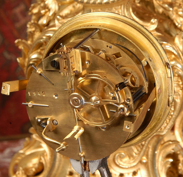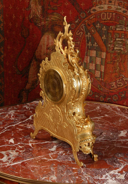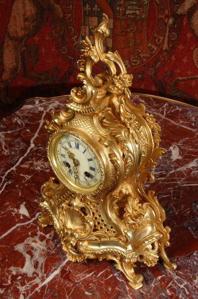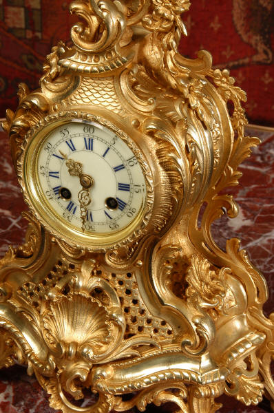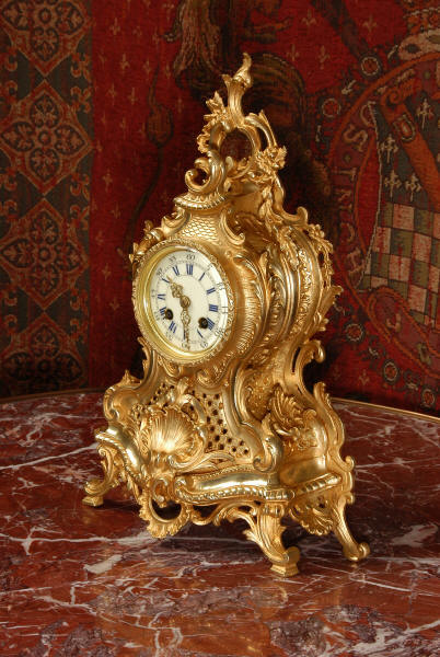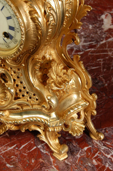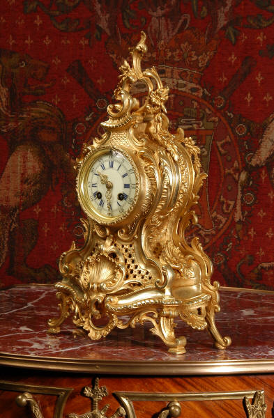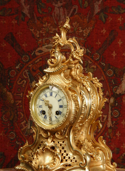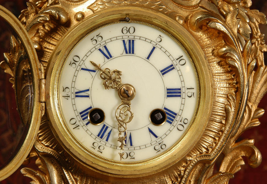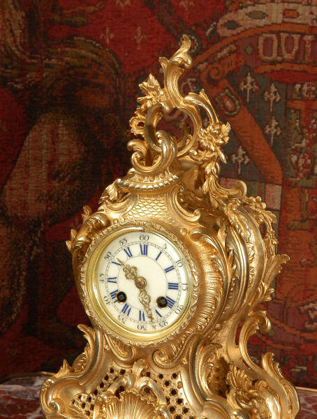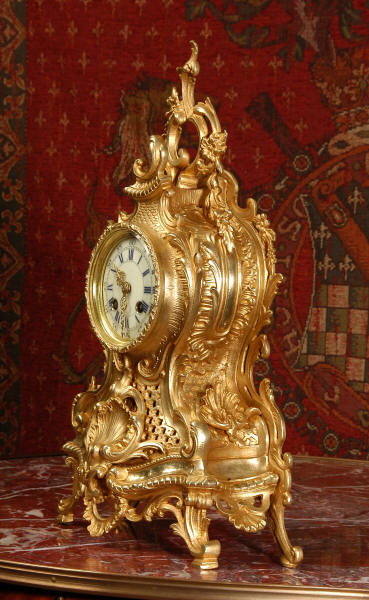 ~ French - Circa 1890 ~ ~~ Excellent condition, fully overhauled & running ~~ A lovely original antique French Rococo boudoir clock. Modelled in gilt brass and typically bold, asymmetric, waisted designed with laurel leaves, 'C' scrolls and floral swags. There is a large and elaborate scrolling finial to the top of the case. The dial is the sought after cream enamel on copper with blue lettering and finely fretted gilt brass hands. It has a separate minute ring and has a Rococo acanthus bezel. The front of the case is fretted to allow a glimpse of the pendulum swinging within the case. Scroll down for many more pictures The French movement is of high quality and is in excellent clean and running condition having been fully overhauled by our clockmaker. Pendulum is a replacement. It runs for 8 days on one wind and strikes the hours and halves on a bell. Click the video clip below to hear the bell and watch the clock running! Condition of the case is
