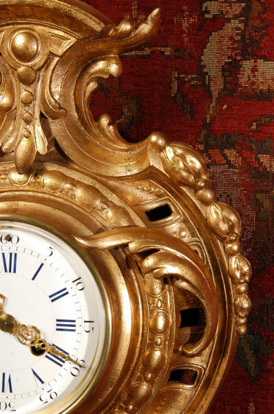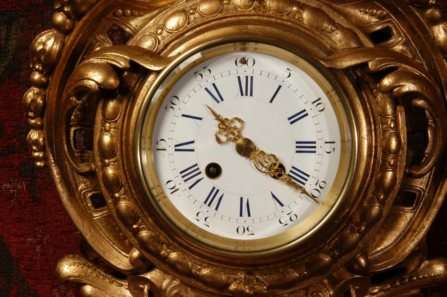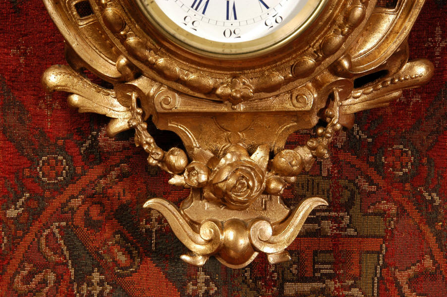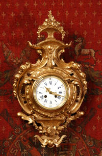 A very decorative antique French Japy Freres cartel wall clock. It is beautifully modelled in metal which has been gilded with gold leaf to give an appearance similar to that of carved wood and gesso. The dial is enamel on copper lettered in blue with separate minute ring. It is complete with original finely fretted gilt brass hands. The back of the clock has an old repairers label.