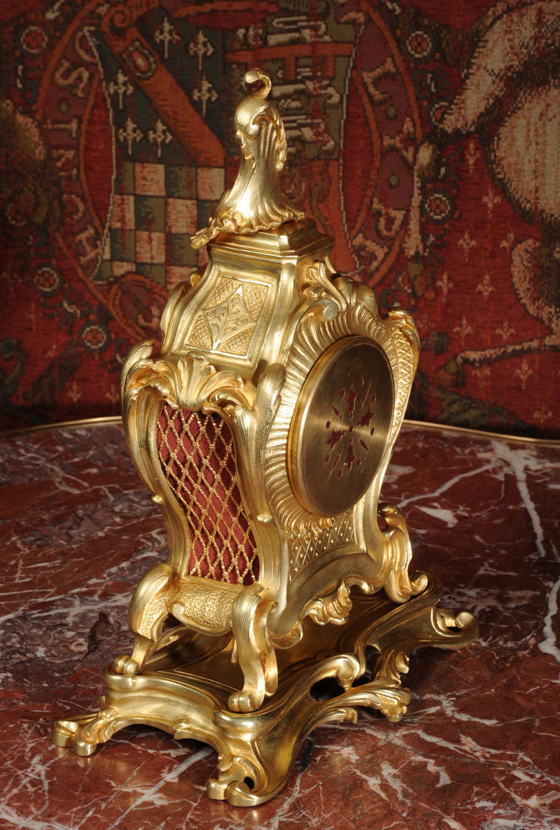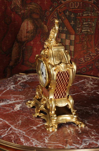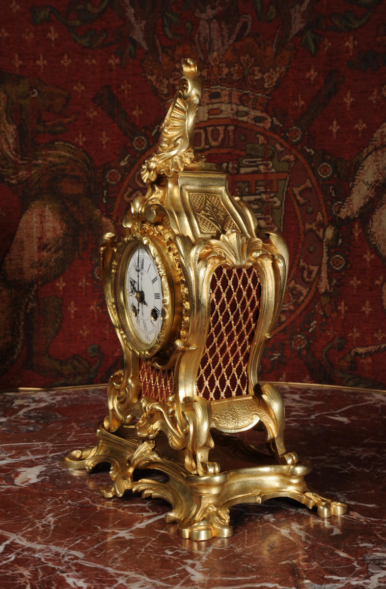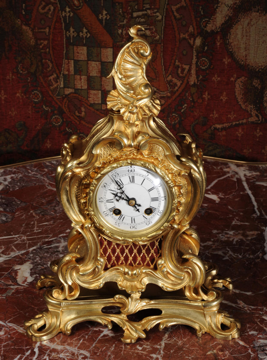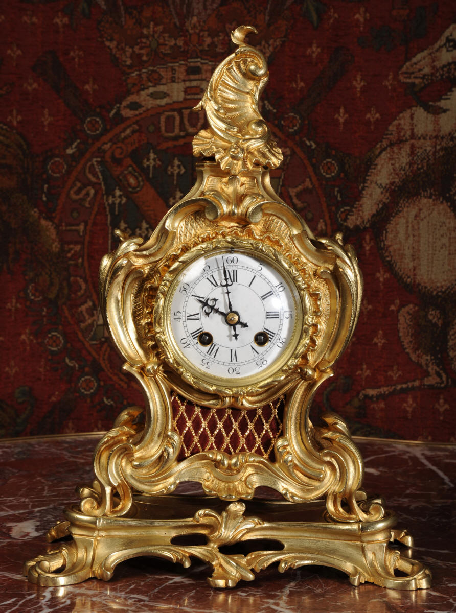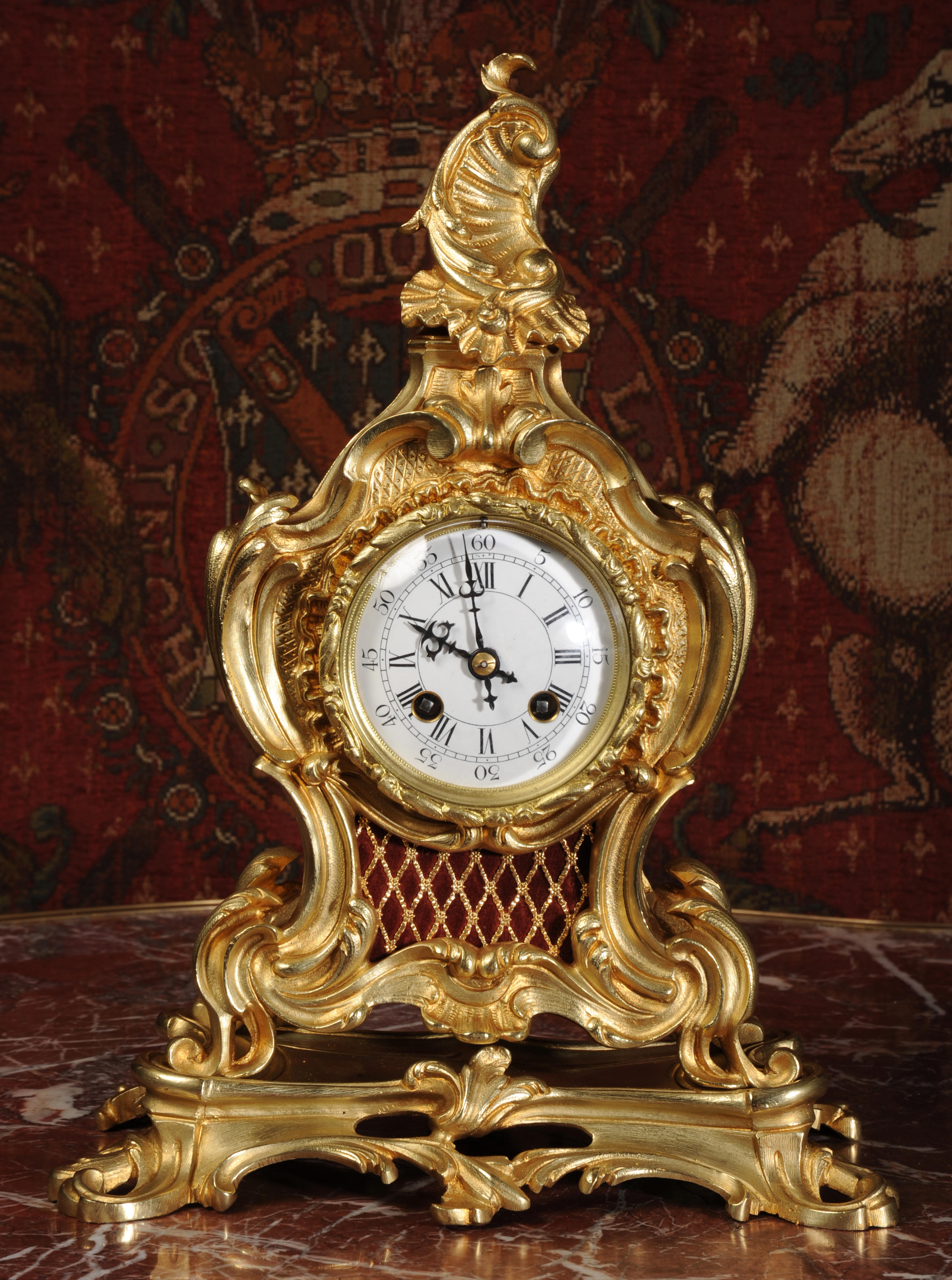 ~ French - Circa 1890 ~ ~~ Excellent condition, fully overhauled ~~ Stunning original antique French clock. The style is Rococo, waisted keyhole shape with acanthus leaf shoulders, 'C' scroll feet and surmounted by a flamboyant finial. It stands on its original integral base. Curved fretted panels backed with red velvet are inserted into the sides, with a smaller one to the front. The design is beautifully bold and heavily modelled in fine gilded brass, well chased and finished. The clock is modelled in the round and would display very well on a table.