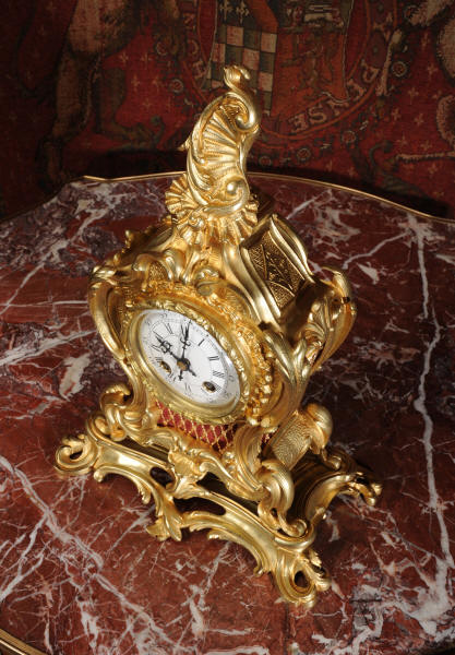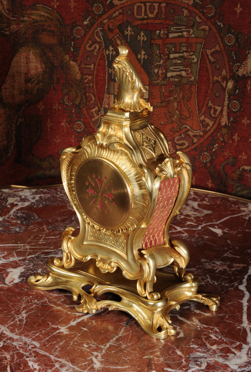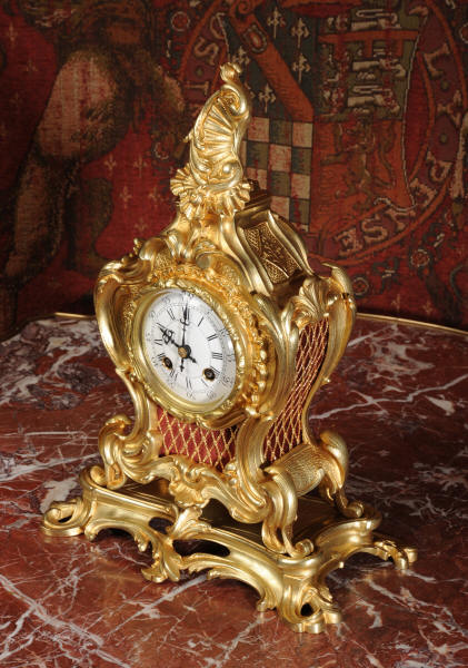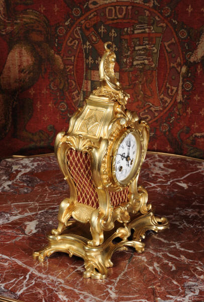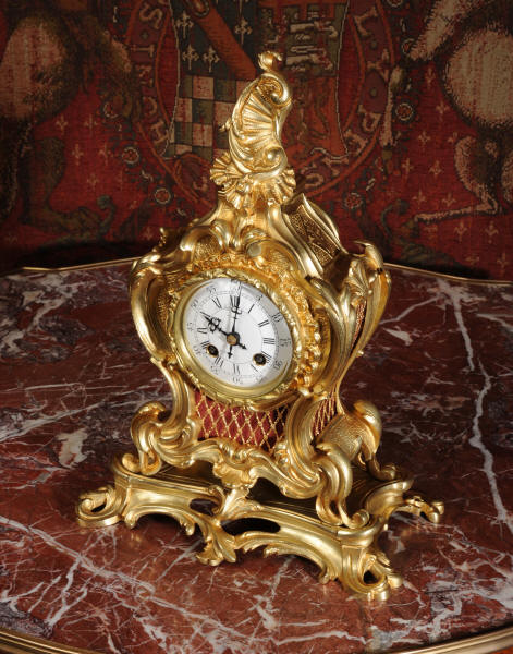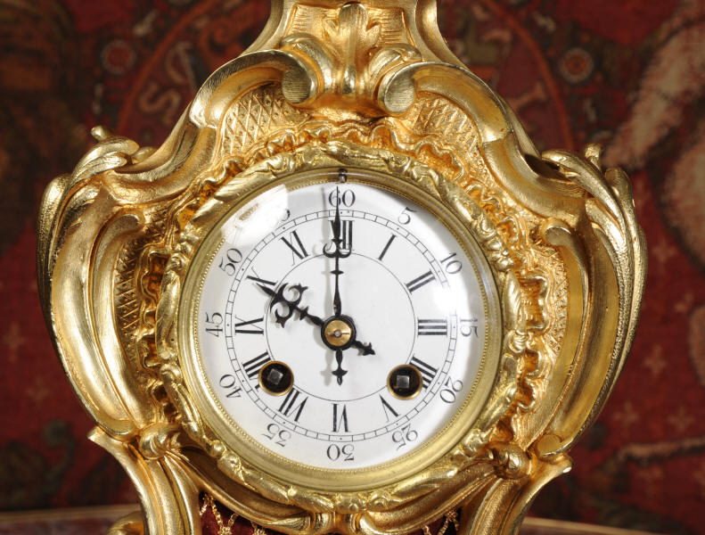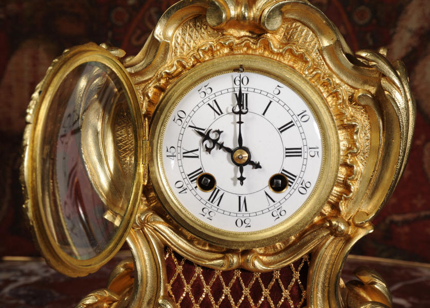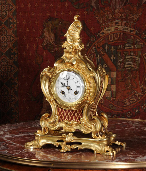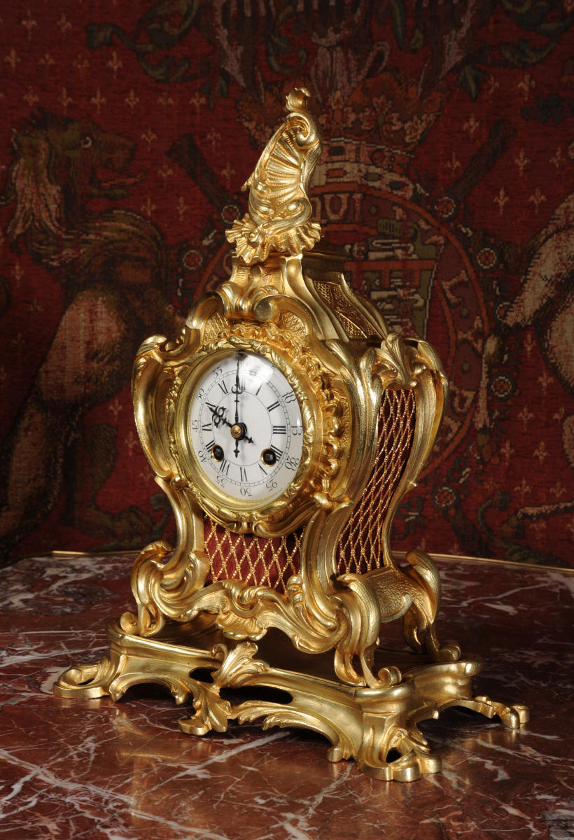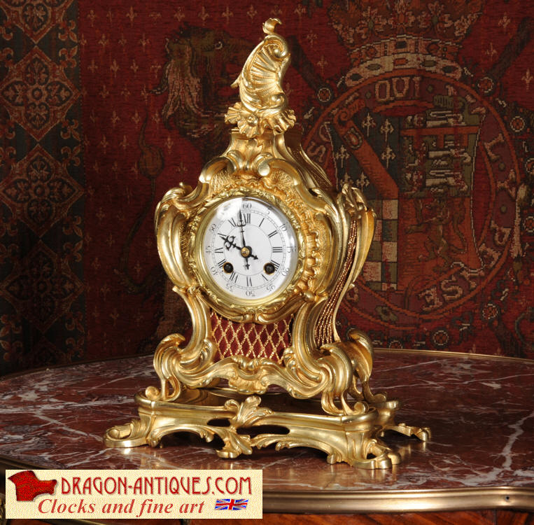 ~ French - Circa 1890 ~ ~~ Excellent condition, fully overhauled ~~ Stunning original antique French clock. The style is Rococo, waisted keyhole shape with acanthus leaf shoulders, 'C' scroll feet and surmounted by a flamboyant finial. It stands on its original integral base. Curved fretted panels backed with red velvet are inserted into the sides, with a smaller one to the front. The design is beautifully bold and heavily modelled in fine gilded brass, well chased and finished. The clock is modelled in the round and would display very well on a table.