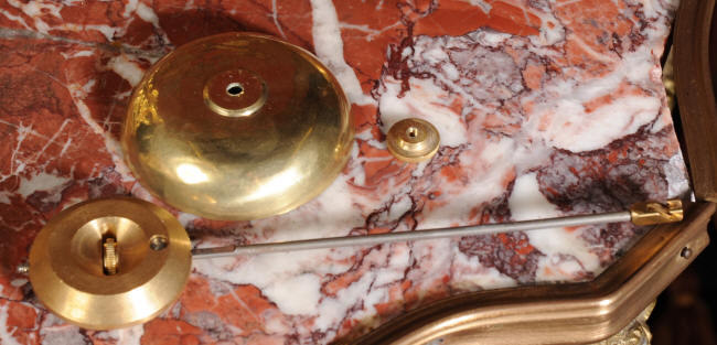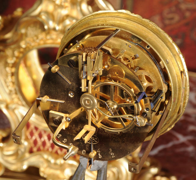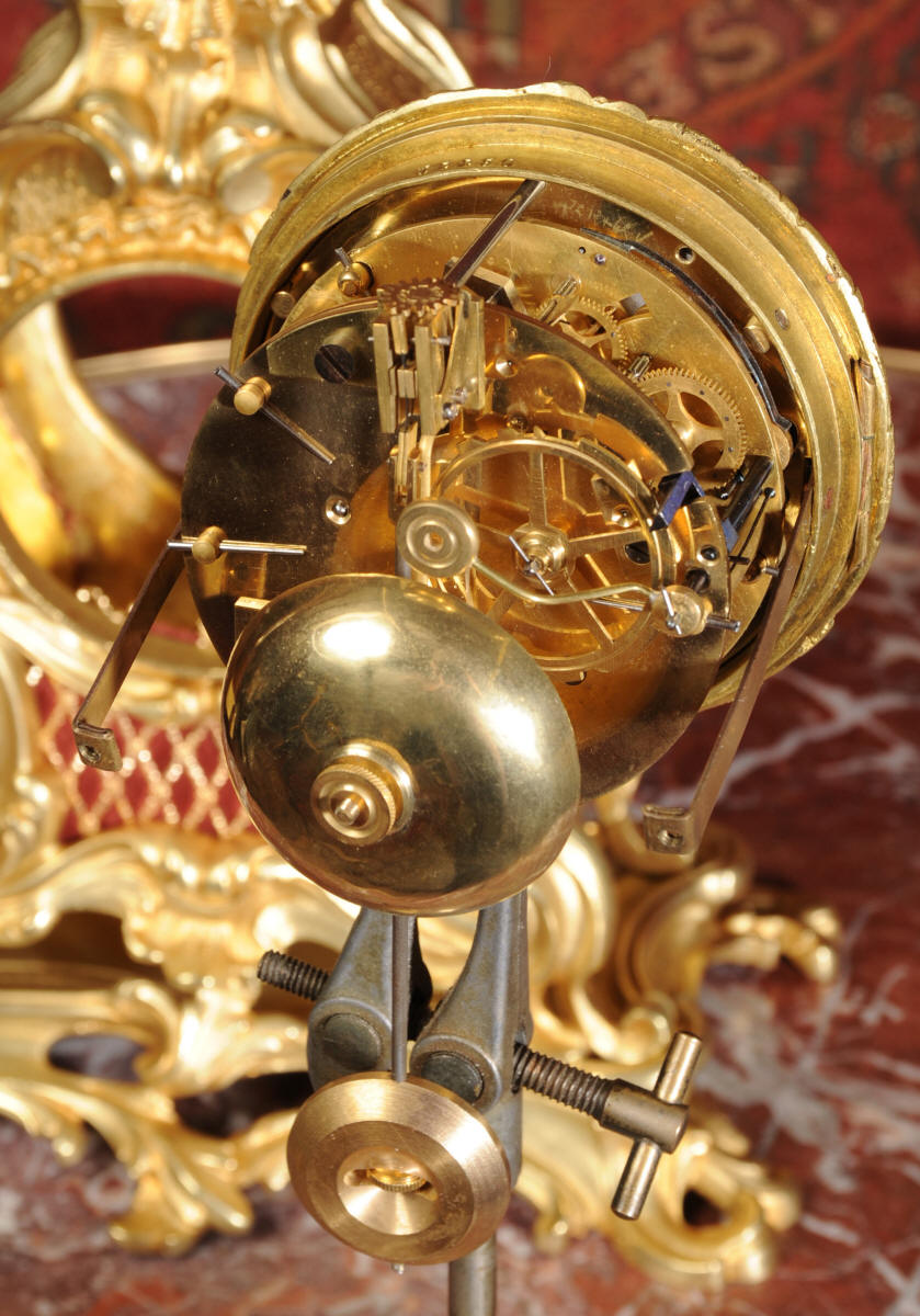 The beautiful dial is enamel on copper, a Roman hour ring and a separate outside minute ring. It is complete with its original finely fretted blued steel hands and convex glazed bezel. The French movement is of high quality and has the retailers mark F & C on the backplate. It is in excellent clean and running condition having been fully overhauled by our clockmaker. Pendulum is a replacement. It runs for 8 days and strikes the hours and halves on a bell. Click the video clip below to hear the bell and watch the clock running! Condition of the case is excellent, the original gilding is beautifully clean and bright with hardly any wear or discolouration and there are no losses. The dial is also in excellent condition, no chips or scratches. We have replaced the red velvet.