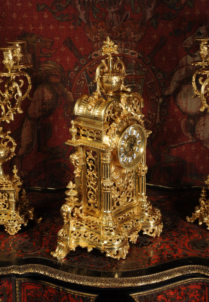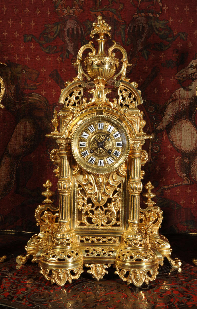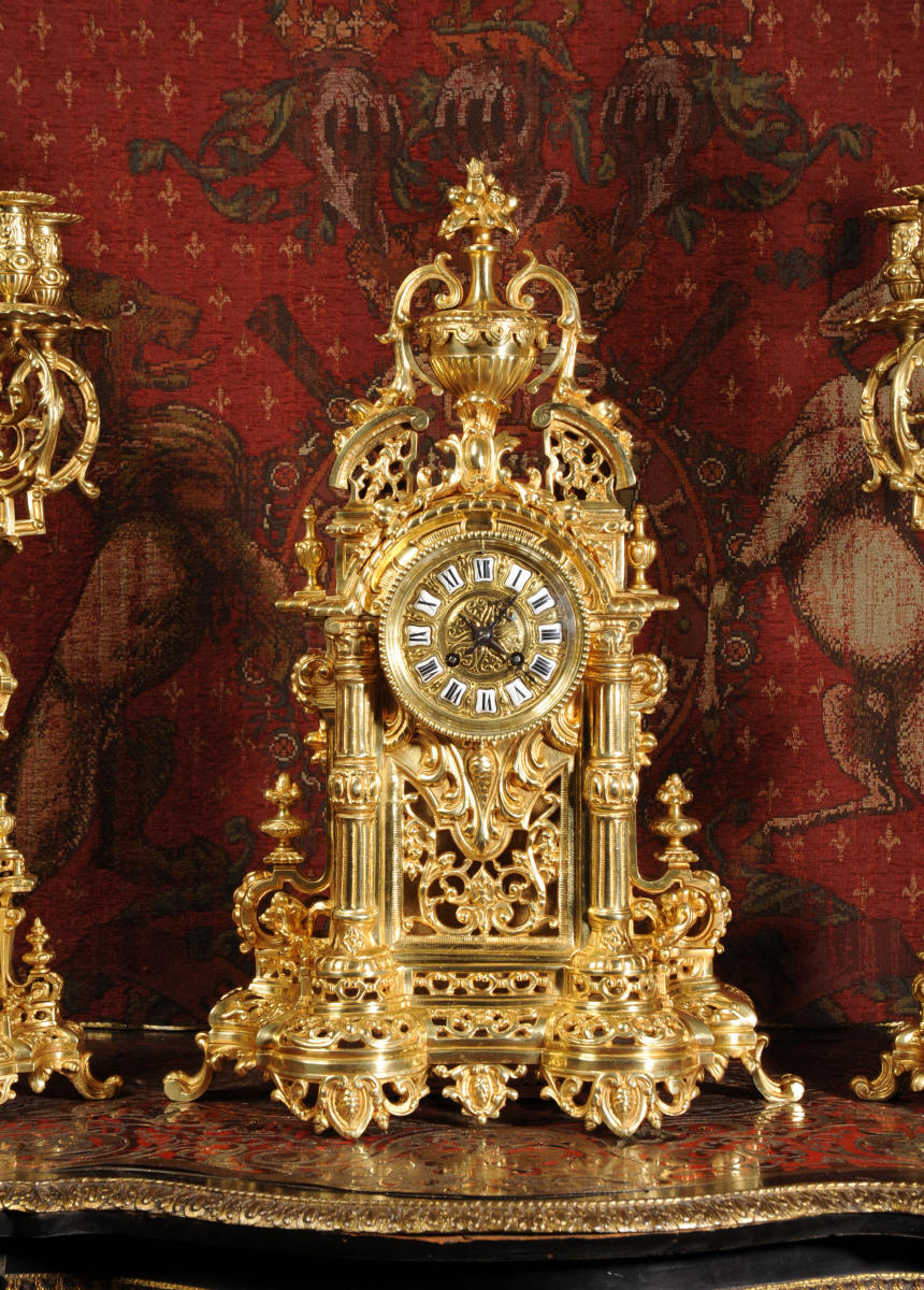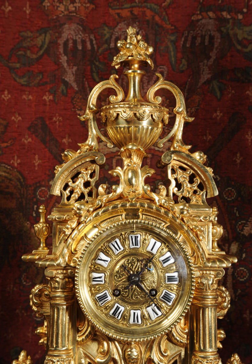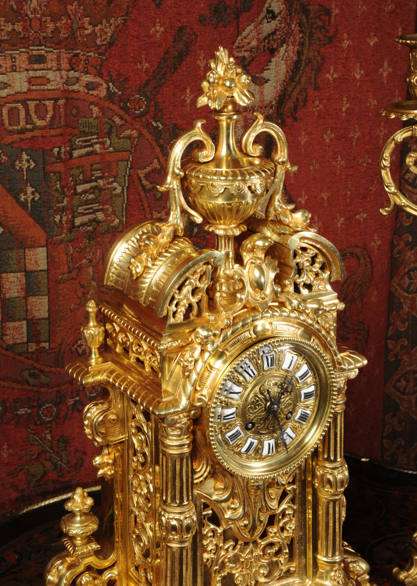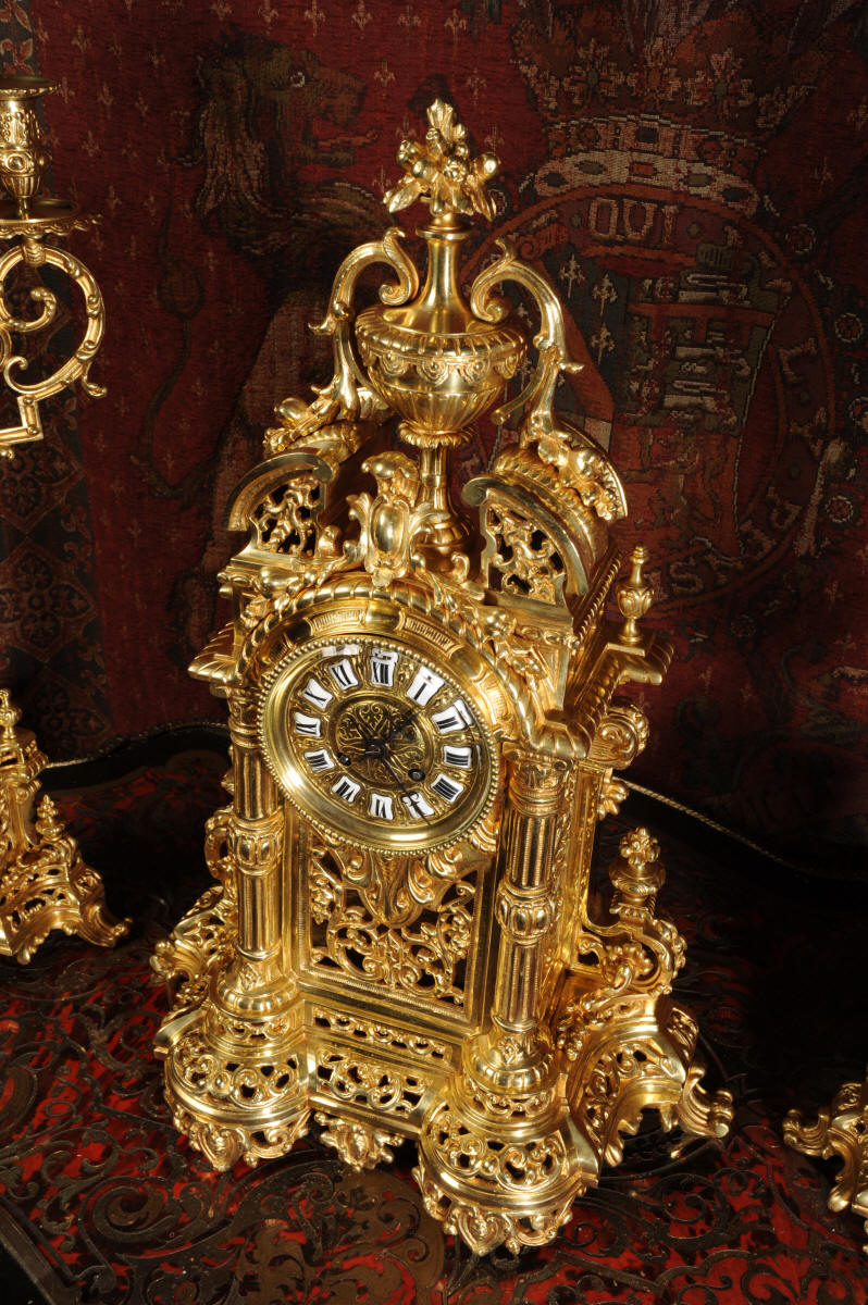 ~ French - Circa 1880 ~ ~~ Excellent condition, fully overhauled ~~ A very large and impressive original antique French gilt bronze clock set, very good quality with a thick, sumptuous original gild. It is in the Louis XVI style, architectural with Corinthian columns and a broken arch pediment above the dial. To the top is a large and elaborate urn with a floral finial. The design is beautifully fretted to lighten the design and also allow the pendulum to be glimpsed swinging within the case. This is a stunning, very large, heavy clock set with a superb original gild.