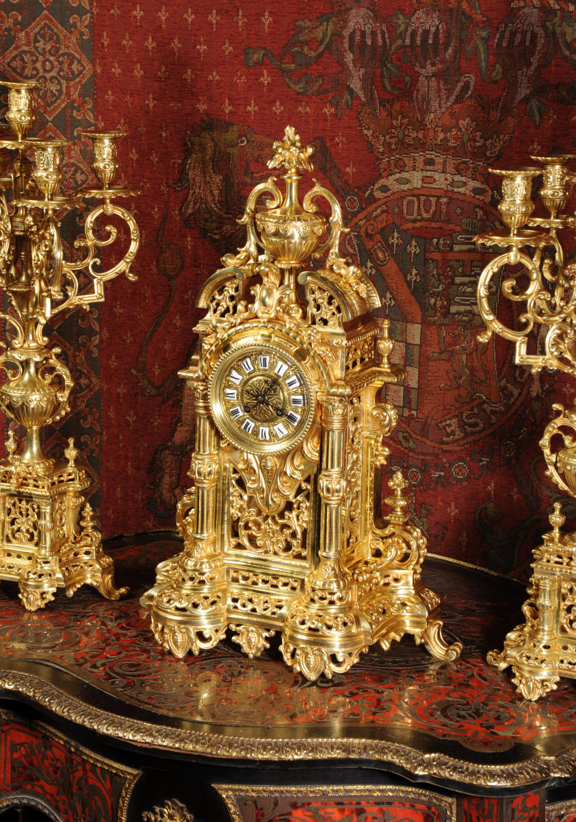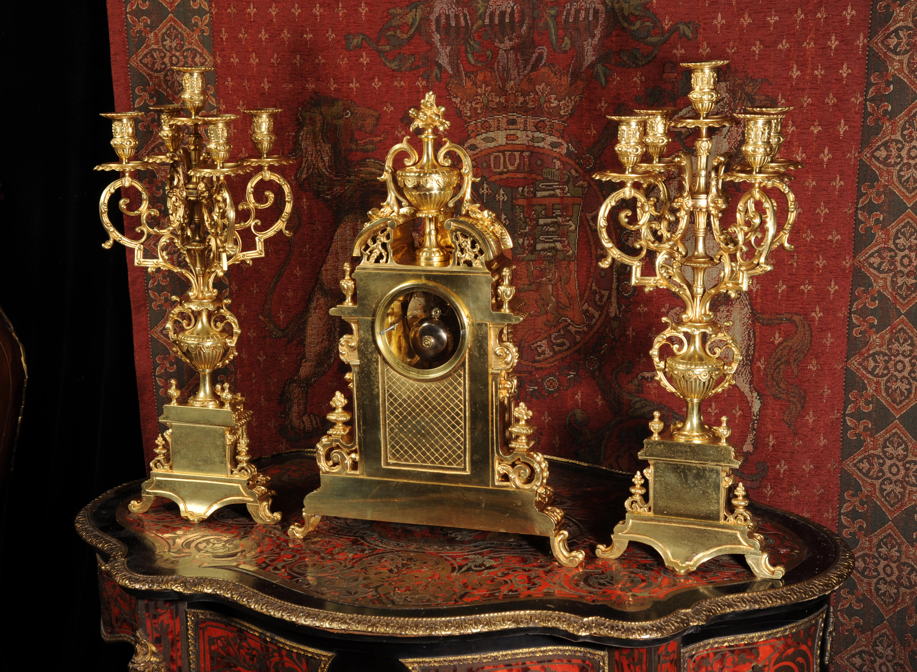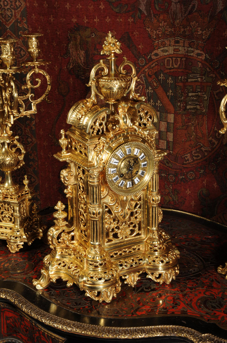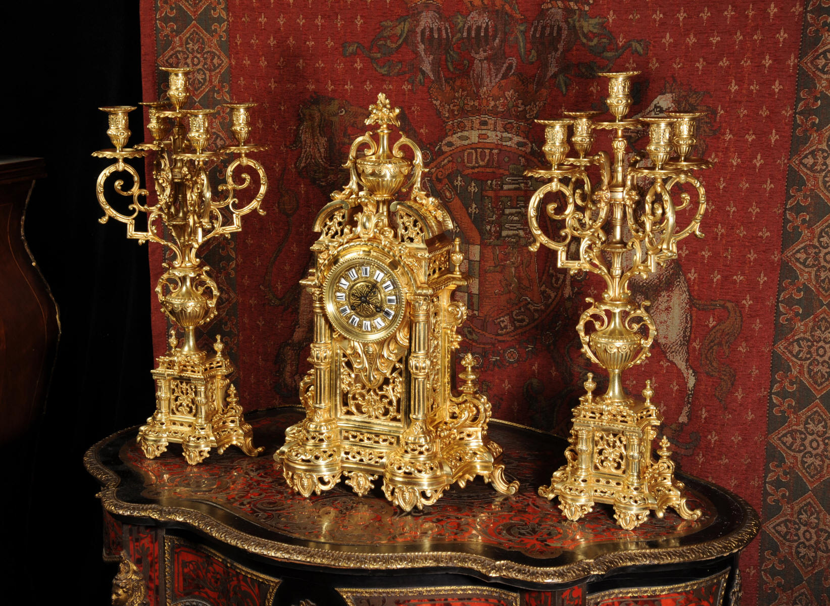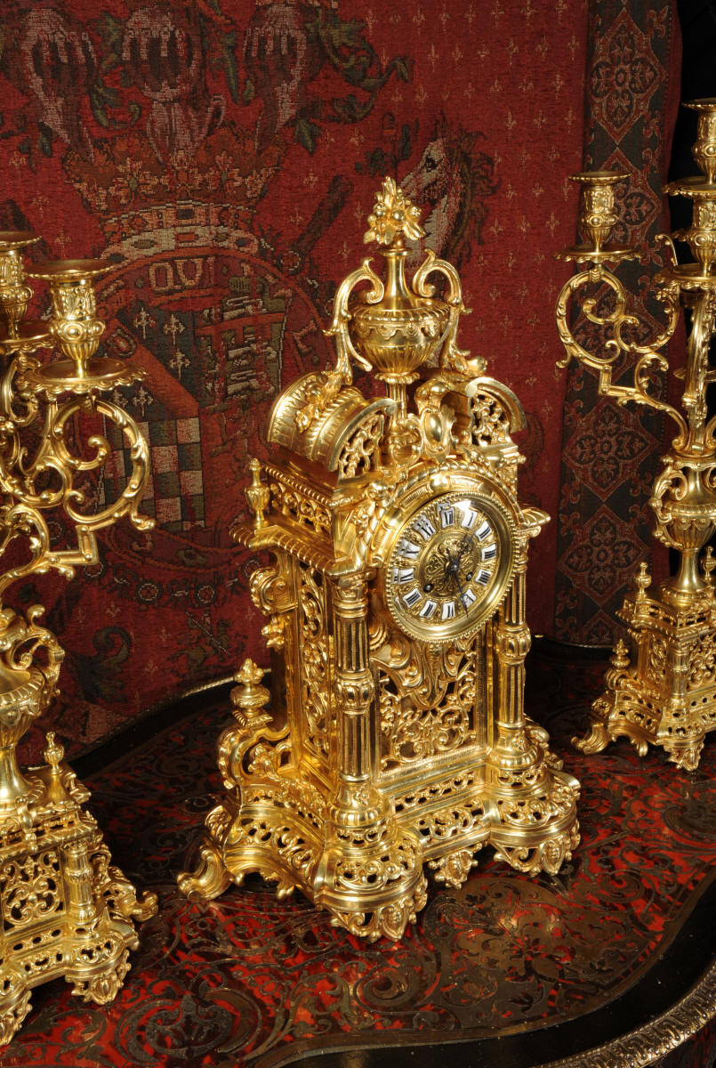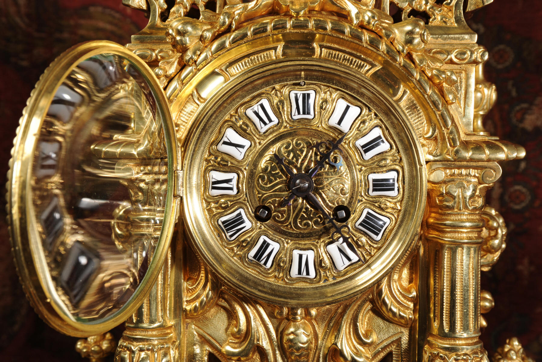~ French - Circa 1880 ~ ~~ Excellent condition, fully overhauled ~~ A very large and impressive original antique French gilt bronze clock set, very good quality with a thick, sumptuous original gild. It is in the Louis XVI style, architectural with Corinthian columns and a broken arch pediment above the dial. To the top is a large and elaborate urn with a floral finial. The design is beautifully fretted to lighten the design and also allow the pendulum to be glimpsed swinging within the case. This is a stunning, very large, heavy clock set with a superb original gild.
