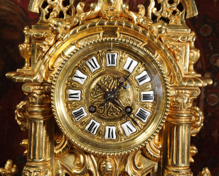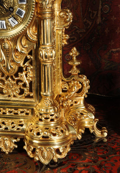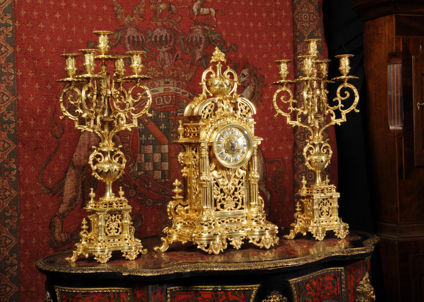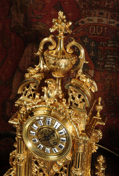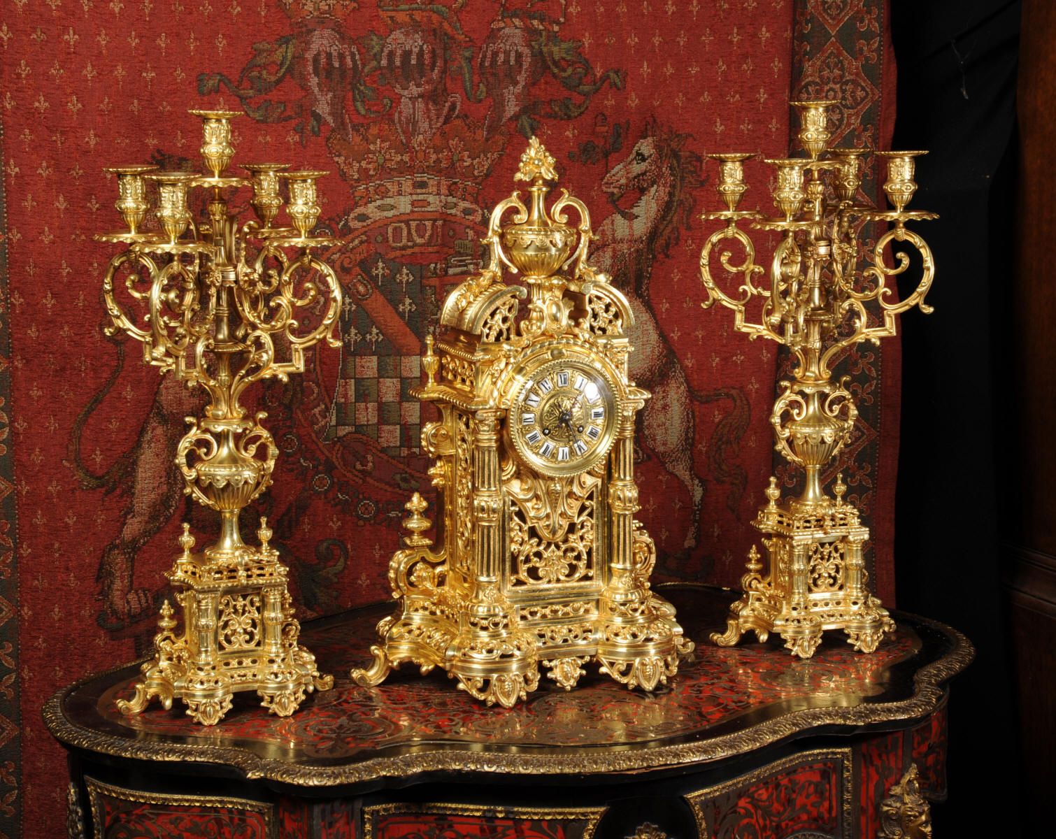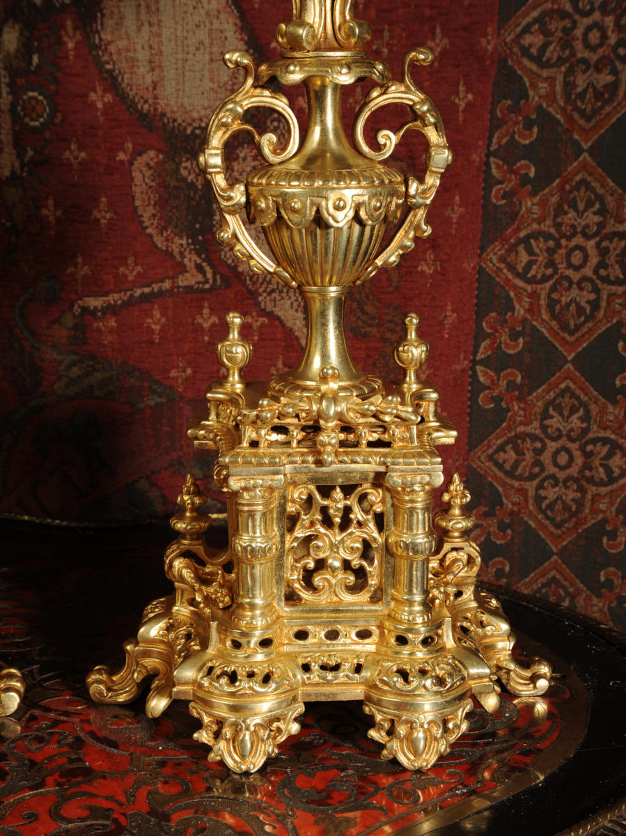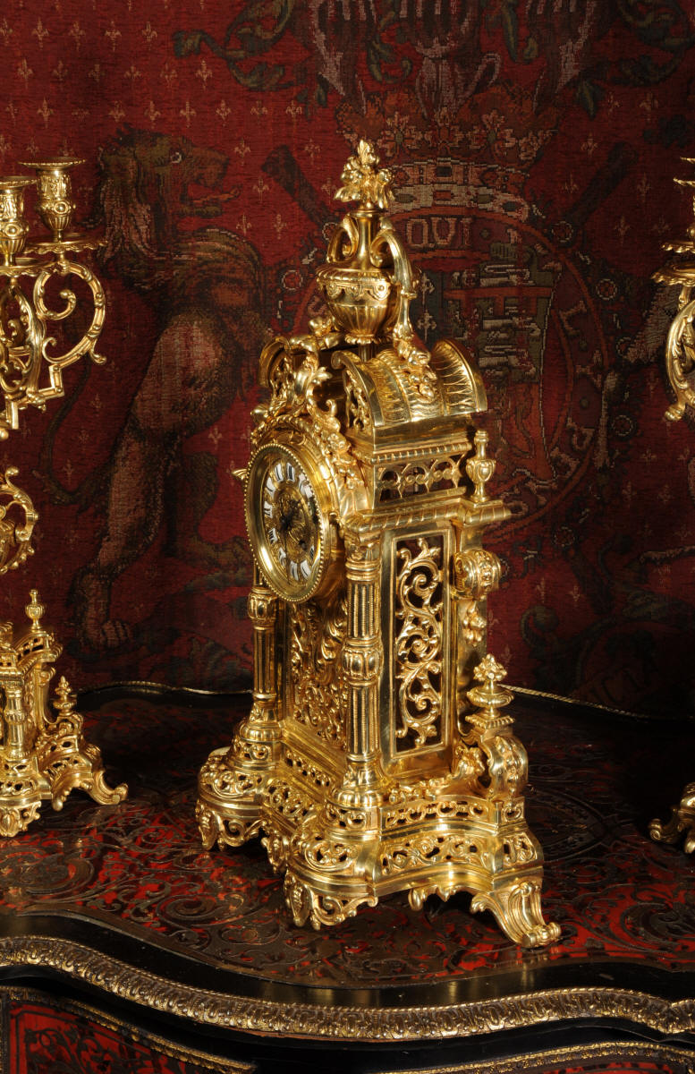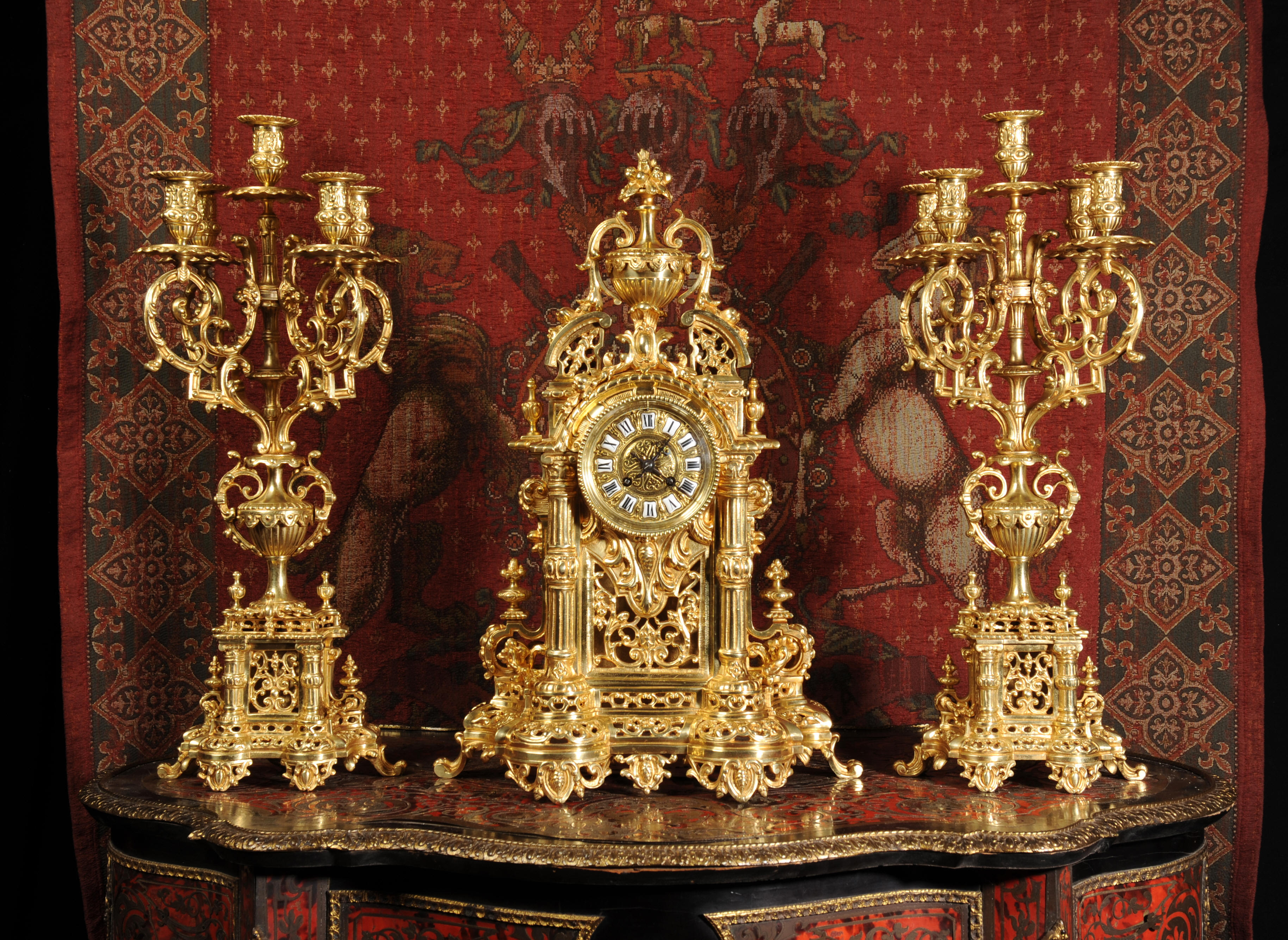 ~ French - Circa 1880 ~ ~~ Excellent condition, fully overhauled ~~ A very large and impressive original antique French gilt bronze clock set, very good quality with a thick, sumptuous original gild. It is in the Louis XVI style, architectural with Corinthian columns and a broken arch pediment above the dial. To the top is a large and elaborate urn with a floral finial. The design is beautifully fretted to lighten the design and also allow the pendulum to be glimpsed swinging within the case. This is a stunning, very large, heavy clock set with a superb original gild.