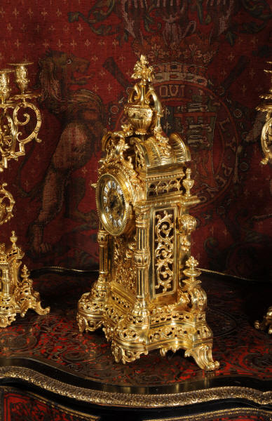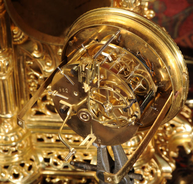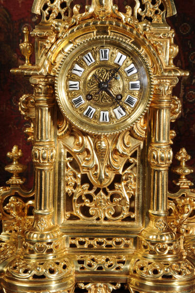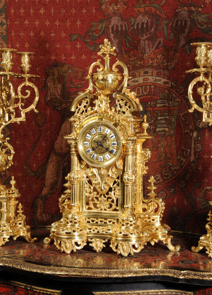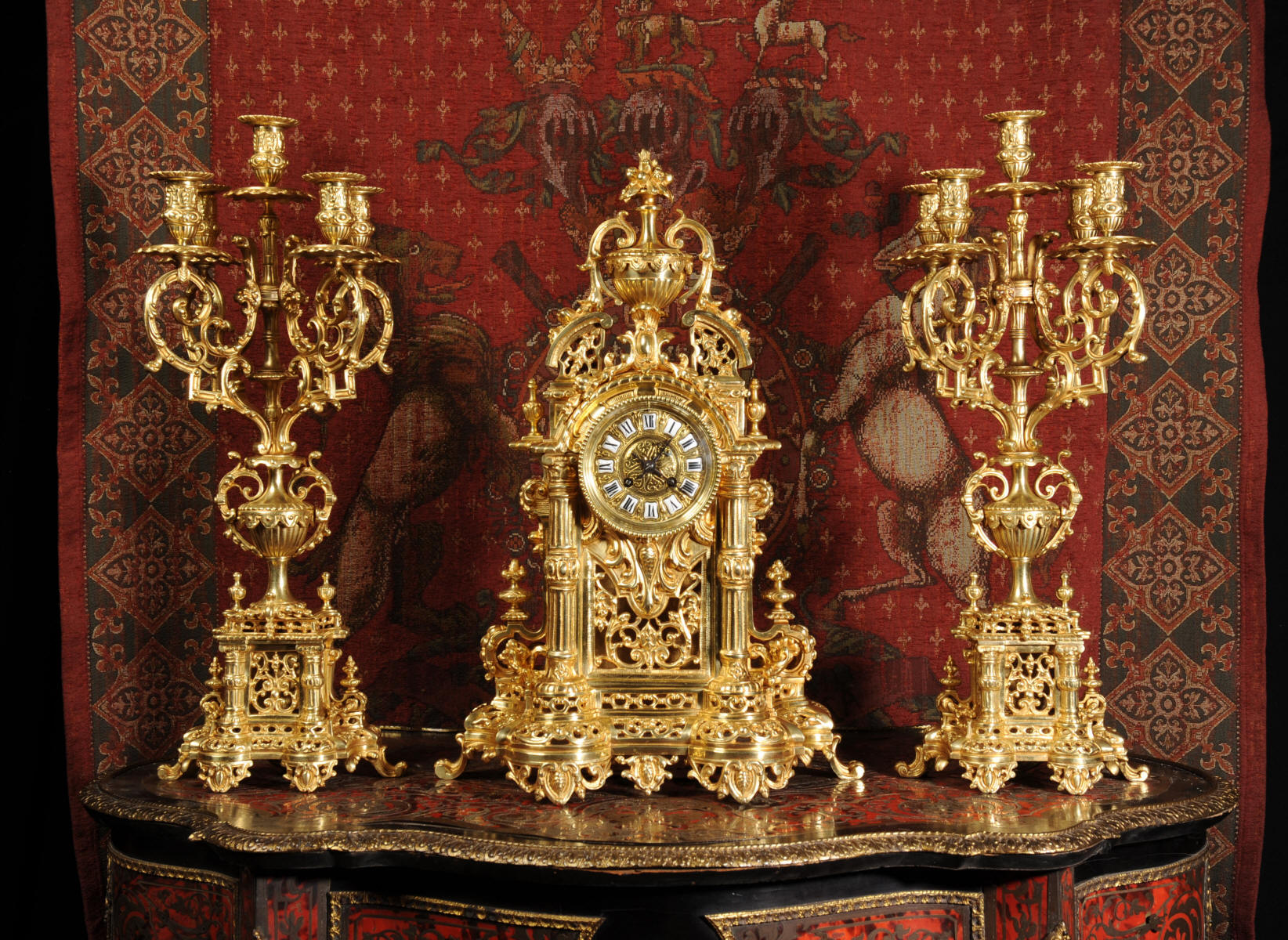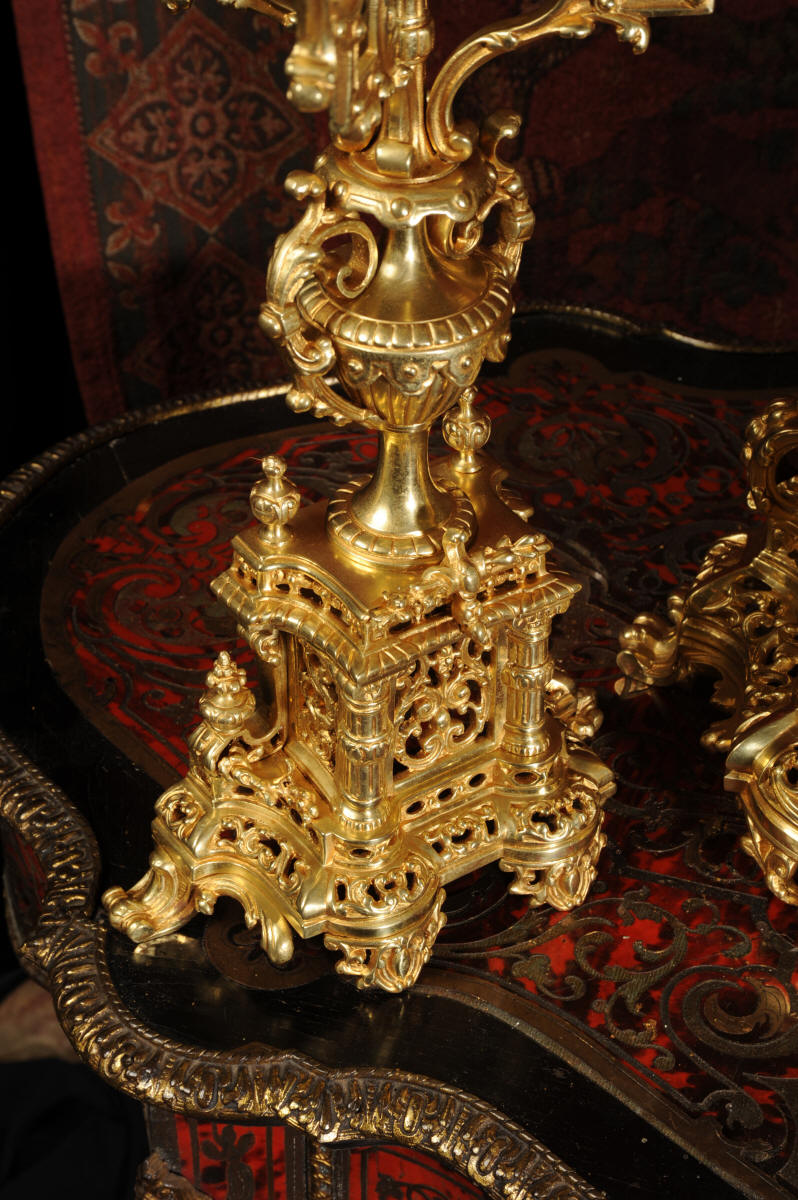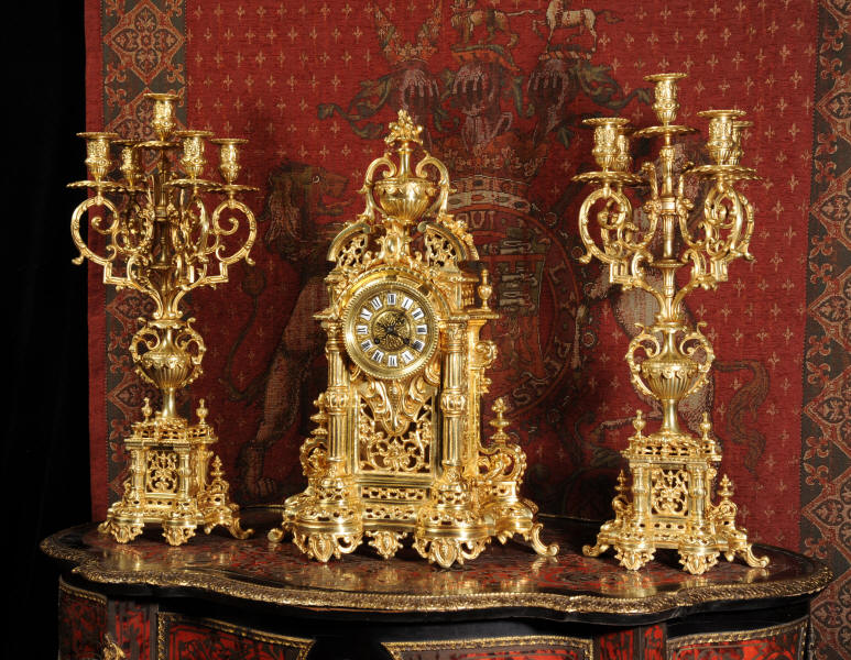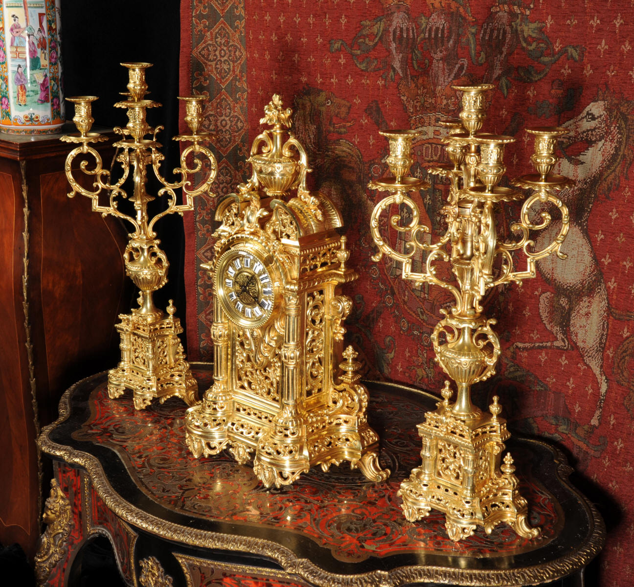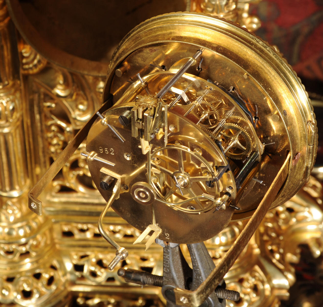 ~ French - Circa 1880 ~ ~~ Excellent condition, fully overhauled ~~ A very large and impressive original antique French gilt bronze clock set, very good quality with a thick, sumptuous original gild. It is in the Louis XVI style, architectural with Corinthian columns and a broken arch pediment above the dial. To the top is a large and elaborate urn with a floral finial. The design is beautifully fretted to lighten the design and also allow the pendulum to be glimpsed swinging within the case. This is a stunning, very large, heavy clock set with a superb original gild.