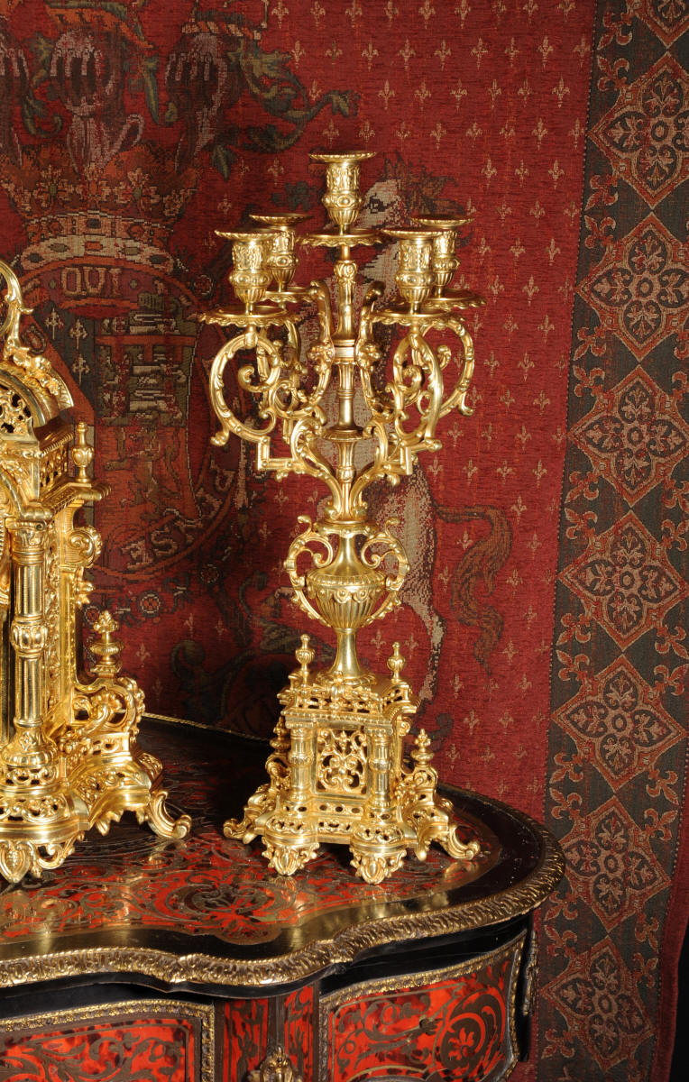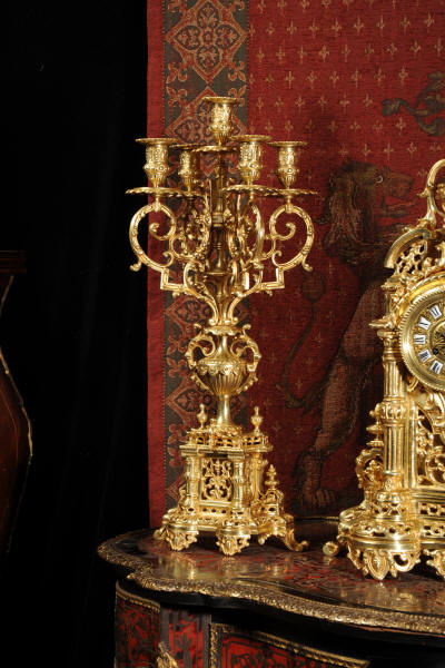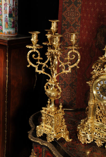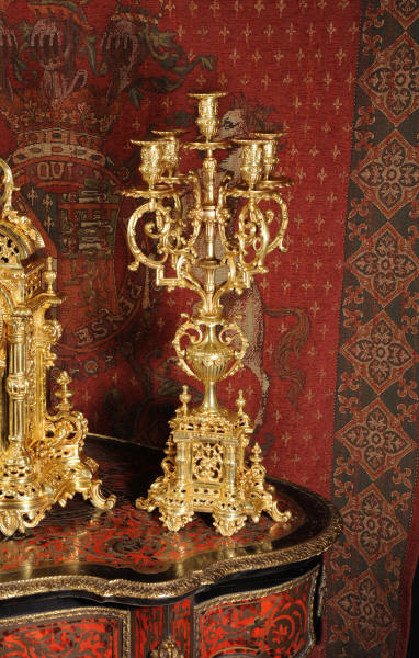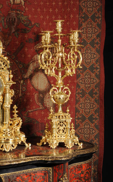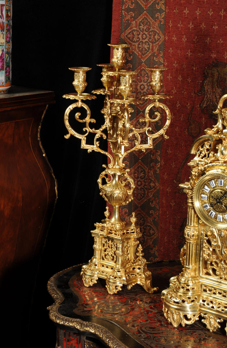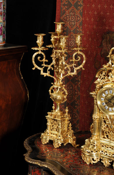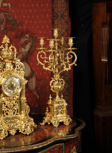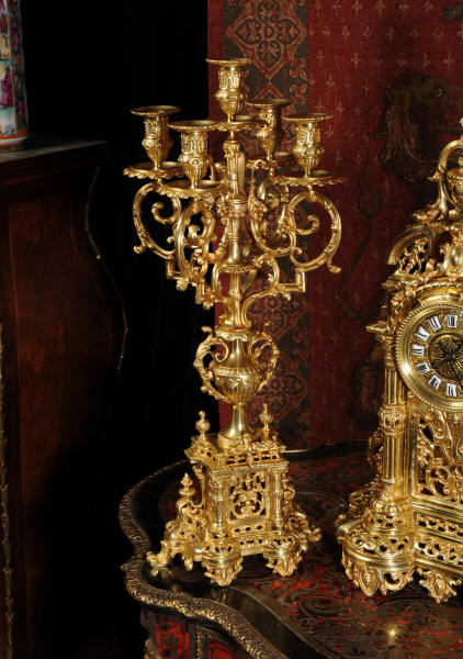 Candelabra are conforming in style with matching bases and urns. The four branches are modelled as scrolling acanthus with large drip pans and nozzles. The dial is also gilt with 12 individual enamel cartouche letters and original fretted blued steel hands. The hobnail bezel is fitted with convex glass and the rear door is also glazed to allow the movement to be seen. The French movement is of high quality and is in excellent clean and running condition having been fully overhauled by our clockmaker. Pendulum is a replacement. It runs for 8 days and strikes the hours and halves on a bell. Click the video clip below to hear the bell and watch the clock running!