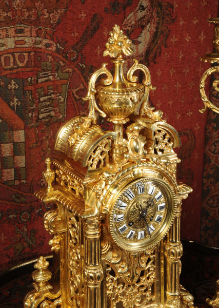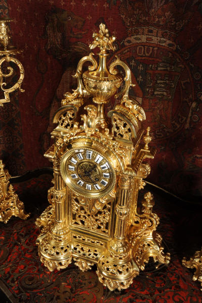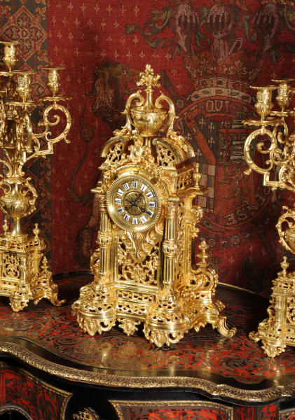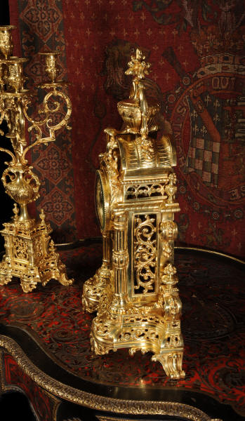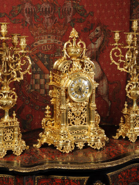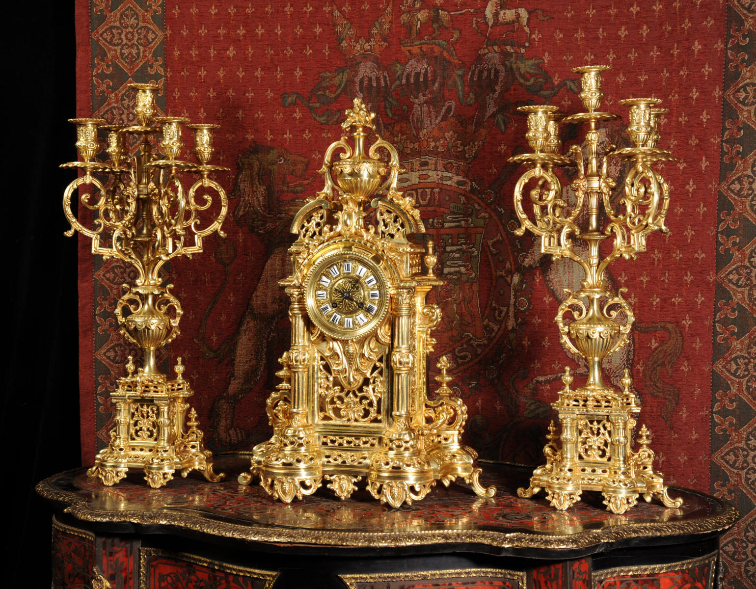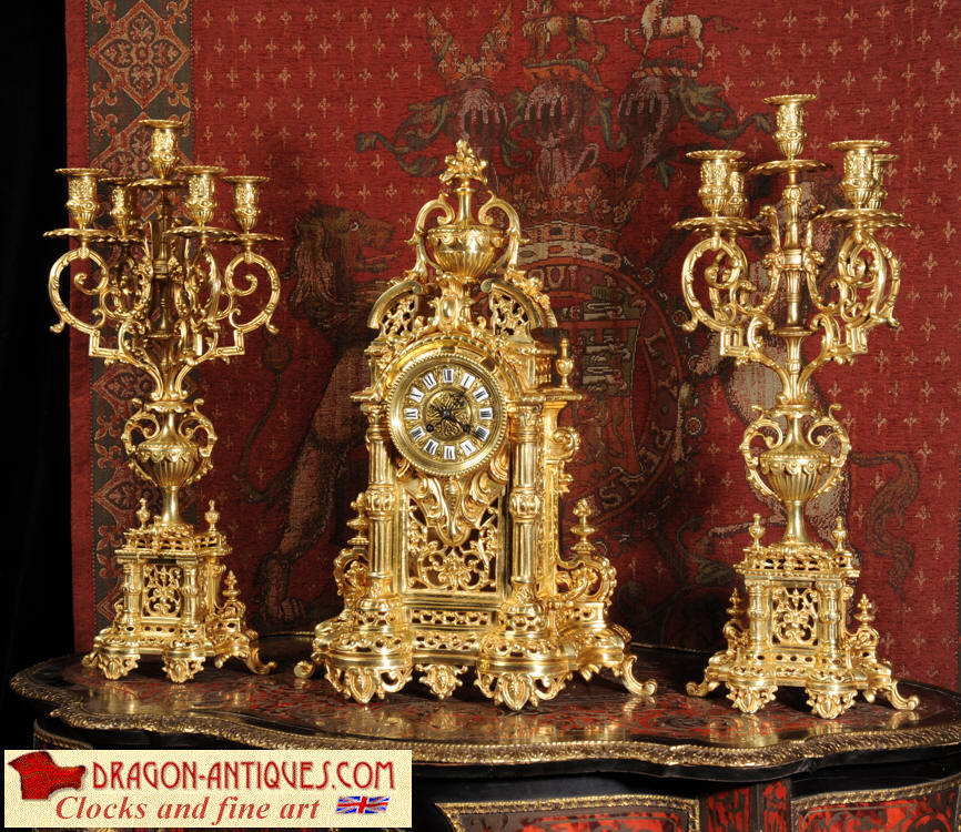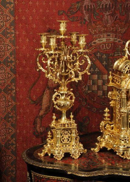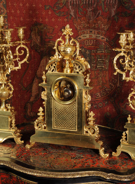 Candelabra are conforming in style with matching bases and urns. The four branches are modelled as scrolling acanthus with large drip pans and nozzles. The dial is also gilt with 12 individual enamel cartouche letters and original fretted blued steel hands. The hobnail bezel is fitted with convex glass and the rear door is also glazed to allow the movement to be seen. The French movement is of high quality and is in excellent clean and running condition having been fully overhauled by our clockmaker. Pendulum is a replacement. It runs for 8 days and strikes the hours and halves on a bell. Click the video clip below to hear the bell and watch the clock running!